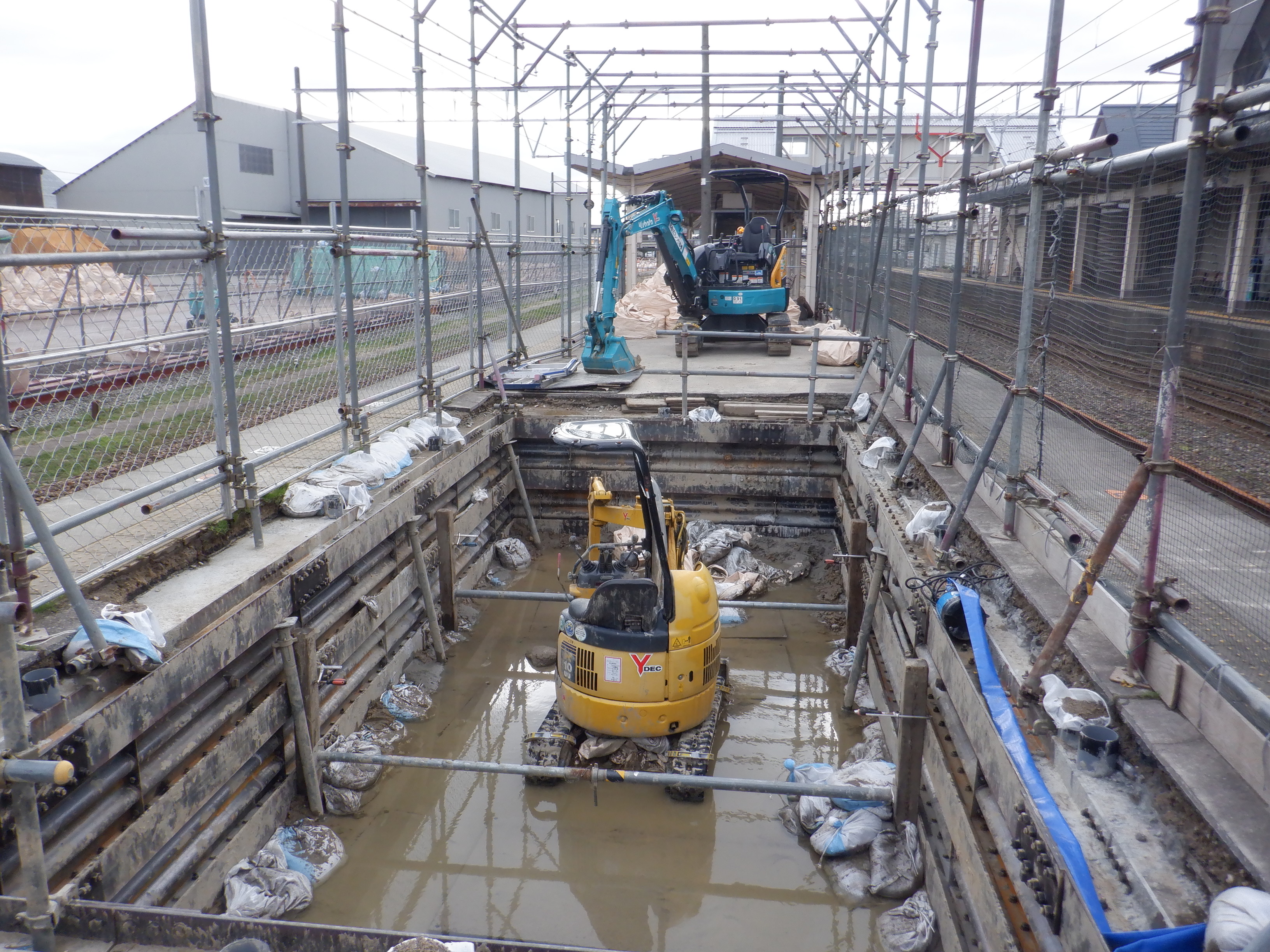 2・3番のりばのエレベーター跨線橋のところは基礎部分の工事が始まっているようで、大きく掘られて重機が入っていました。