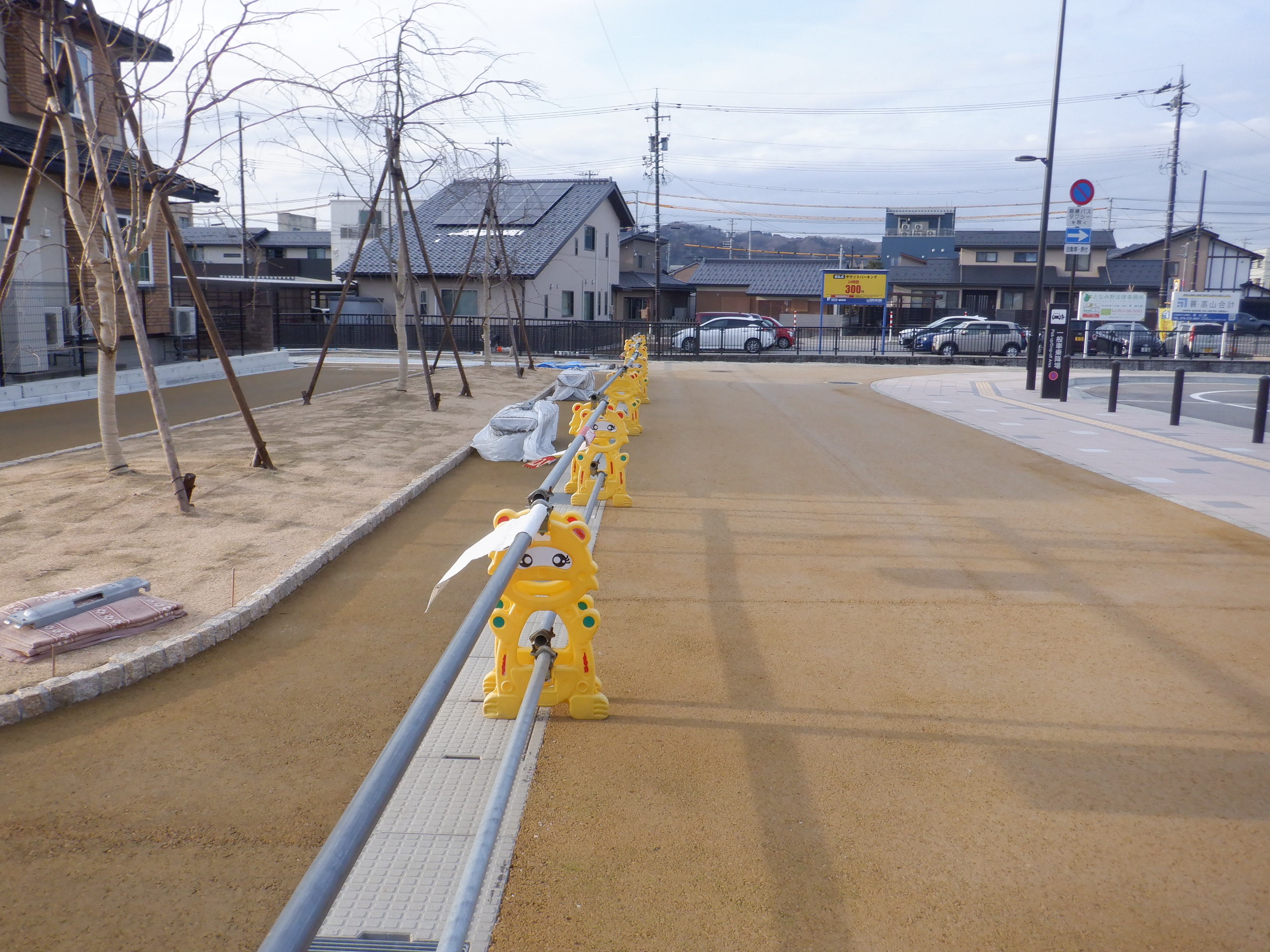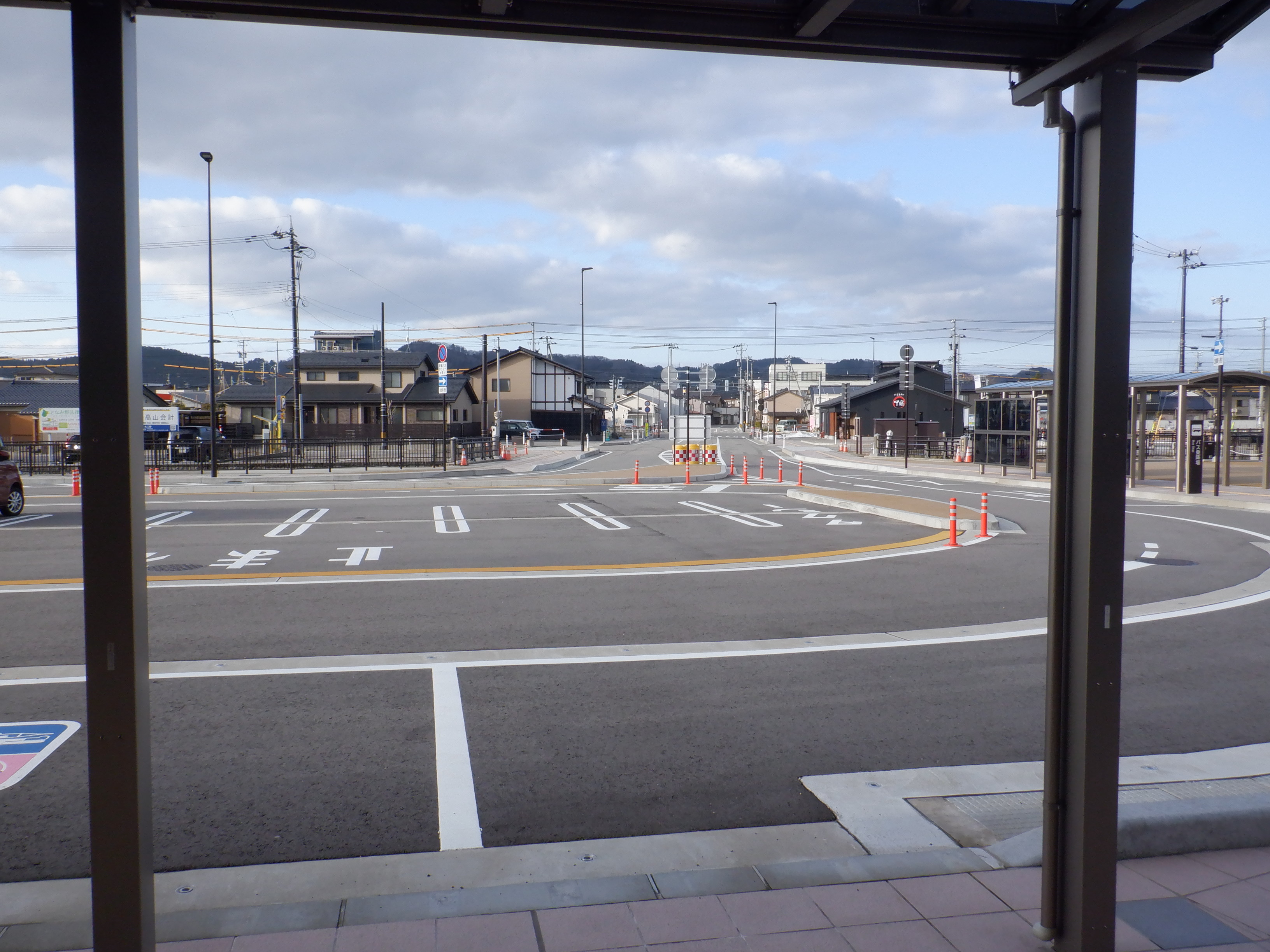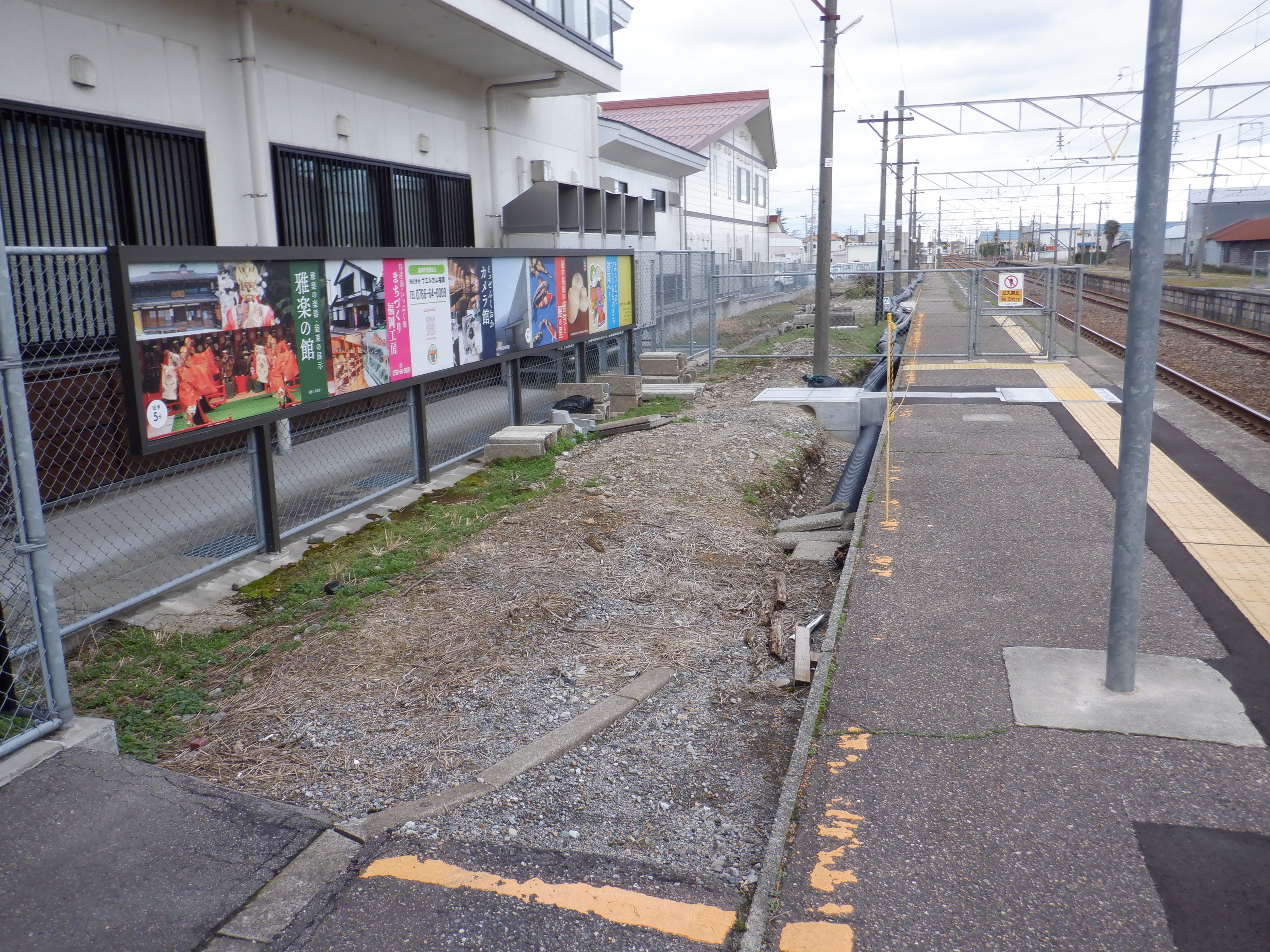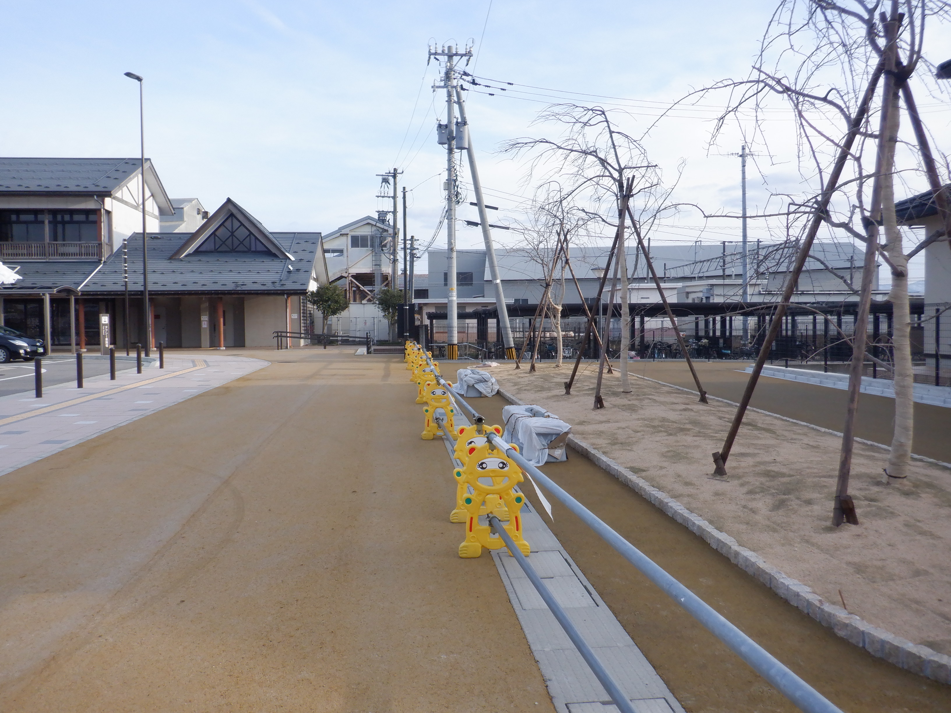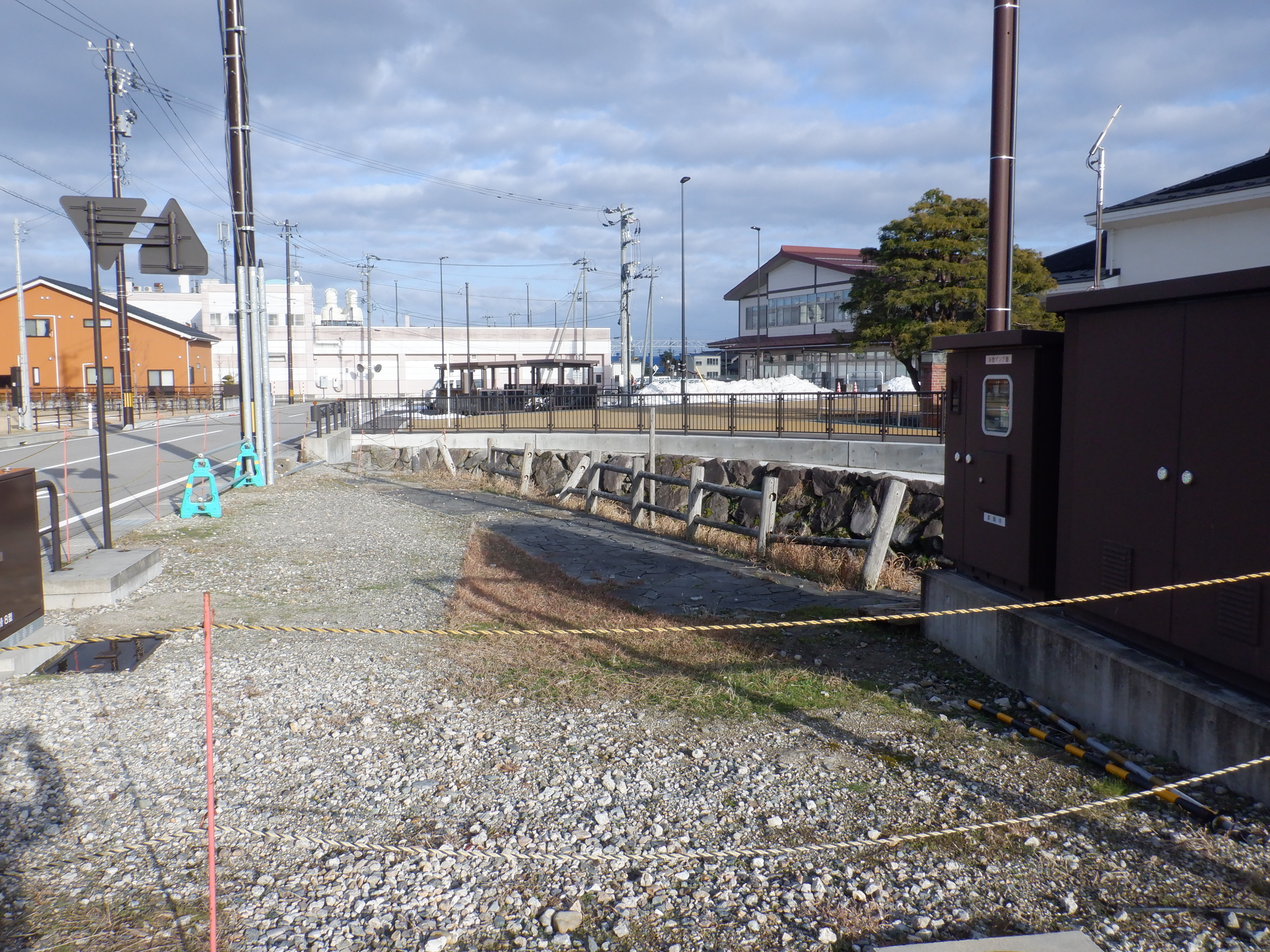 駅舎とにぎわい交流館の前の間で、エレベーター跨線橋ができるあたり。