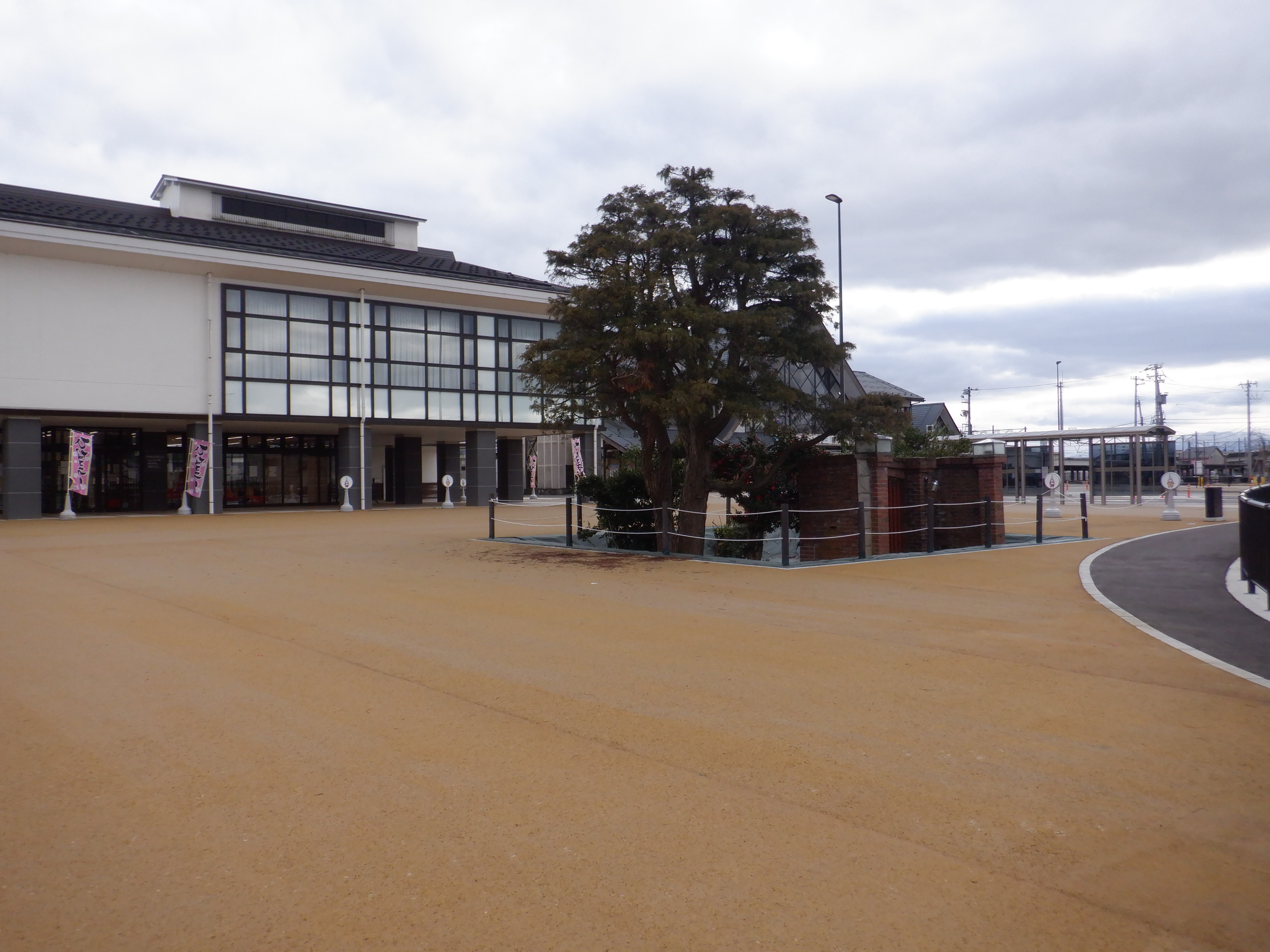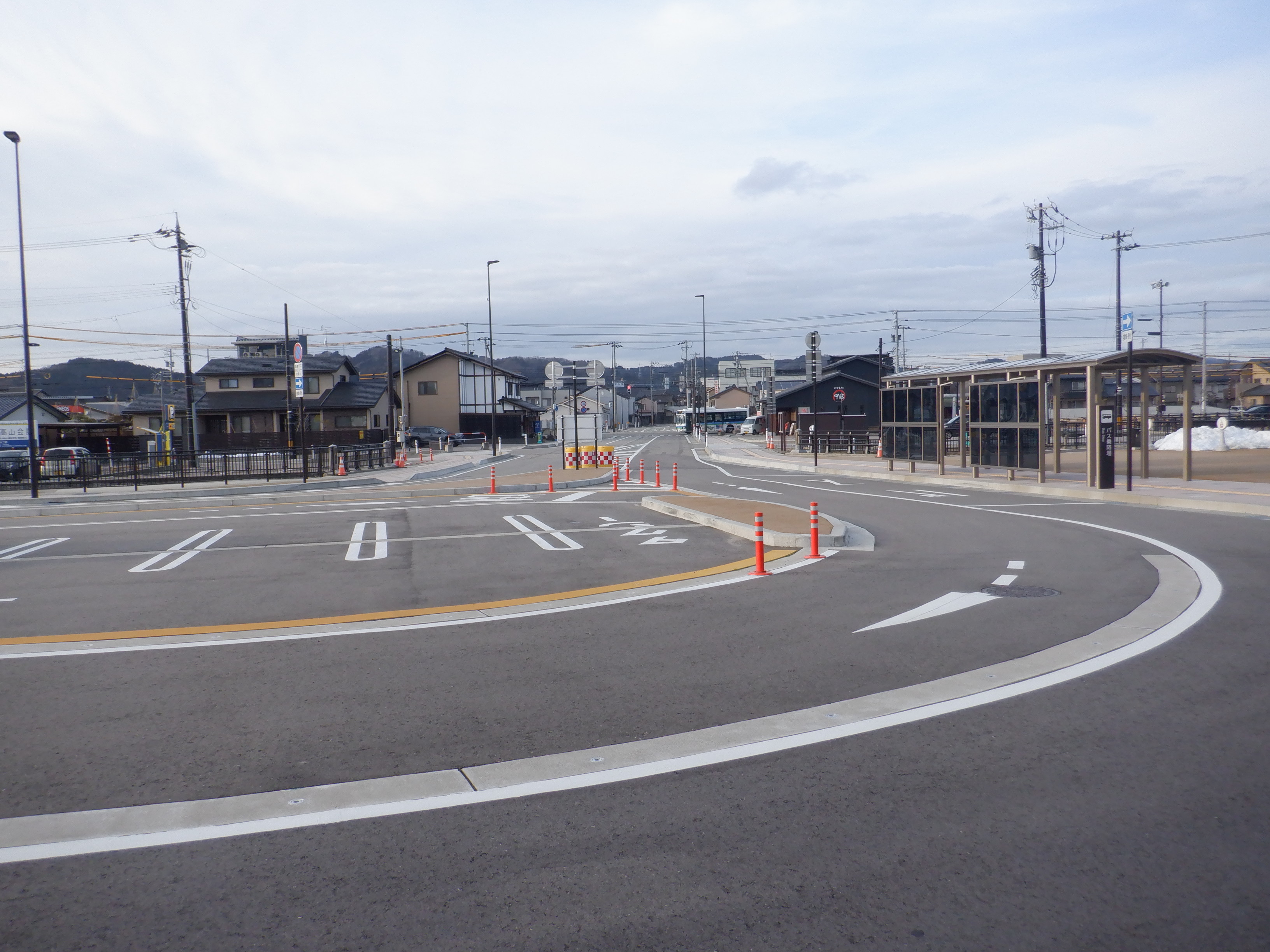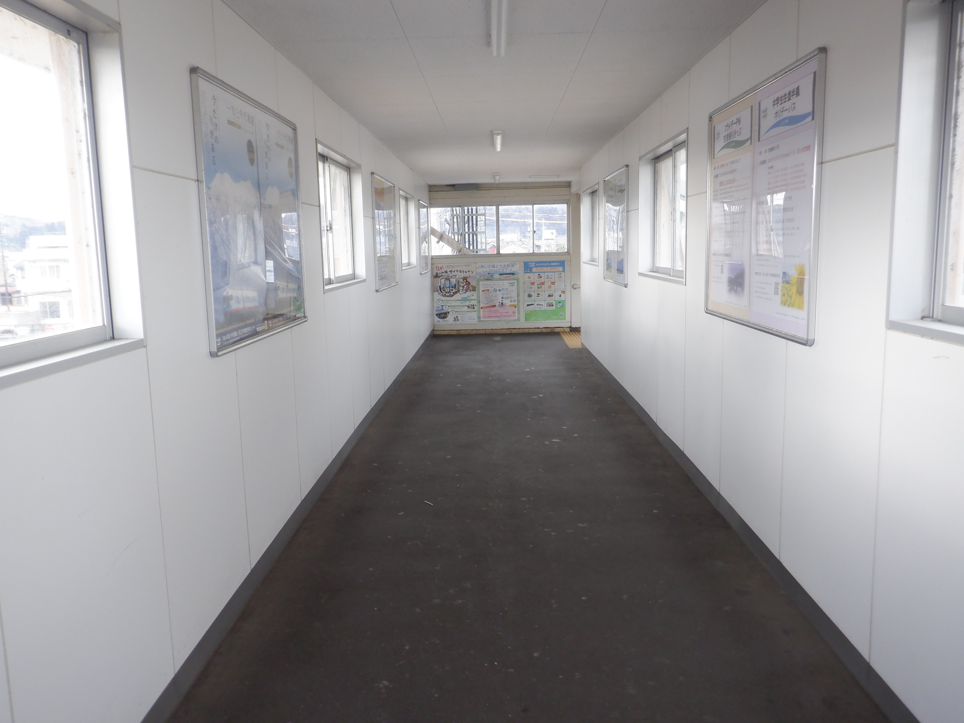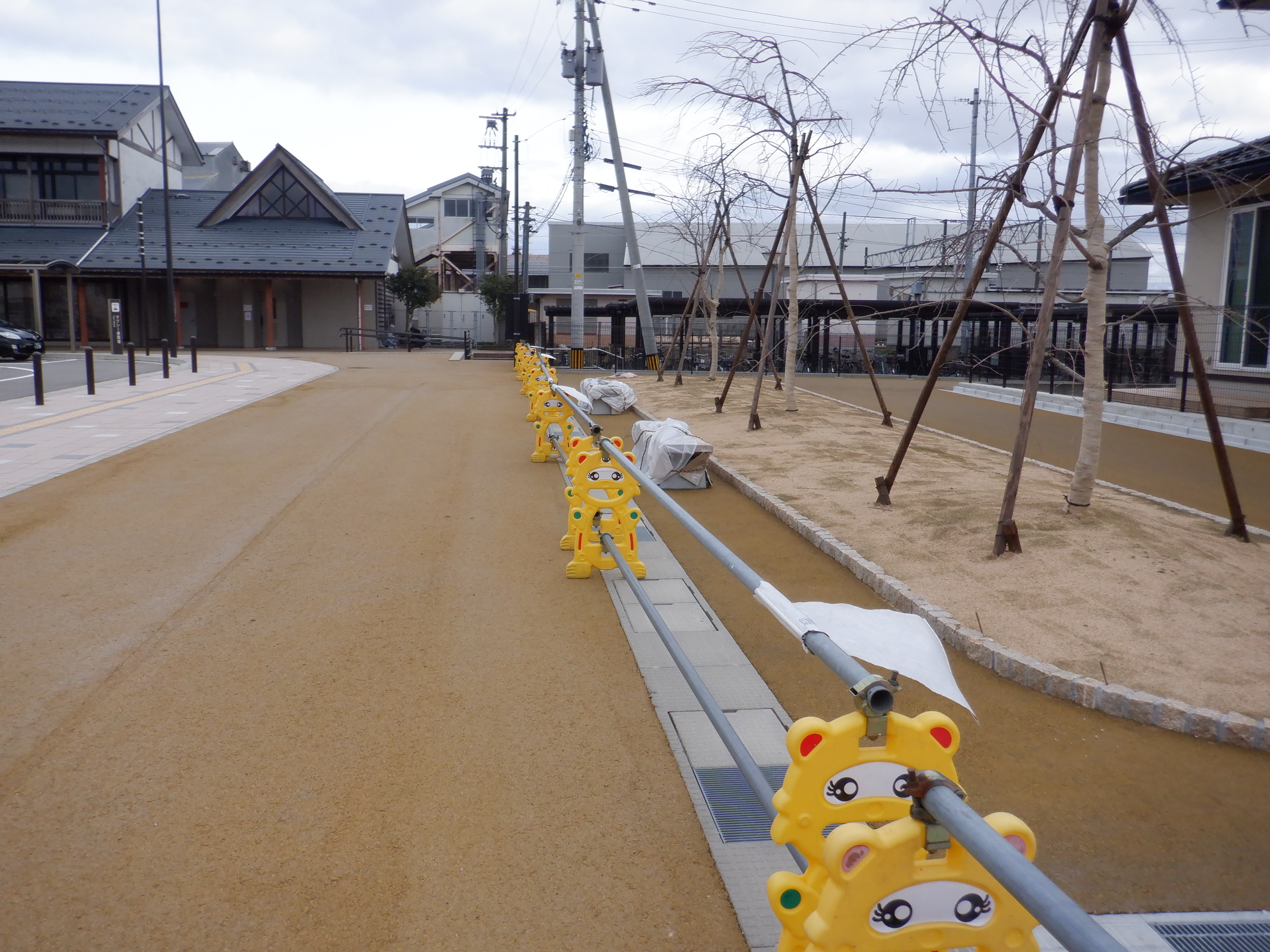 駅舎とにぎわい交流館の前の間で、エレベーター跨線橋ができるあたり。