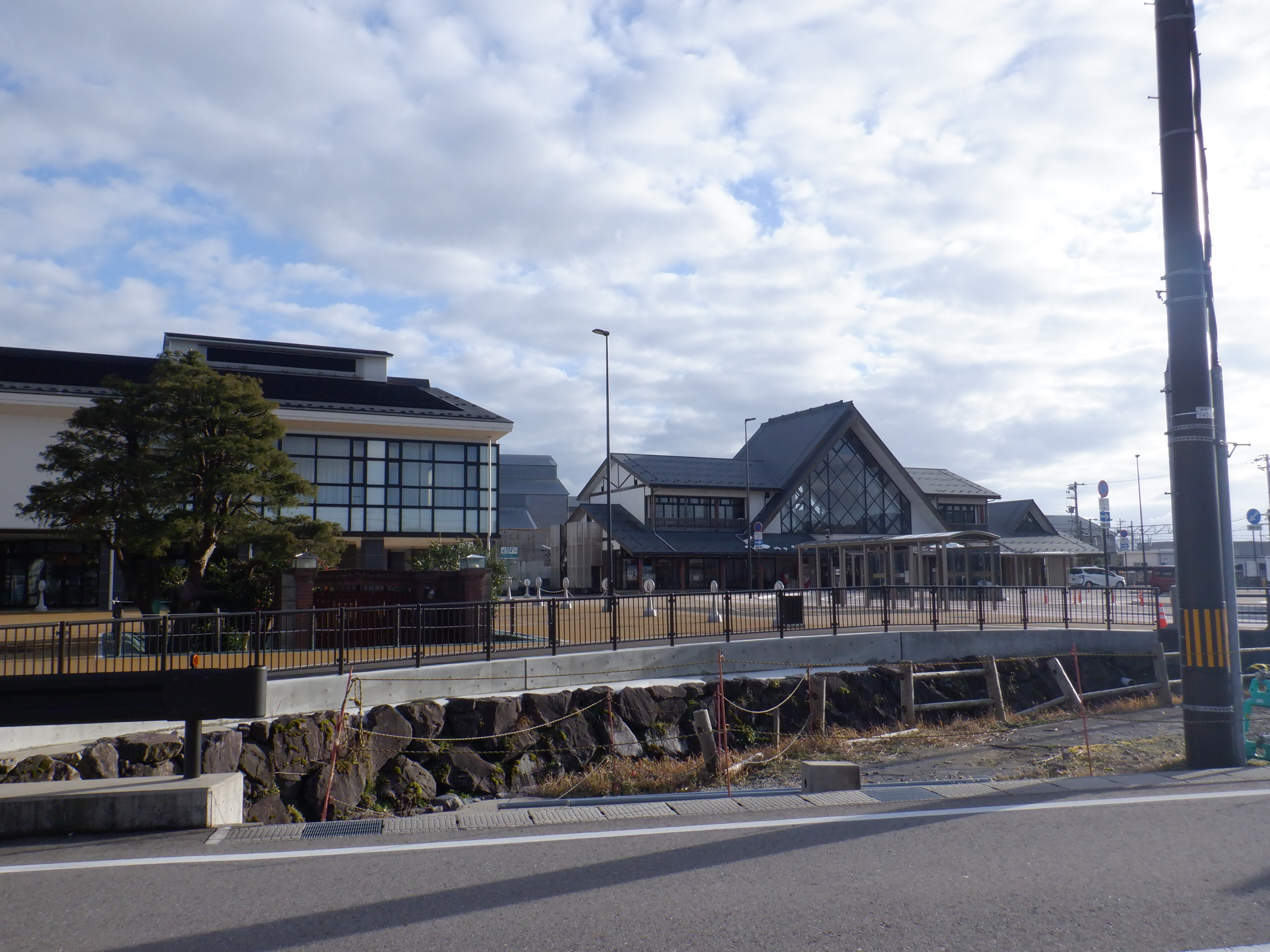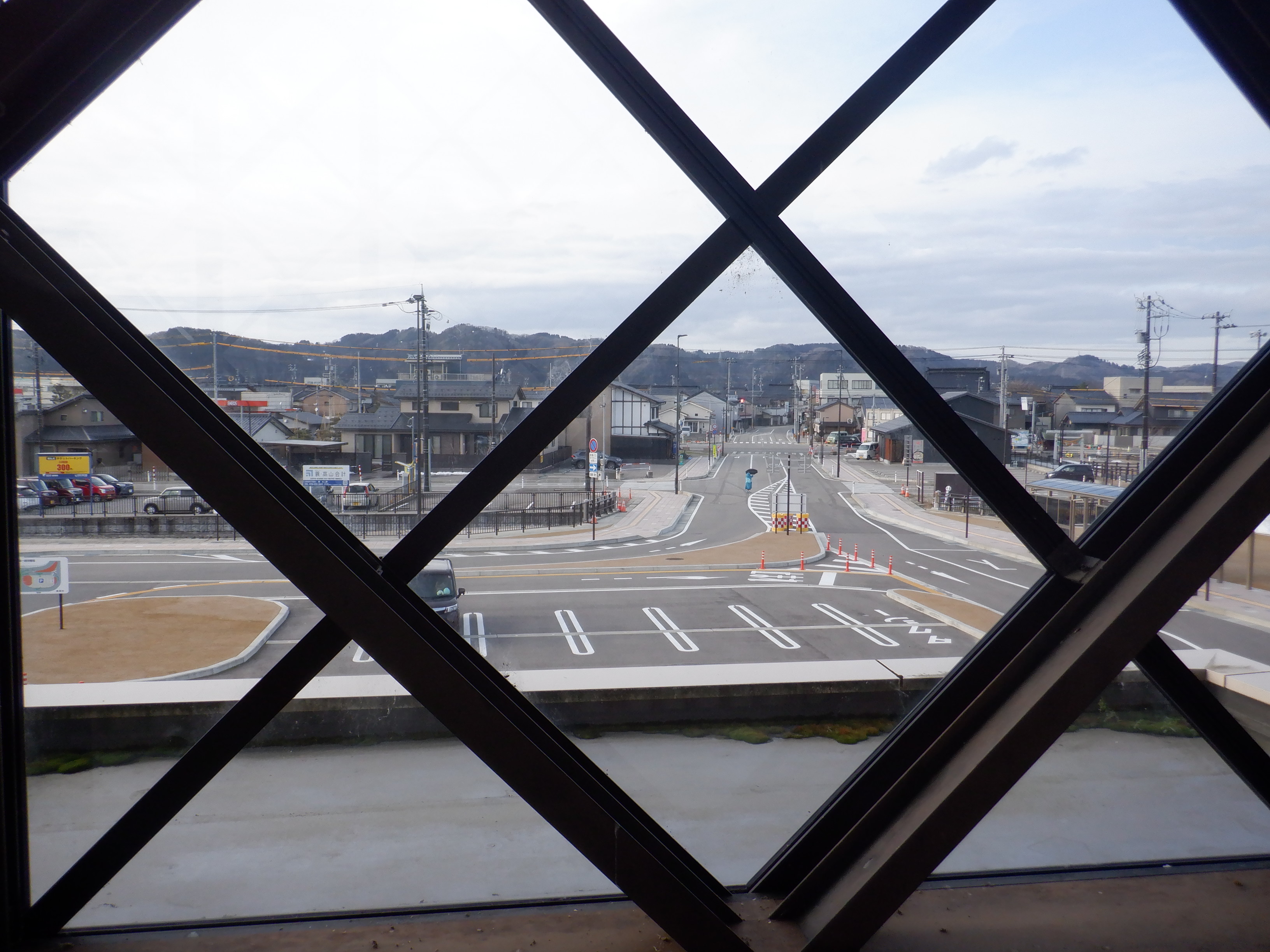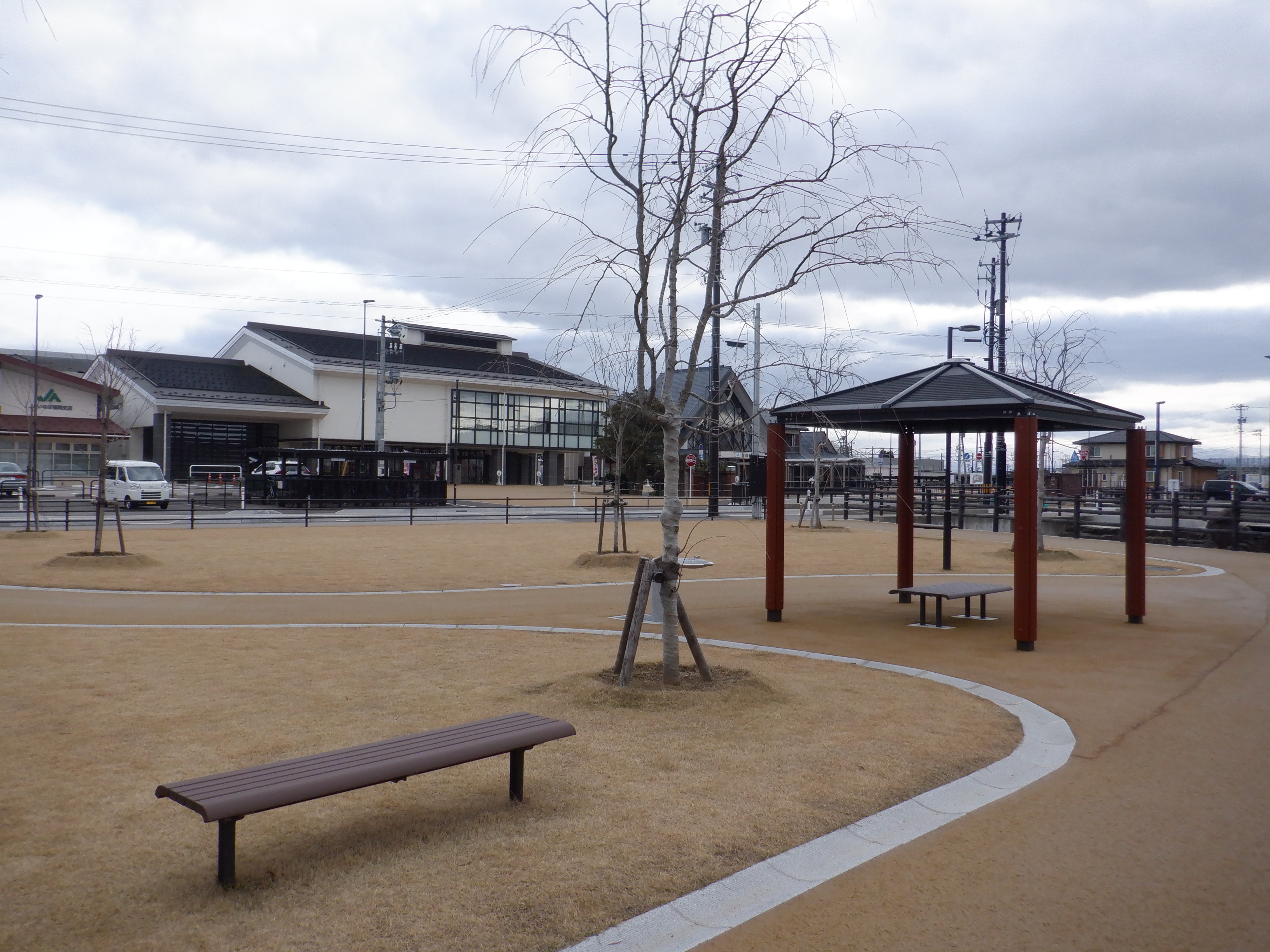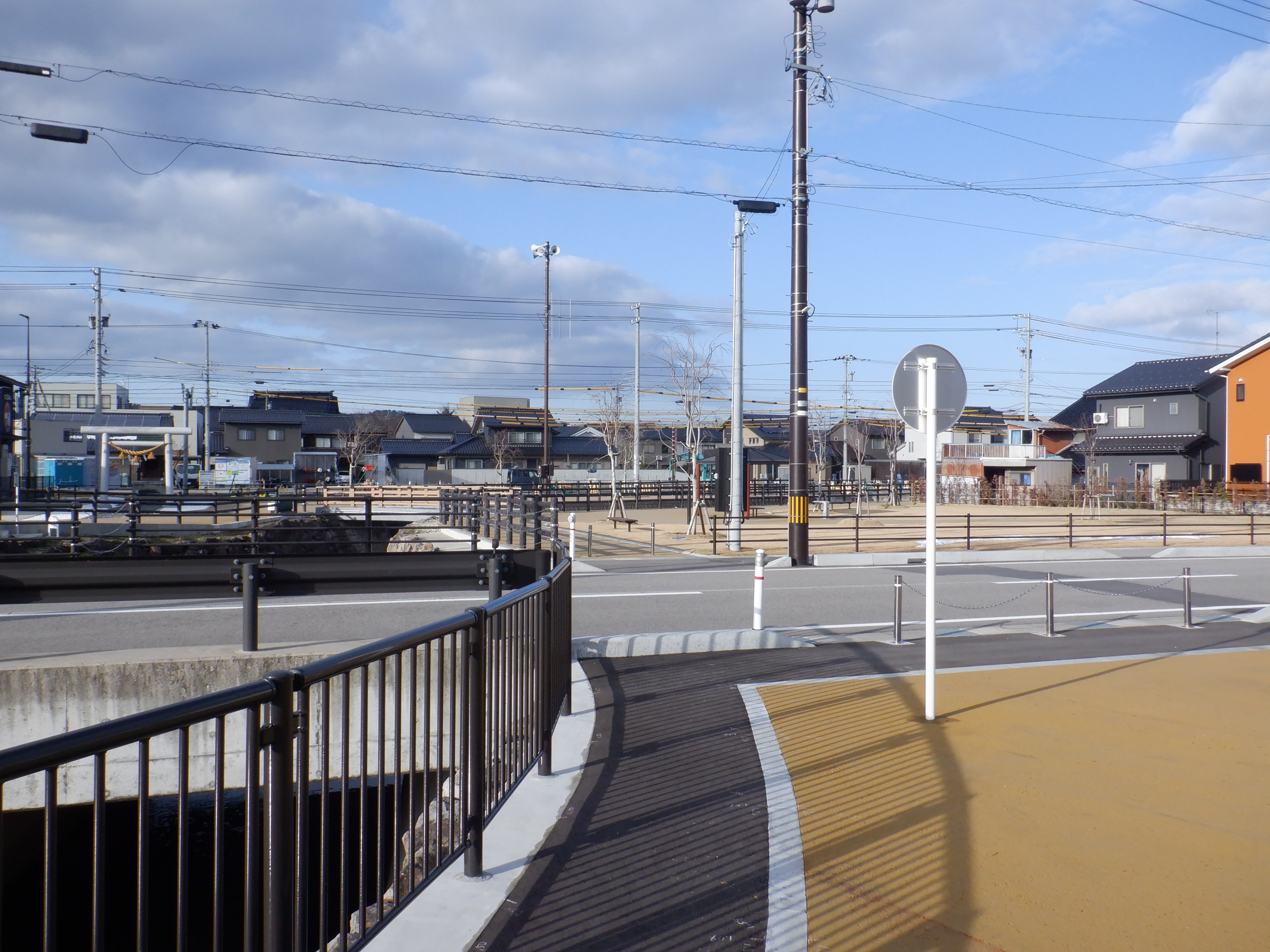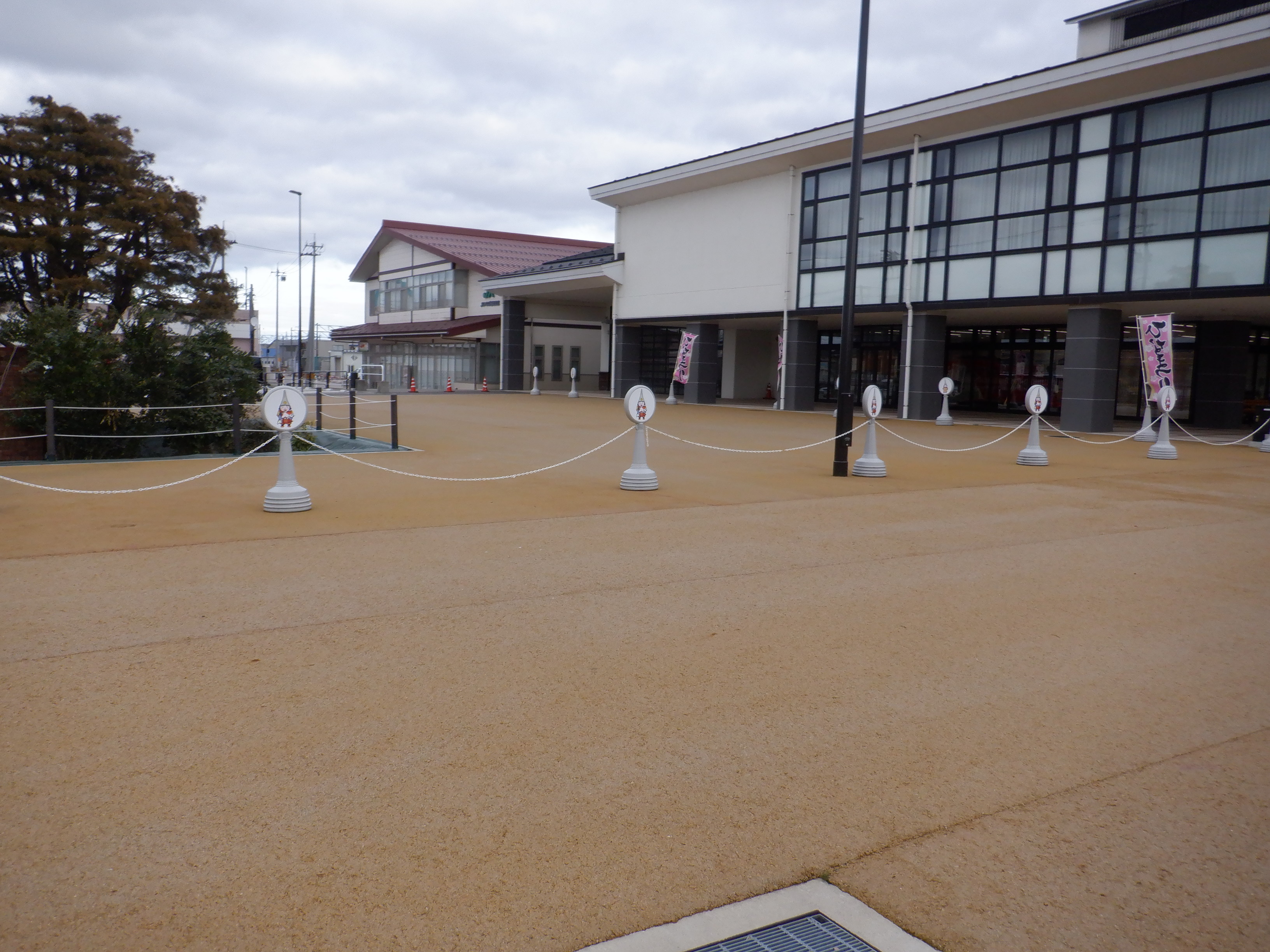 駅舎とにぎわい交流館の前の間で、エレベーター跨線橋ができるあたり。