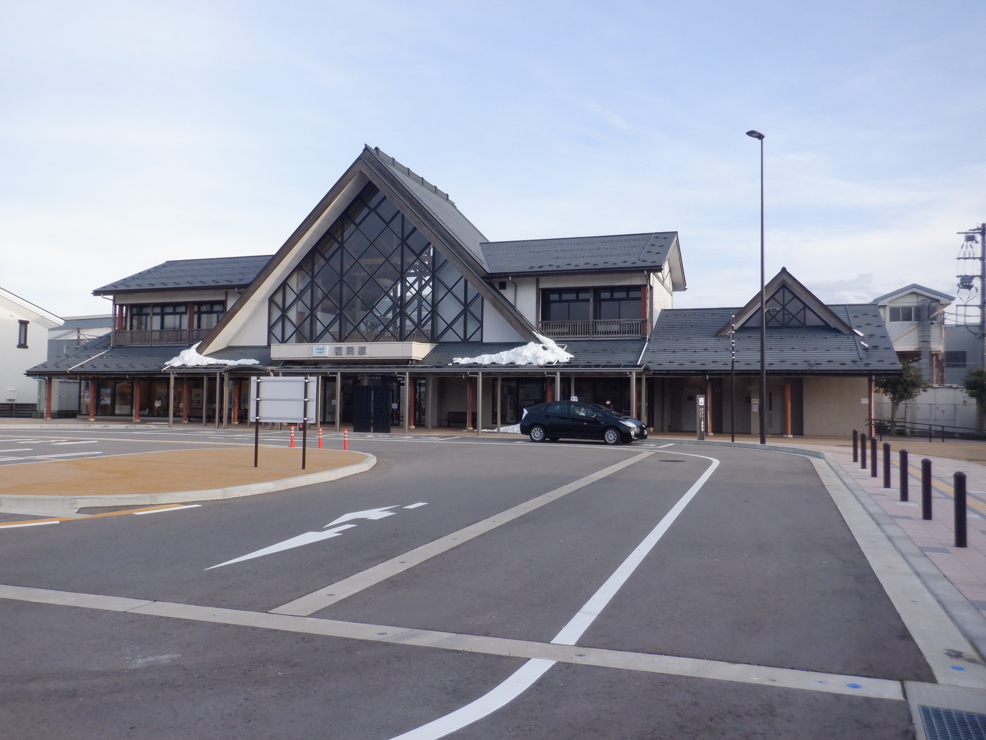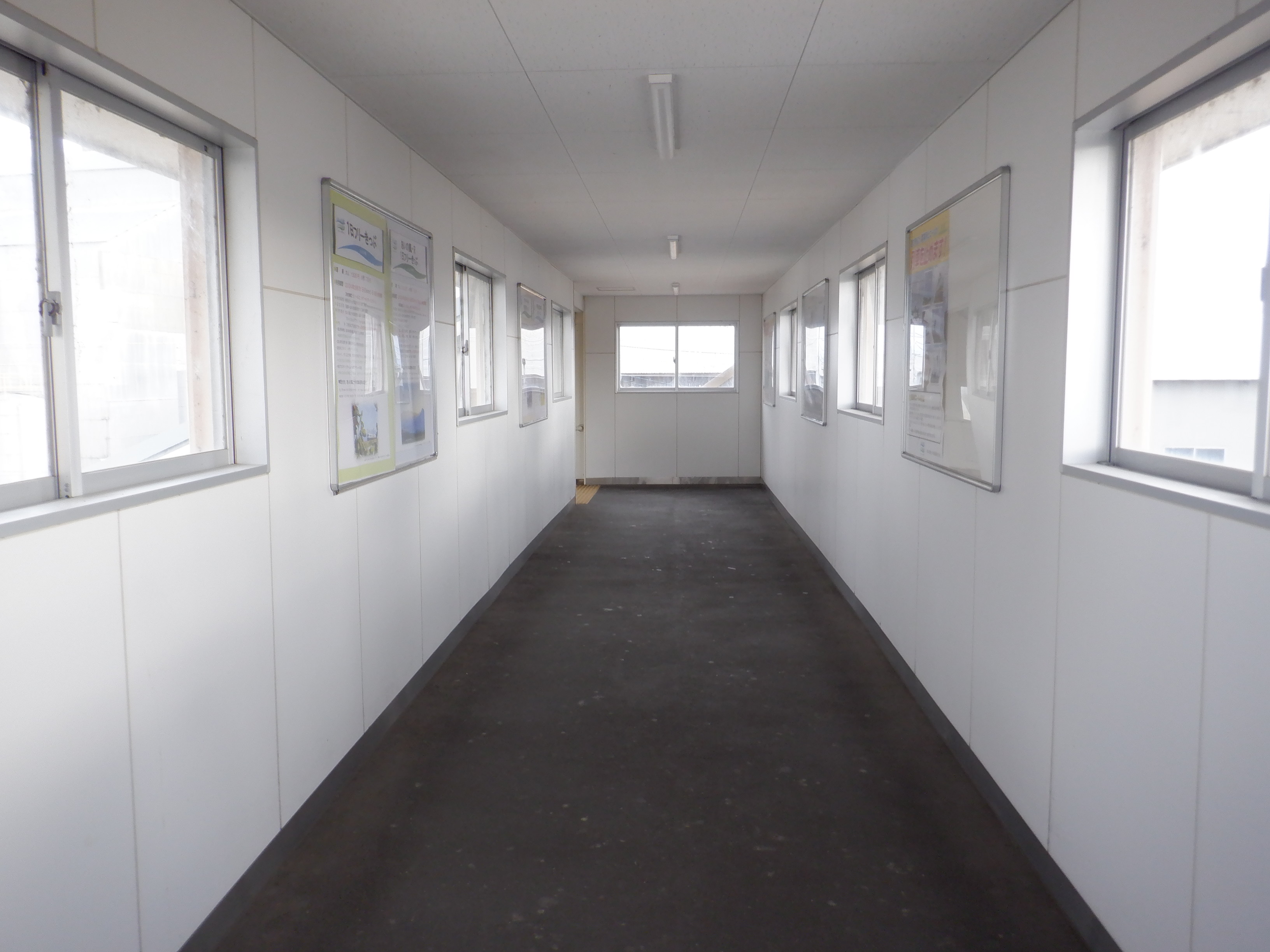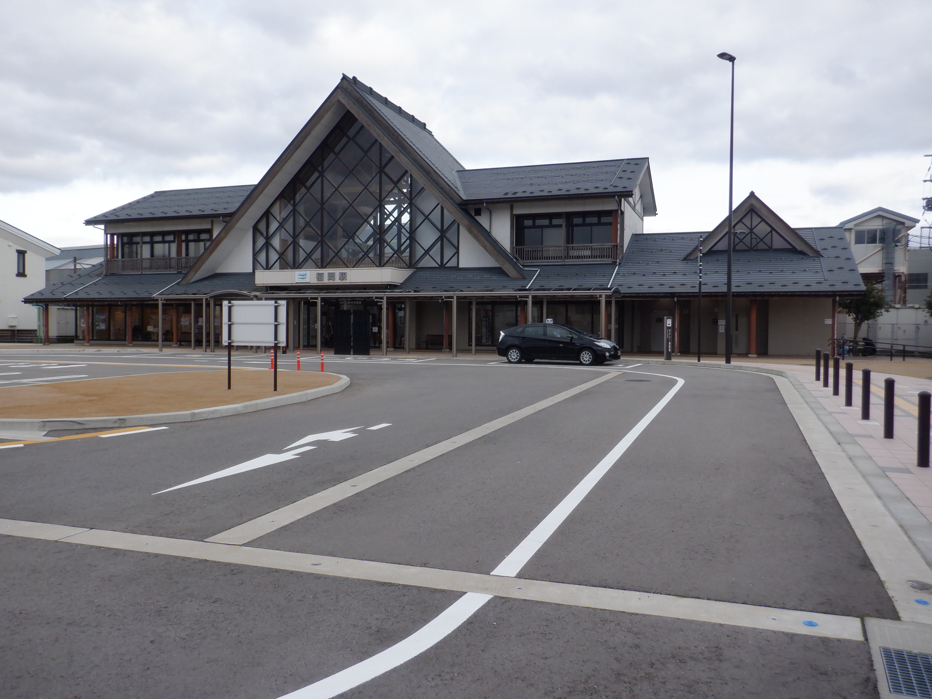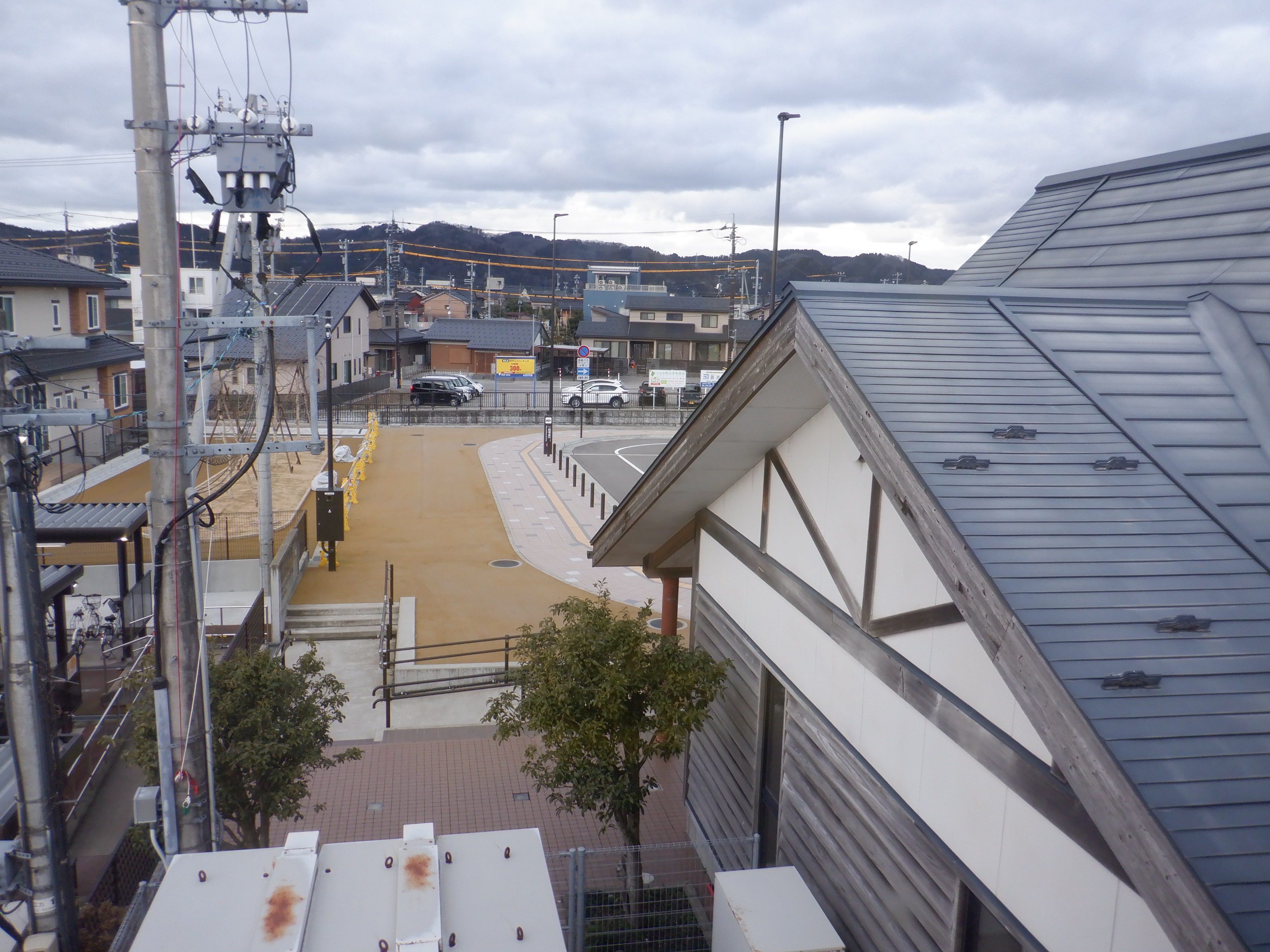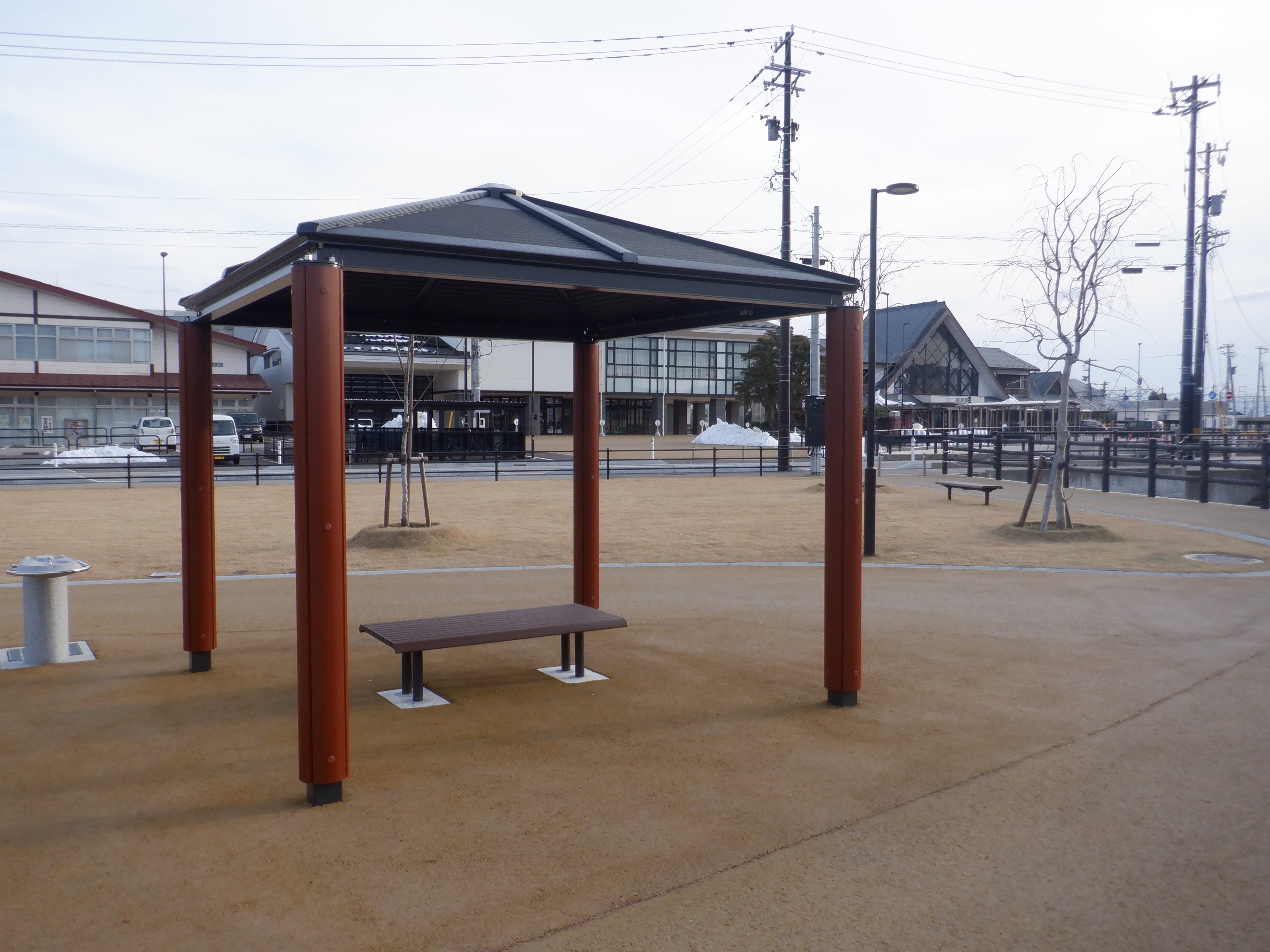 駅舎とにぎわい交流館の前の間で、エレベーター跨線橋ができるあたり。
