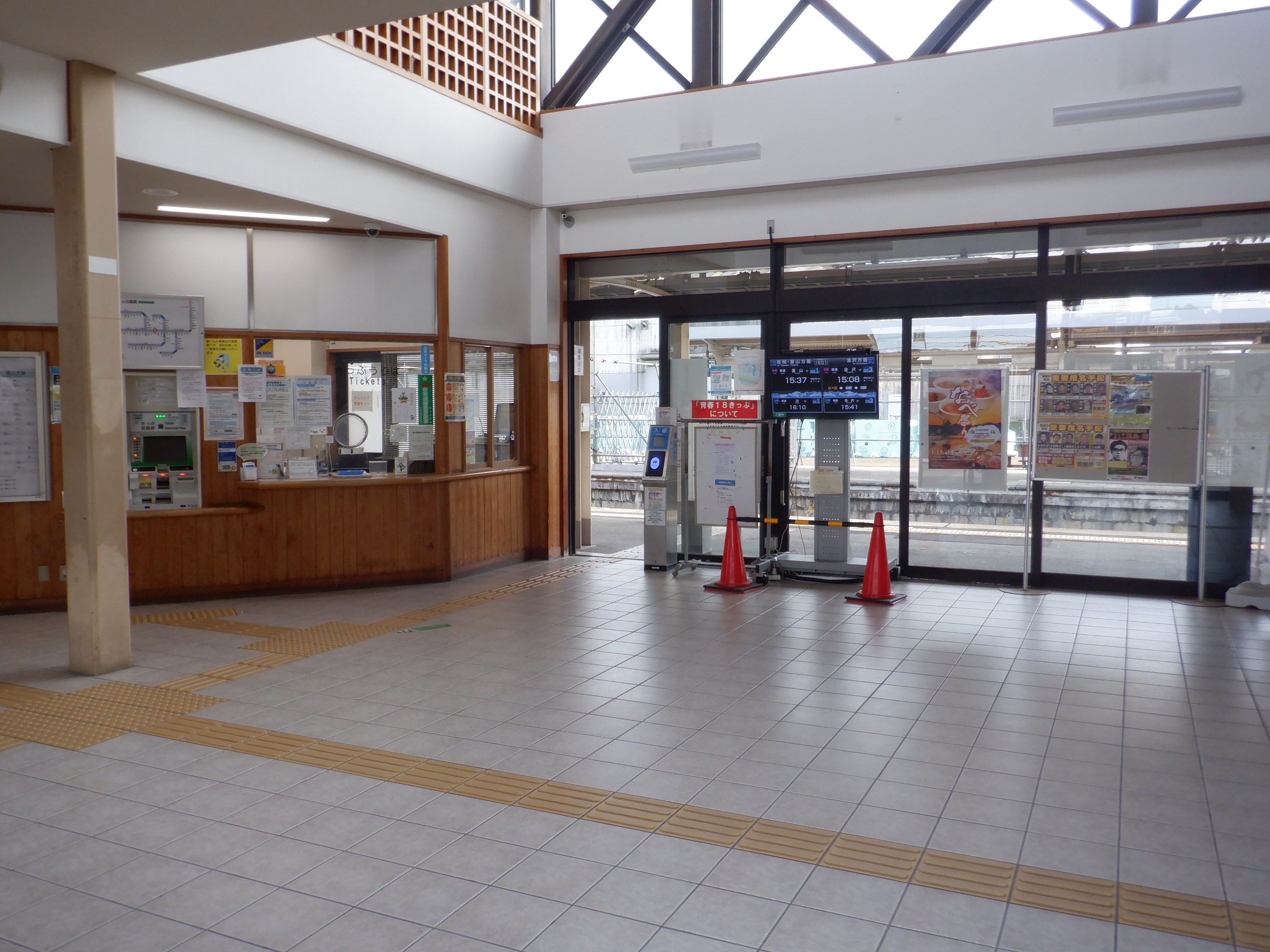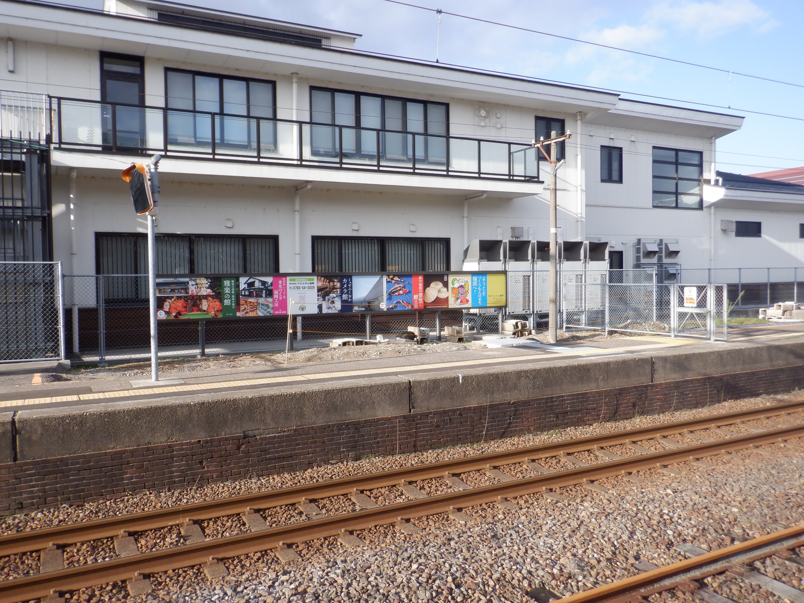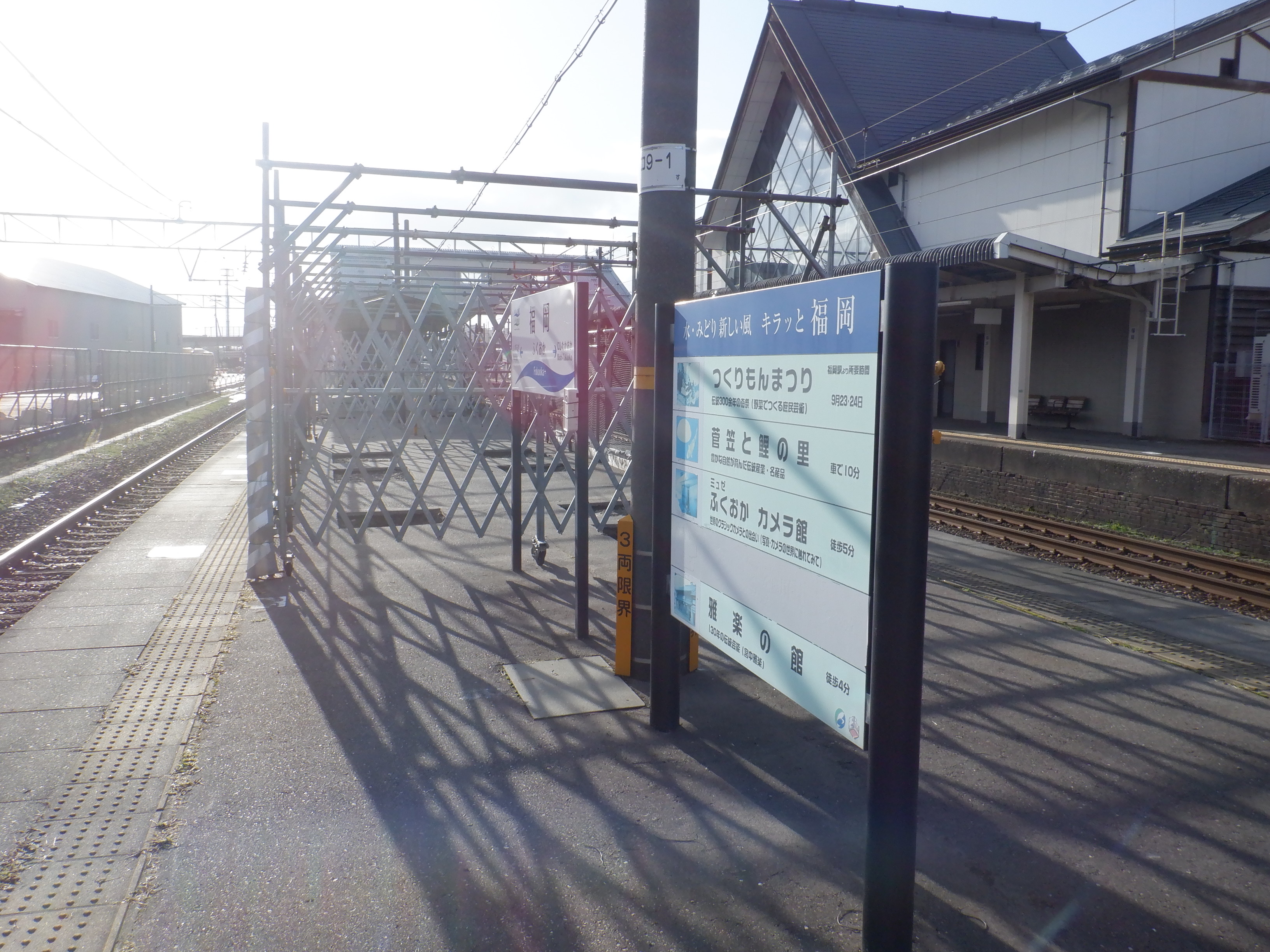 駅名標・名所案内とエレベーター跨線橋ができるところの囲い。