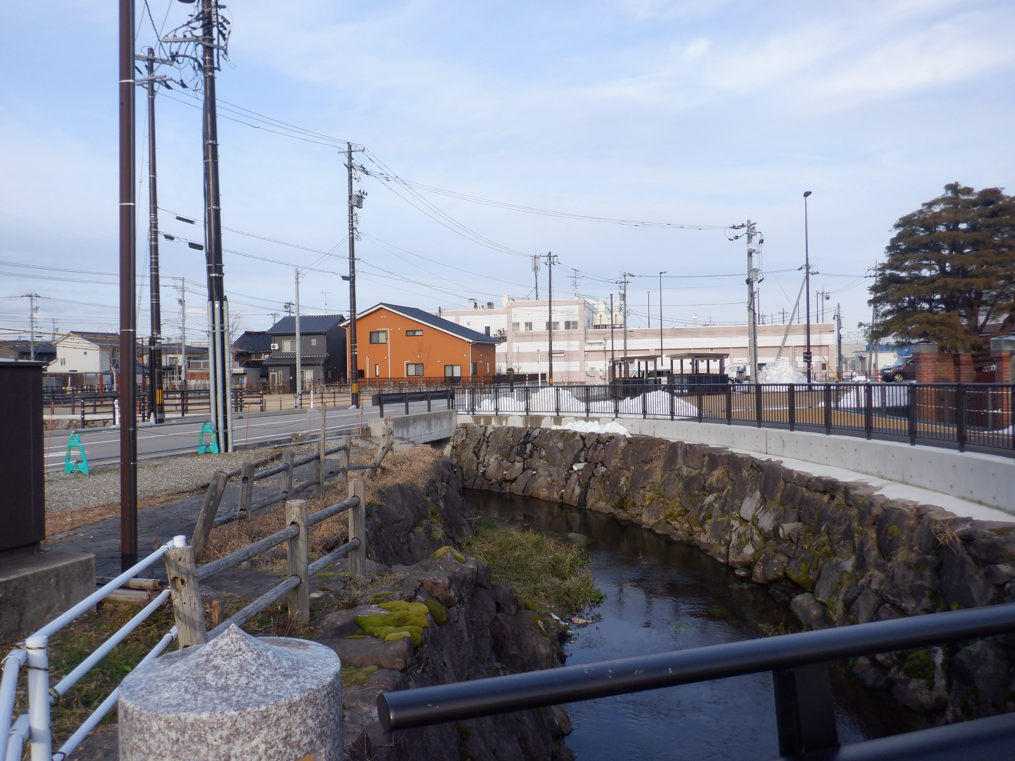 にぎわい交流館の前の広場と蓑川を挟んだ空間。こちらもこのあと整備されます。