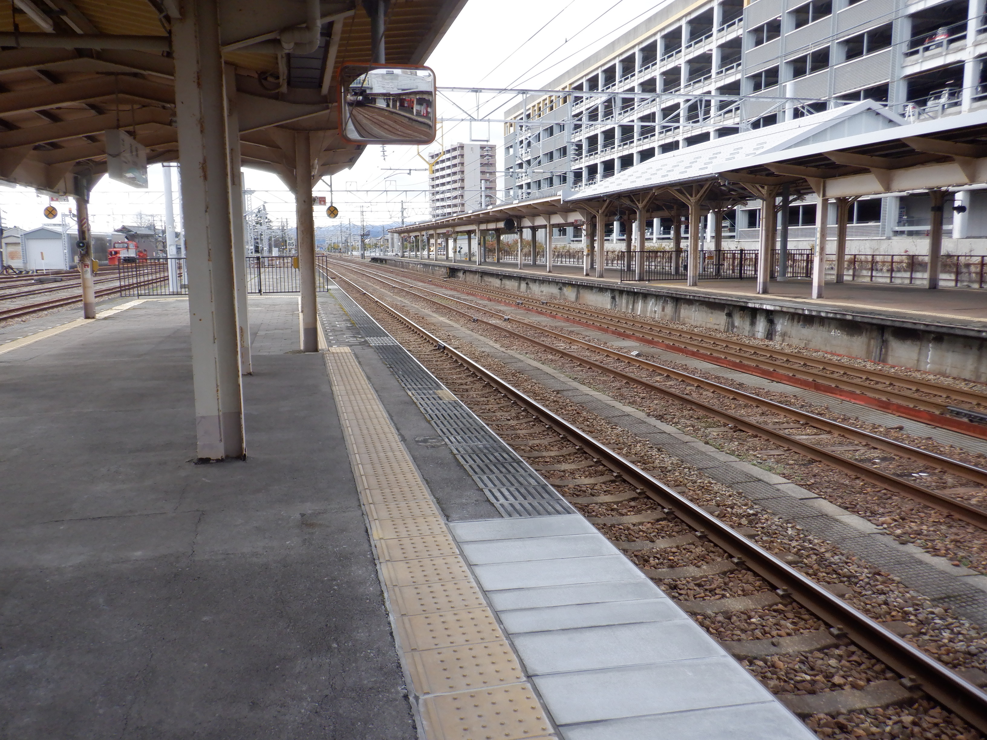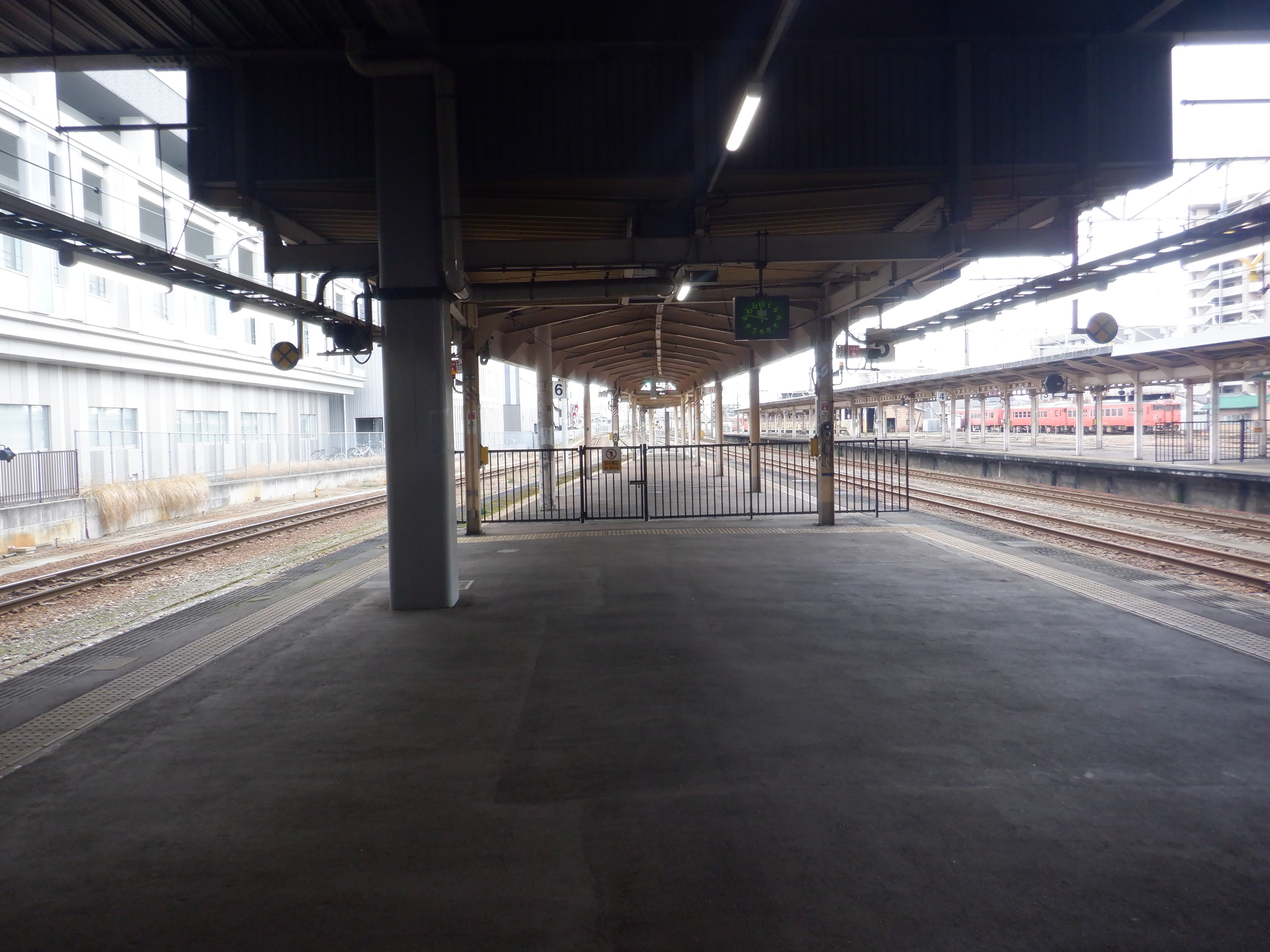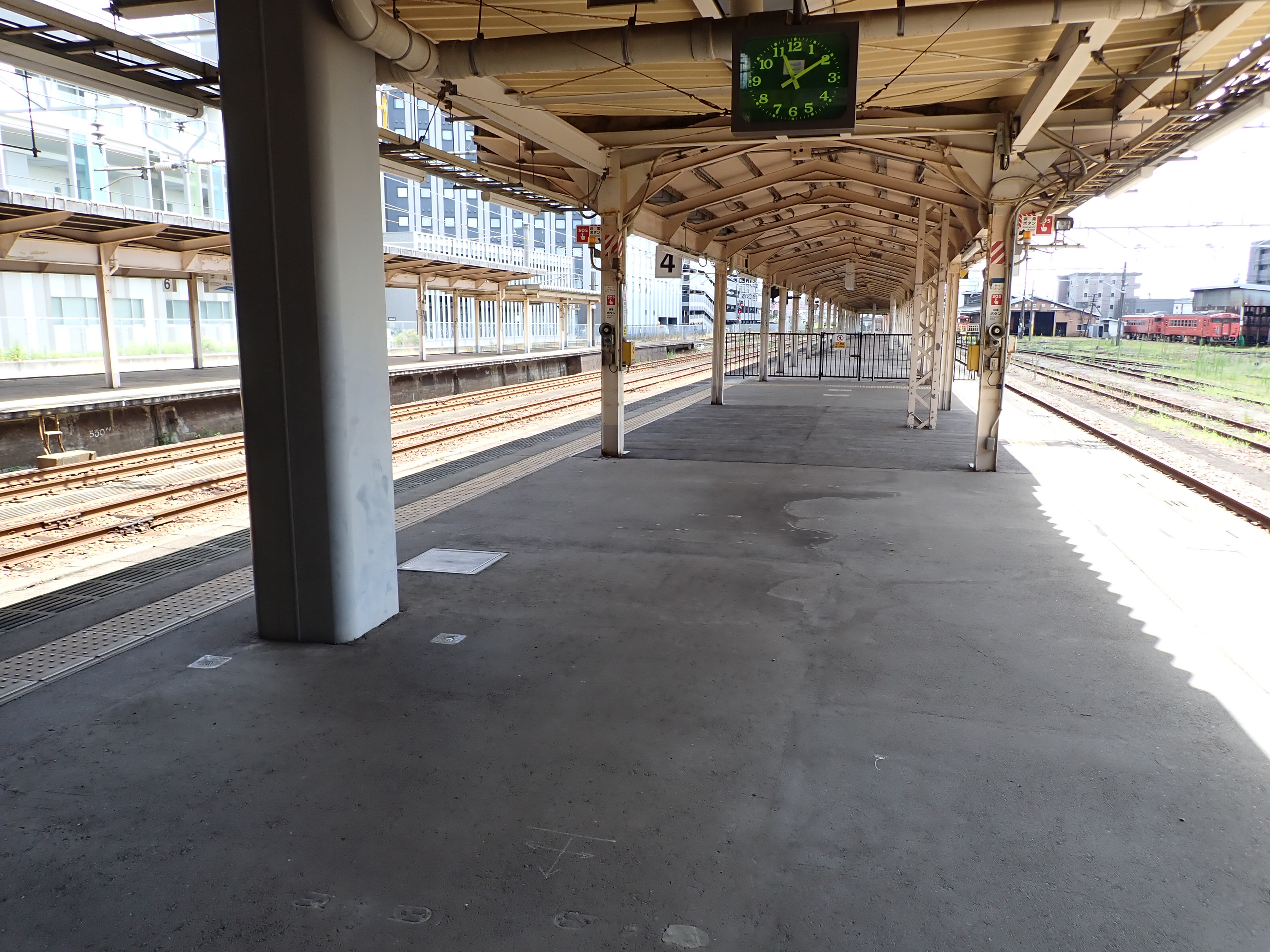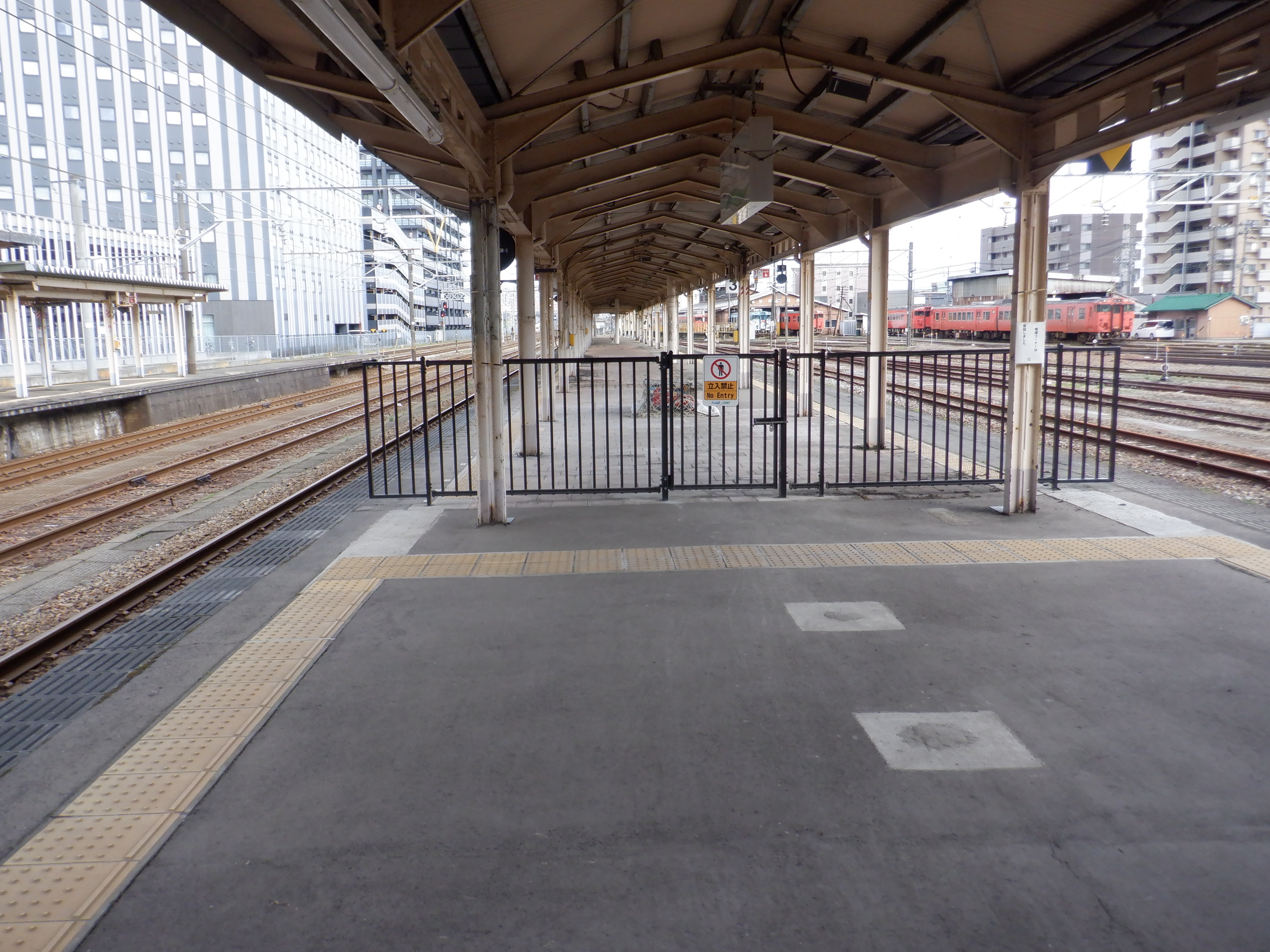 3・4番のりばの越中大門駅側。柵の外に何か資材が置かれています。