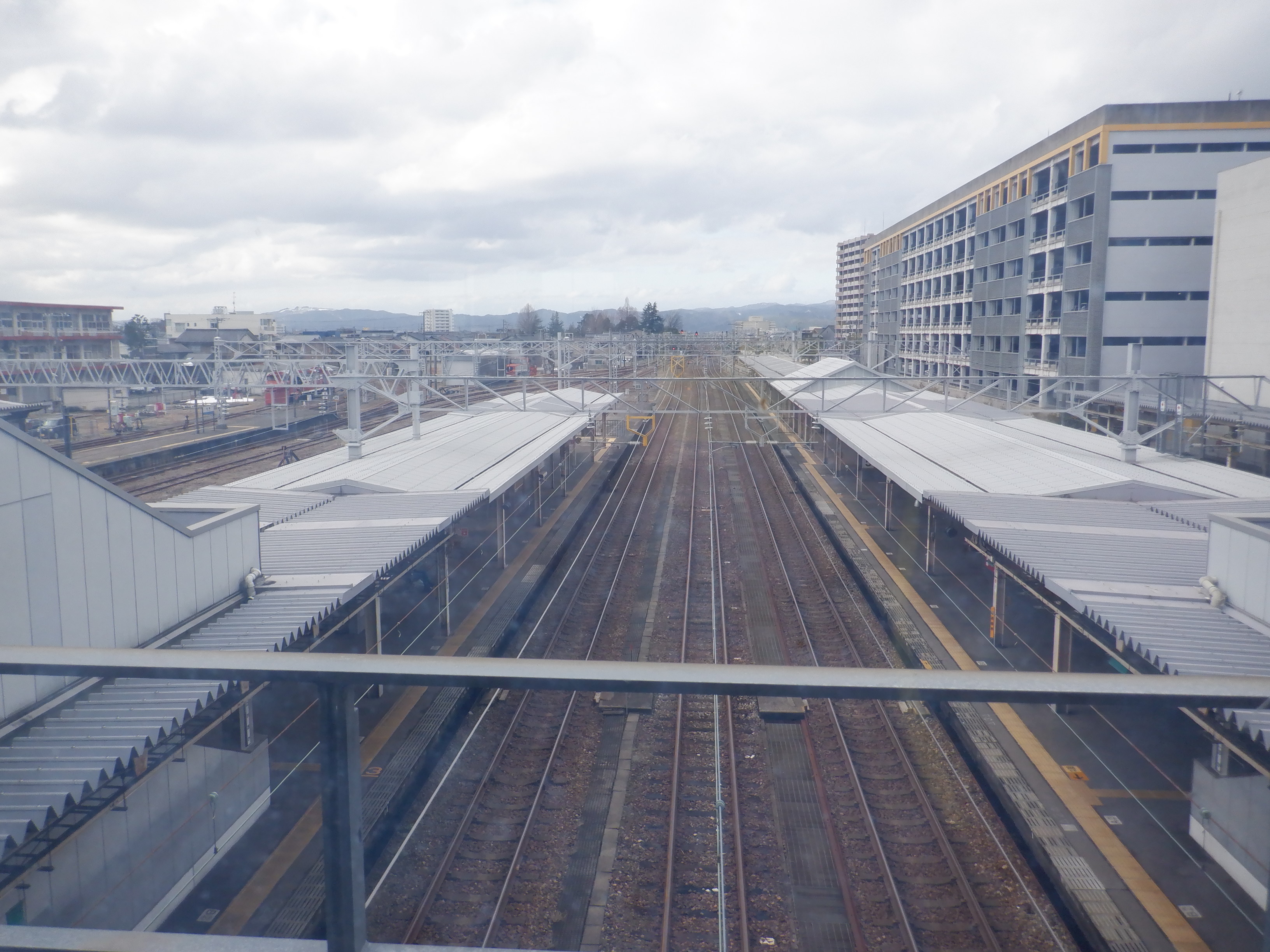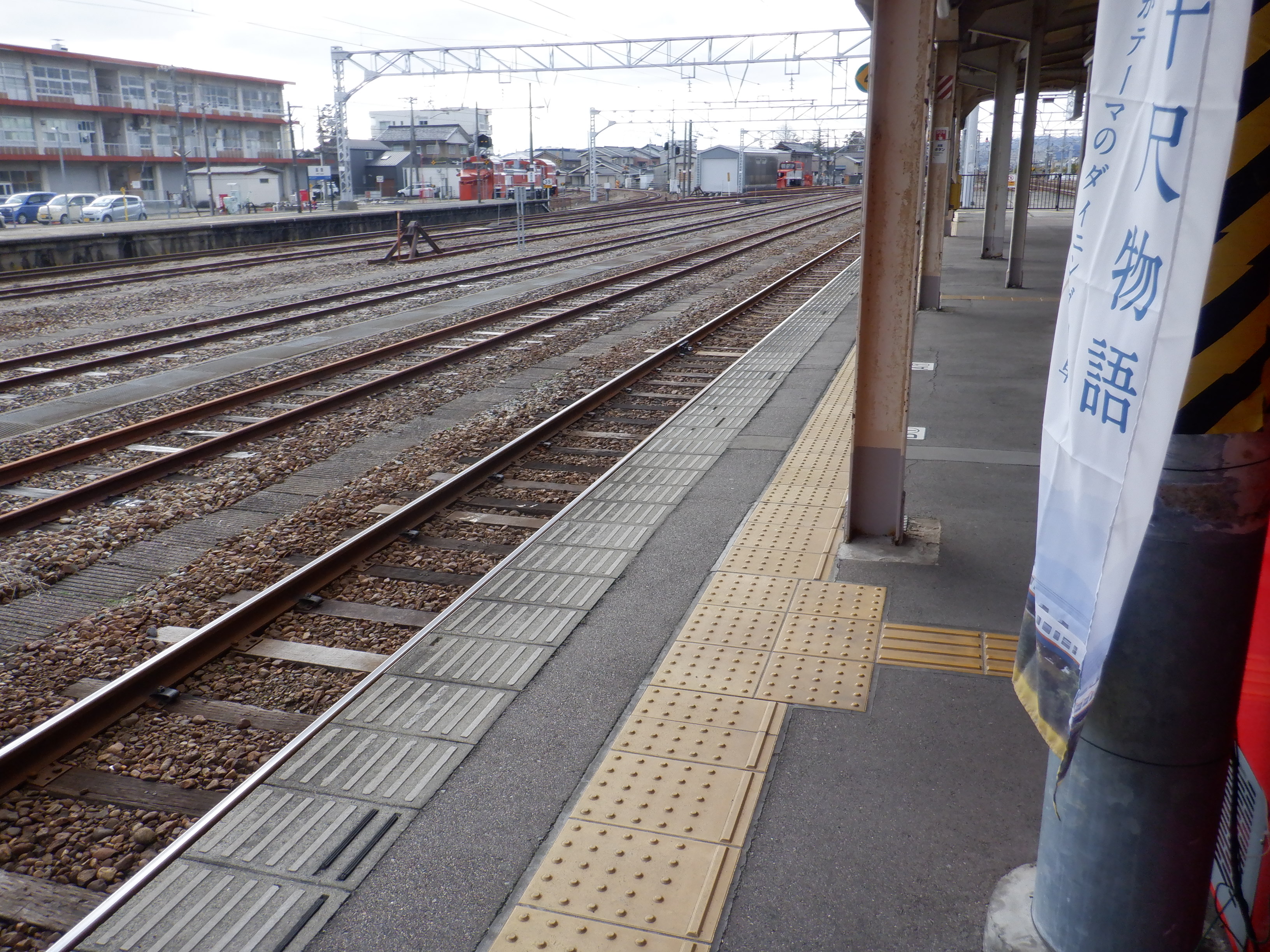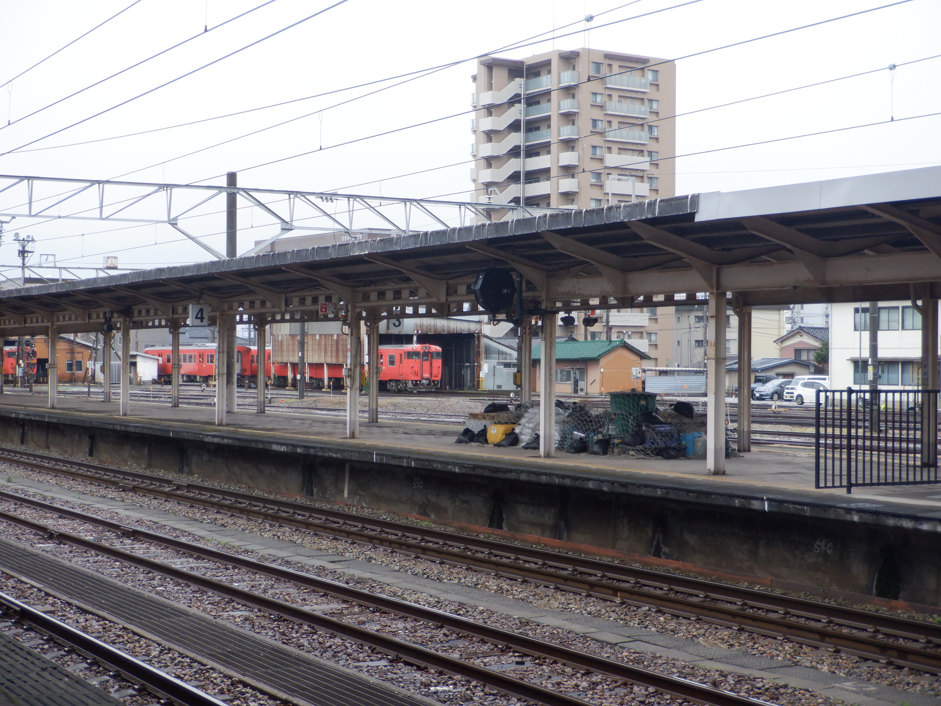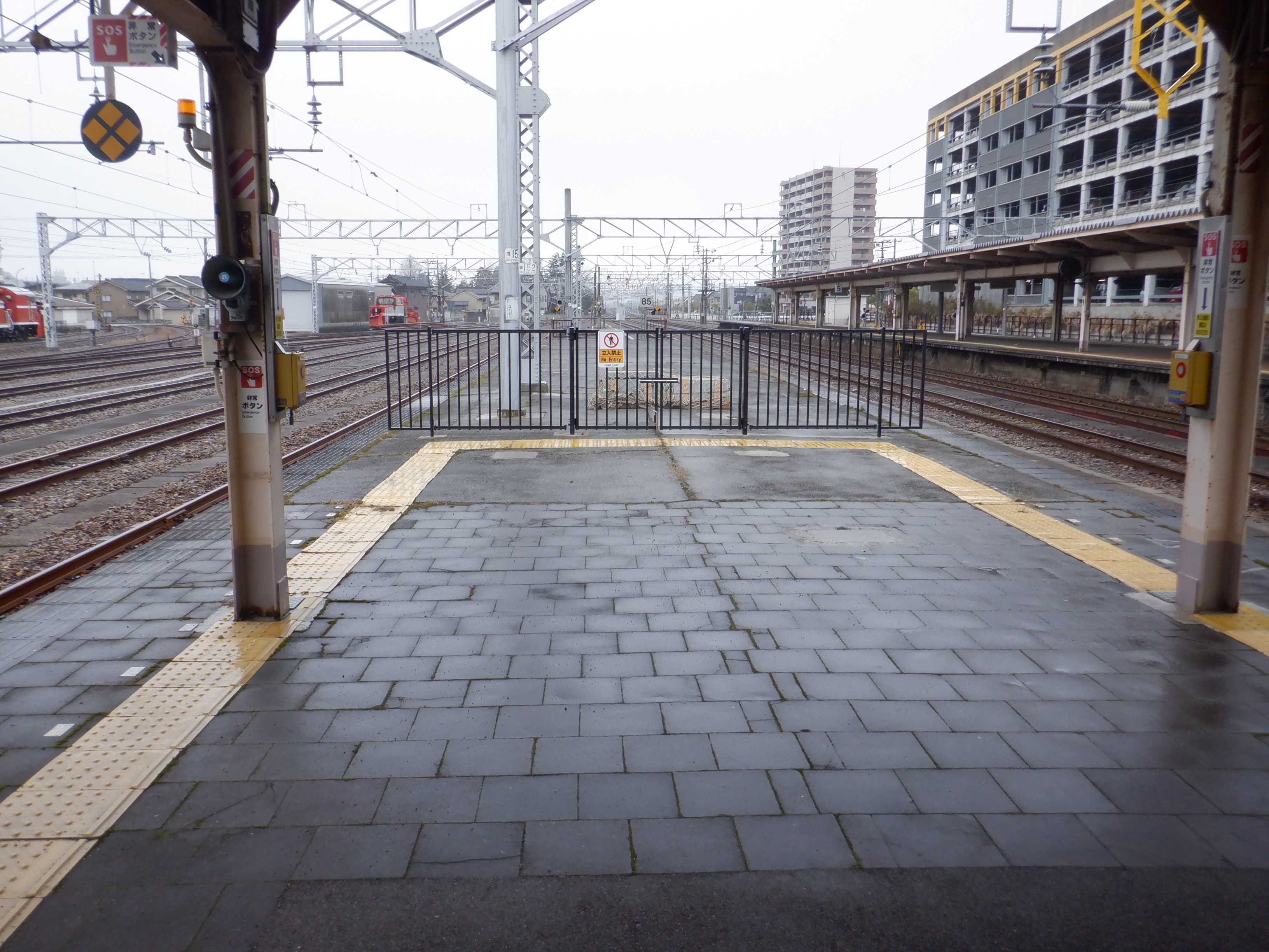 3・4番のりばの越中大門駅側。柵の外に何か資材が置かれています。