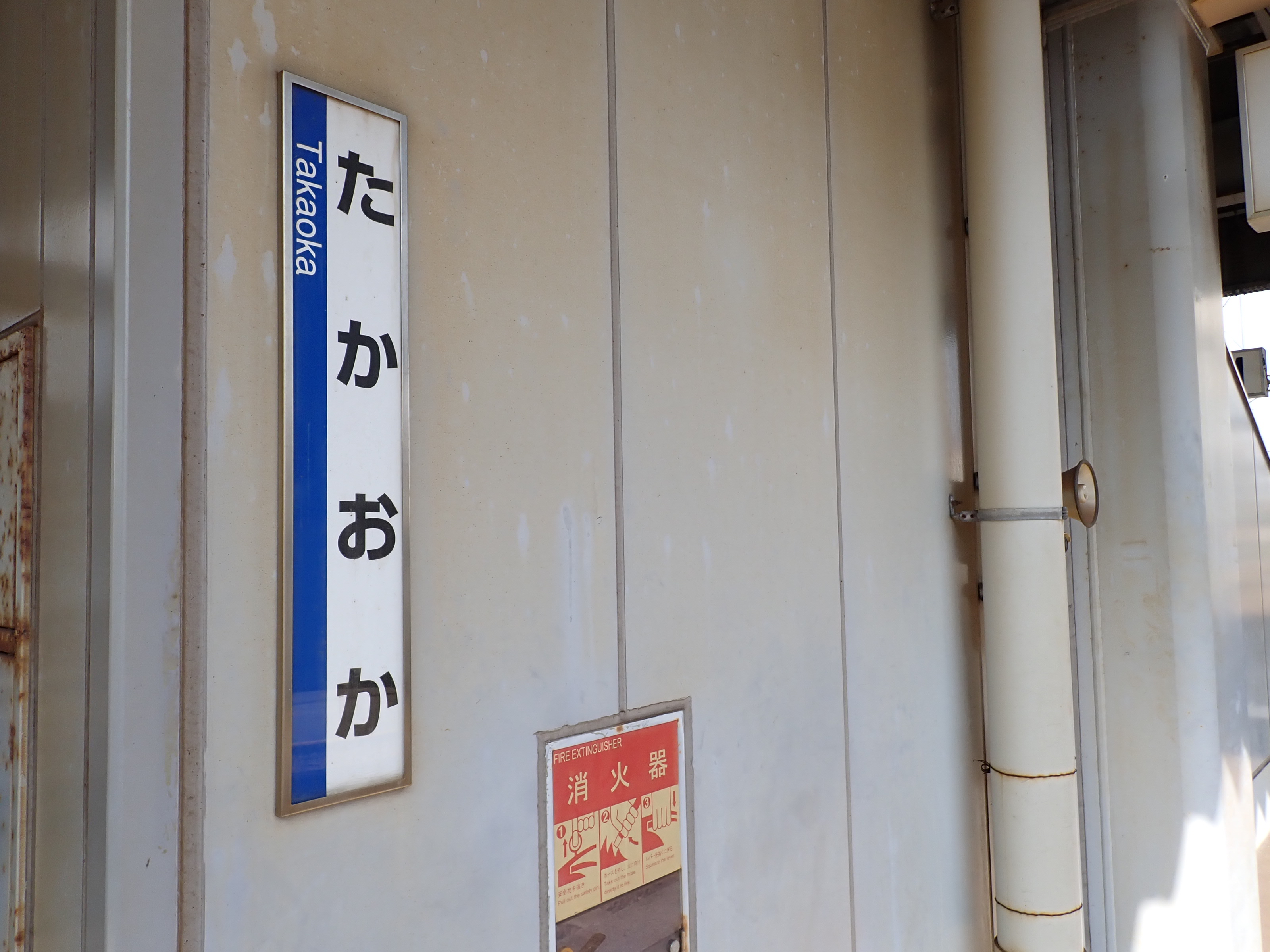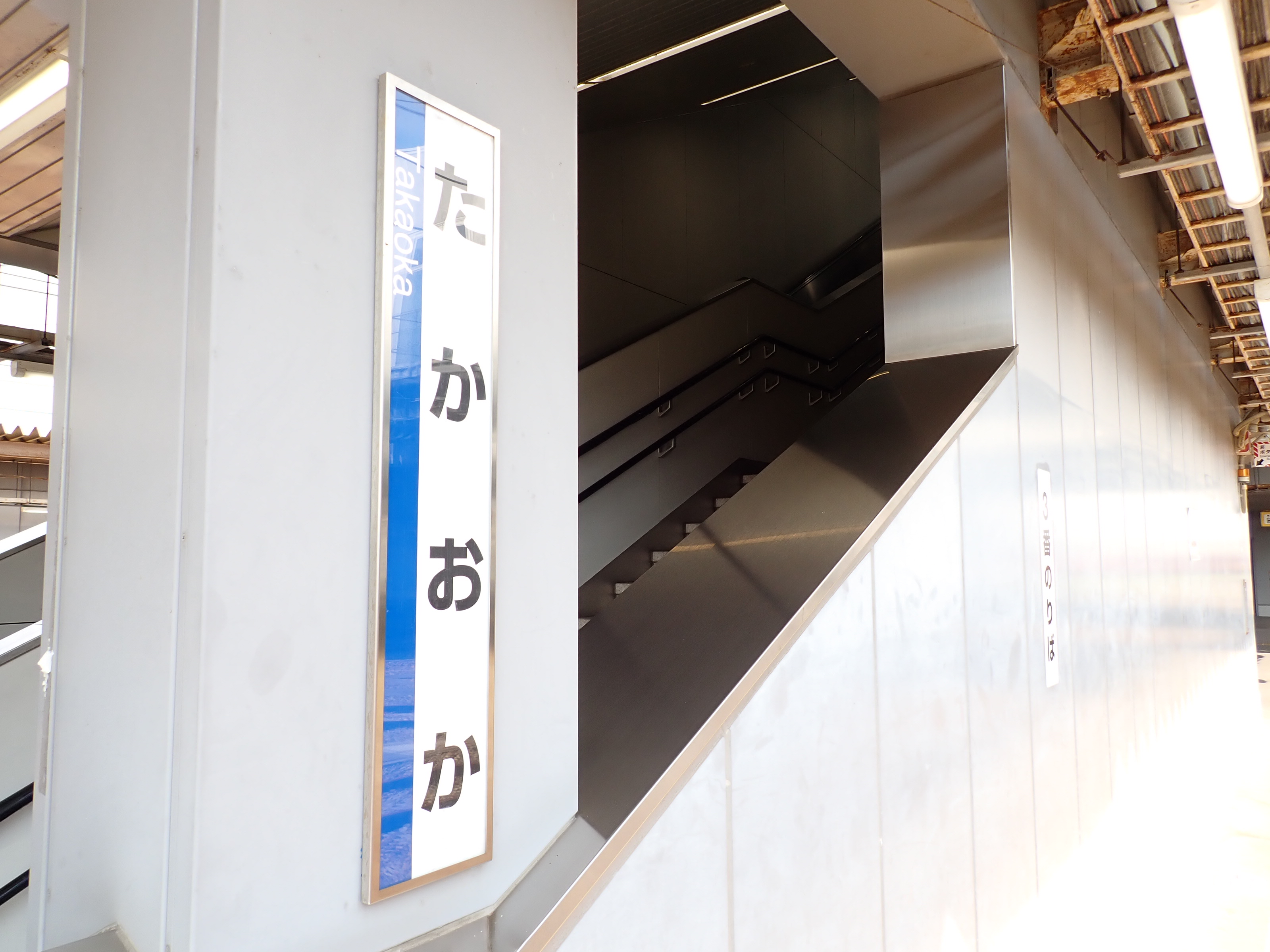 3番のりばの柱の駅名標と高岡やぶなみ駅側階段付近に貼られた番線標。