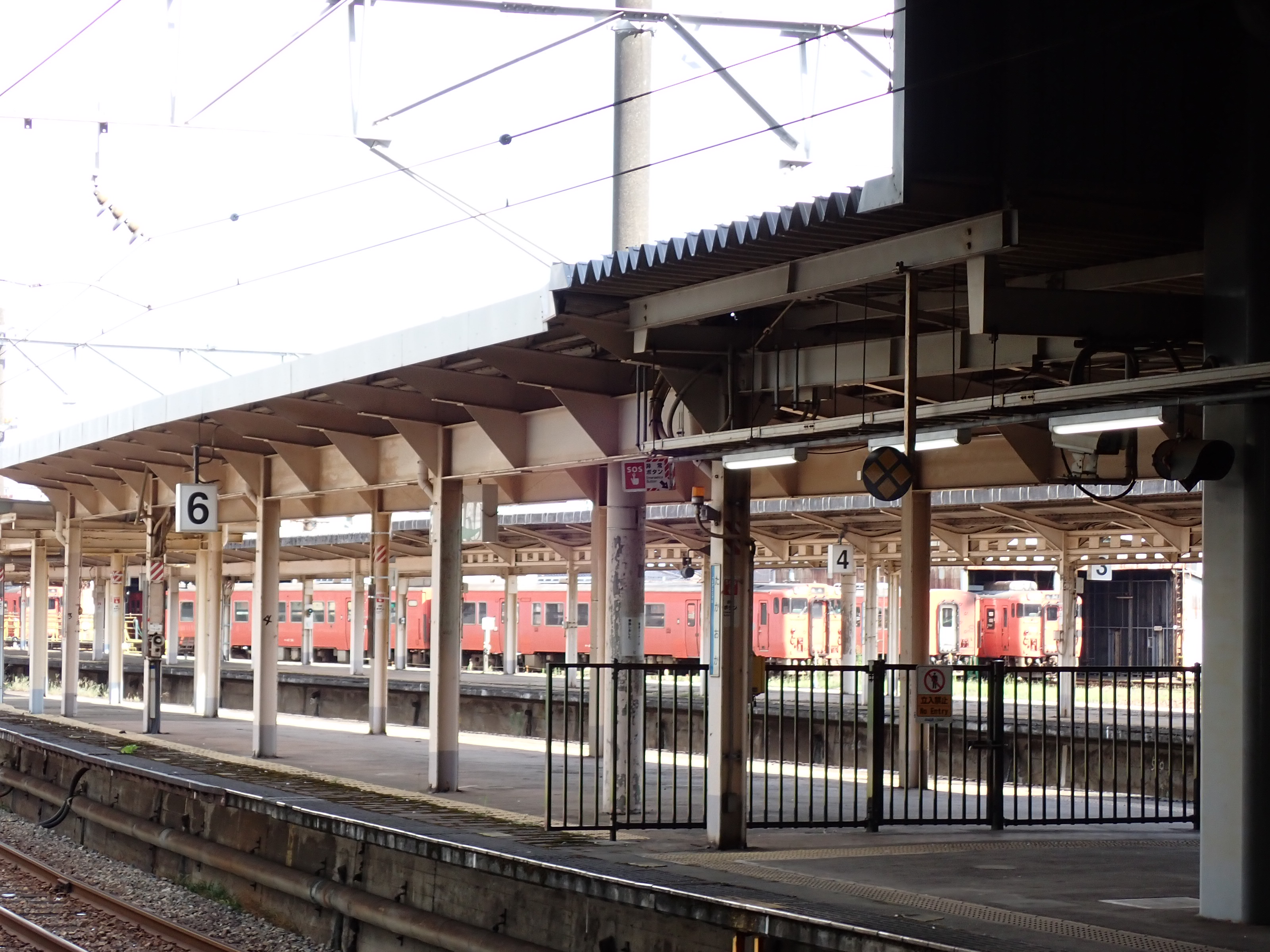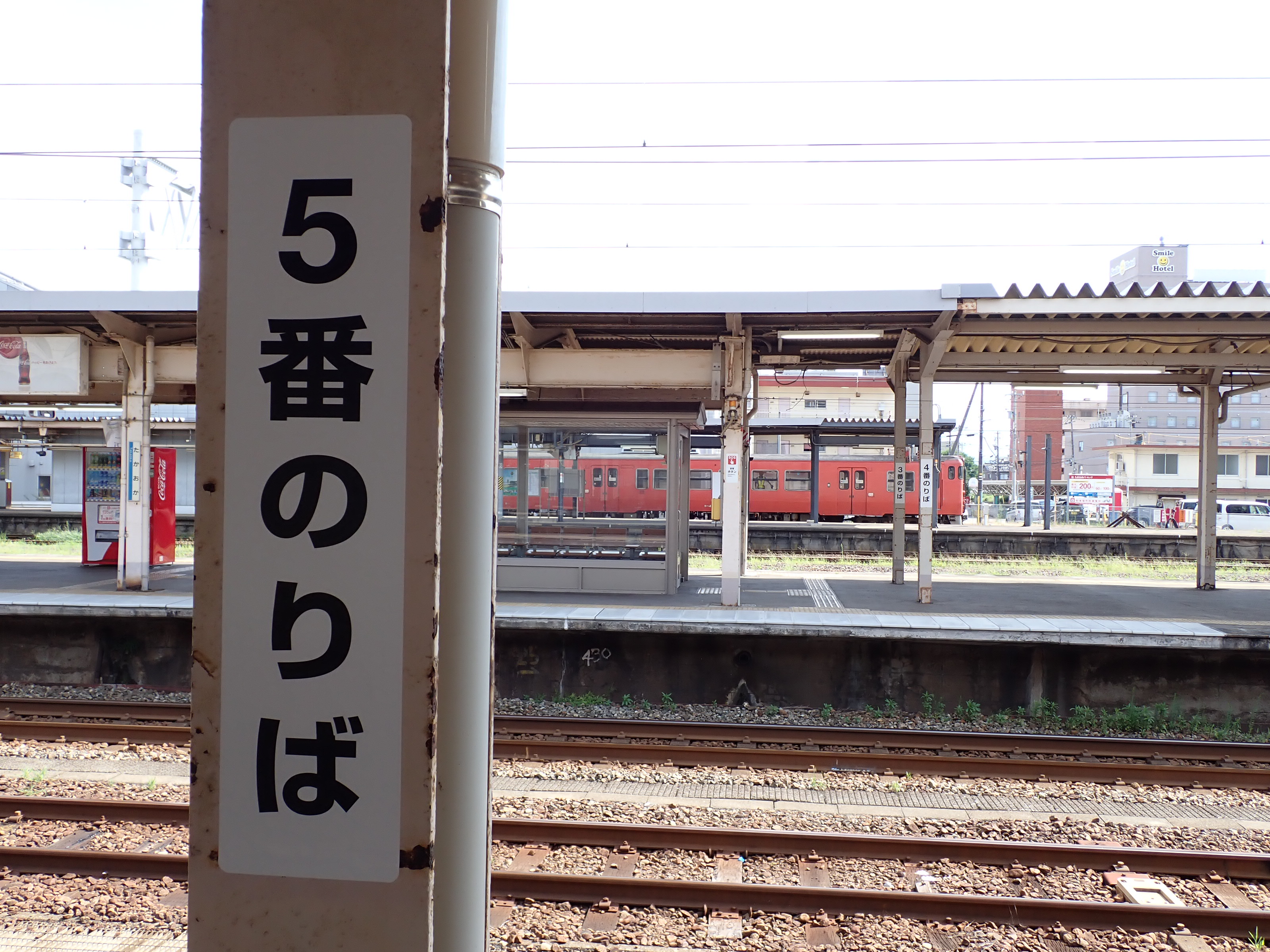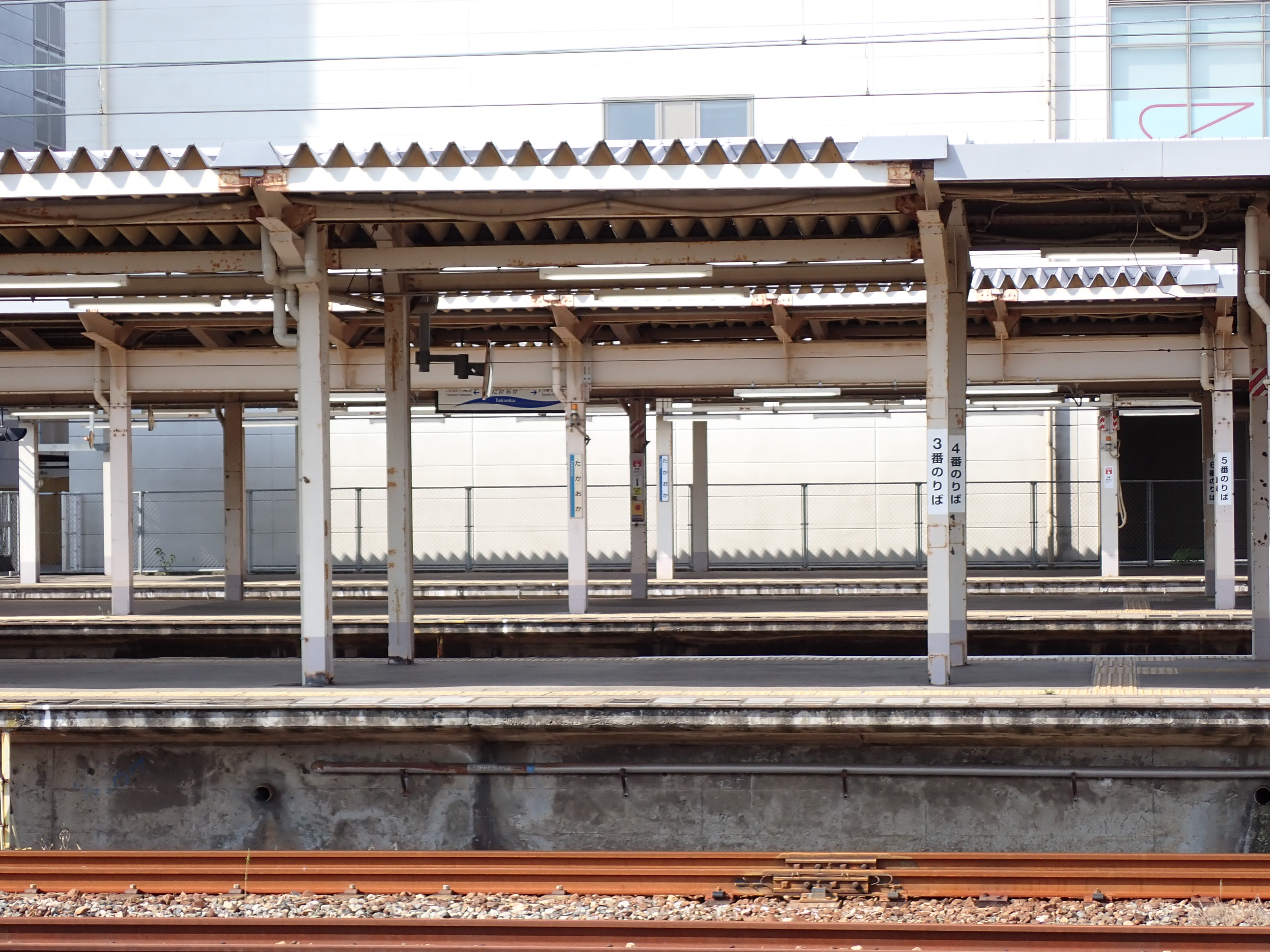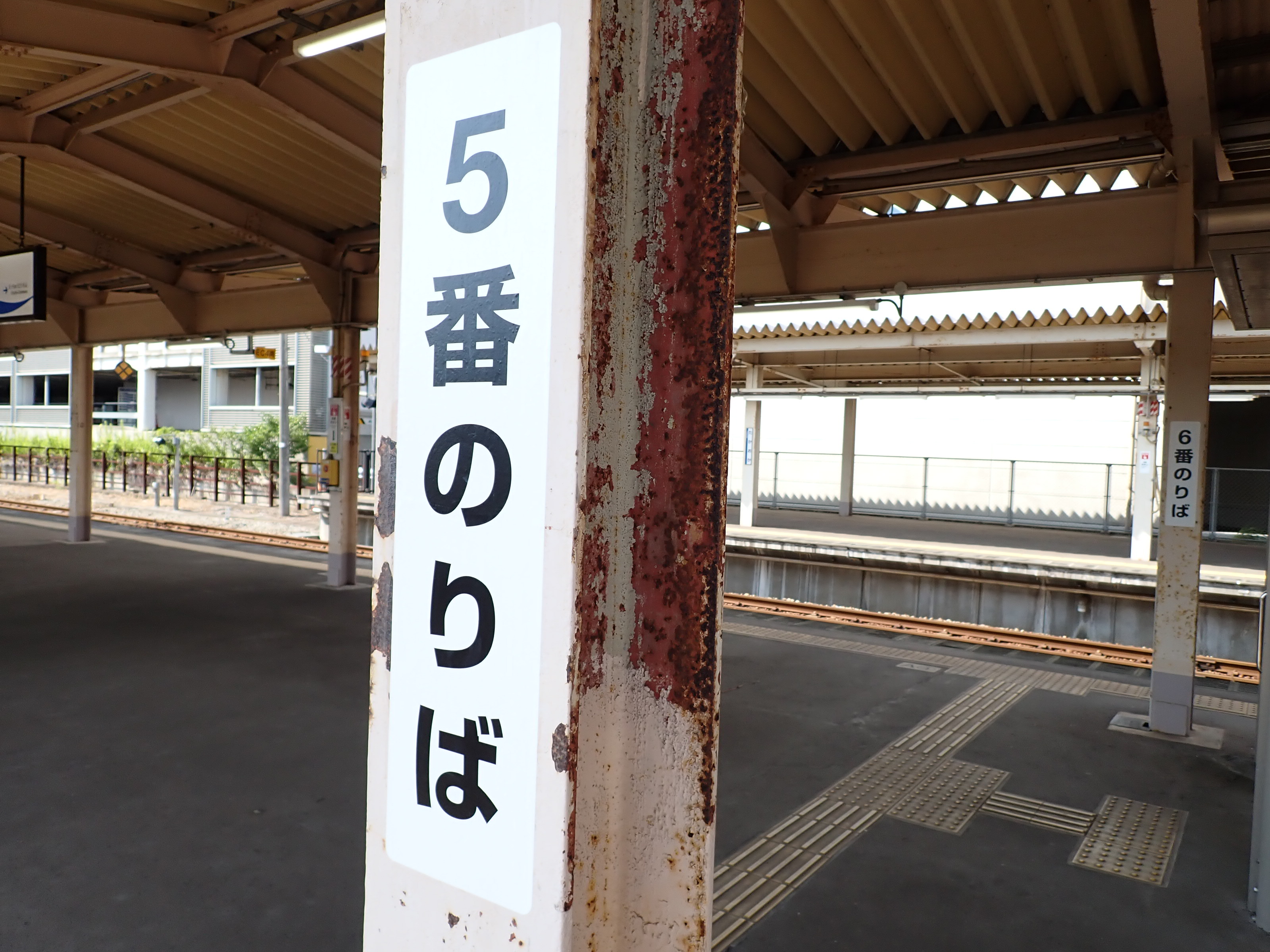 1・2番のりばから見た3〜6番のりばの縦型の番線標。