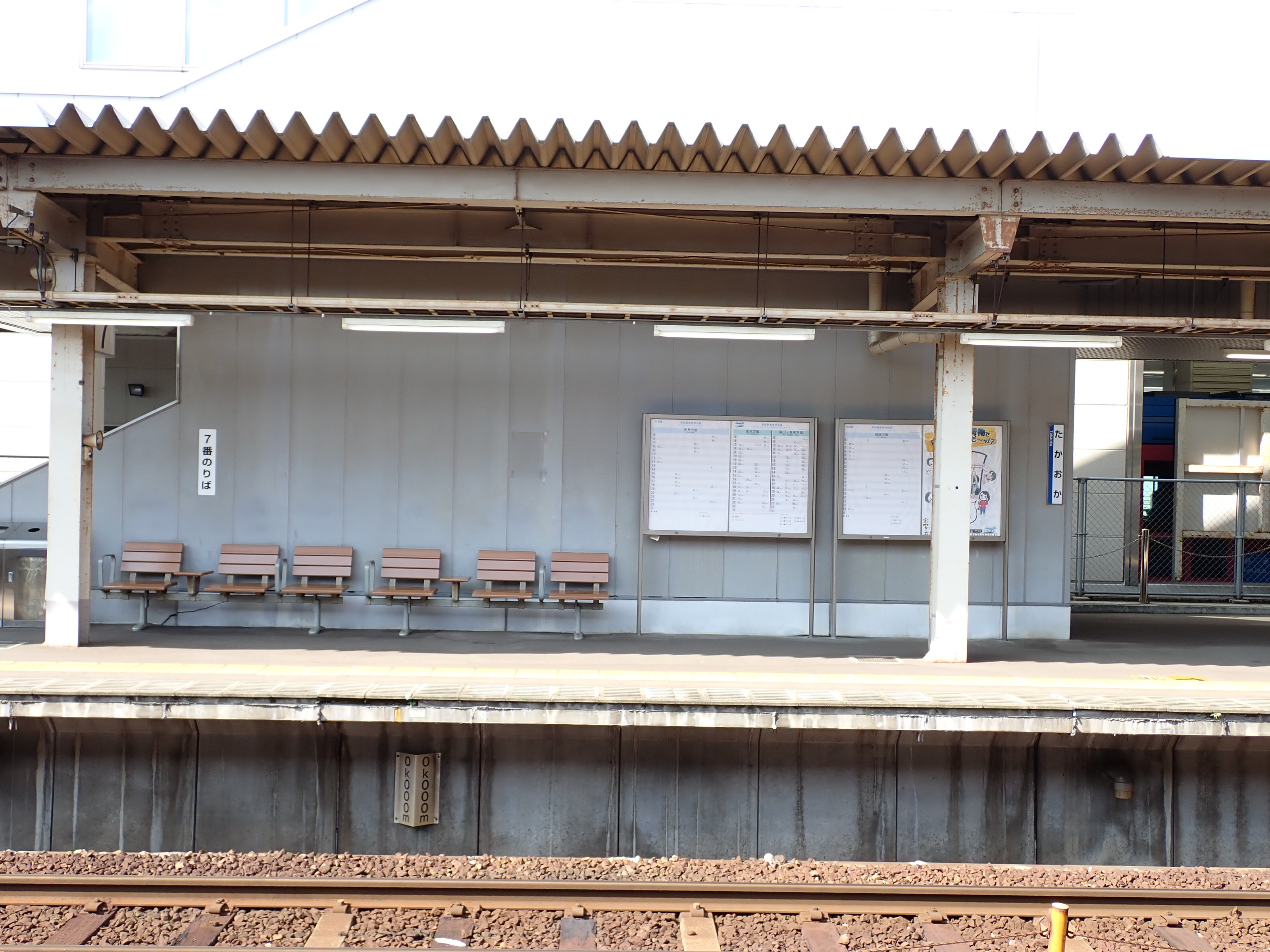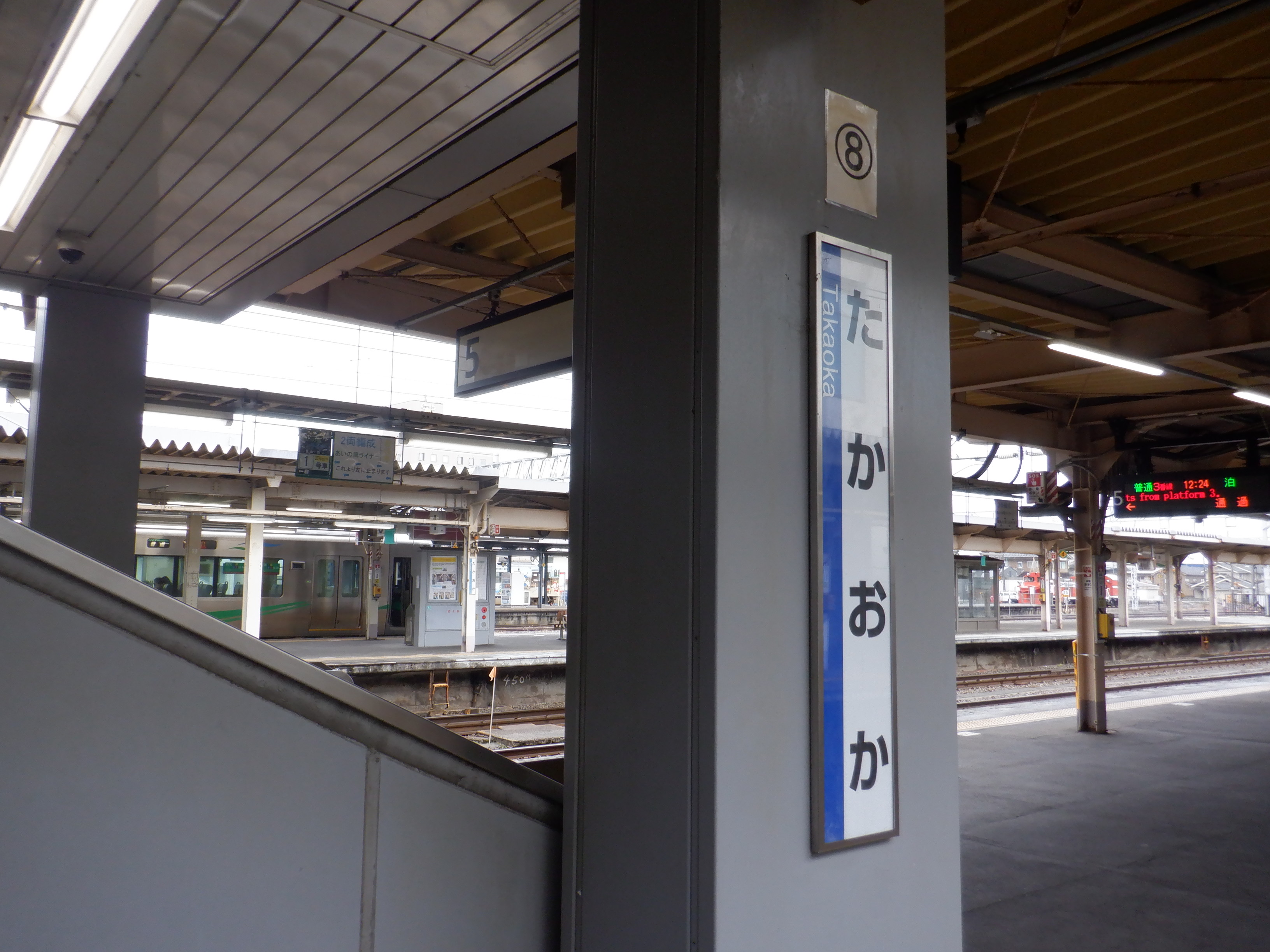 3・4番のりばから見た5番のりばの高岡やぶなみ駅側階段付近に貼られた番線標。