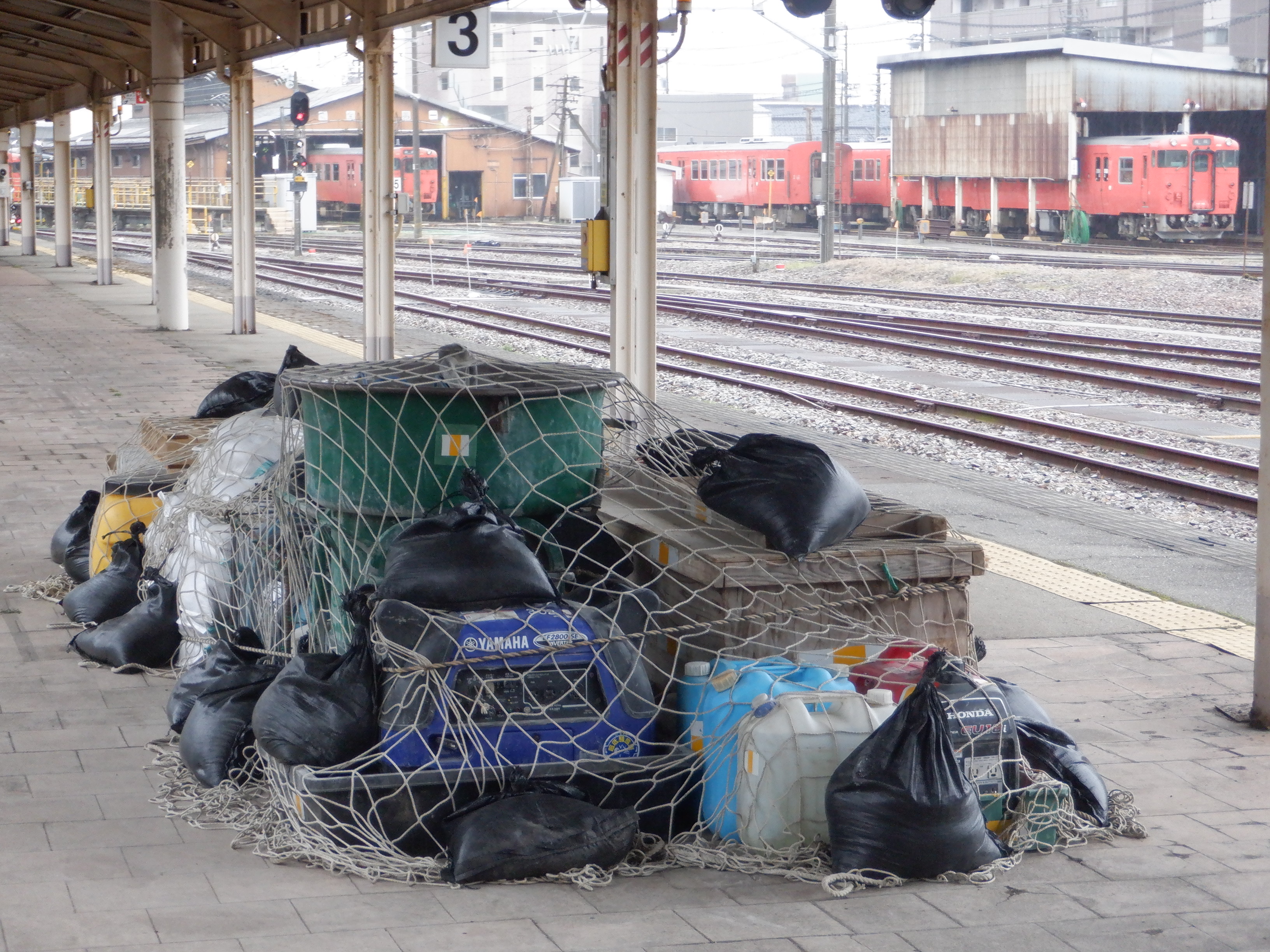 3・4番のりばの柵より高岡やぶなみ駅側。こちらにも資材が置かれています。