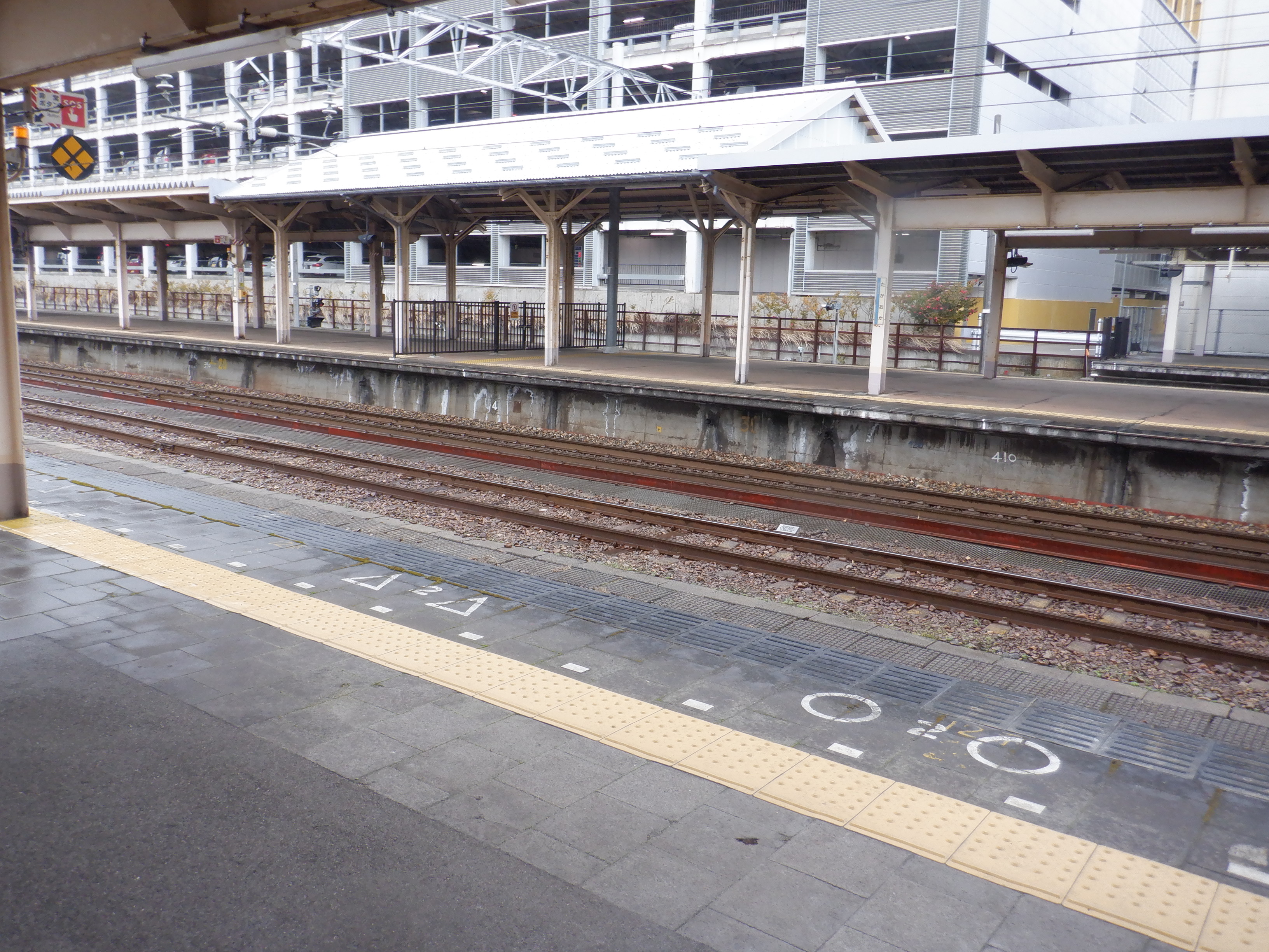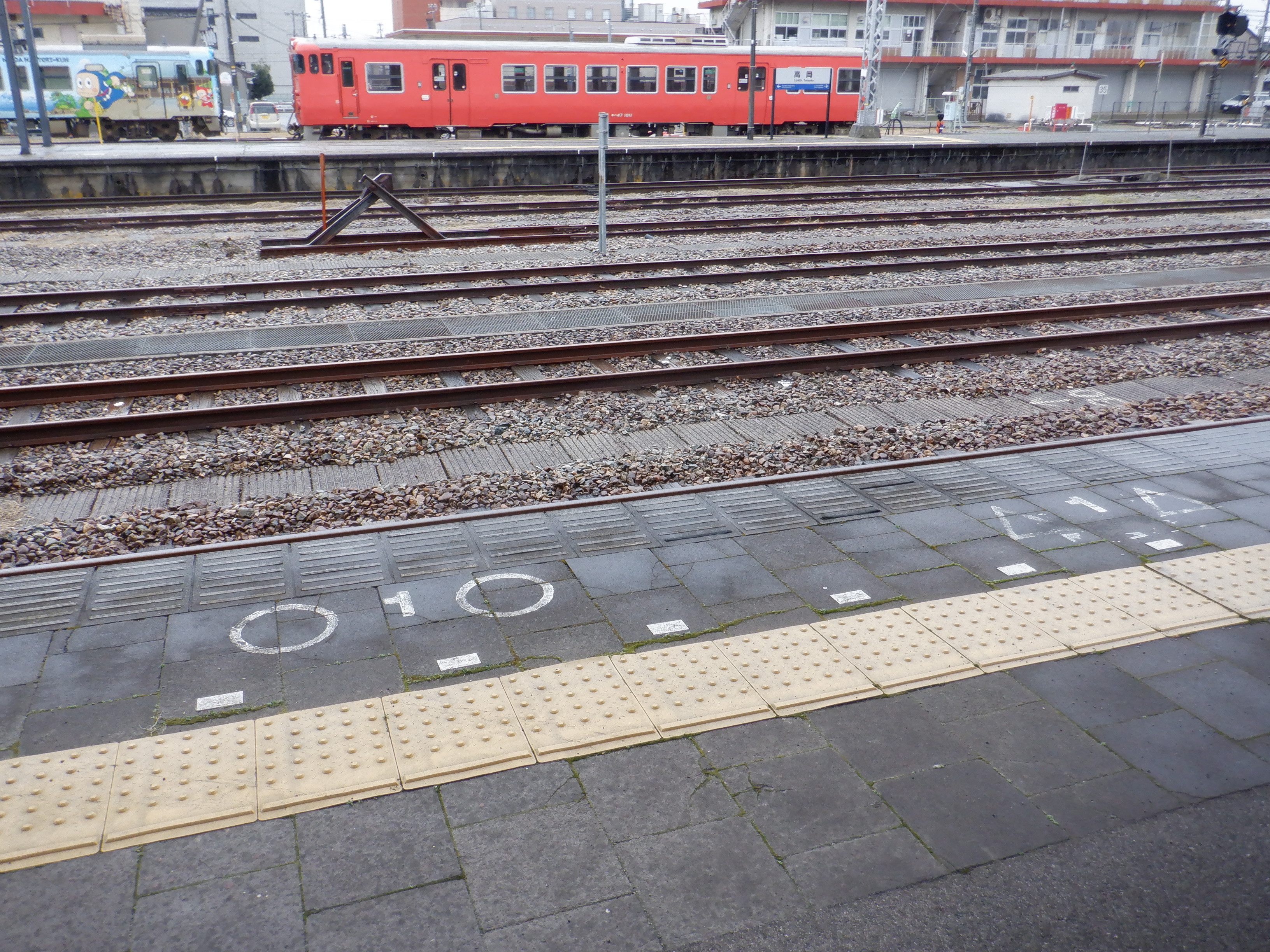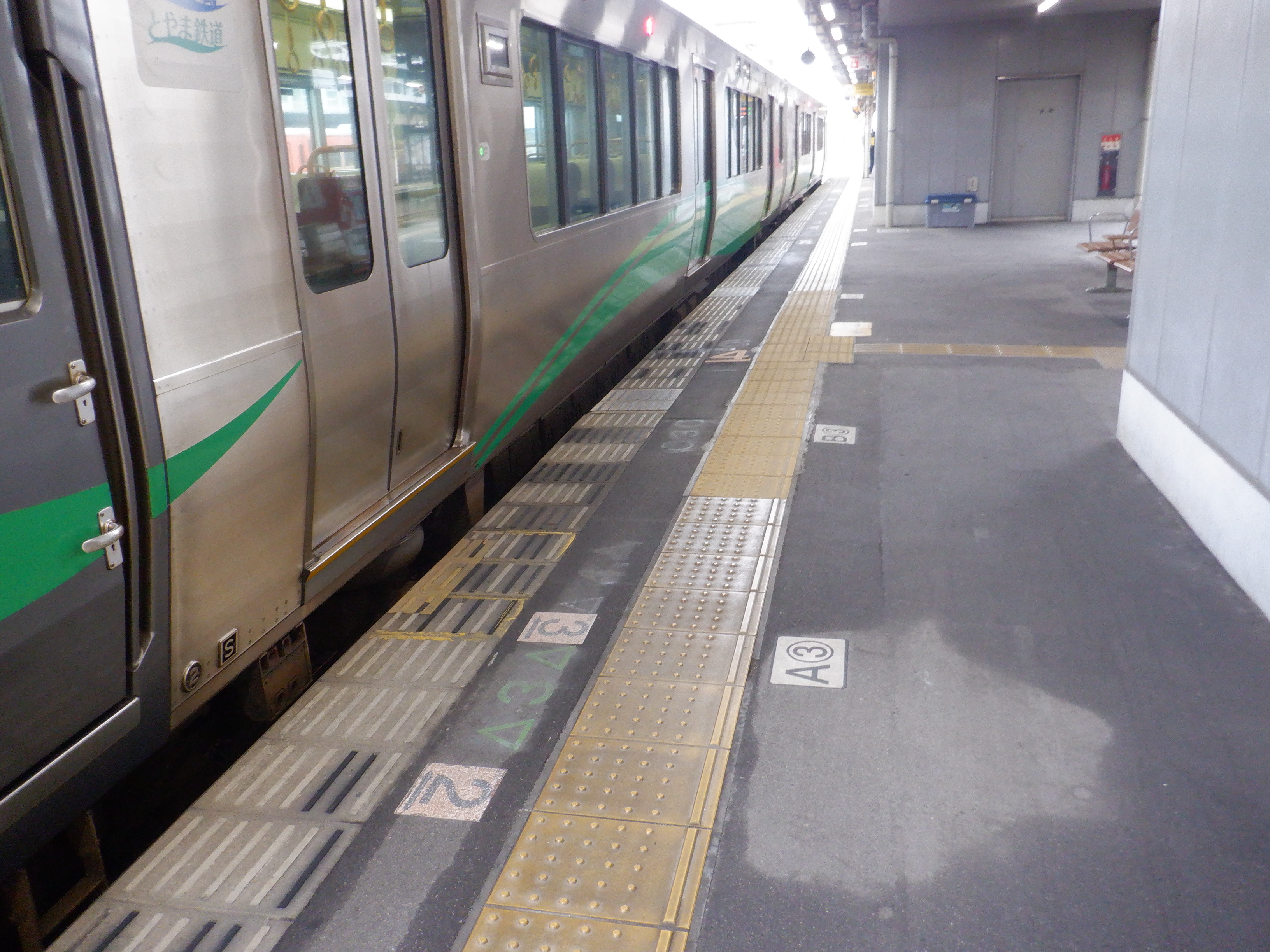 3・4番のりばの越中大門駅側。ホーム面に何か印がありますが、特段このあと何もなかったようです。