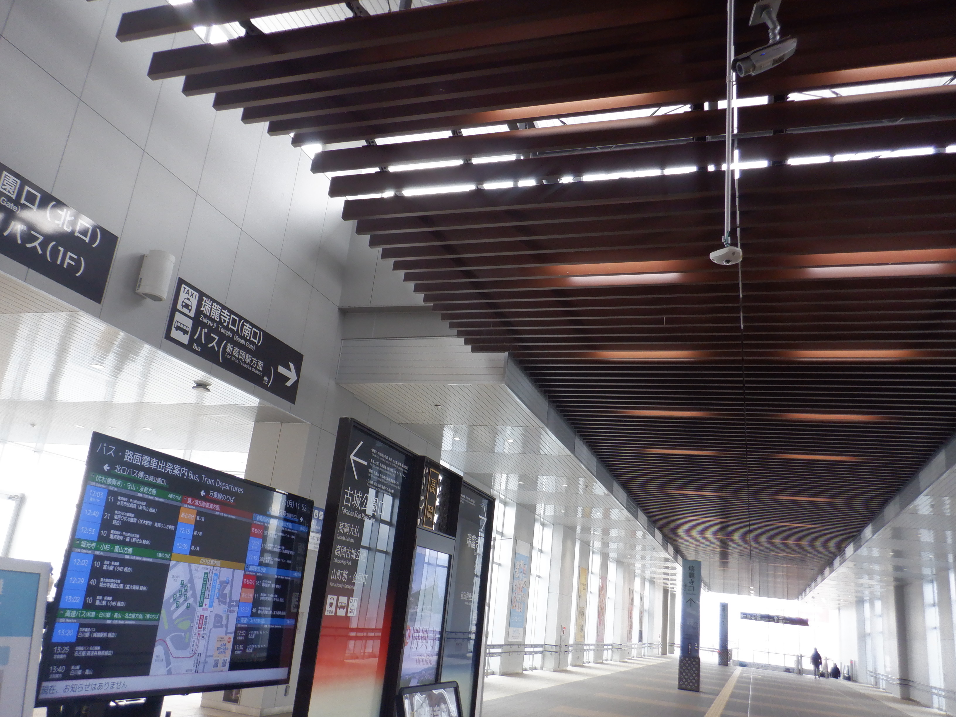 改札口を出たところのバスの案内と自由通路の天井の様子。