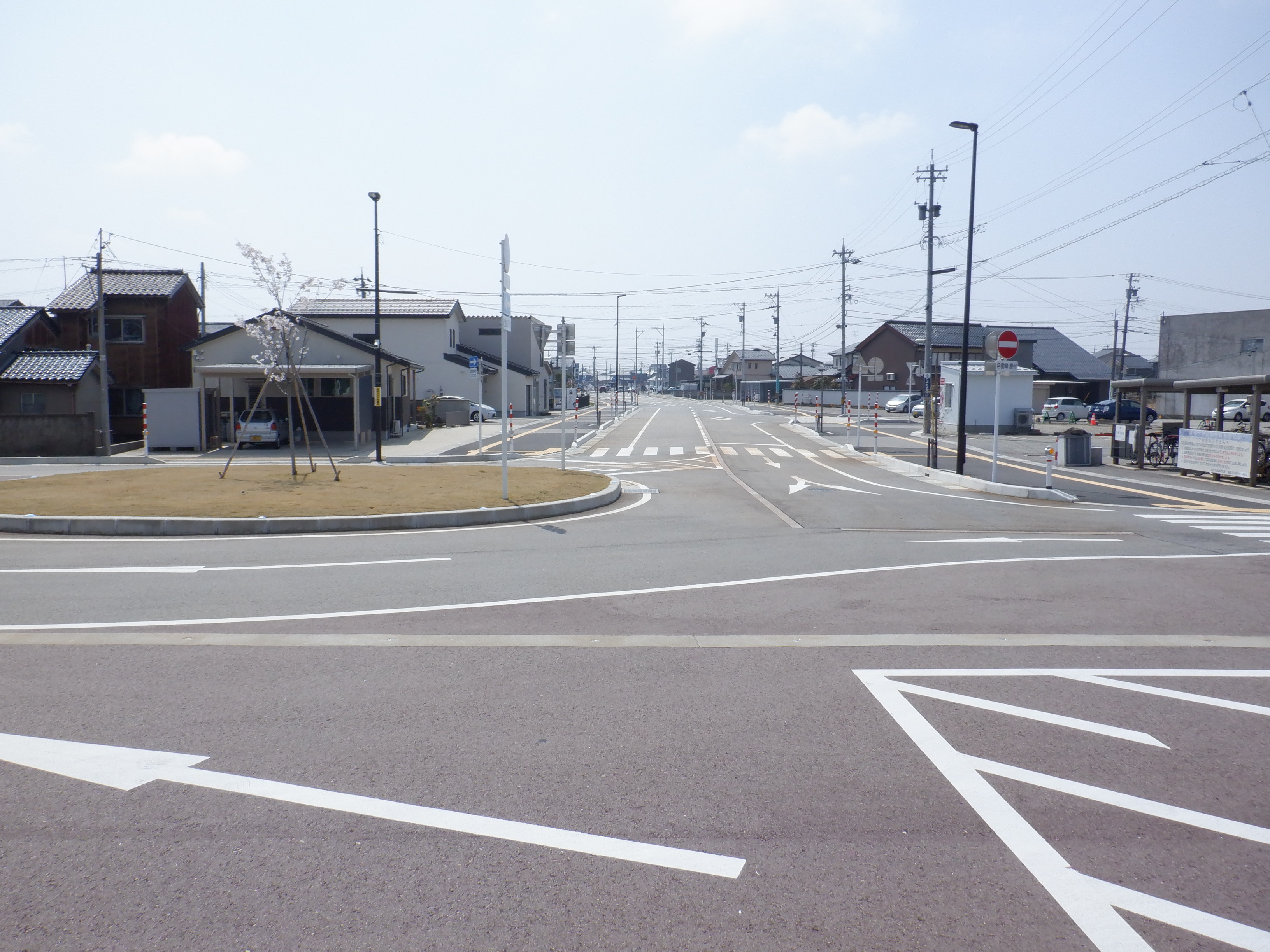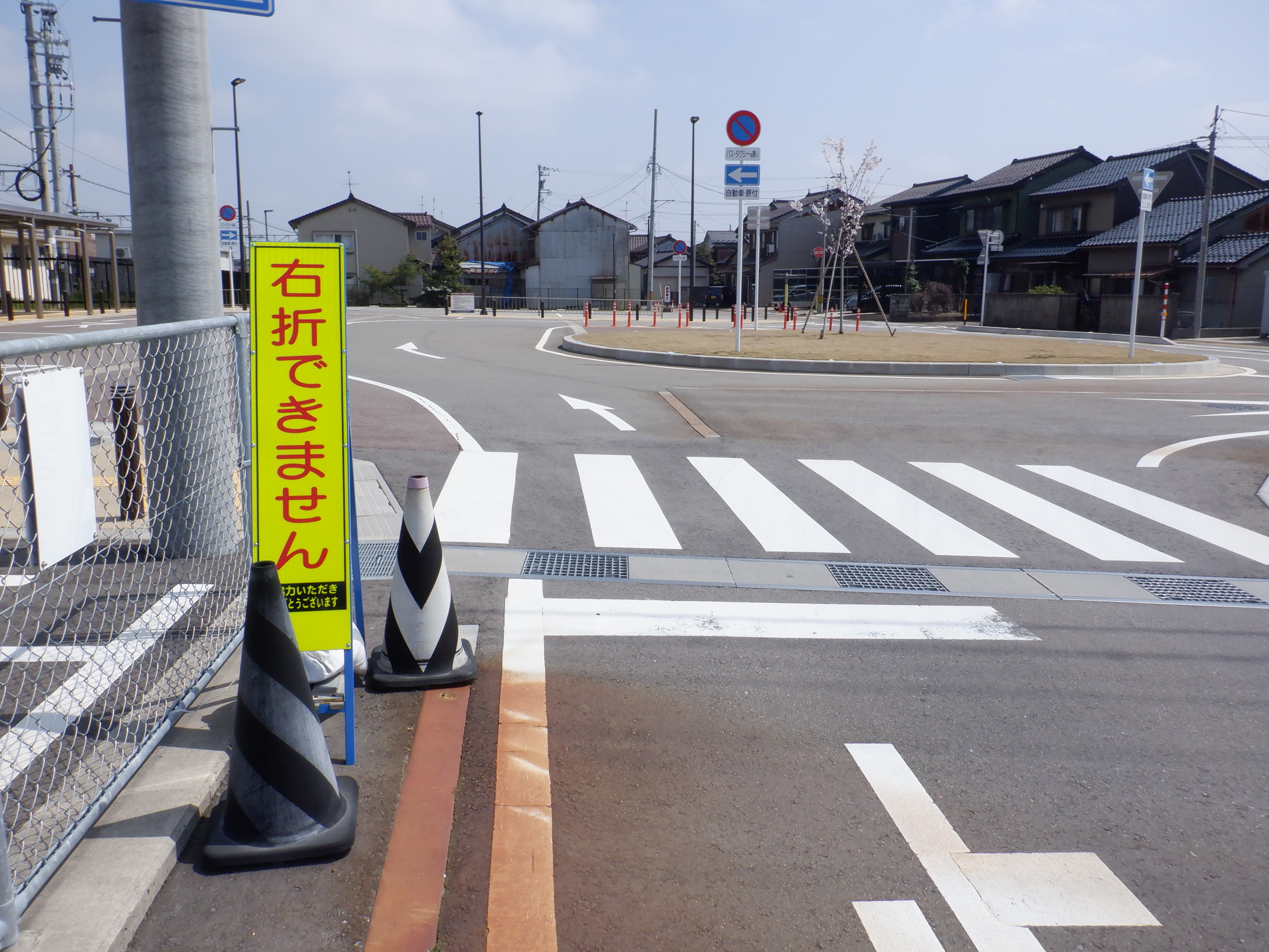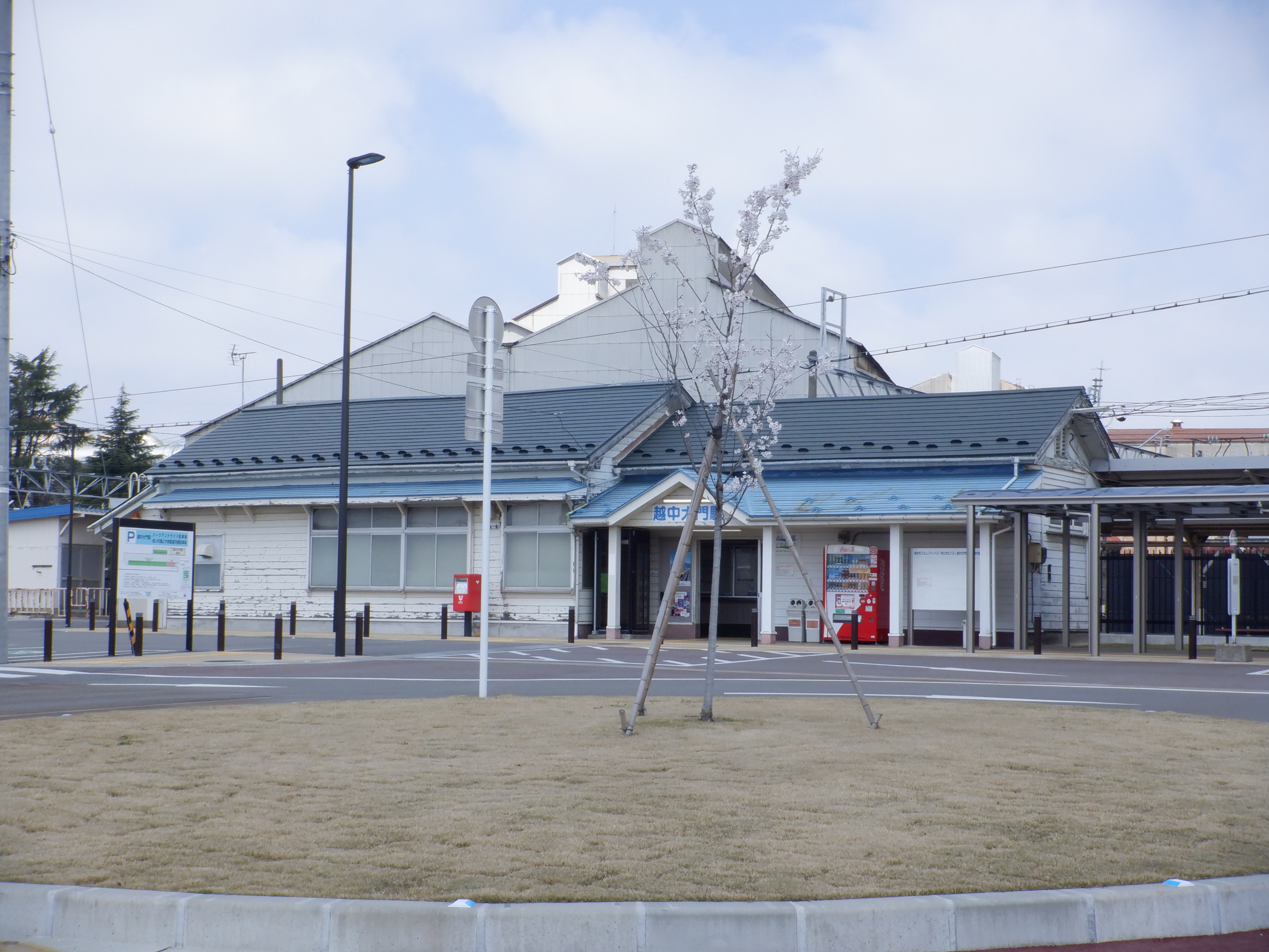 駅舎の様子。駅前の新しいロータリーのまん中に桜の花が咲いています。