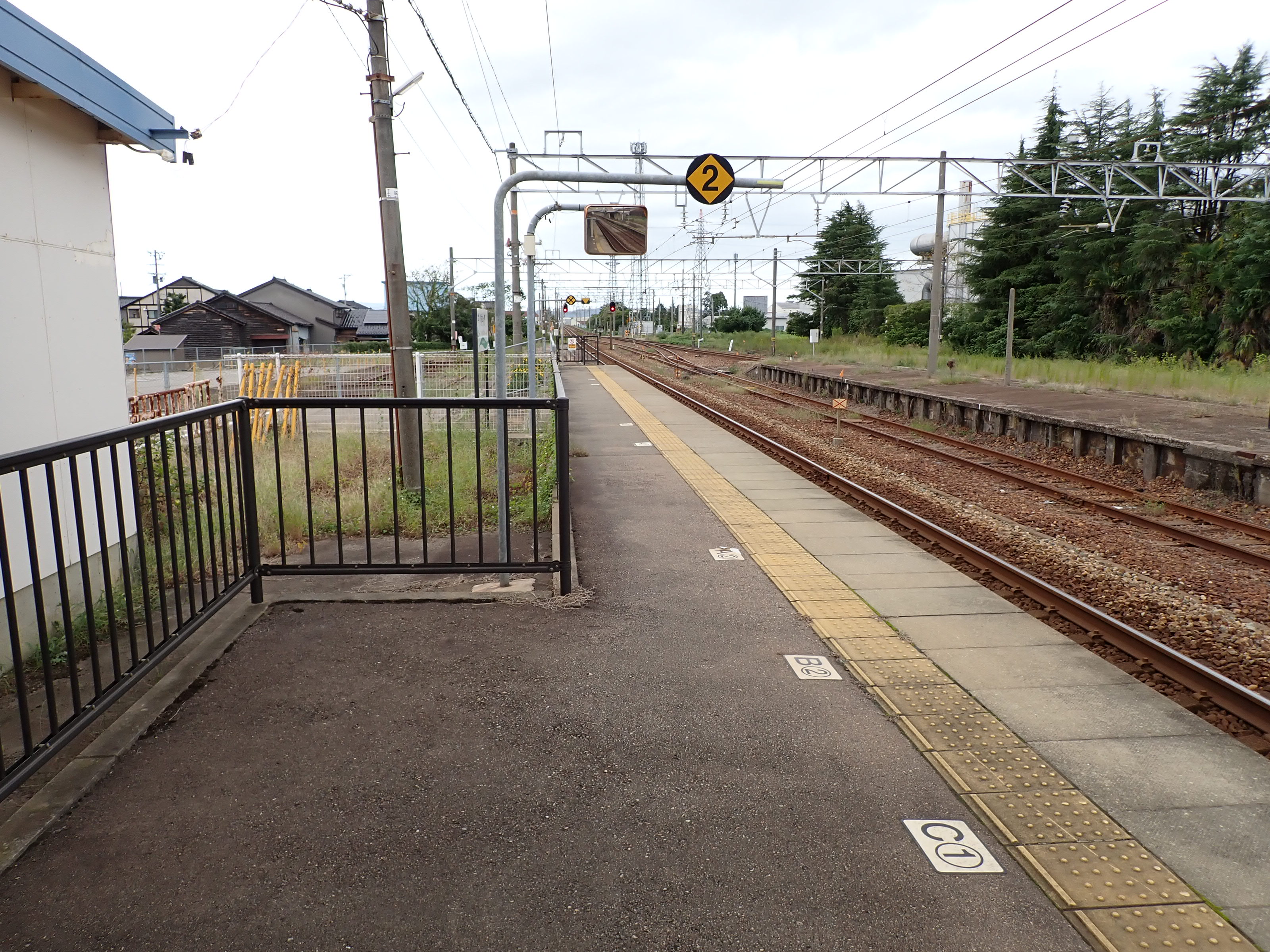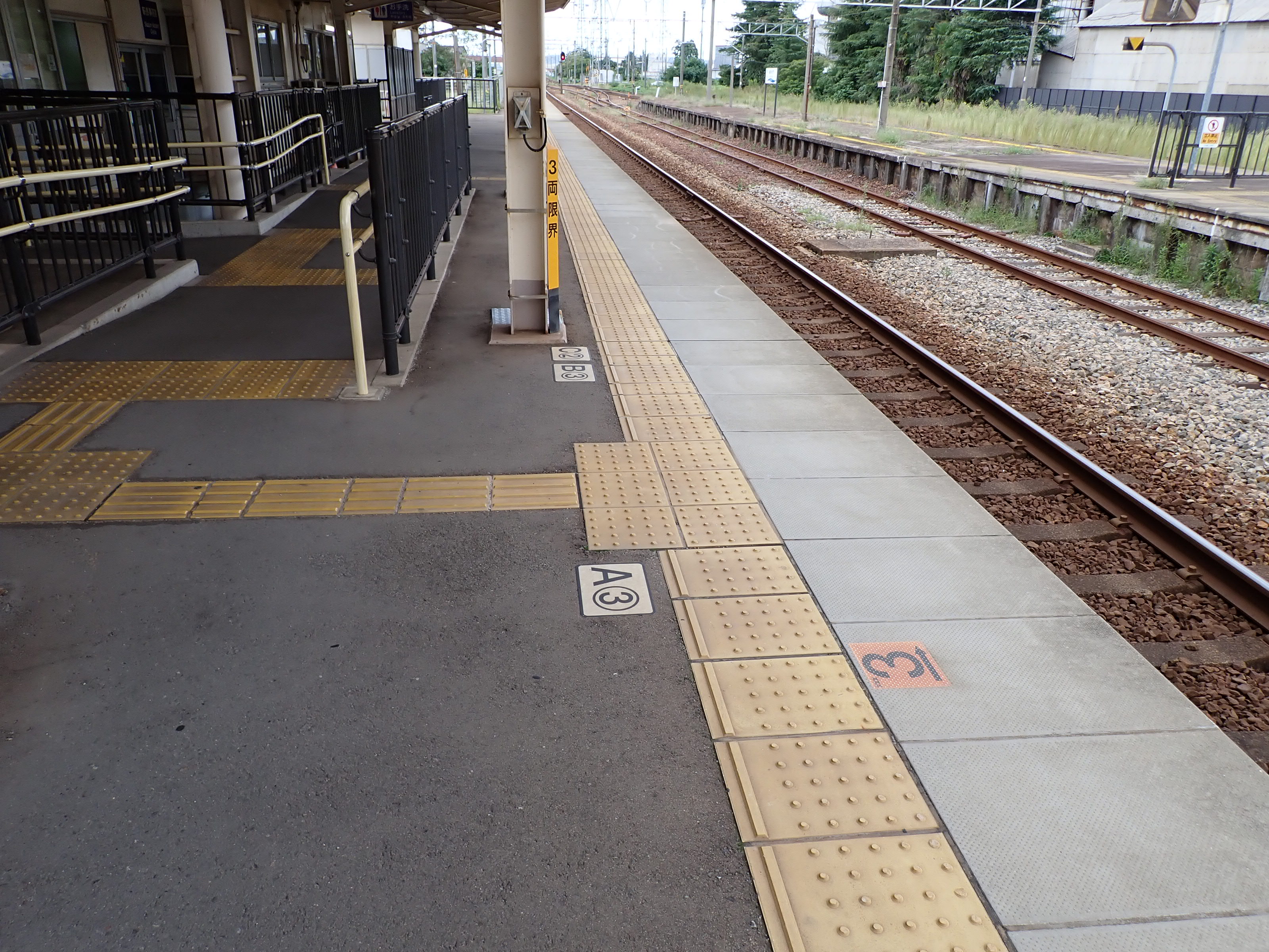 3番のりばの高岡駅側。2両編成の最後尾の方が4両編成の最後尾よりも高岡駅側にあります。また、2両と4両でドアの位置が異なるためCの乗車位置が存在します。
