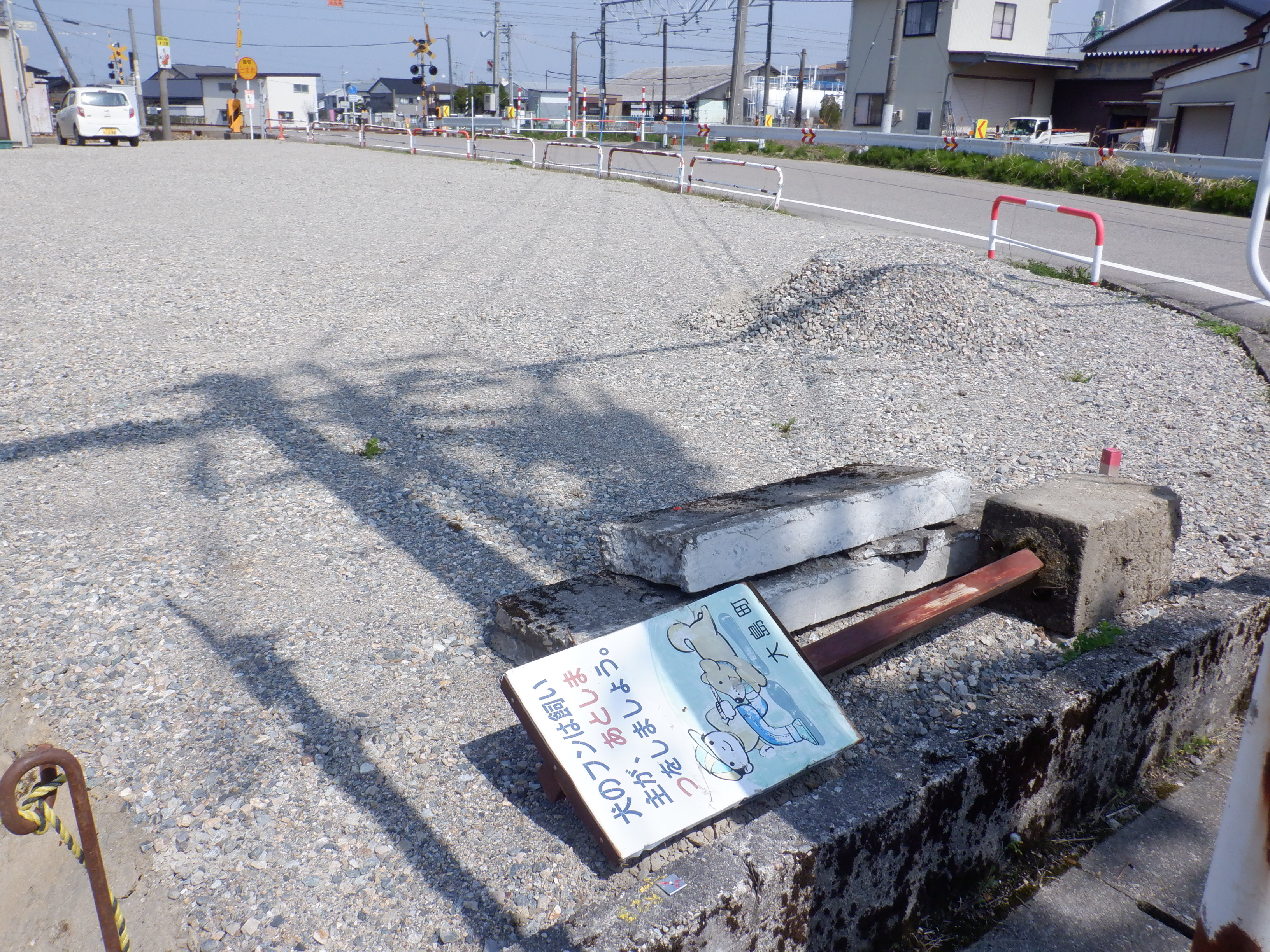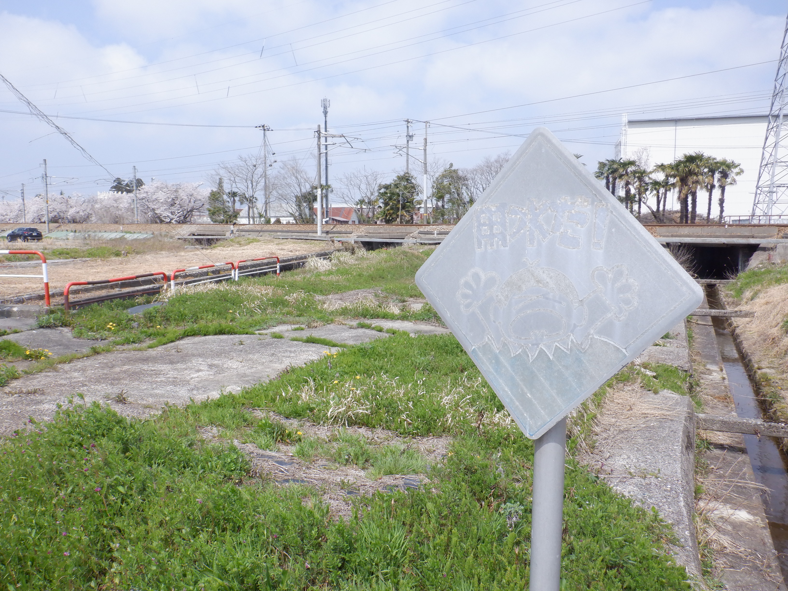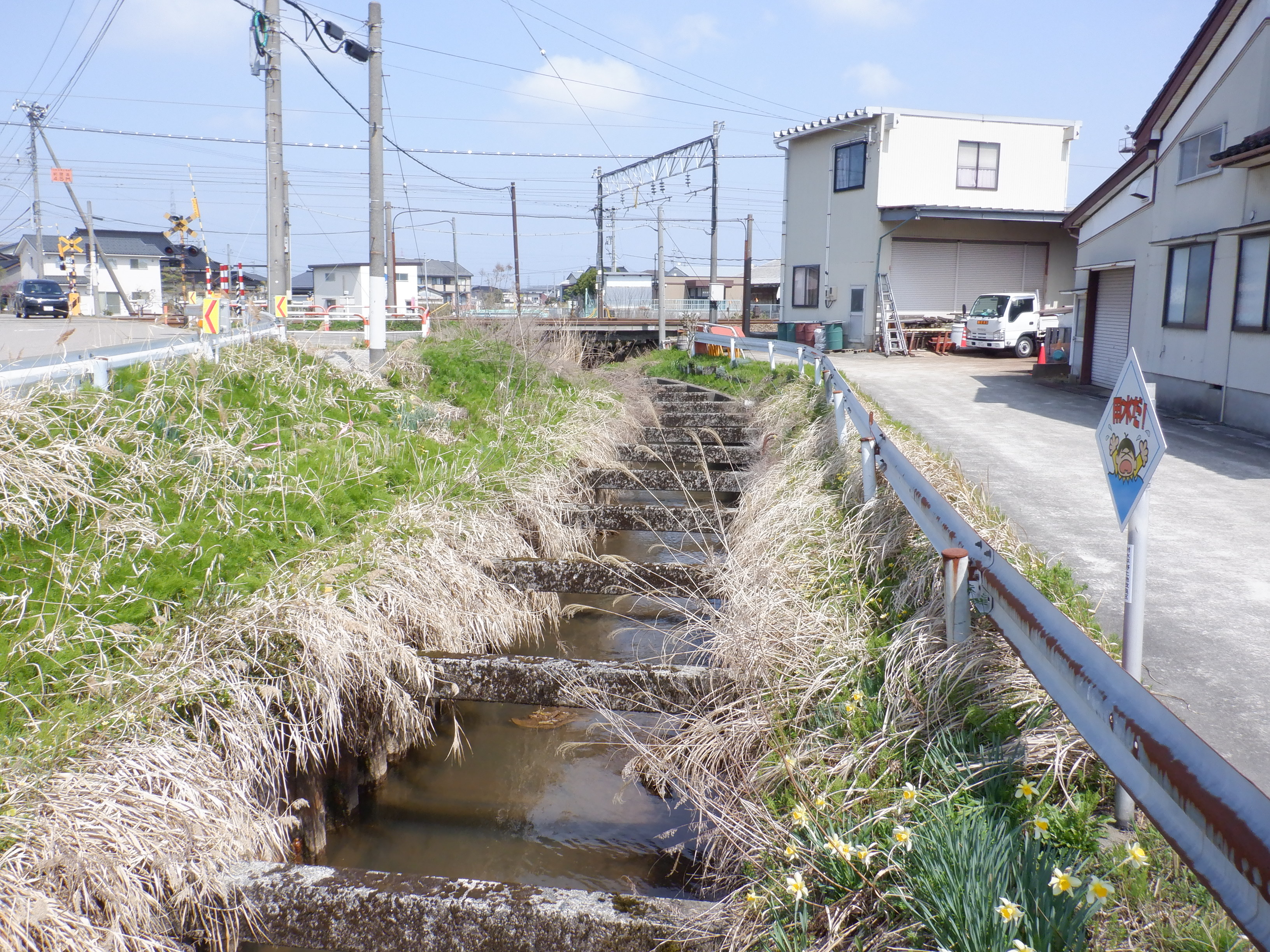 踏切を渡ってしばらく進んだところにも「用水だ!」の看板があります。