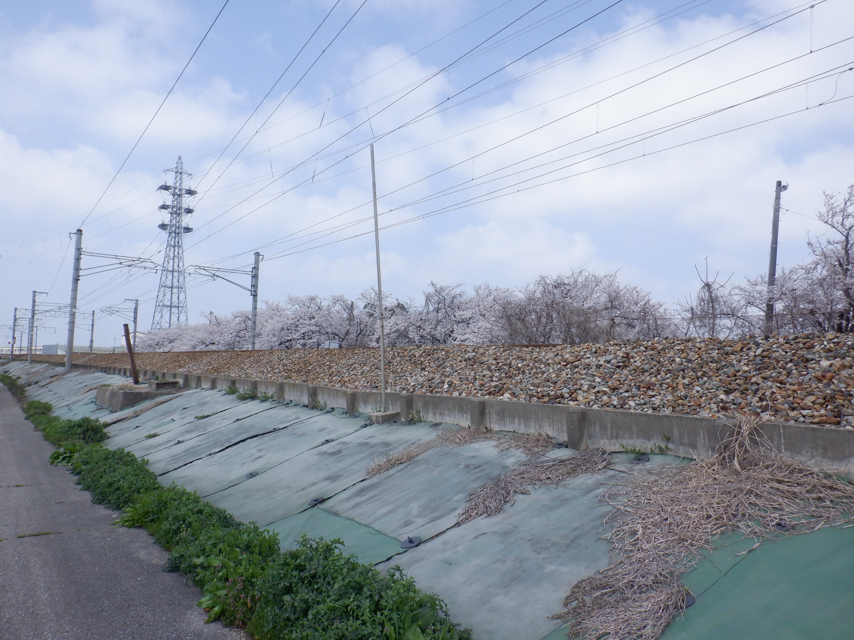 桜の木を向こう側に見ながら線路沿いを進みます。