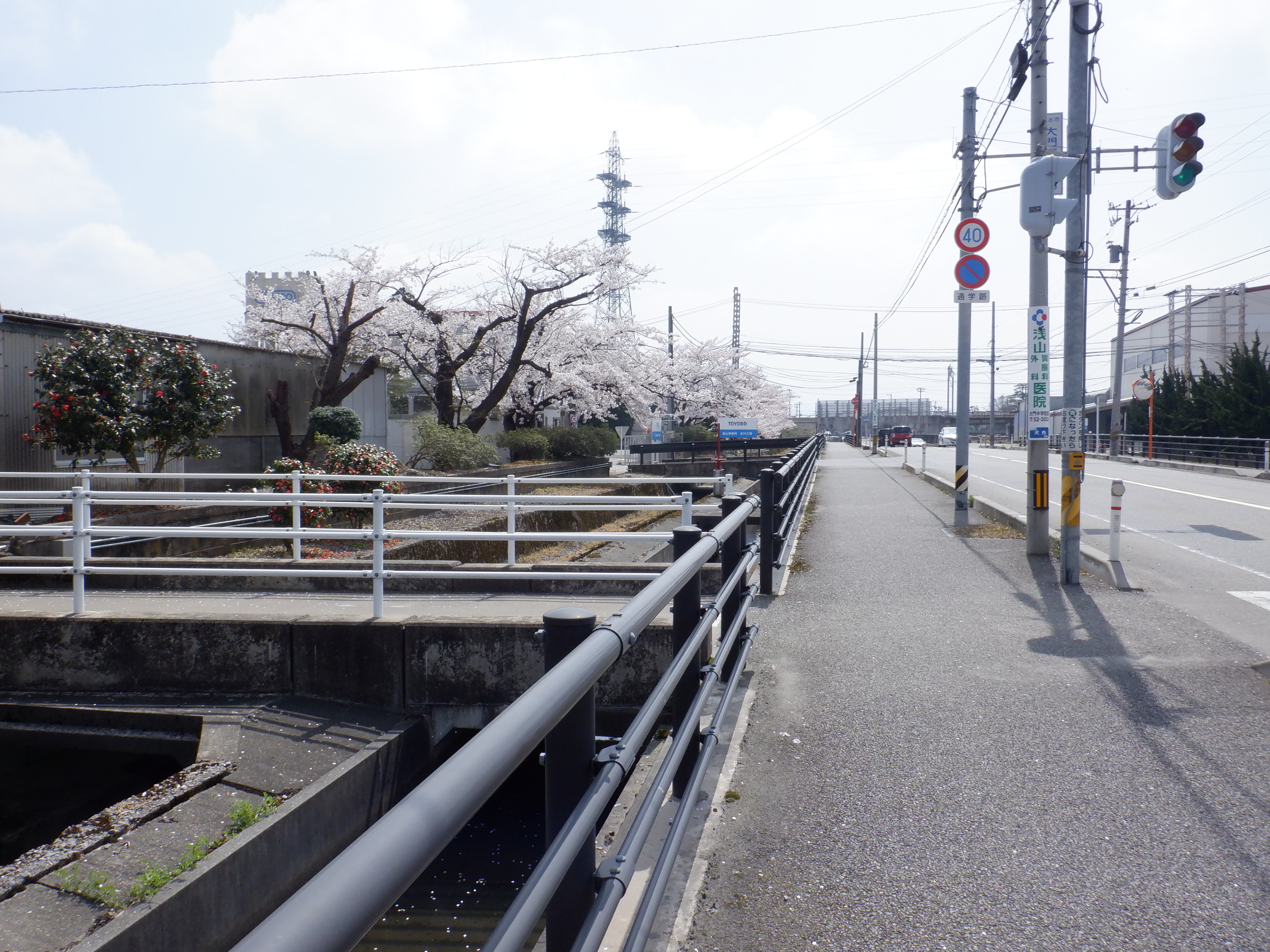 線路の下をくぐり、東洋紡の工場のまわりの桜を見ながら歩きます。