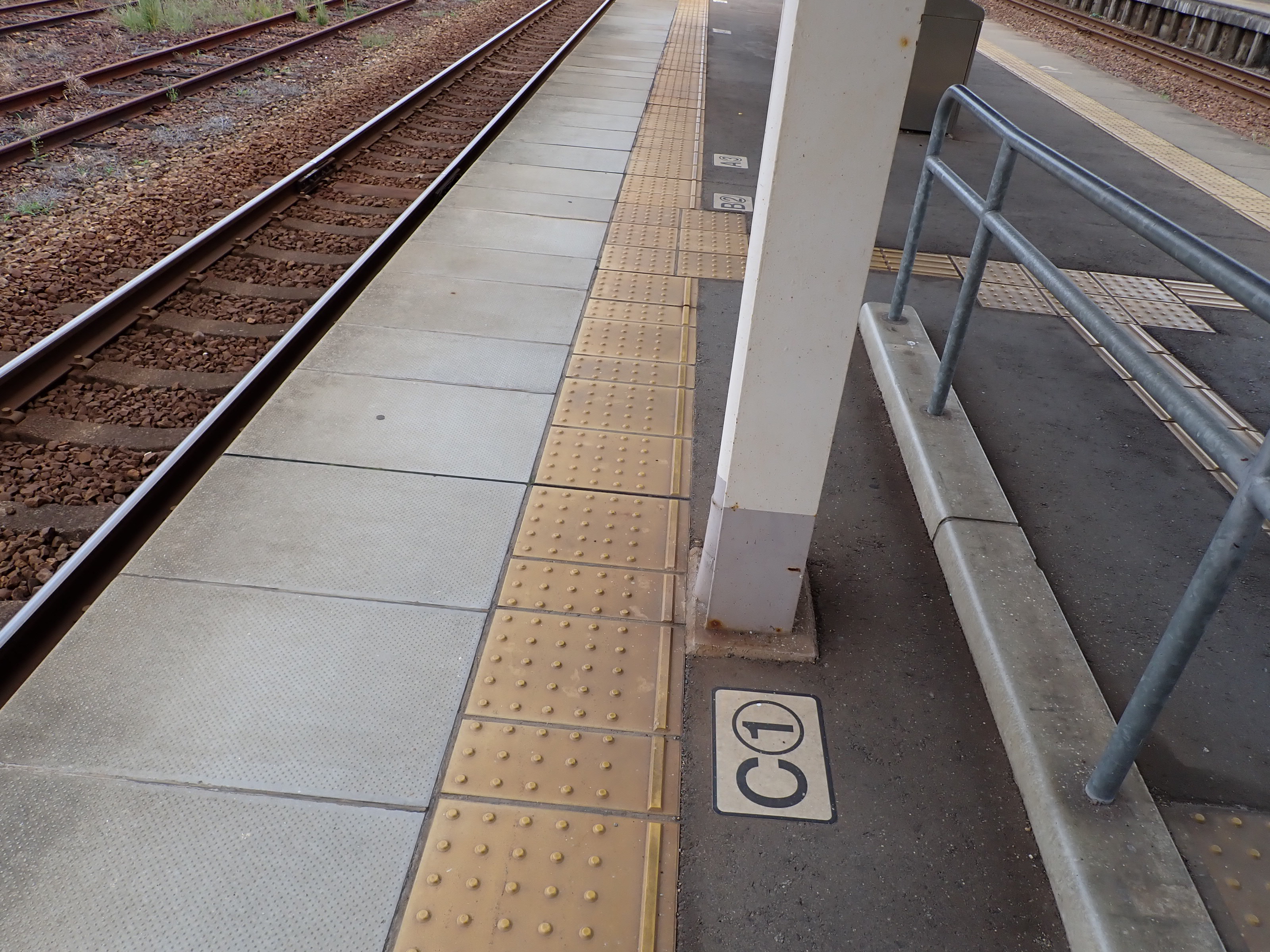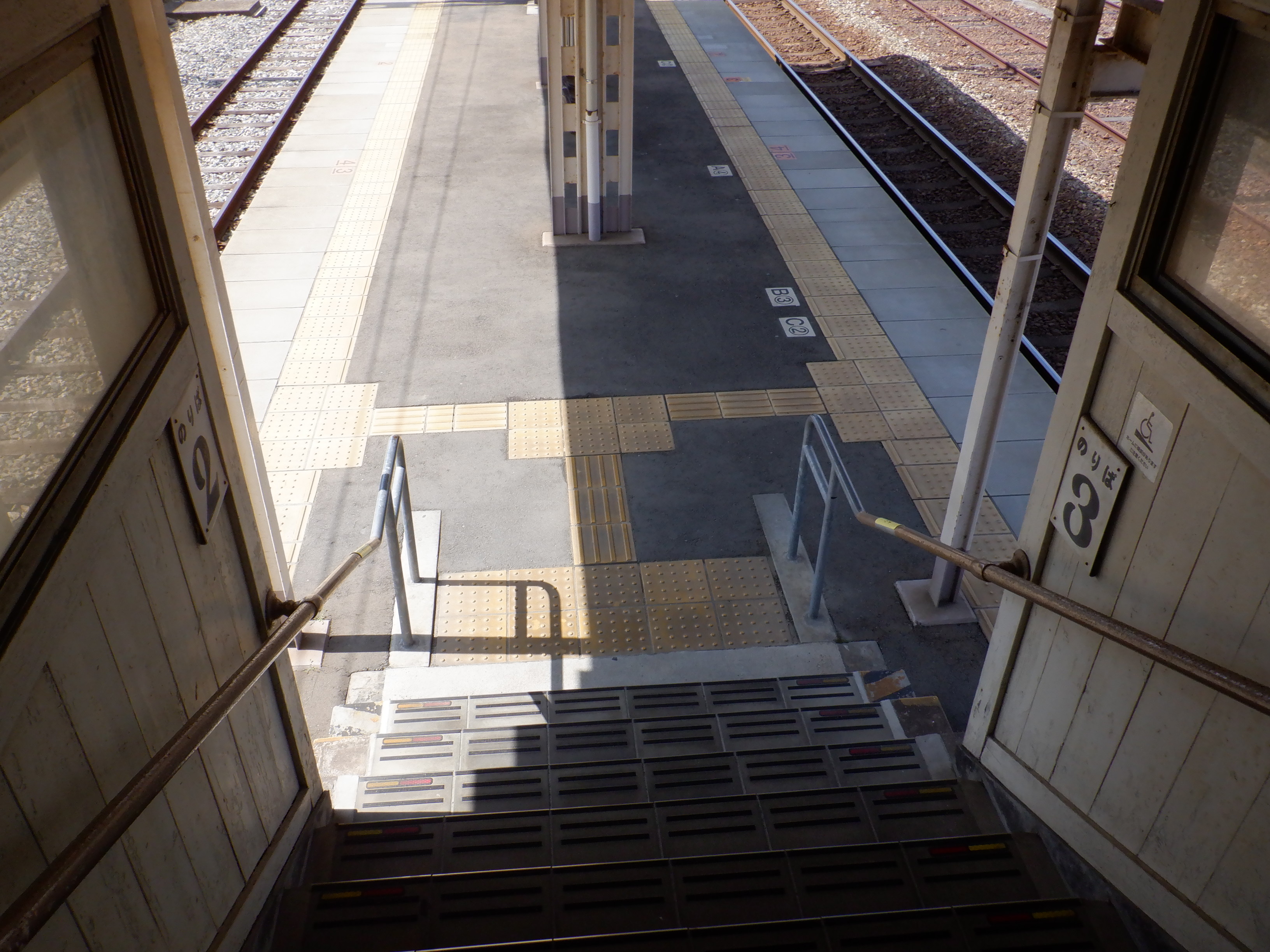 1番のりば2両編成の最前部。こちらもCの乗車位置案内があります。