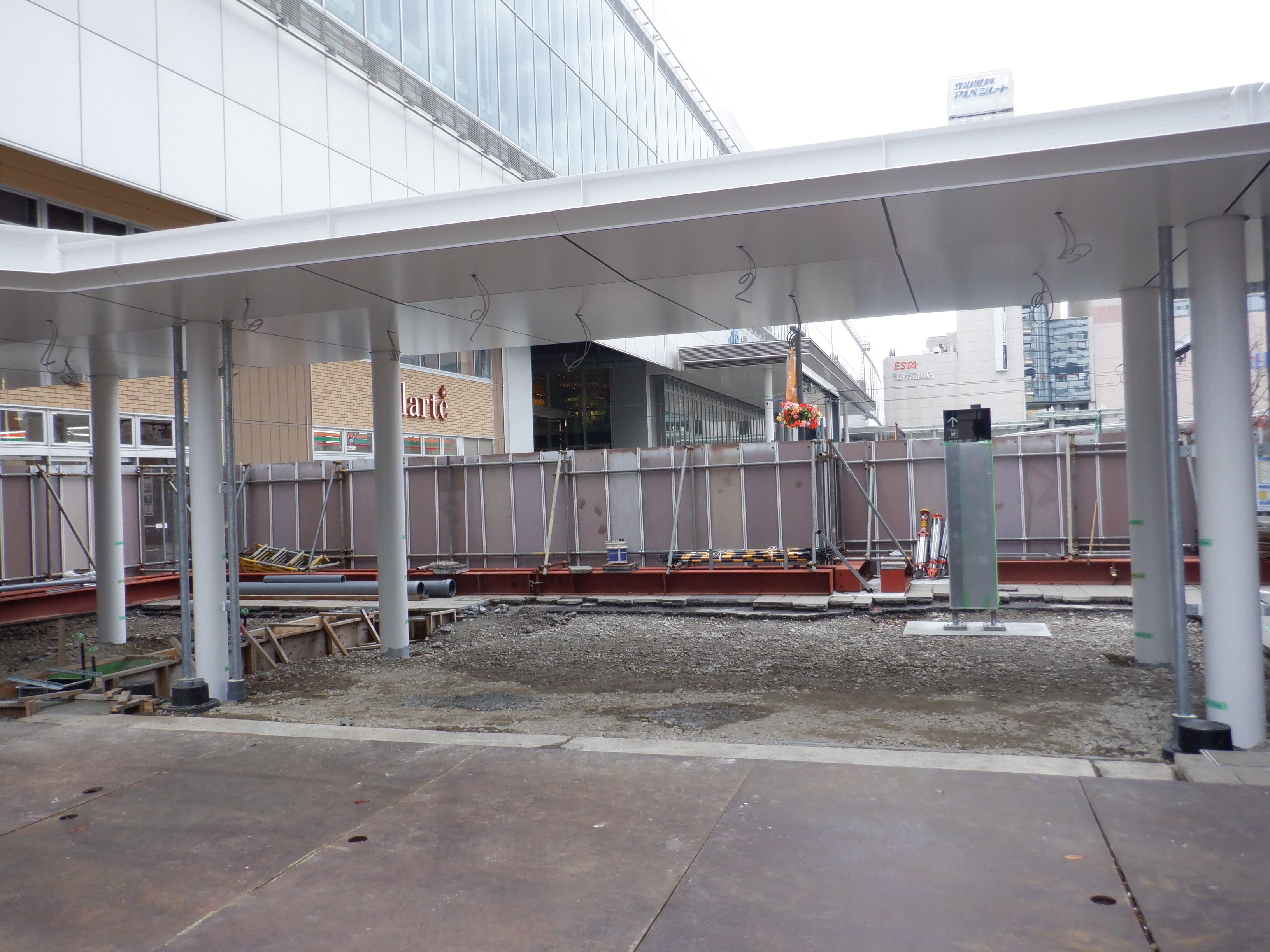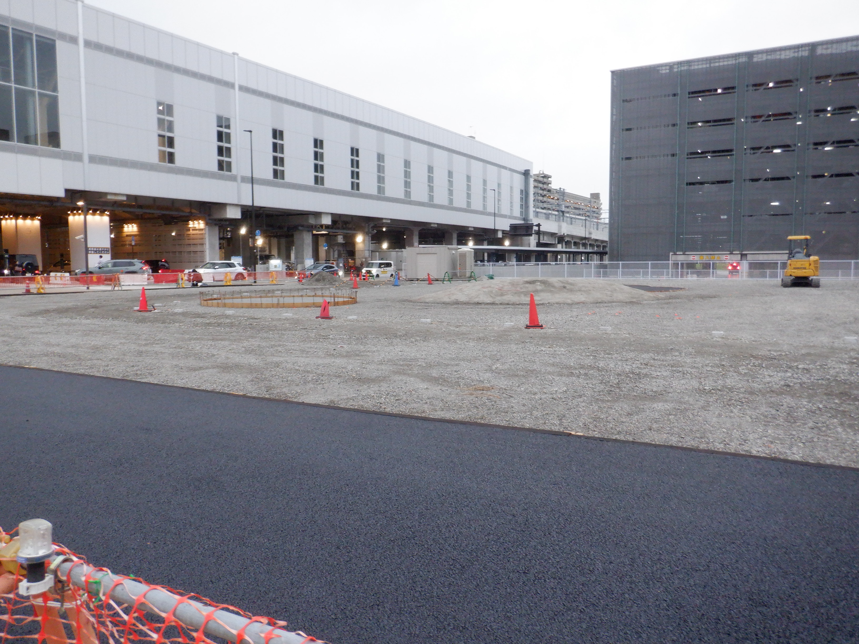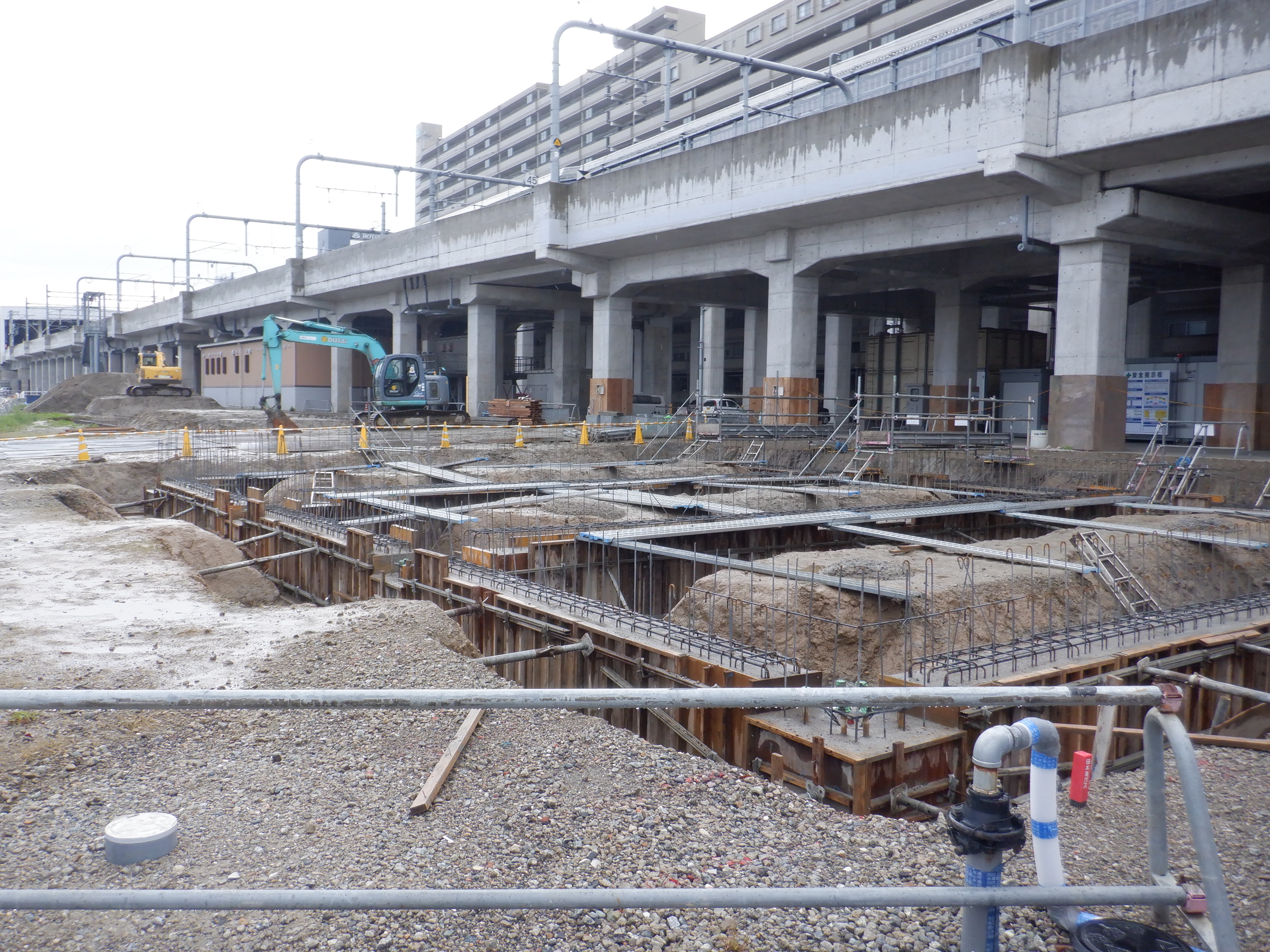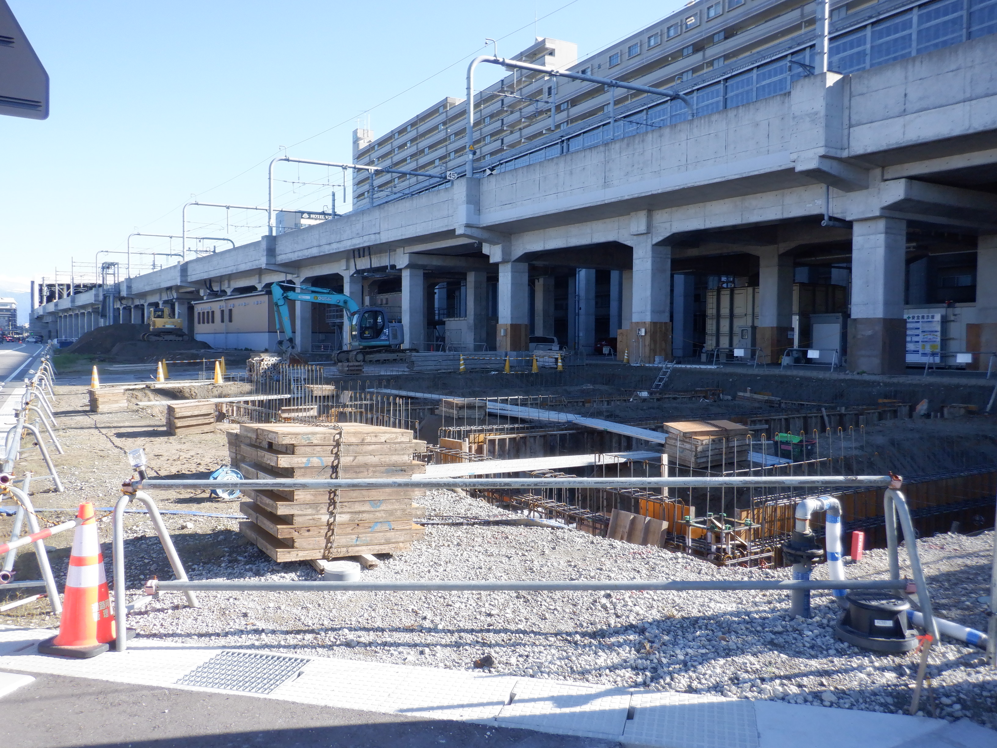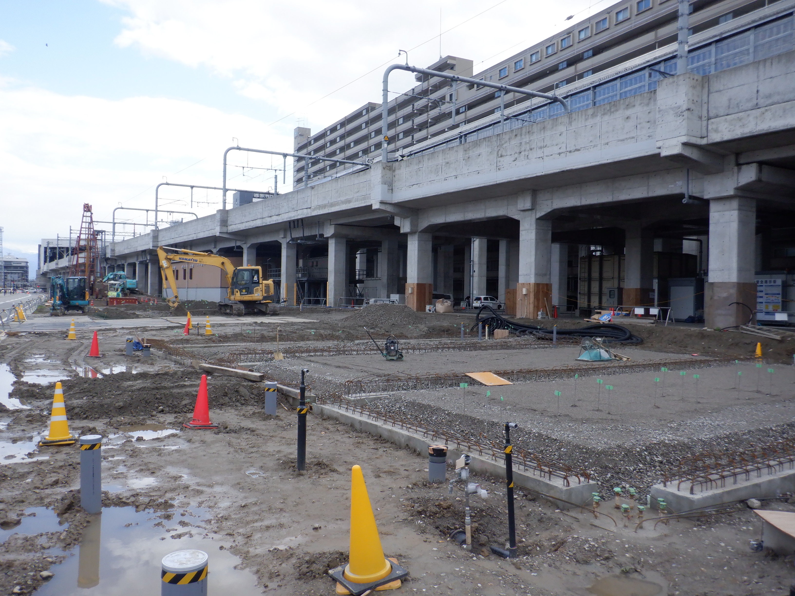 東口とマルートとの間のシェルター建設中のところは支柱の基礎の工事が行われていました。また、商業施設のところも建設が始まっています。