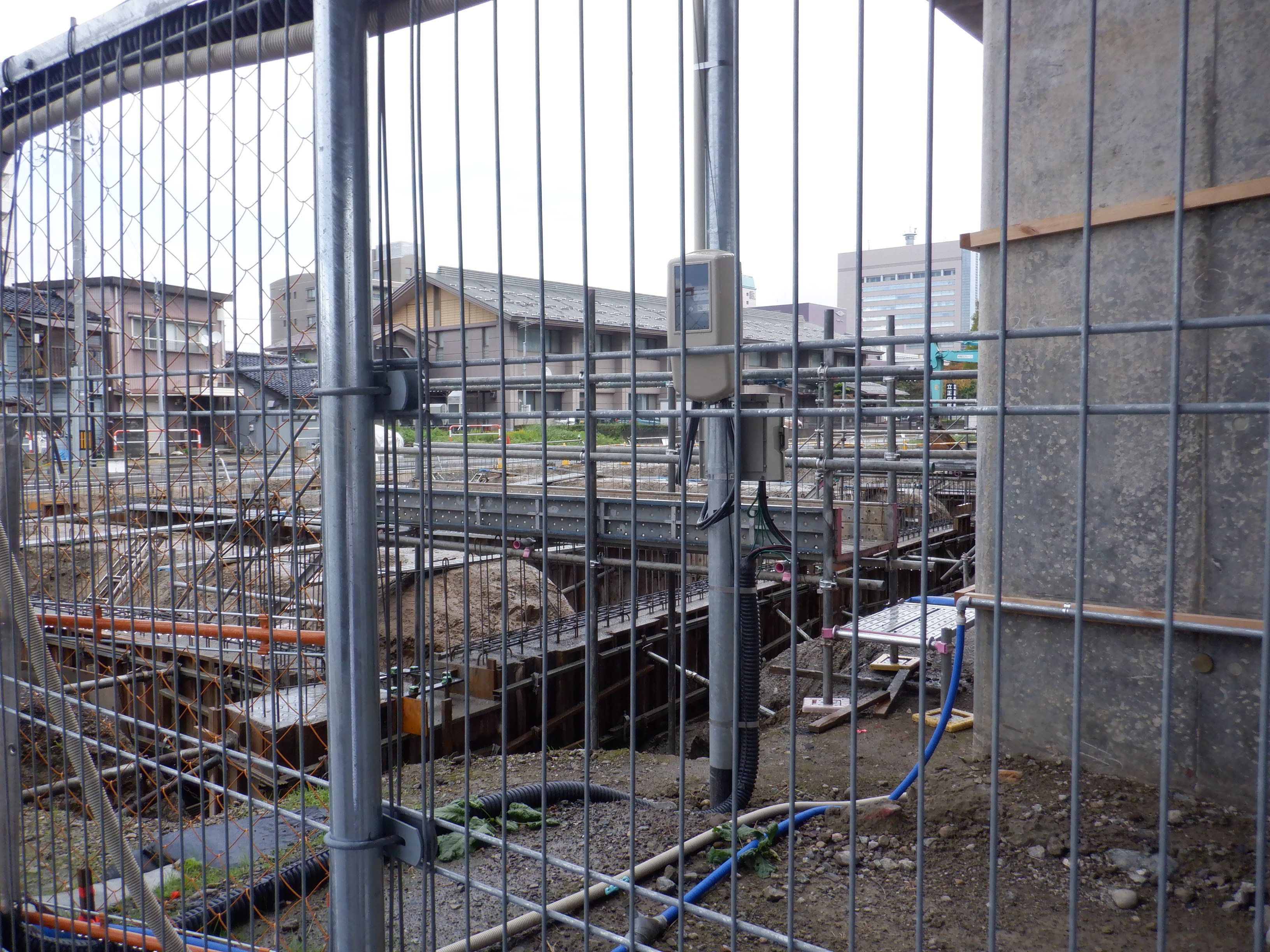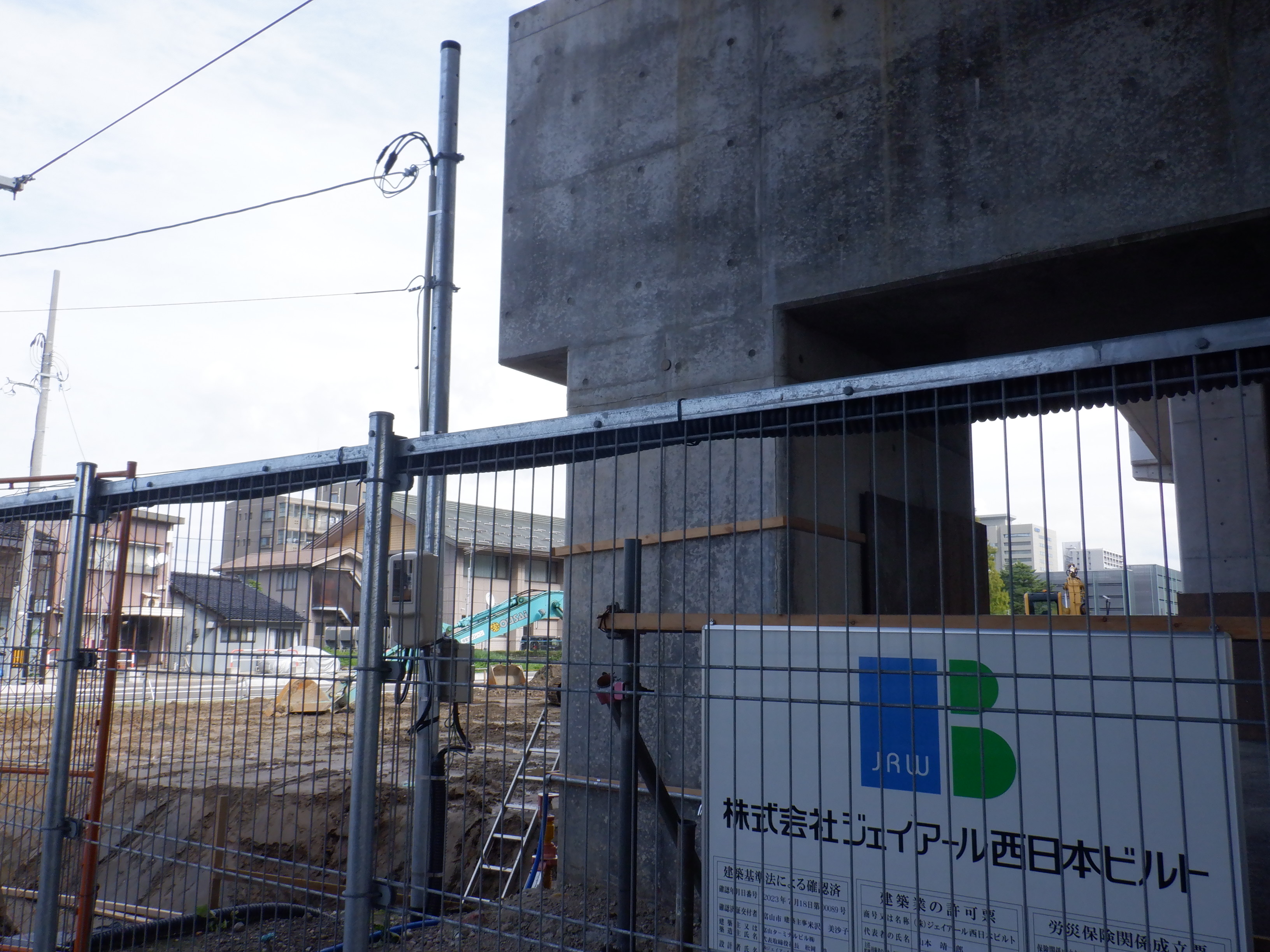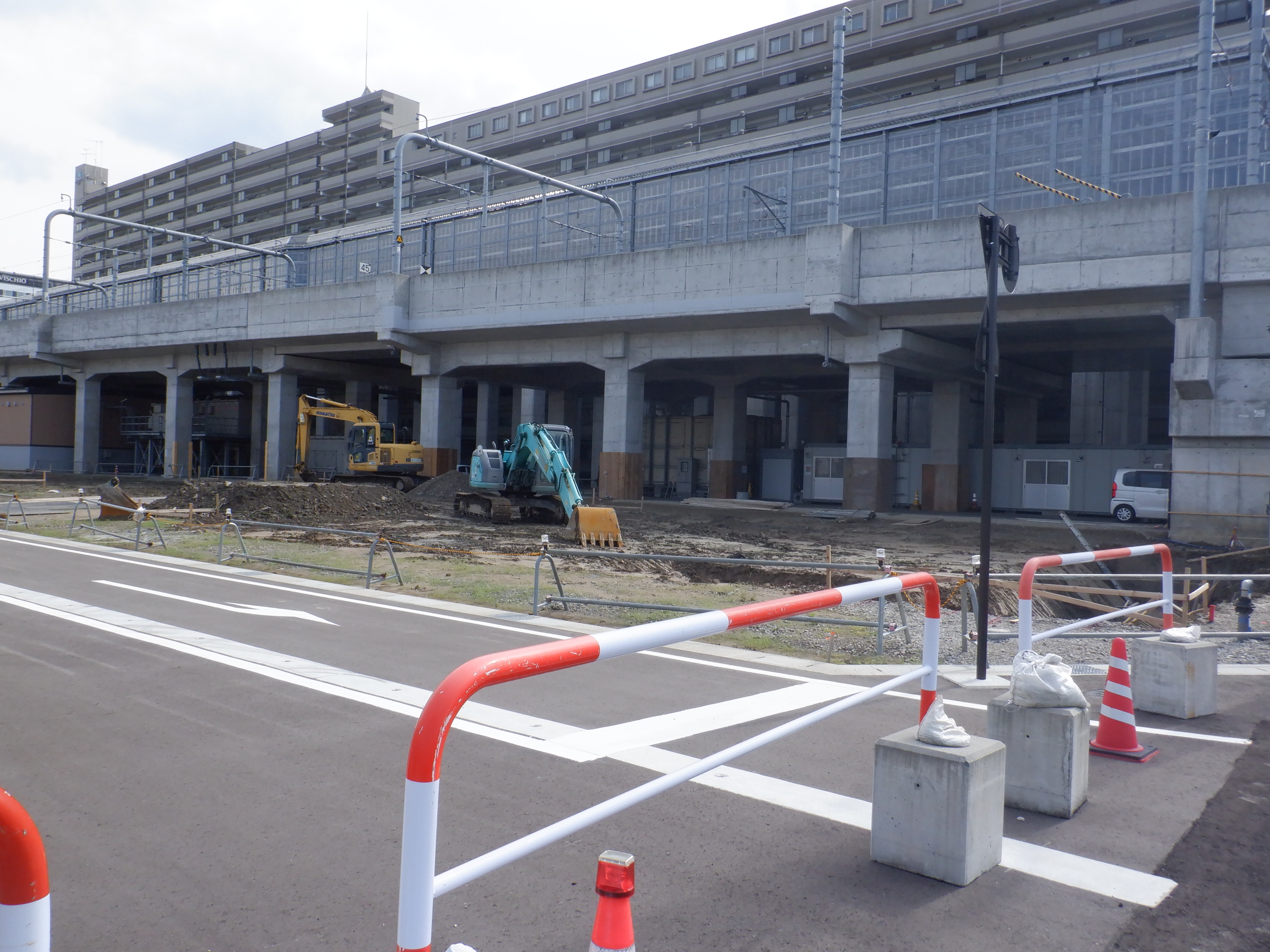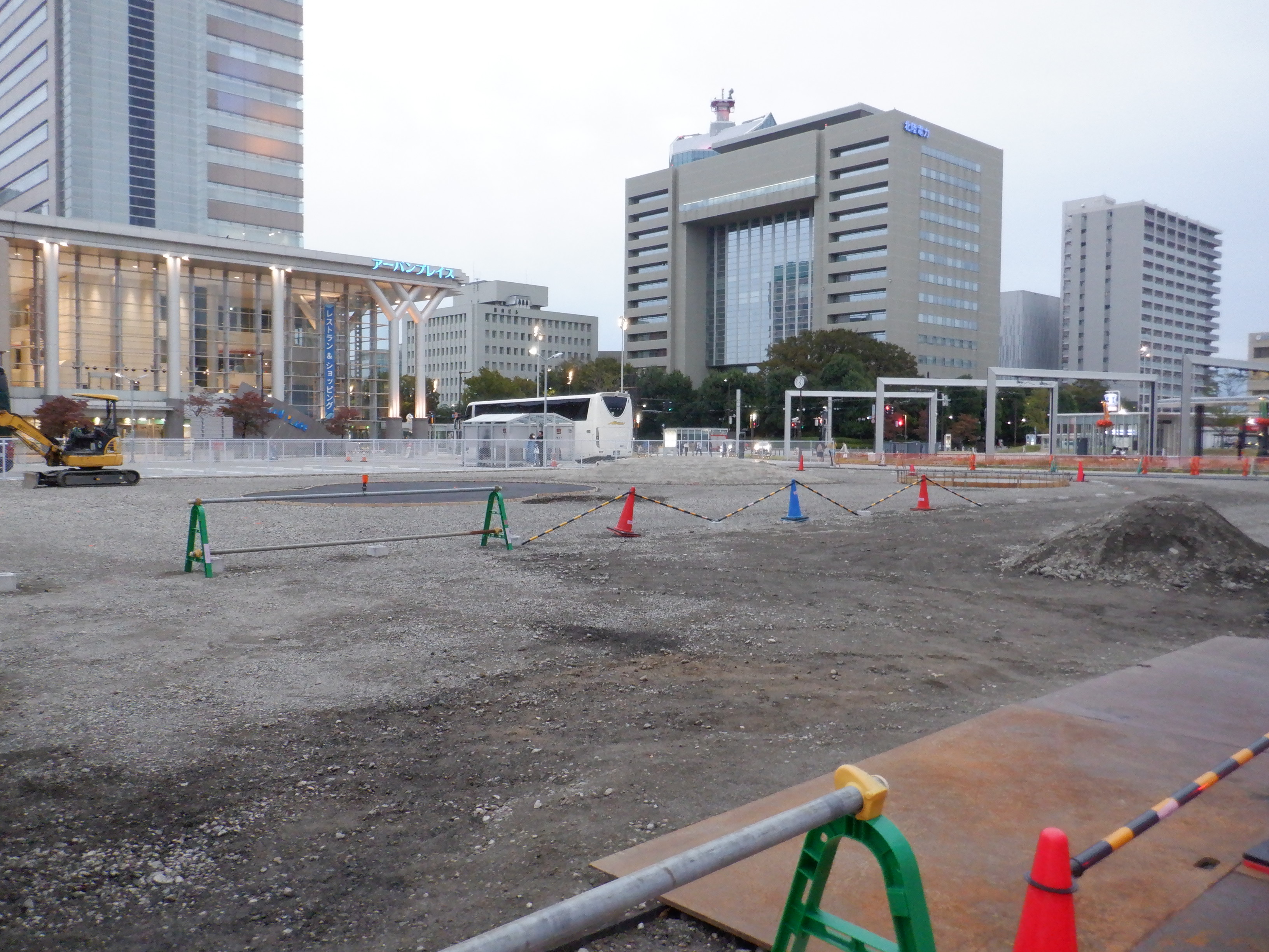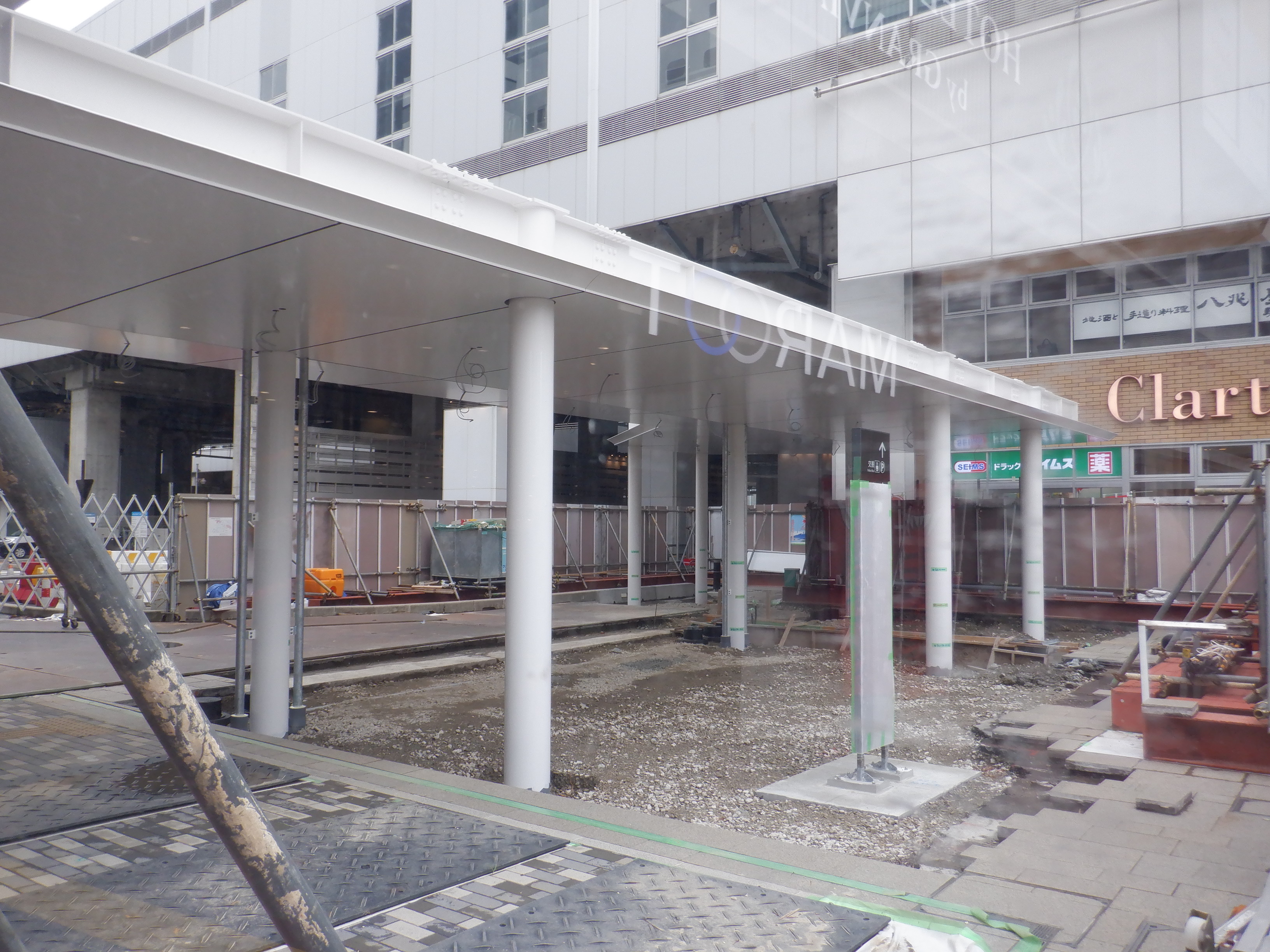 東口とマルートとの間のシェルター建設中のところは支柱の基礎の工事が行われていました。また、商業施設のところも建設が始まっています。