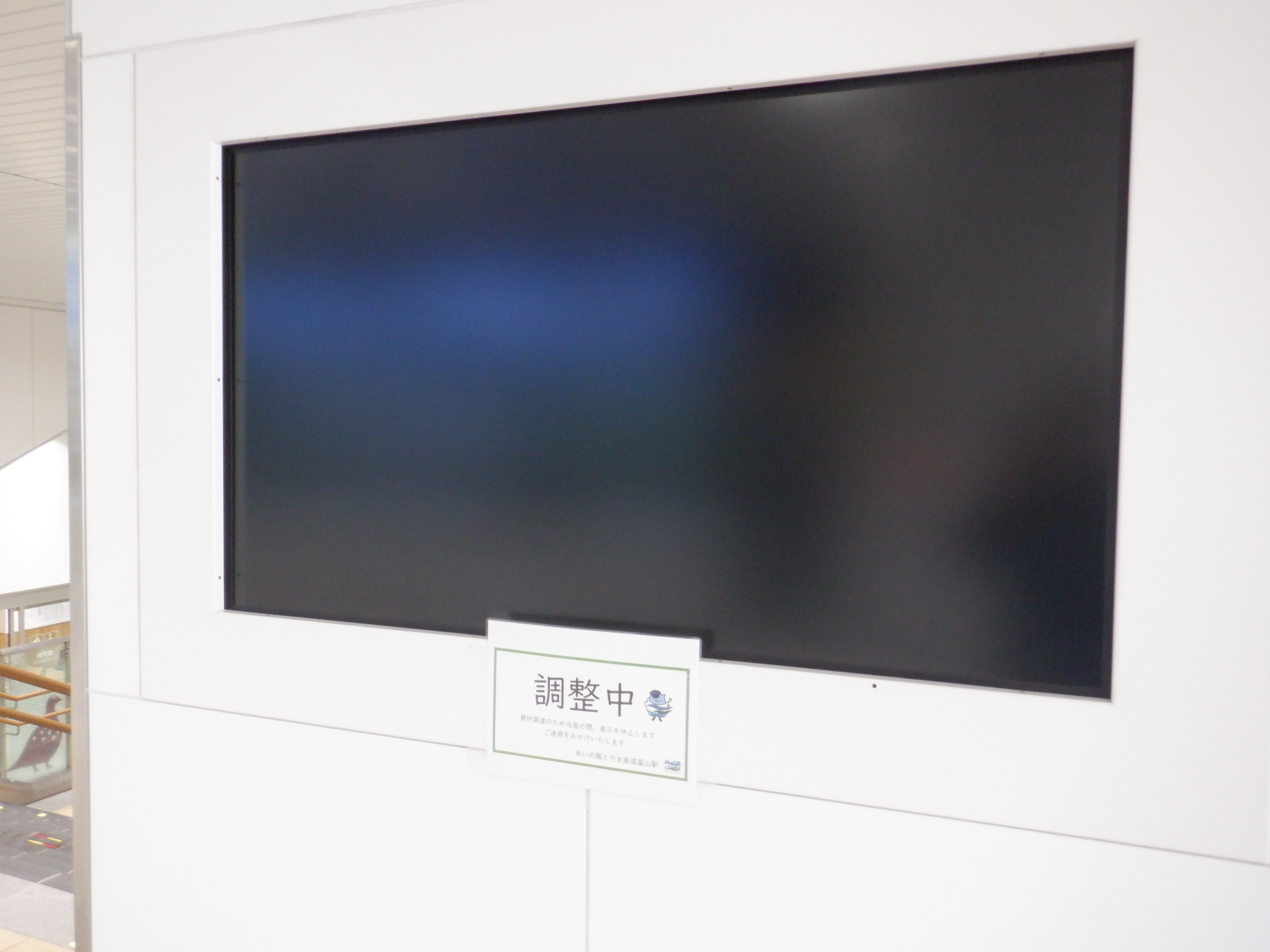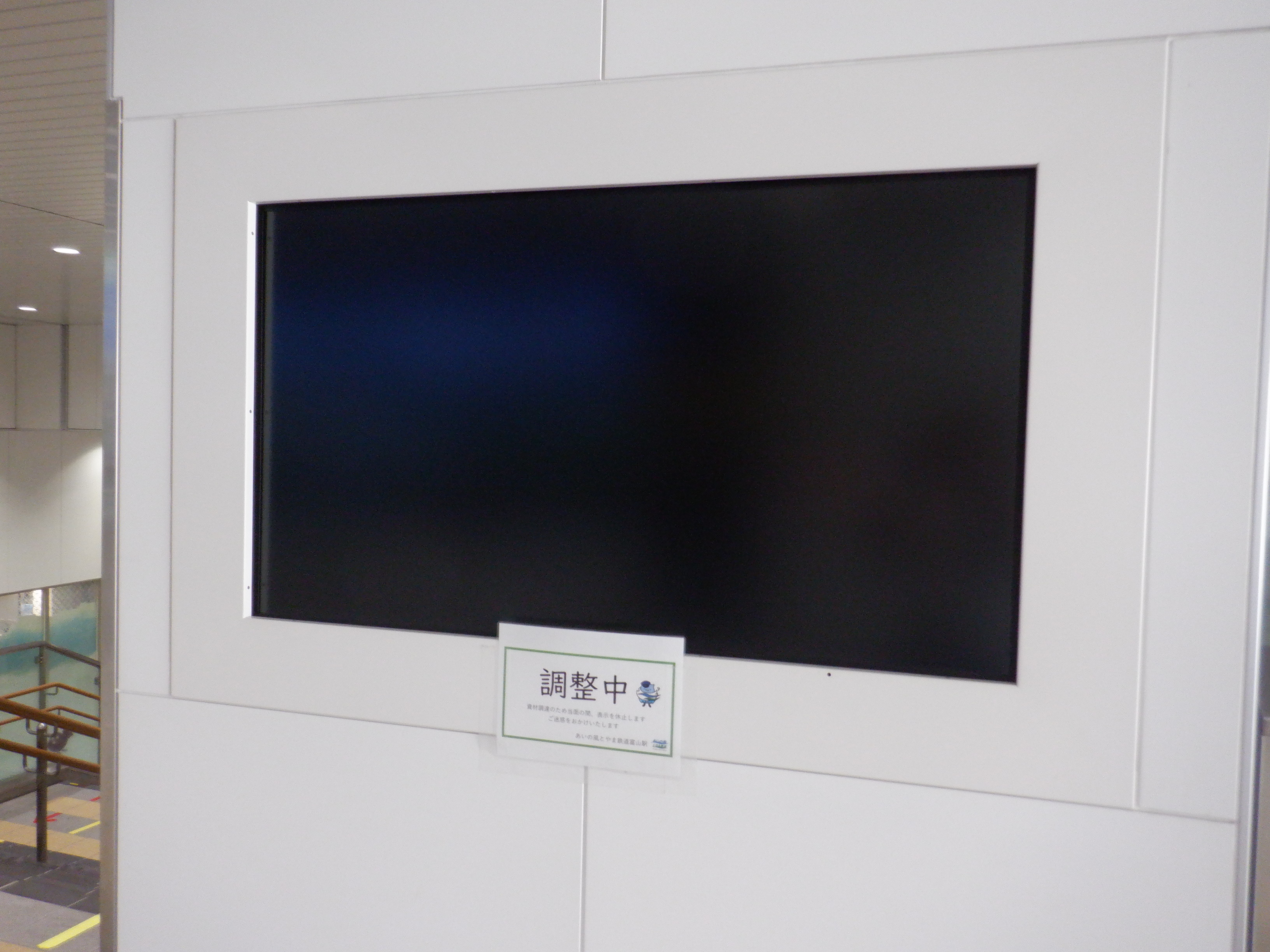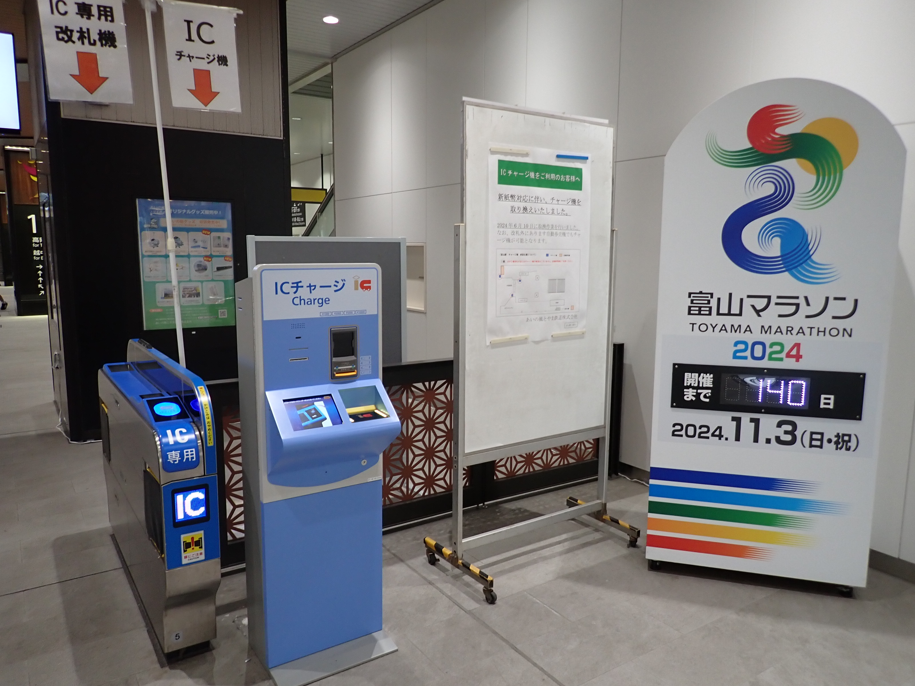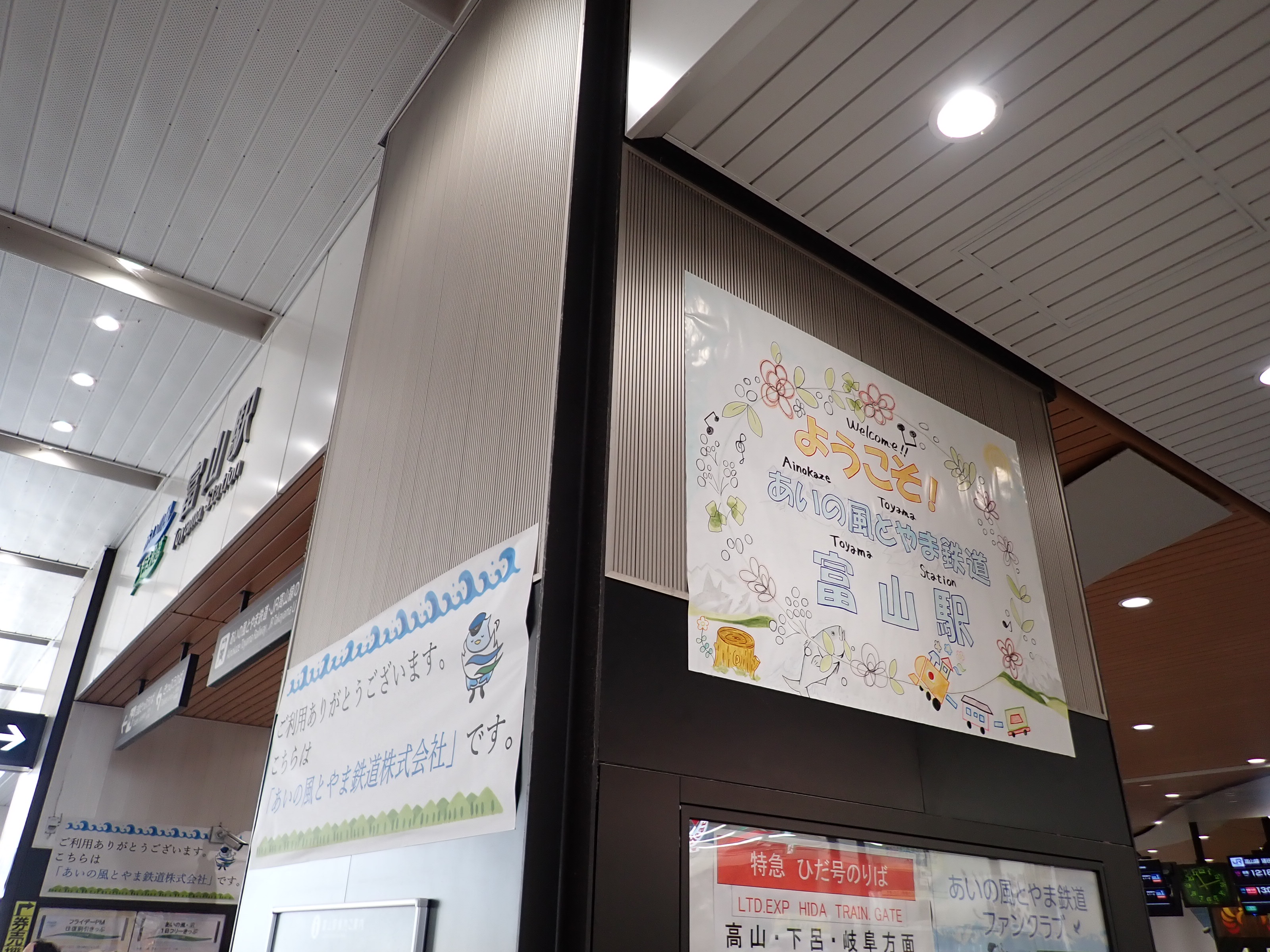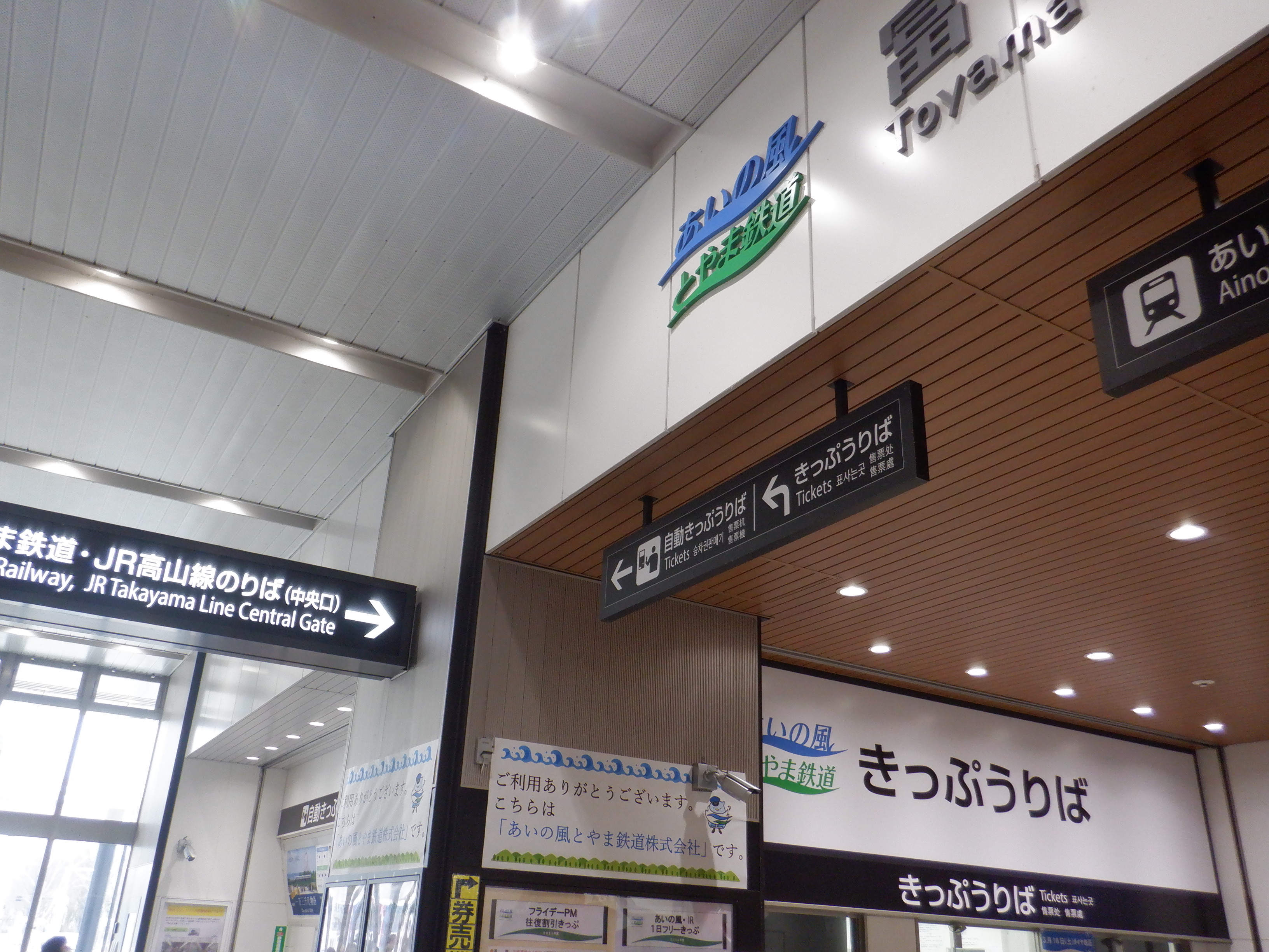改札口のところの案内。「あいの風とやま鉄道株式会社」の部分は、以前は駅名標や車両同様、山側が緑色でしたが、今回は両側水色になっています。