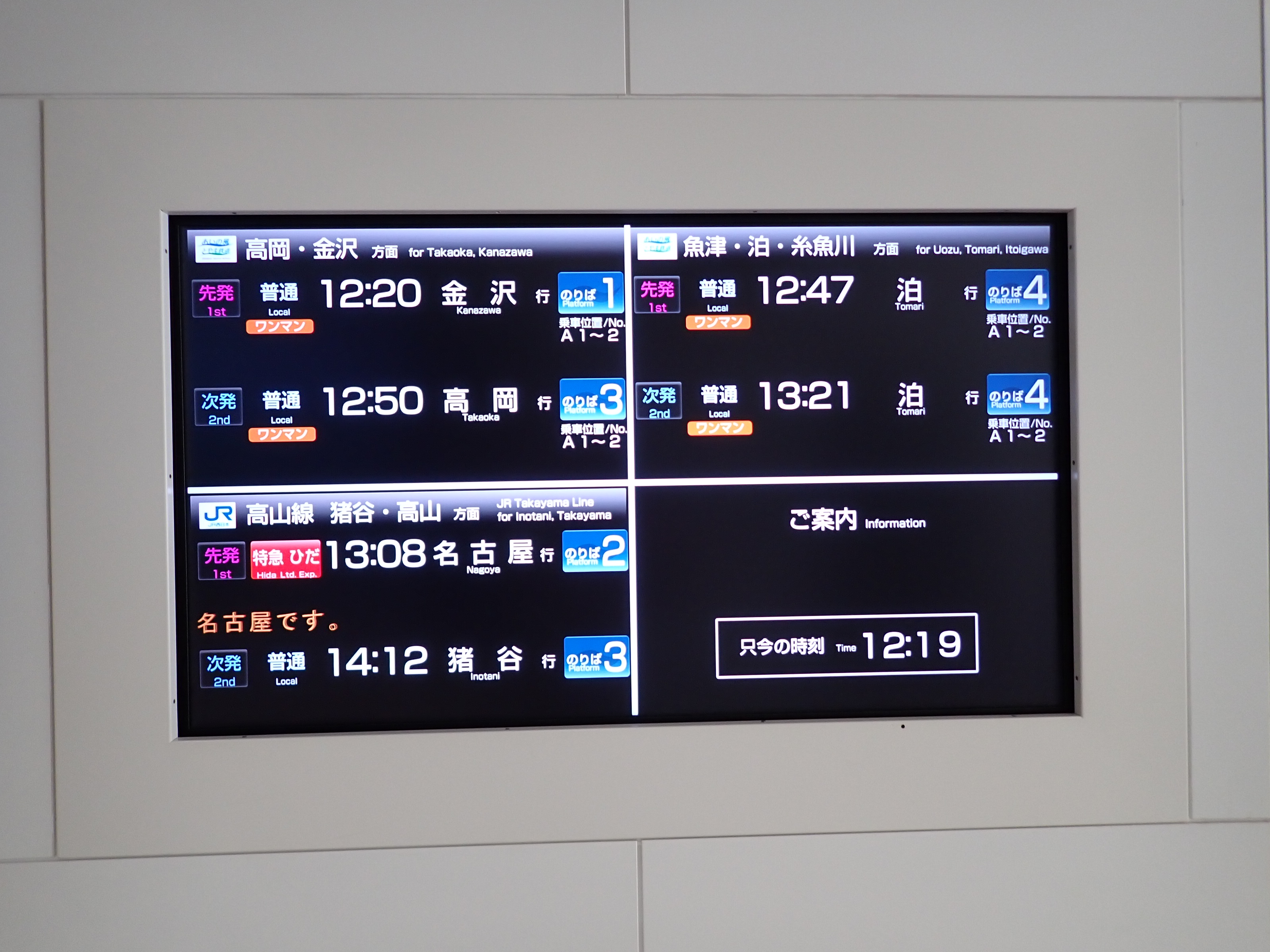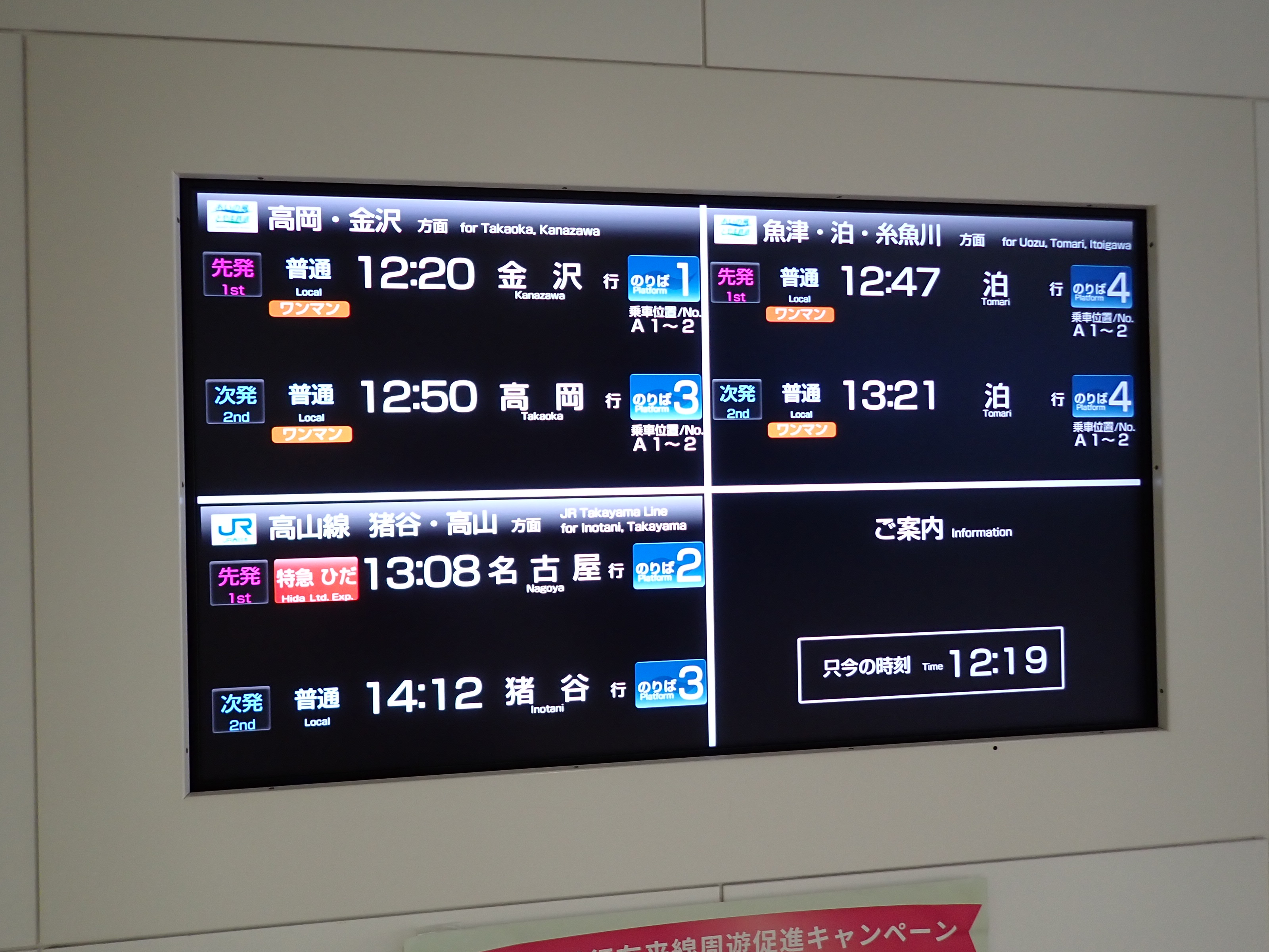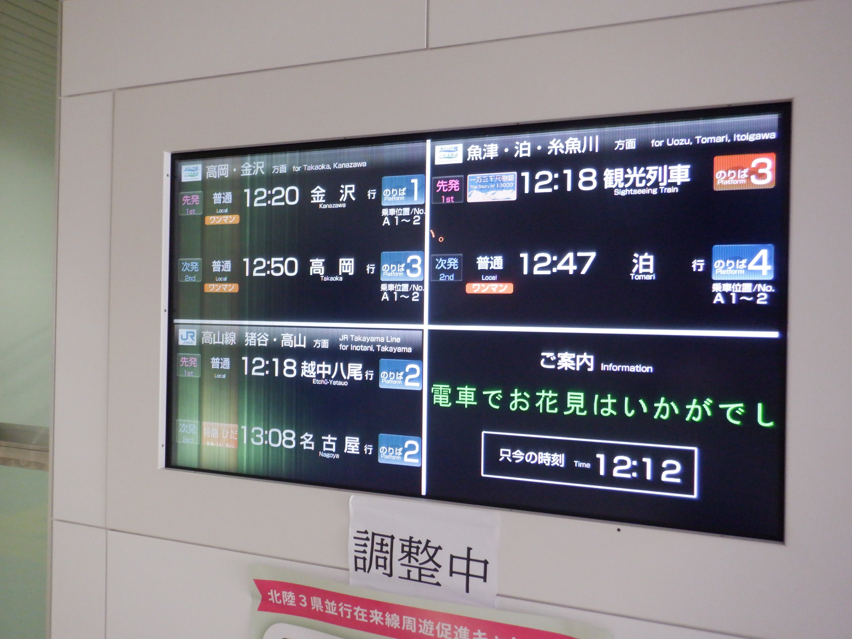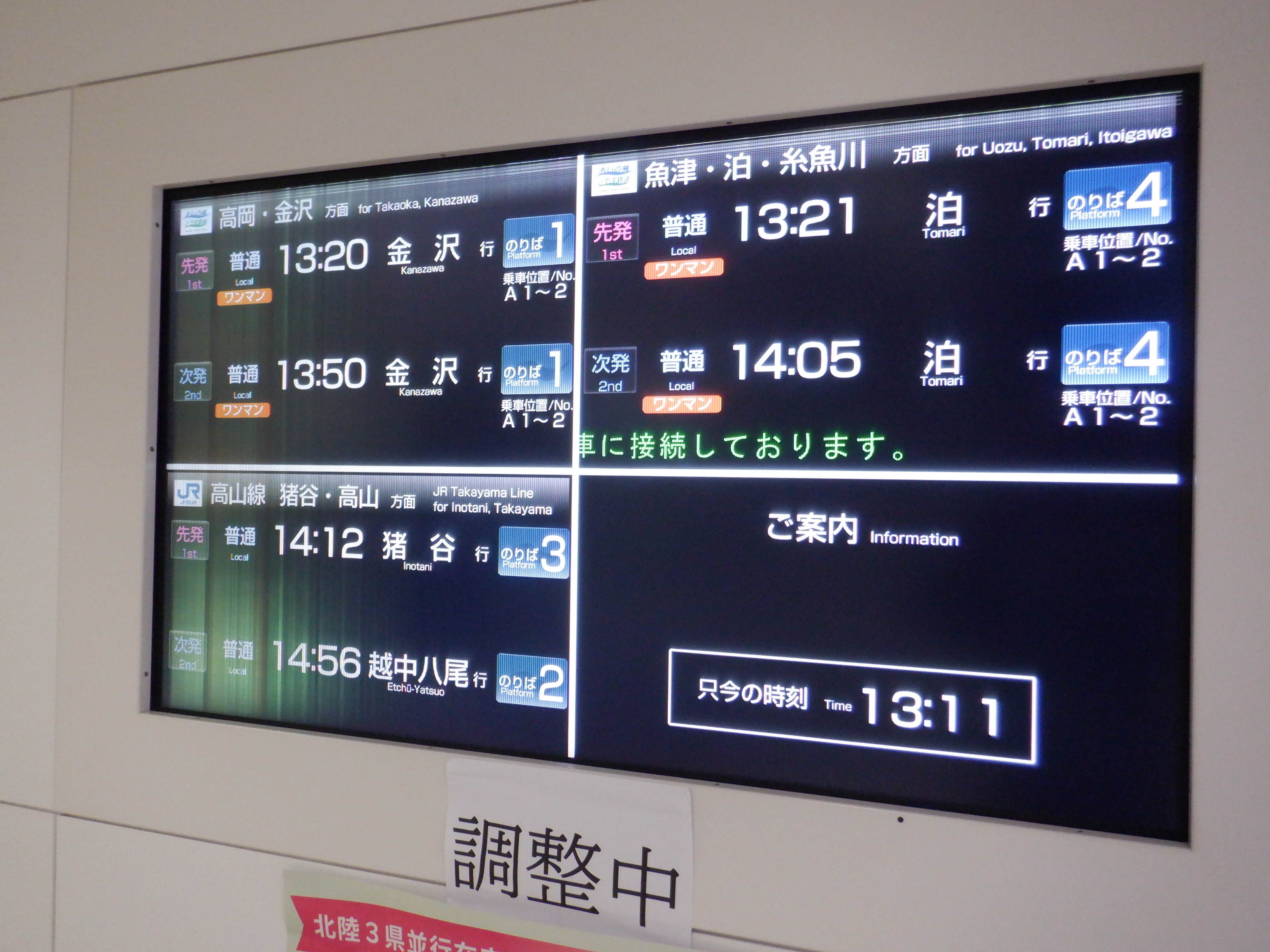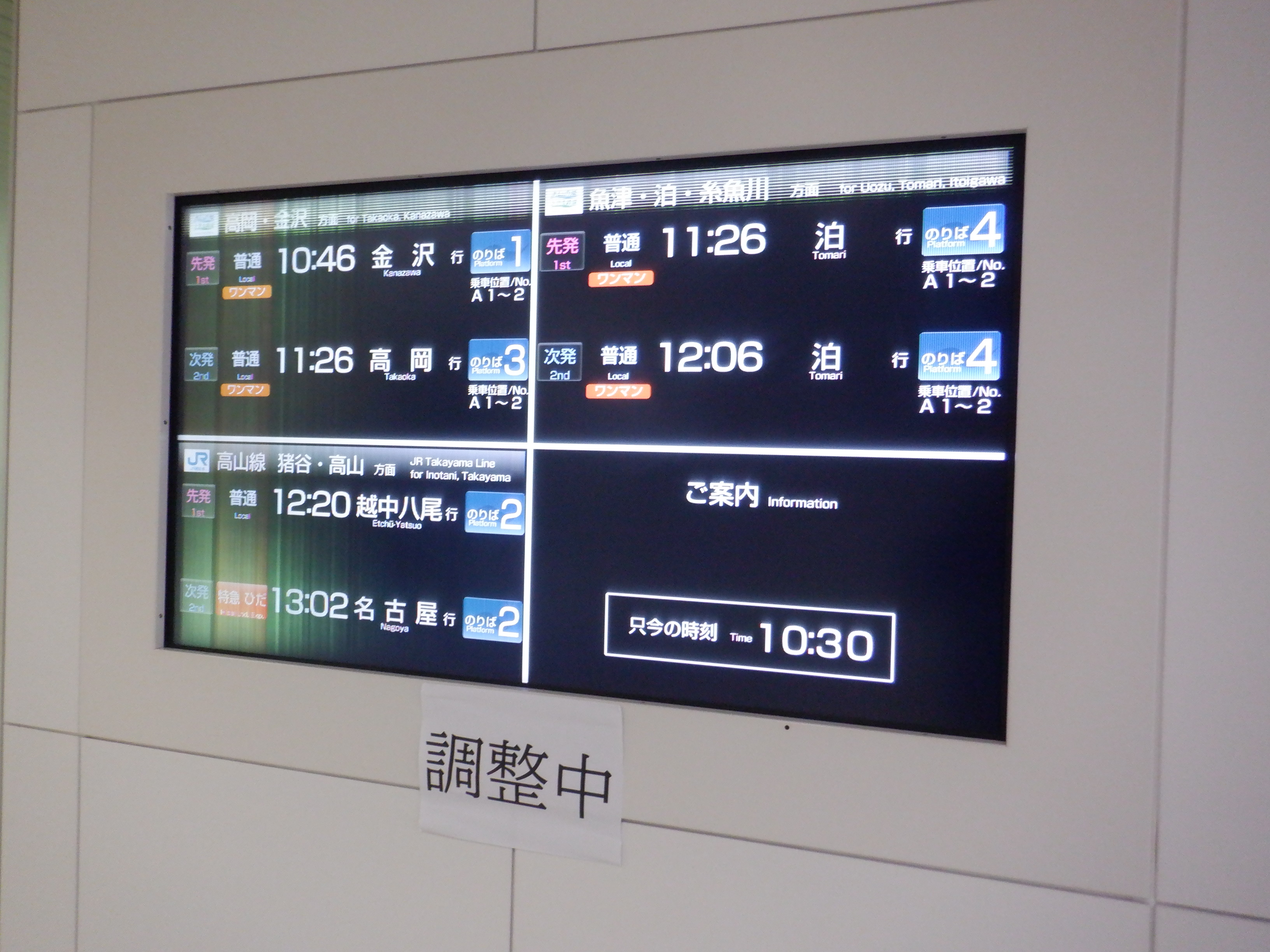 改札口のところの案内。「あいの風とやま鉄道株式会社」の部分は、以前は駅名標や車両同様、山側が緑色でしたが、今回は両側水色になっています。