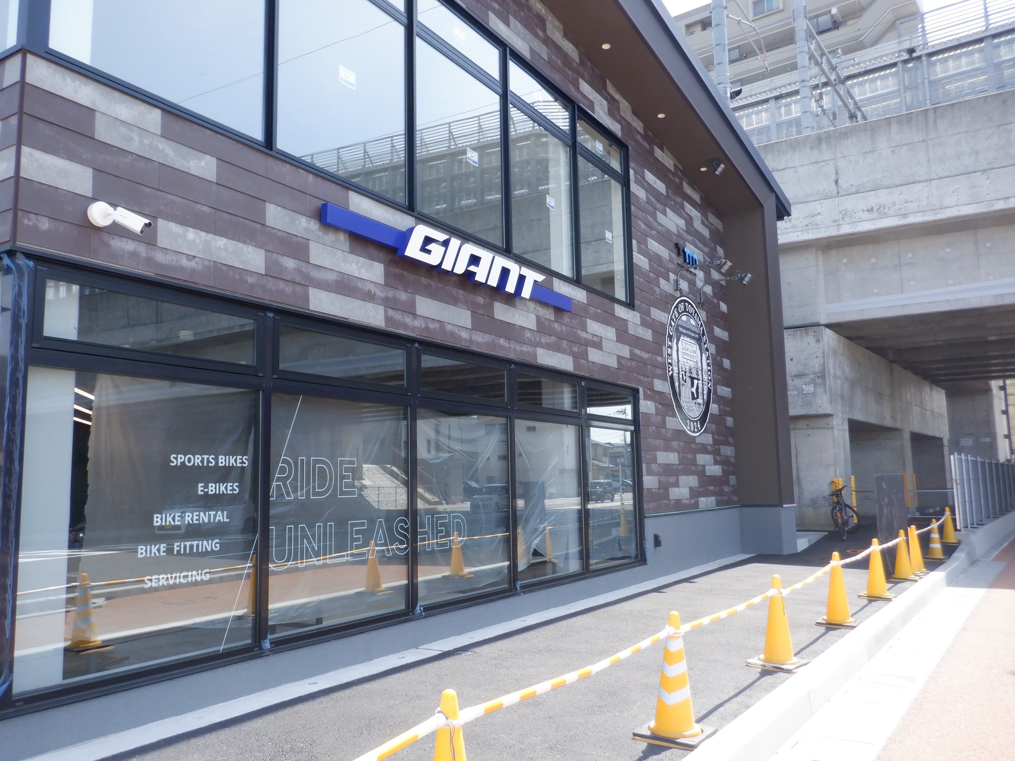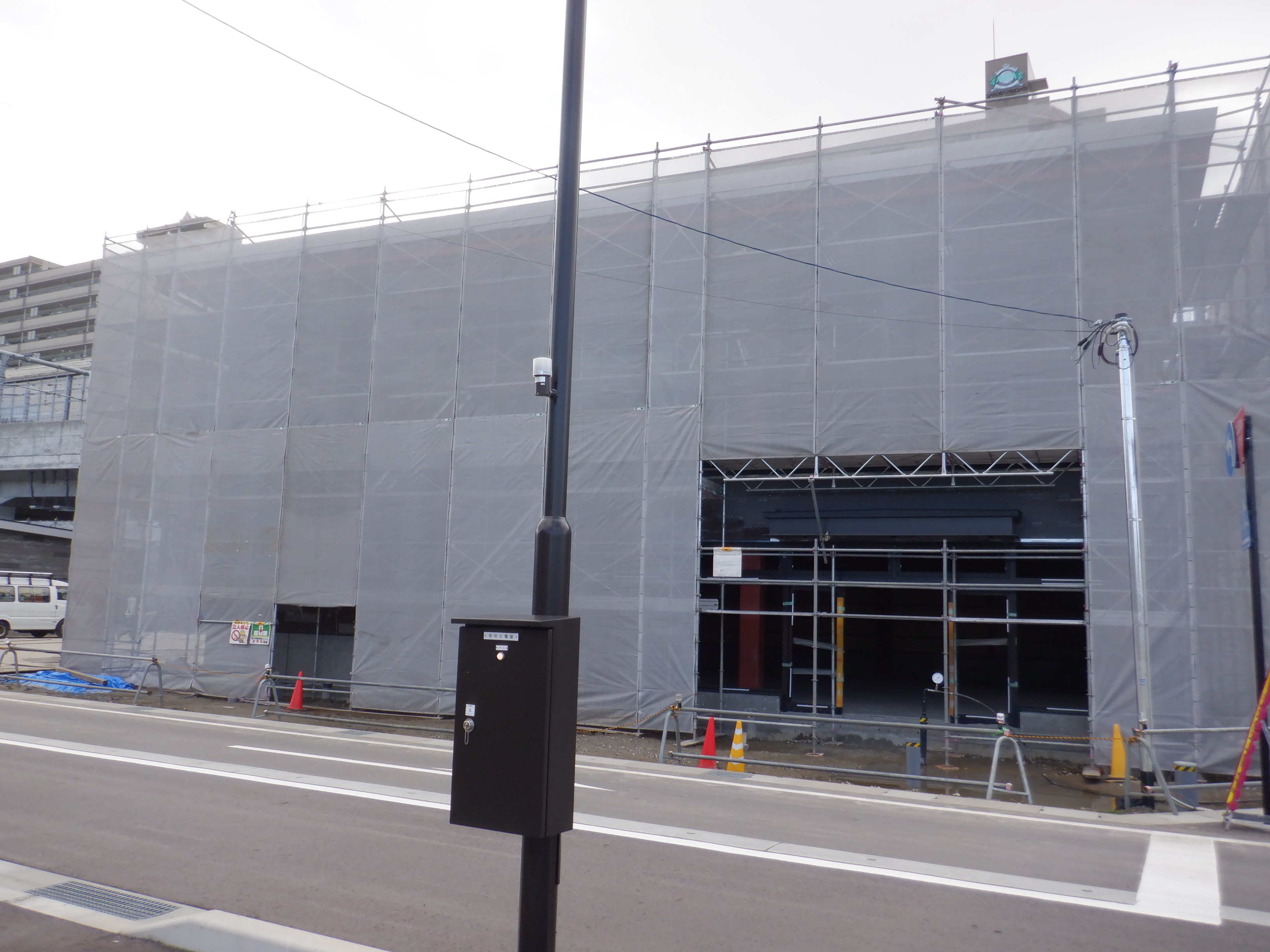 商業施設(牛島パークウエスト)建設中の様子。足場が取れ、外壁が見えていました。ロゴも描かれています。