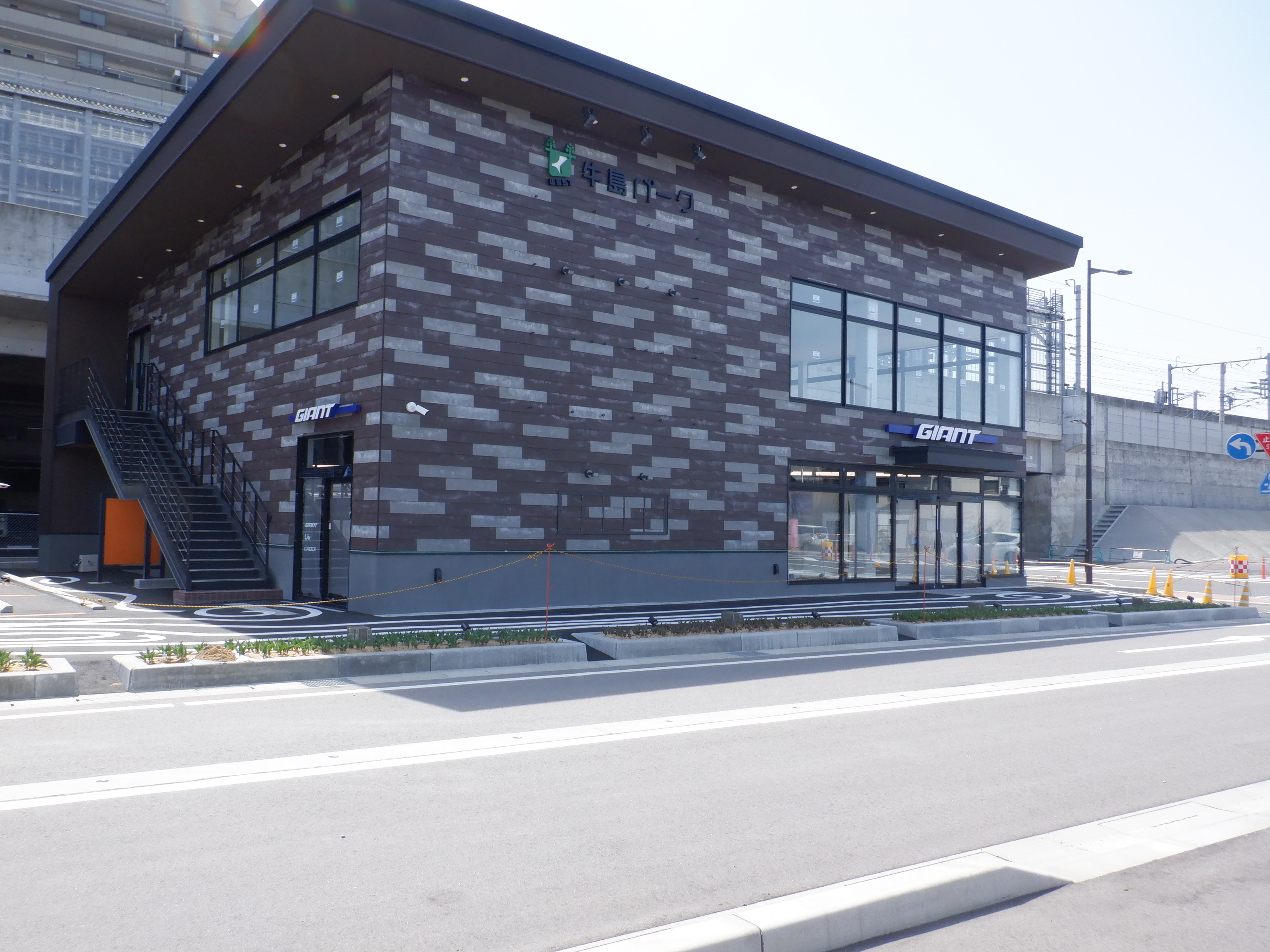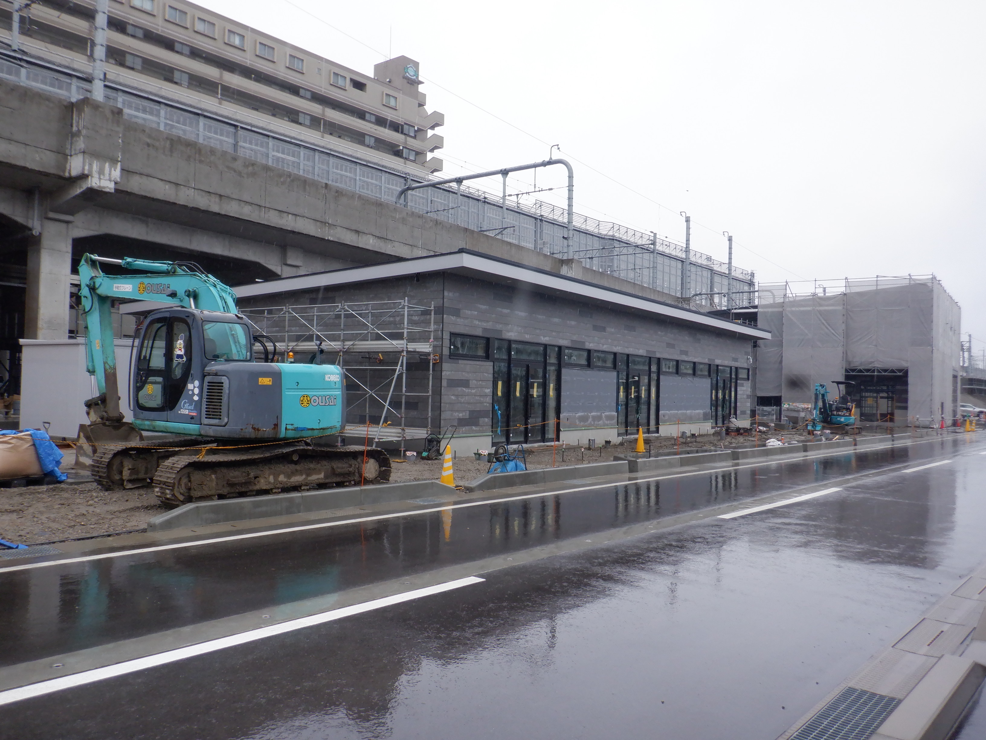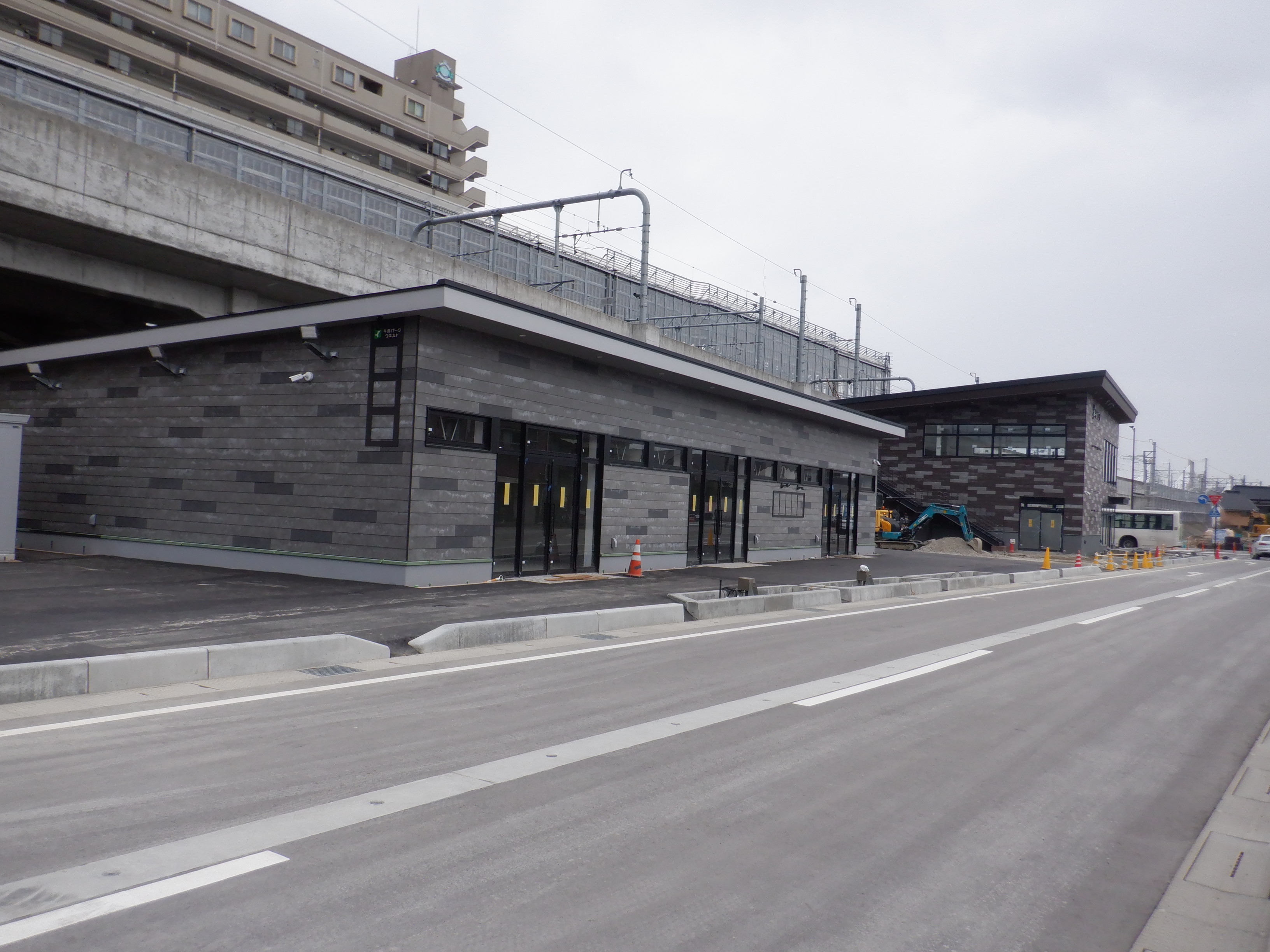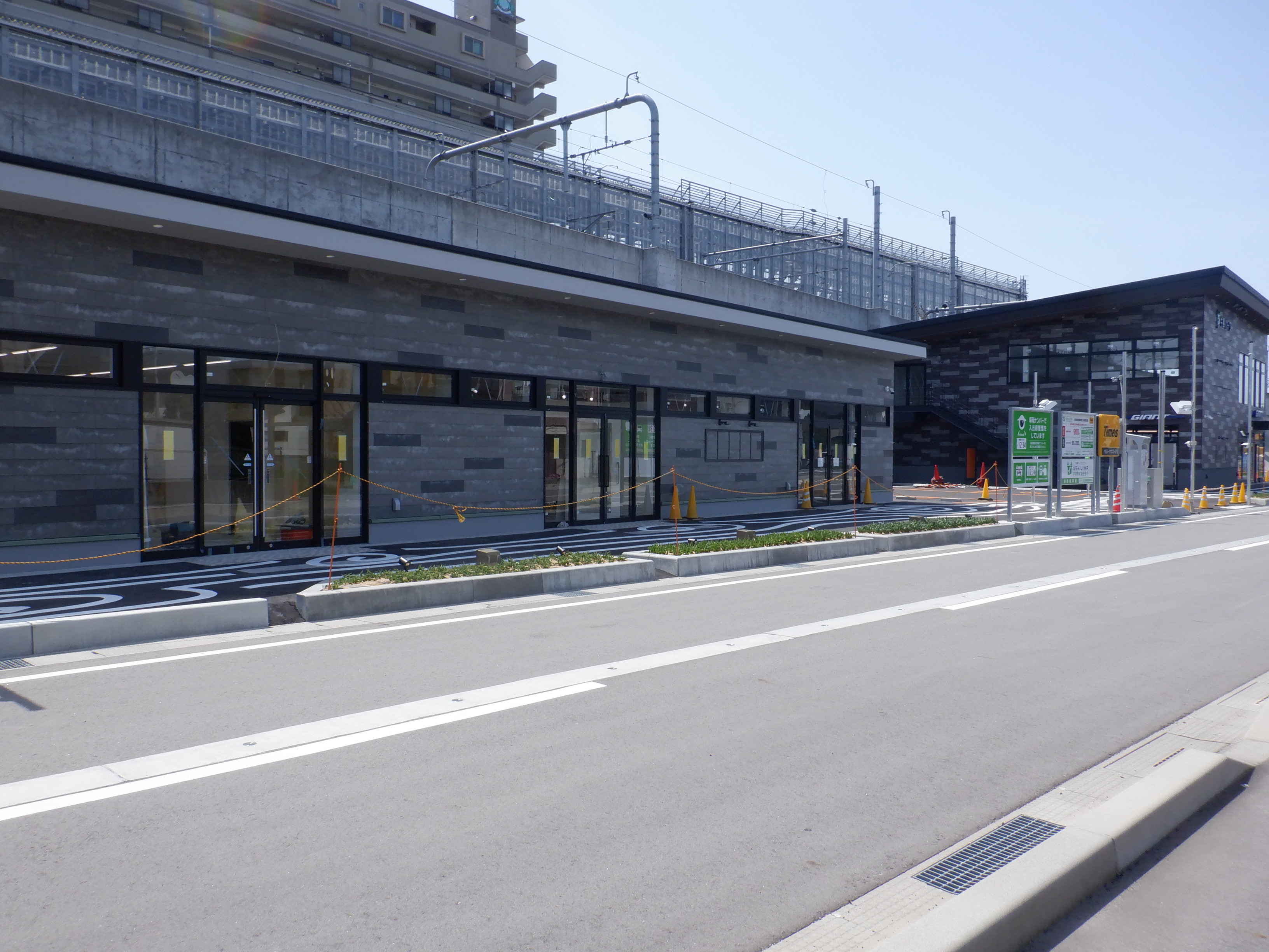 仮設線路があったところに建設中だった商業施設(牛島パークウエスト)の足場が取れ、外観が見えていました。