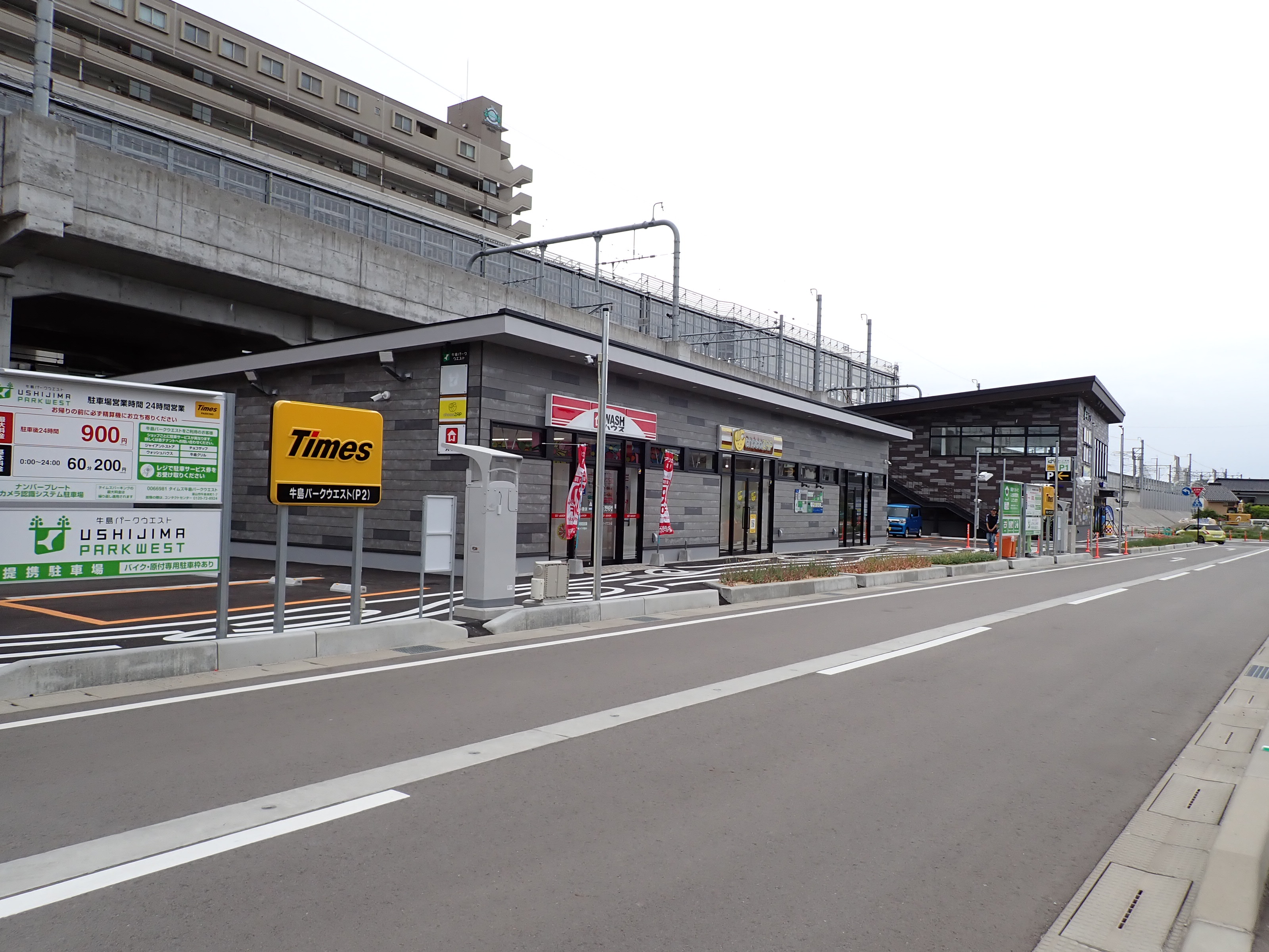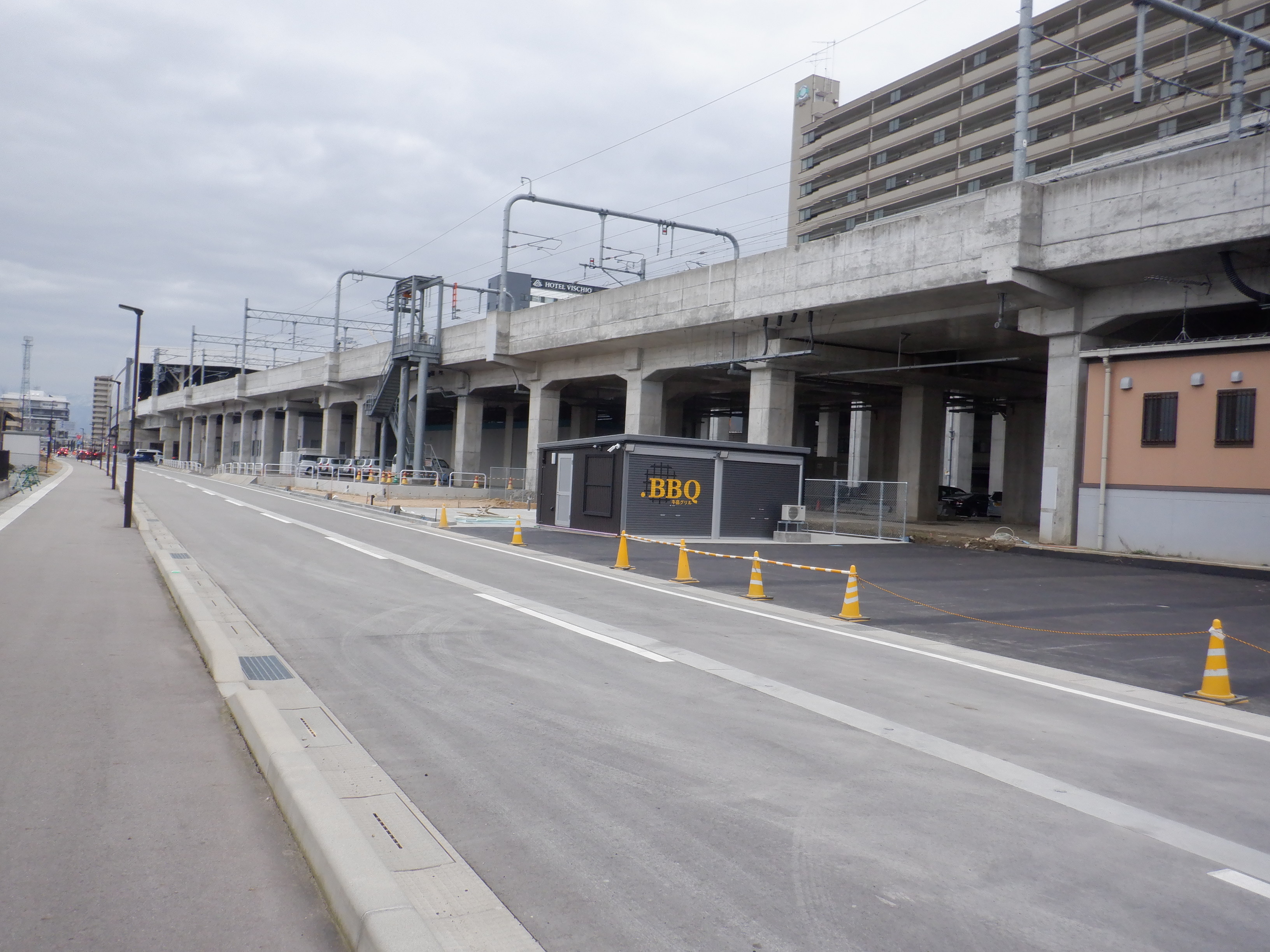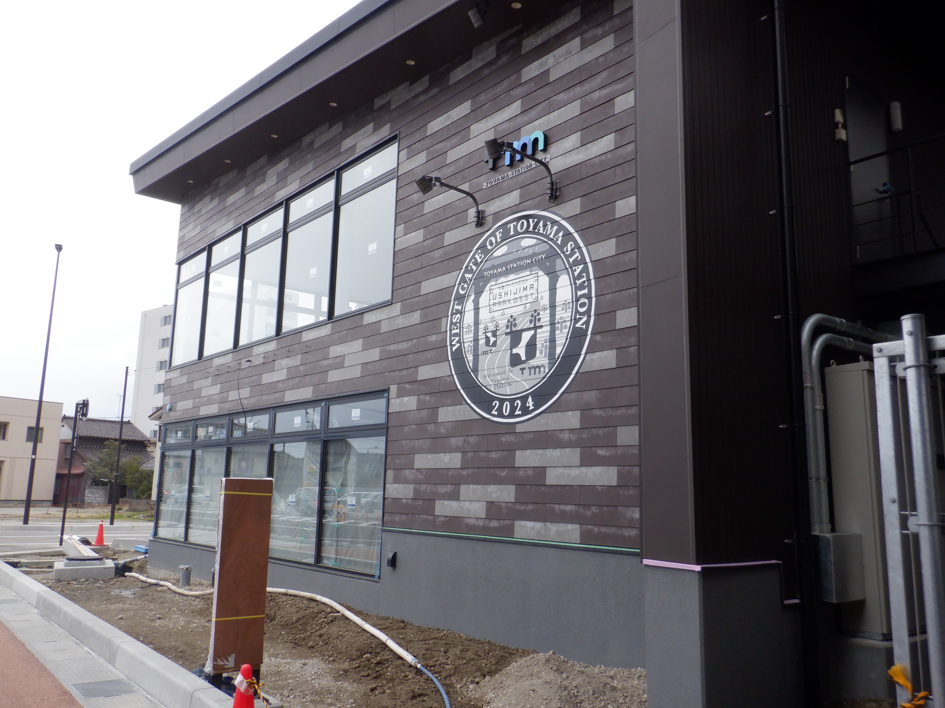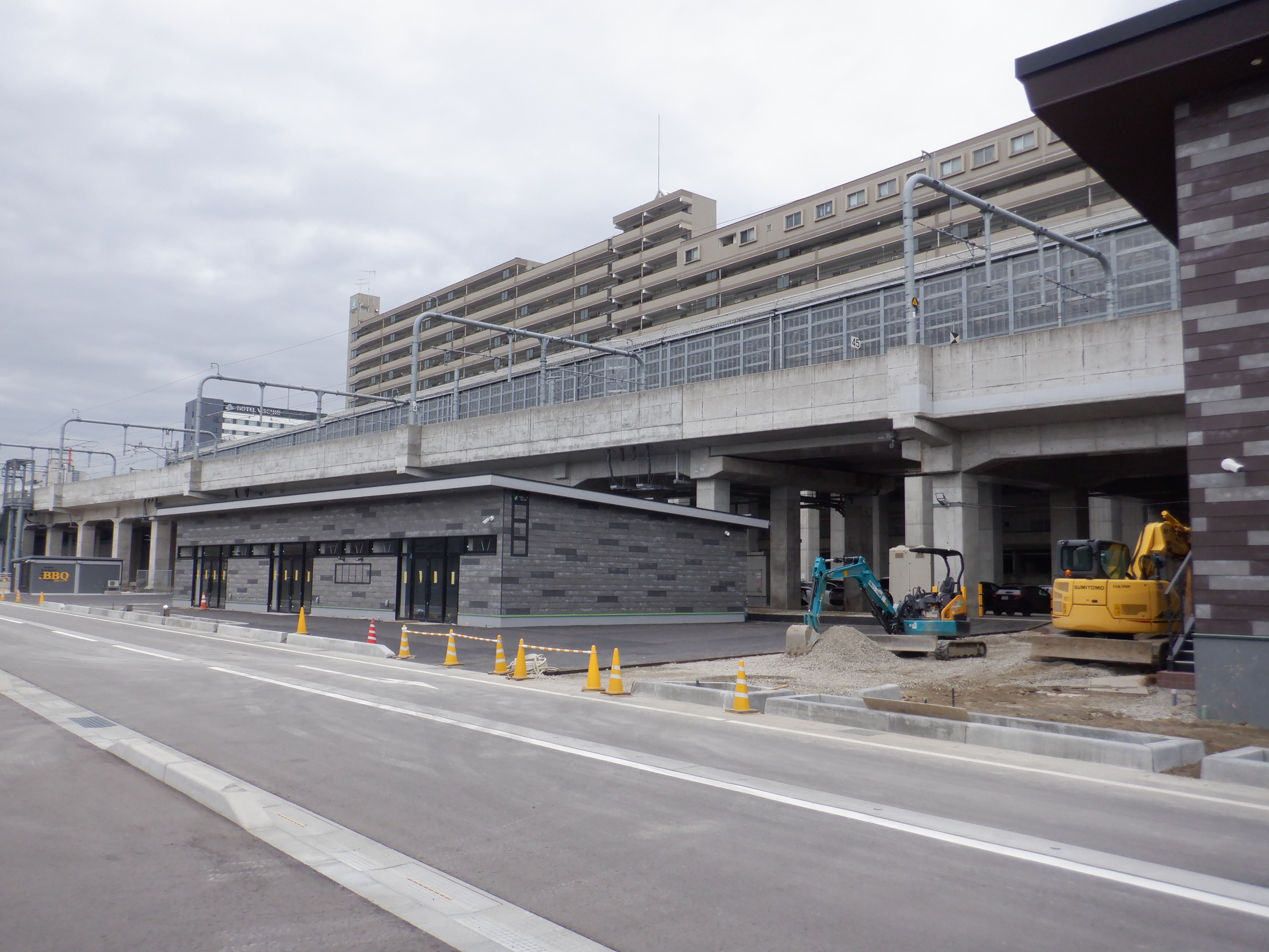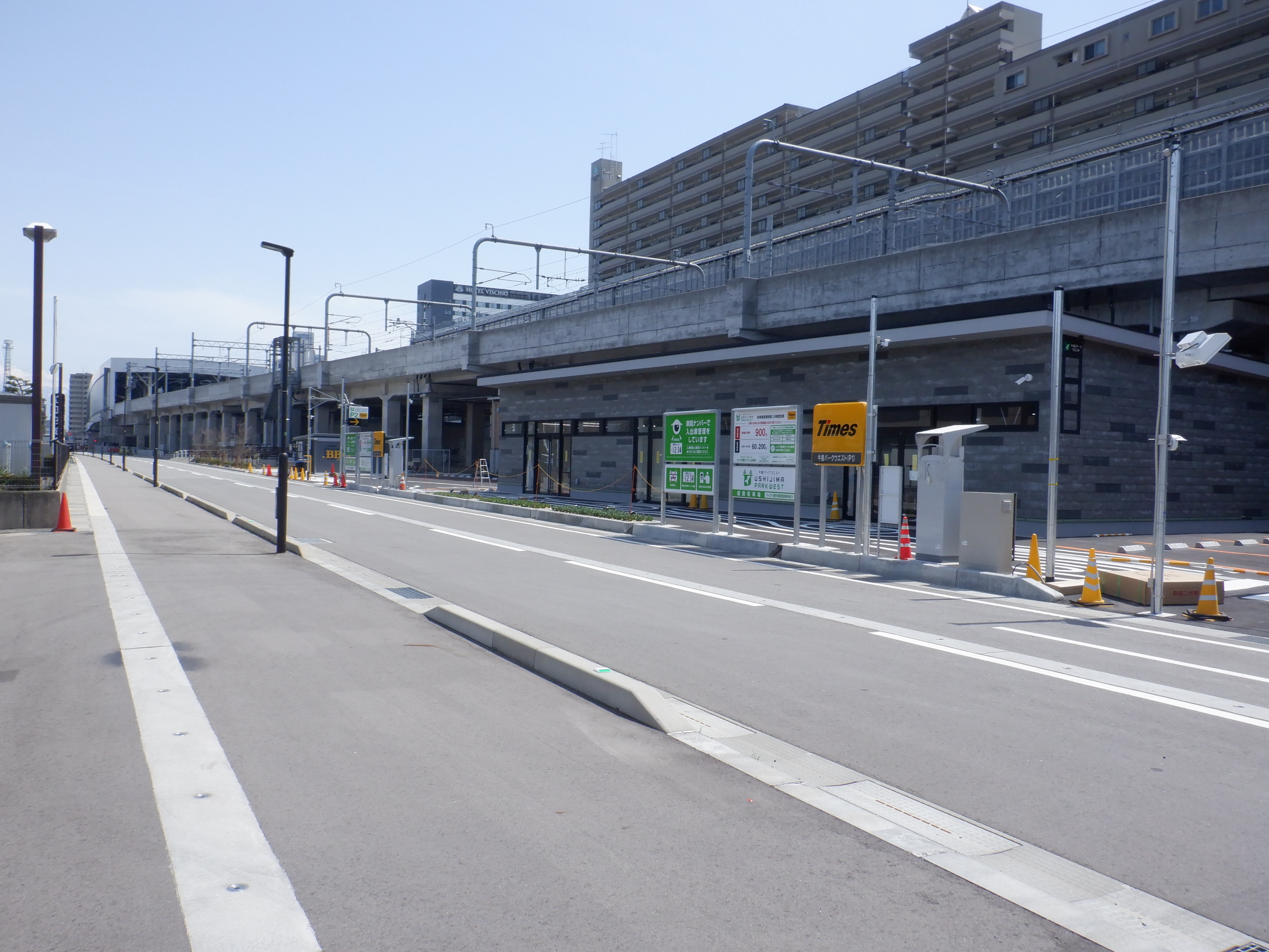 仮設線路があったところに建設中だった商業施設(牛島パークウエスト)の足場が取れ、外観が見えていました。