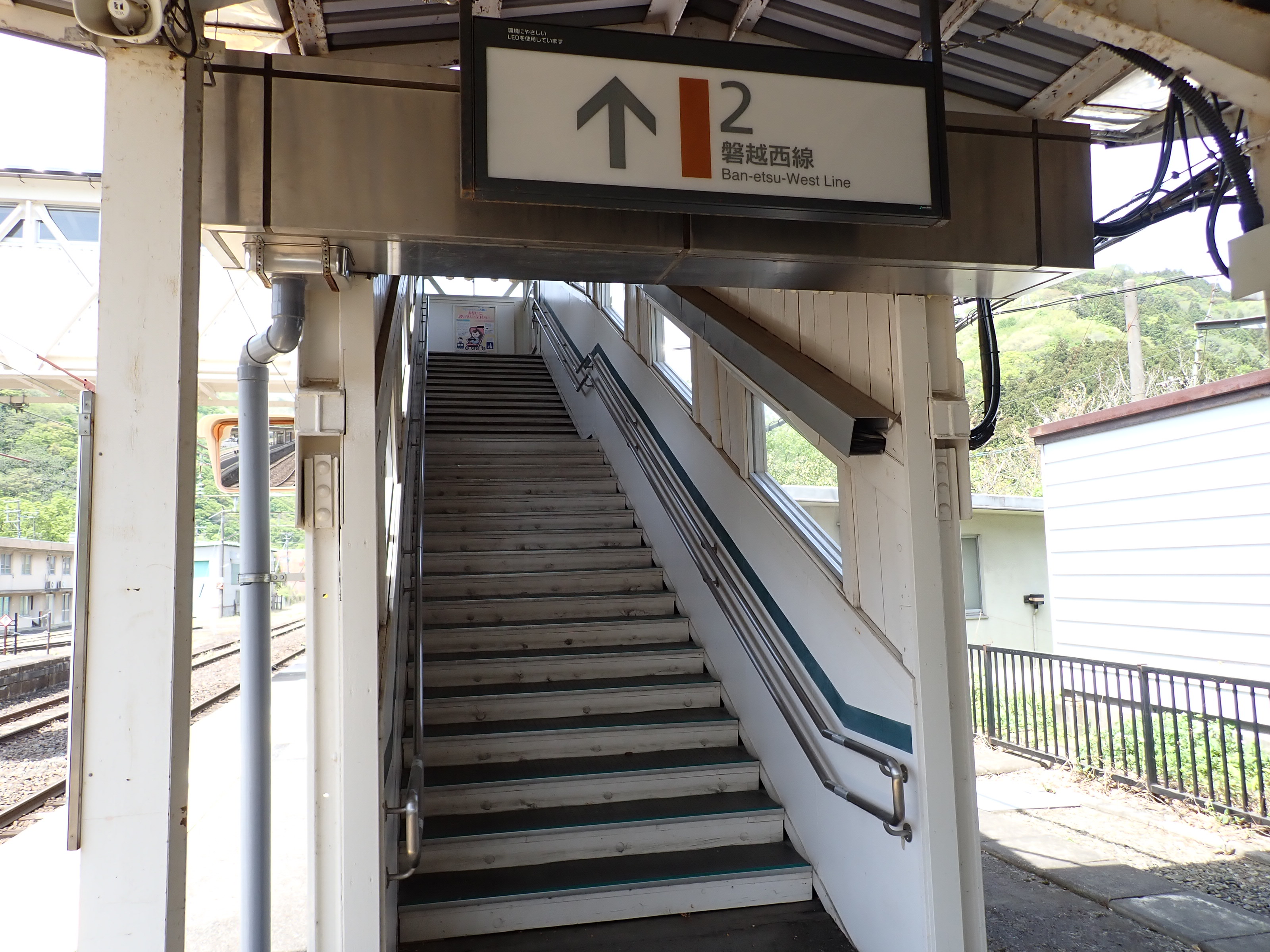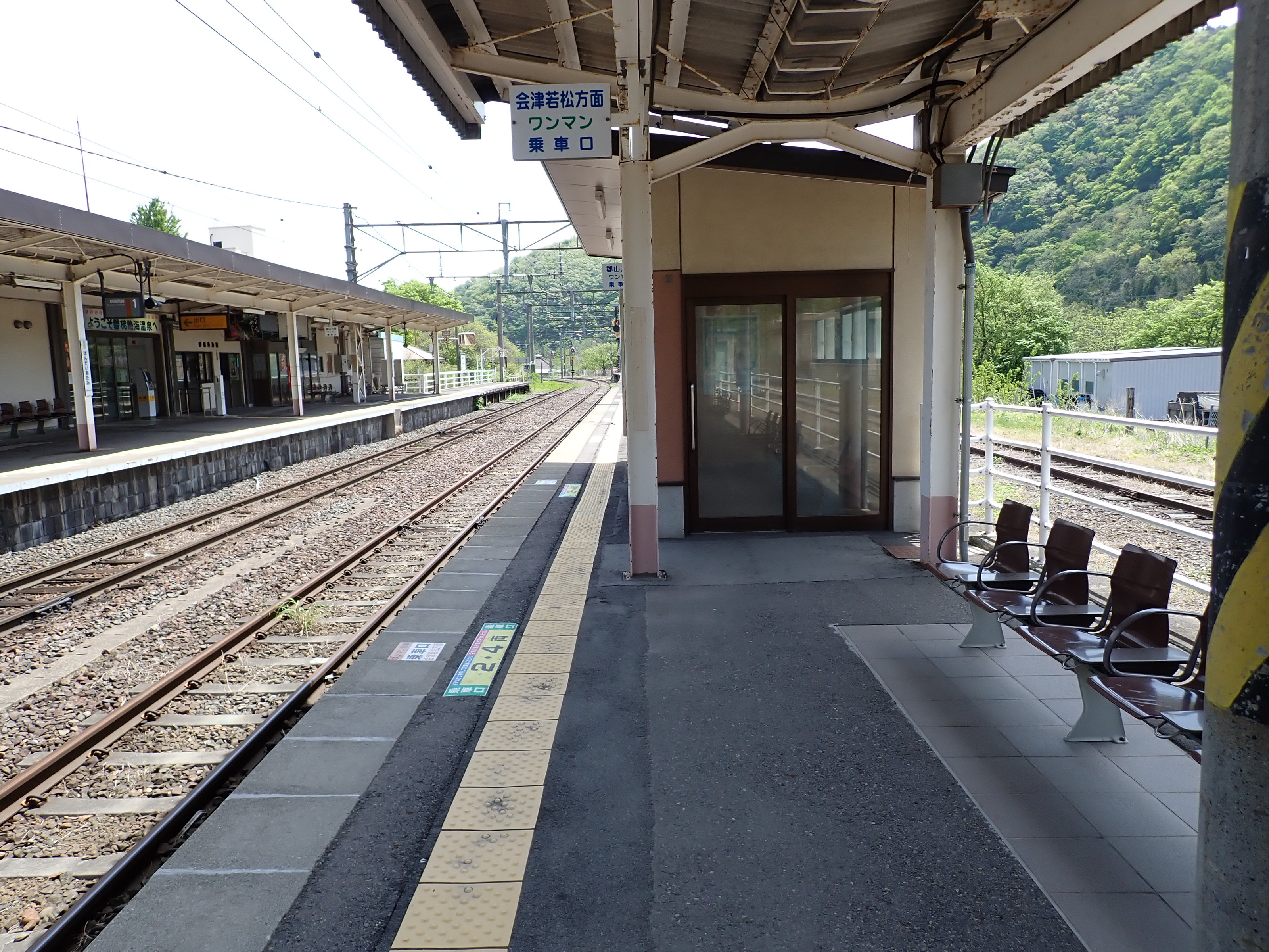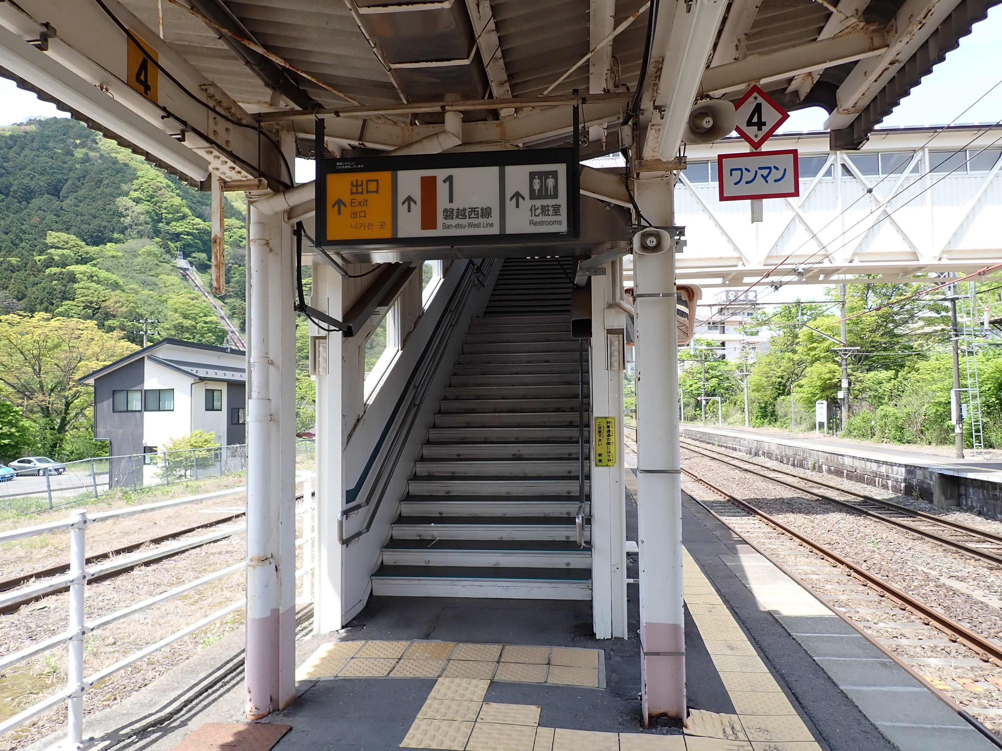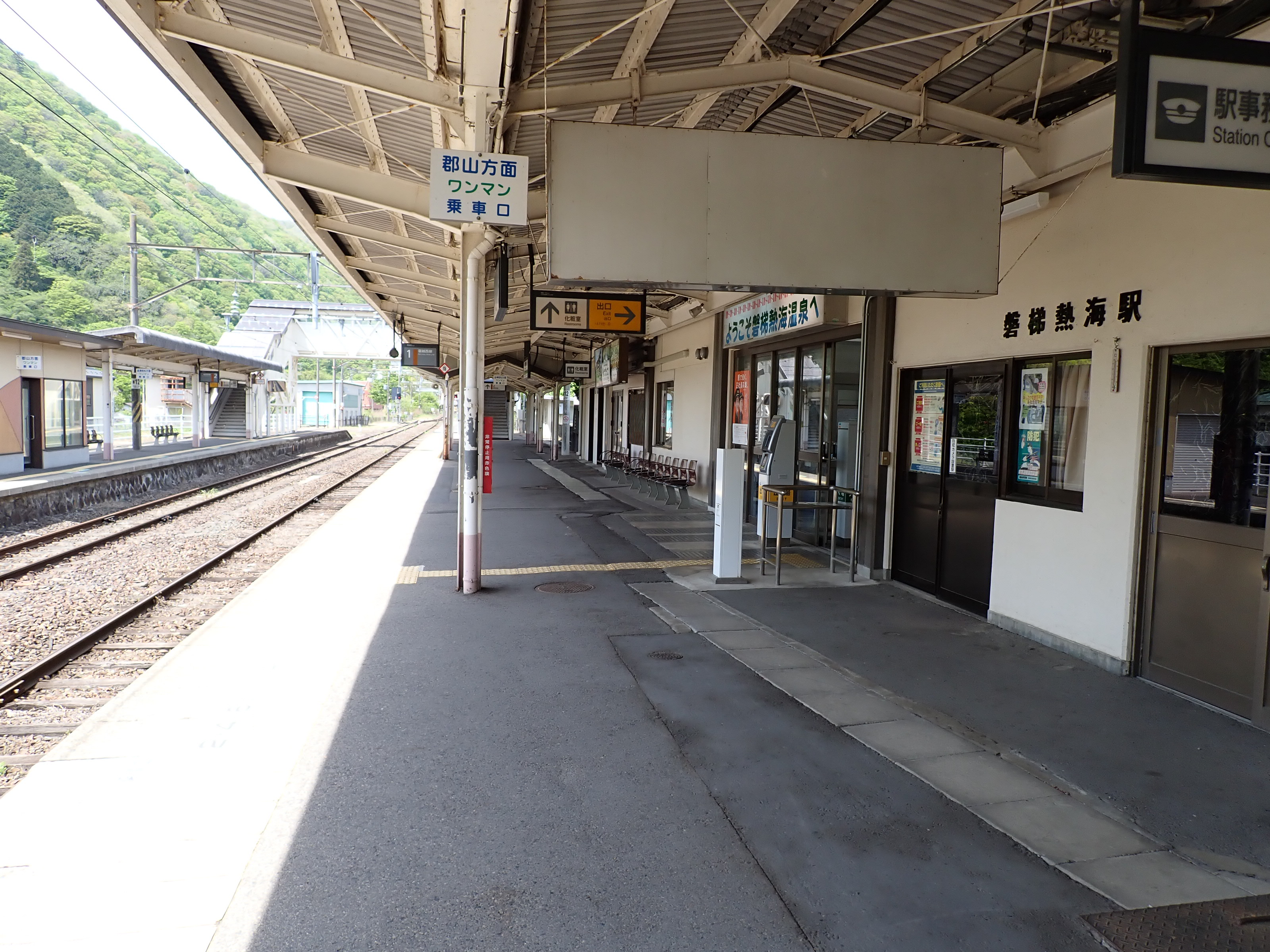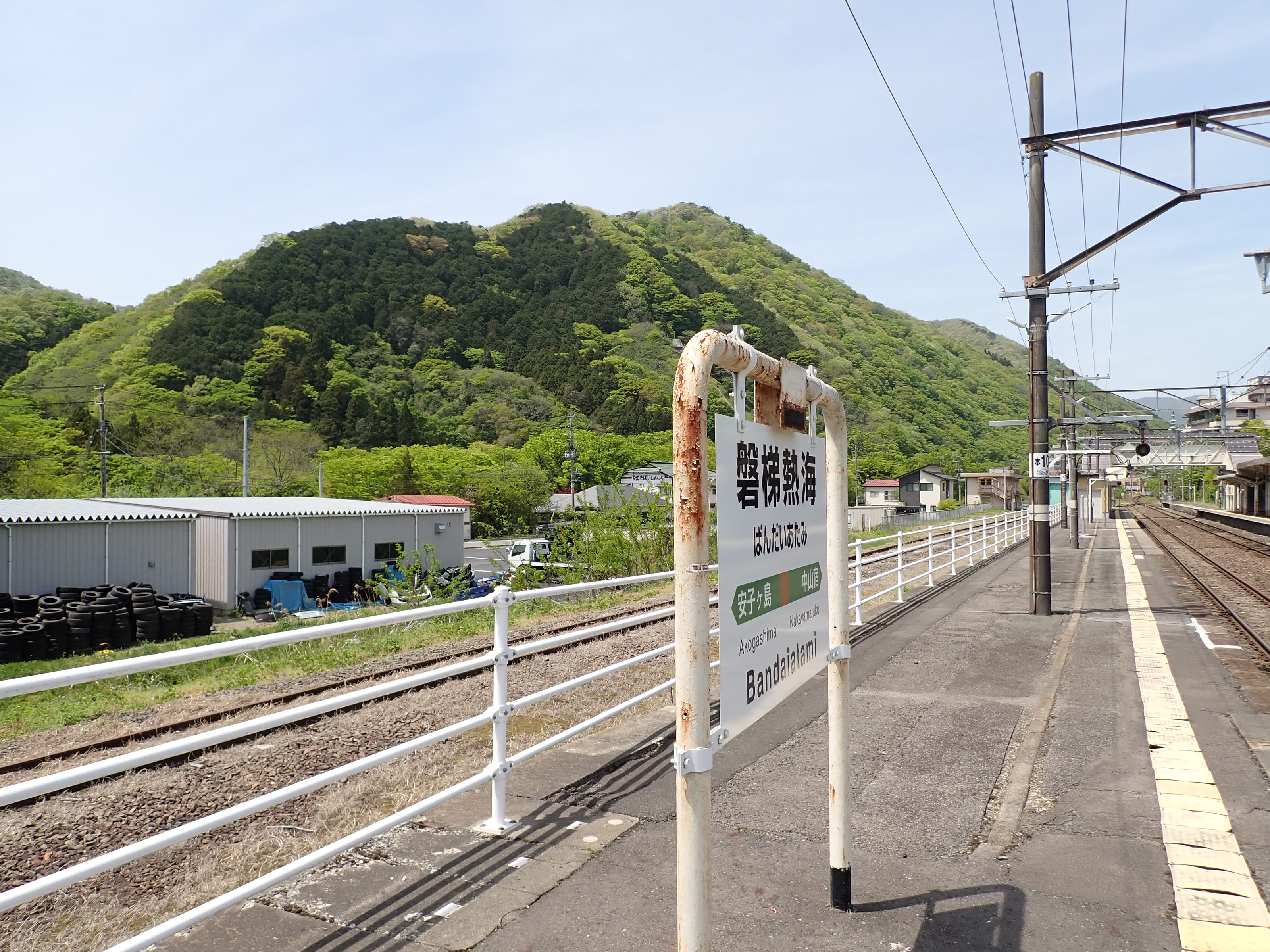 会津若松駅から来ると、この駅近くから開けてきて、この駅を過ぎると急激に広がってくる印象です。駅のそばに磐梯熱海温泉の温泉街が少しありますが、さらに中山宿駅側に進んだ五百川沿いに温泉街が広がっています。跨線橋が印象的な駅です。
