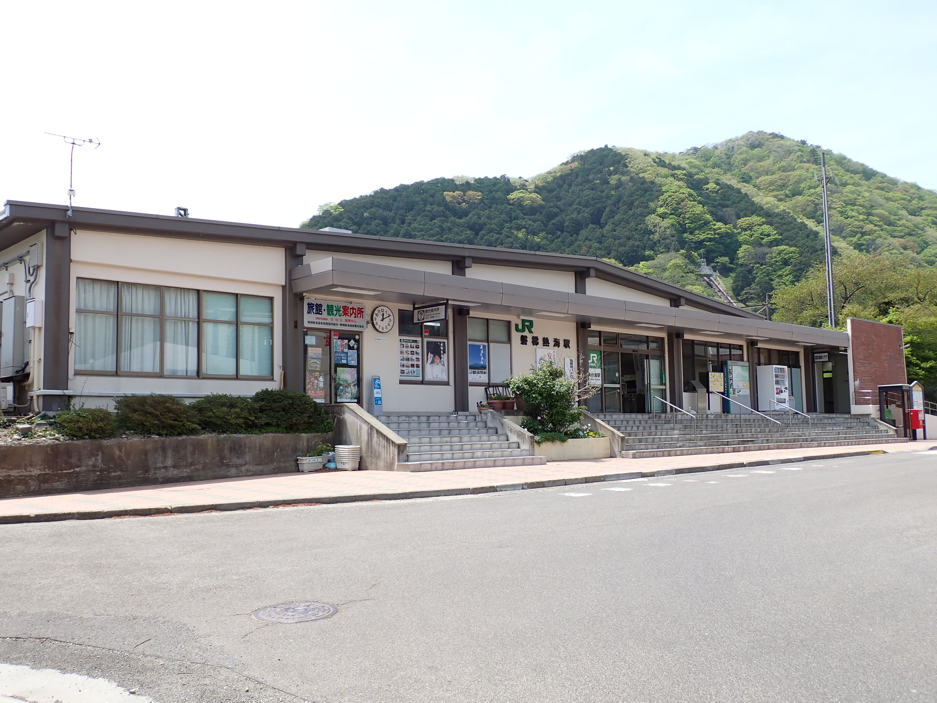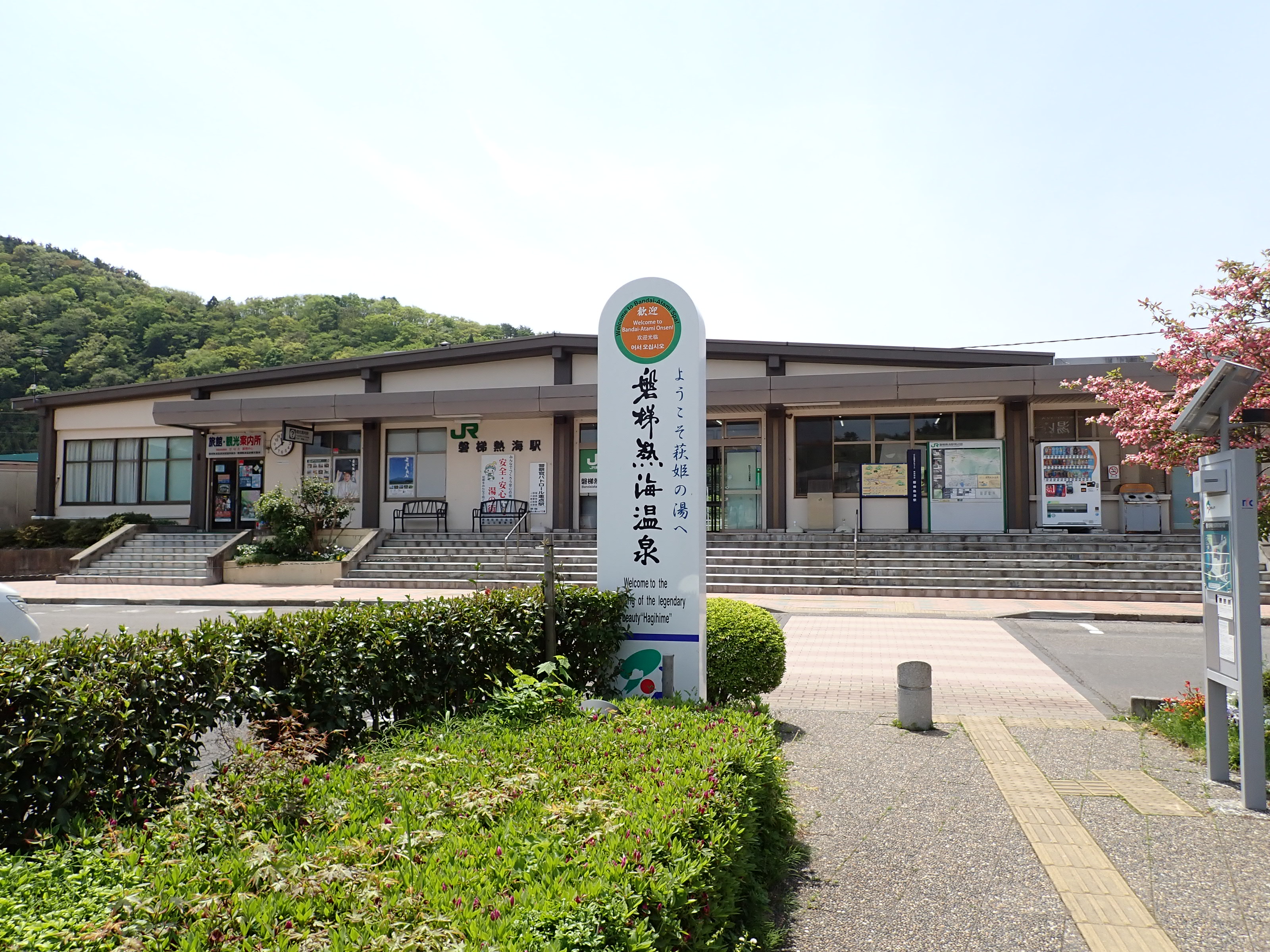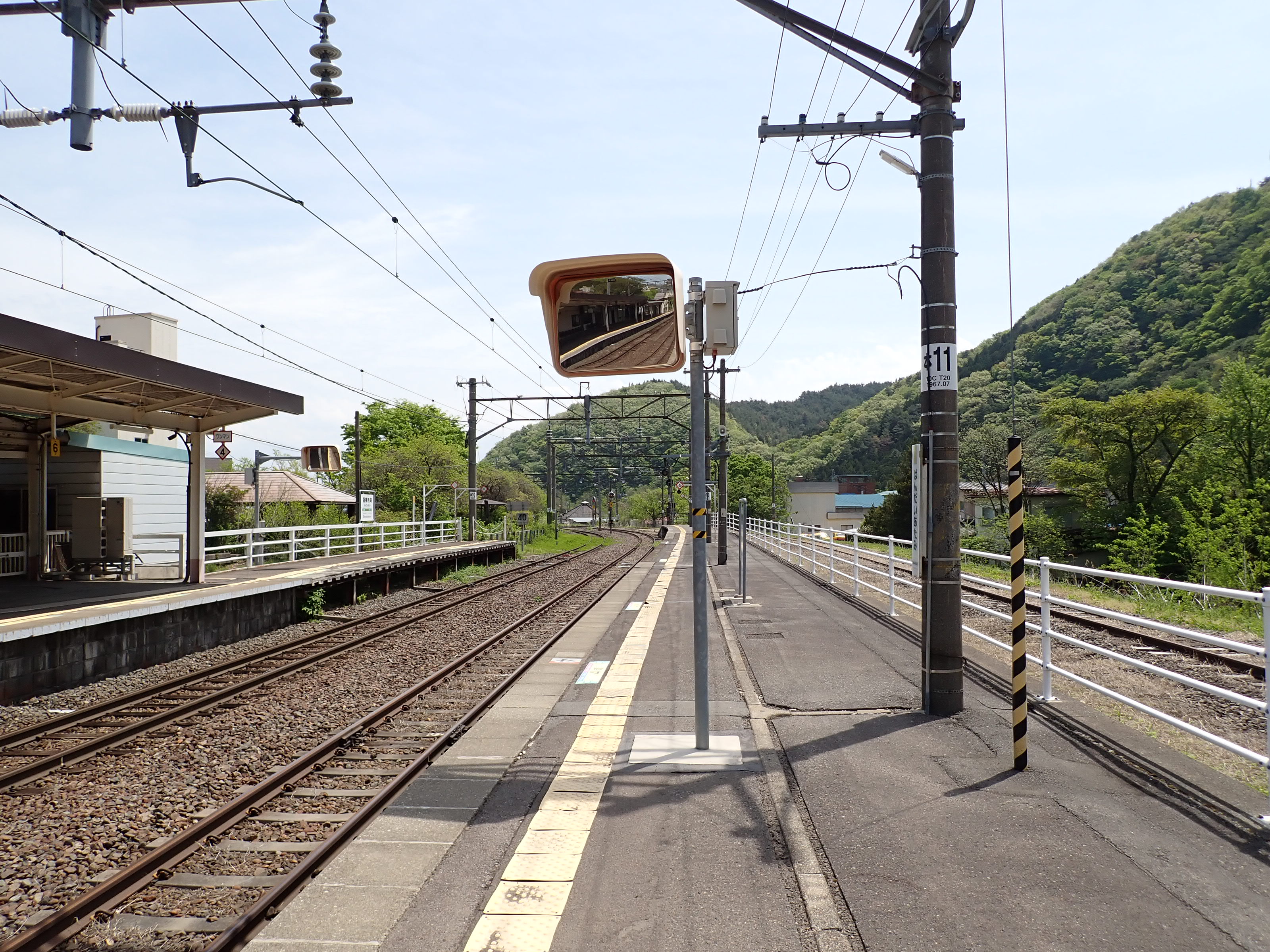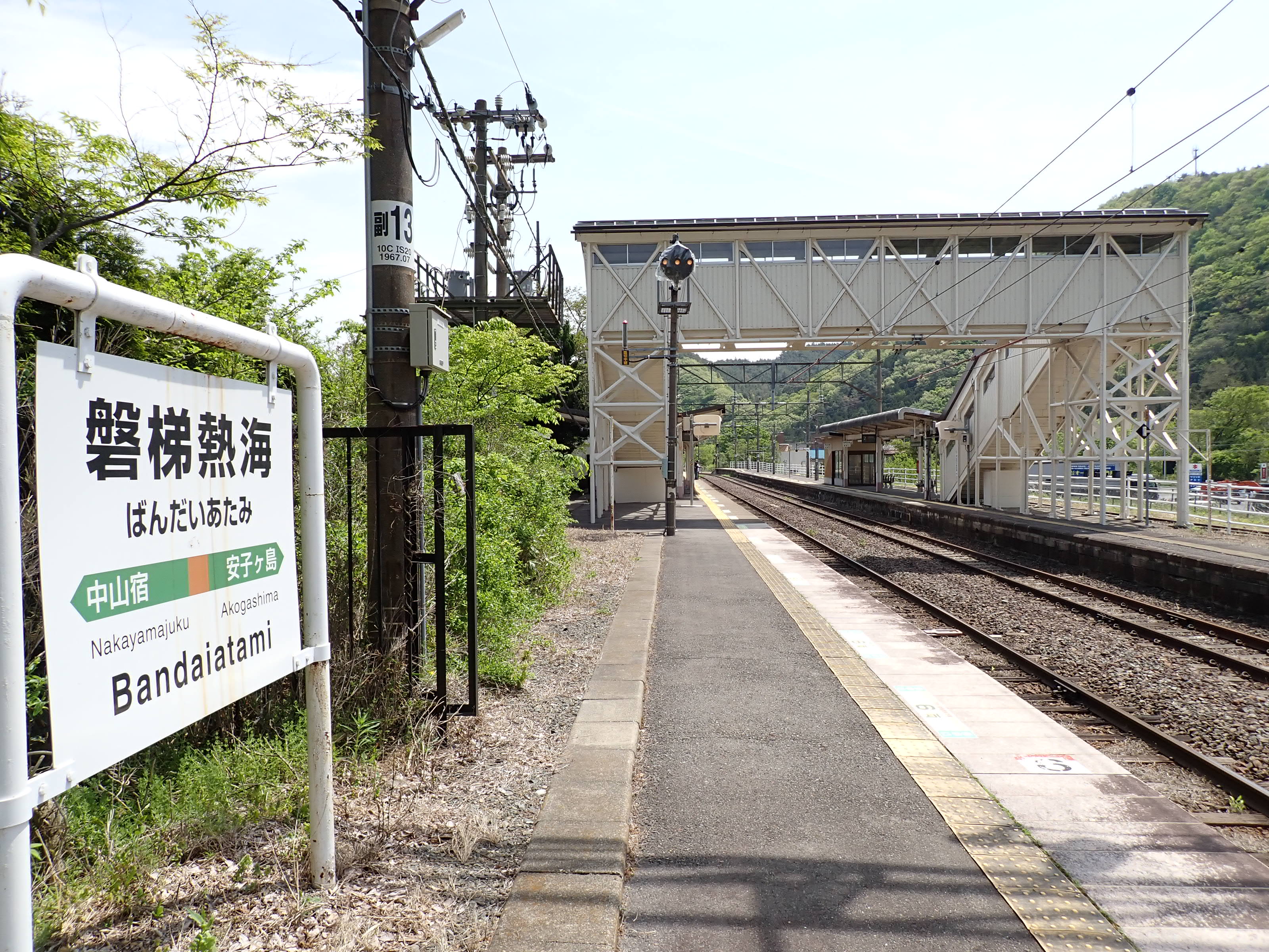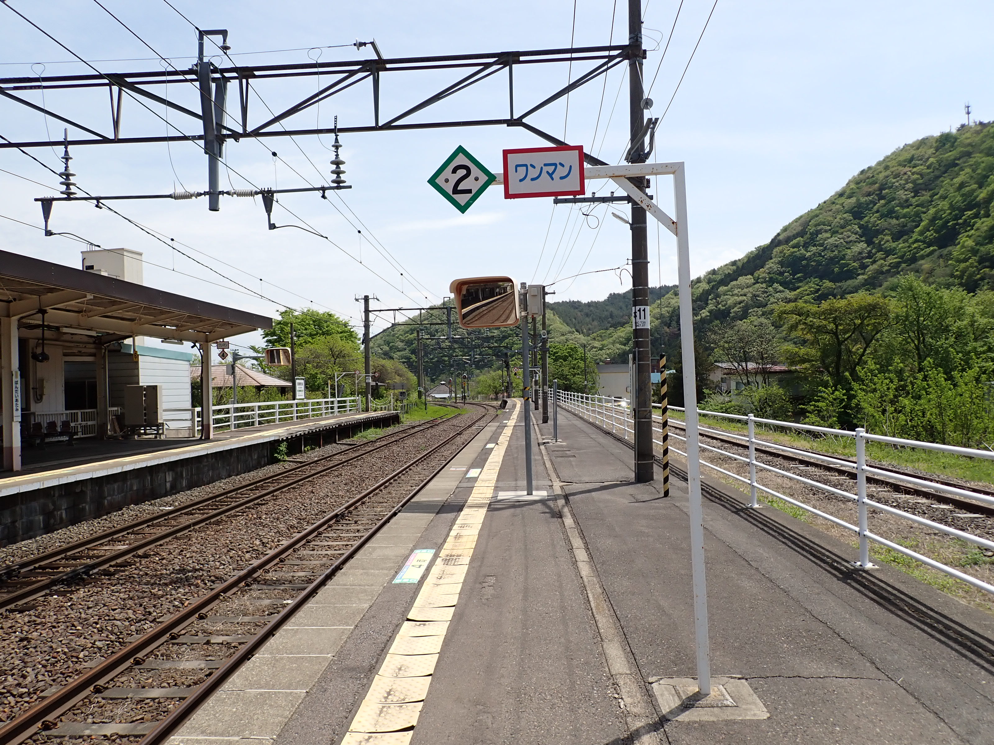 会津若松駅から来ると、この駅近くから開けてきて、この駅を過ぎると急激に広がってくる印象です。駅のそばに磐梯熱海温泉の温泉街が少しありますが、さらに中山宿駅側に進んだ五百川沿いに温泉街が広がっています。跨線橋が印象的な駅です。