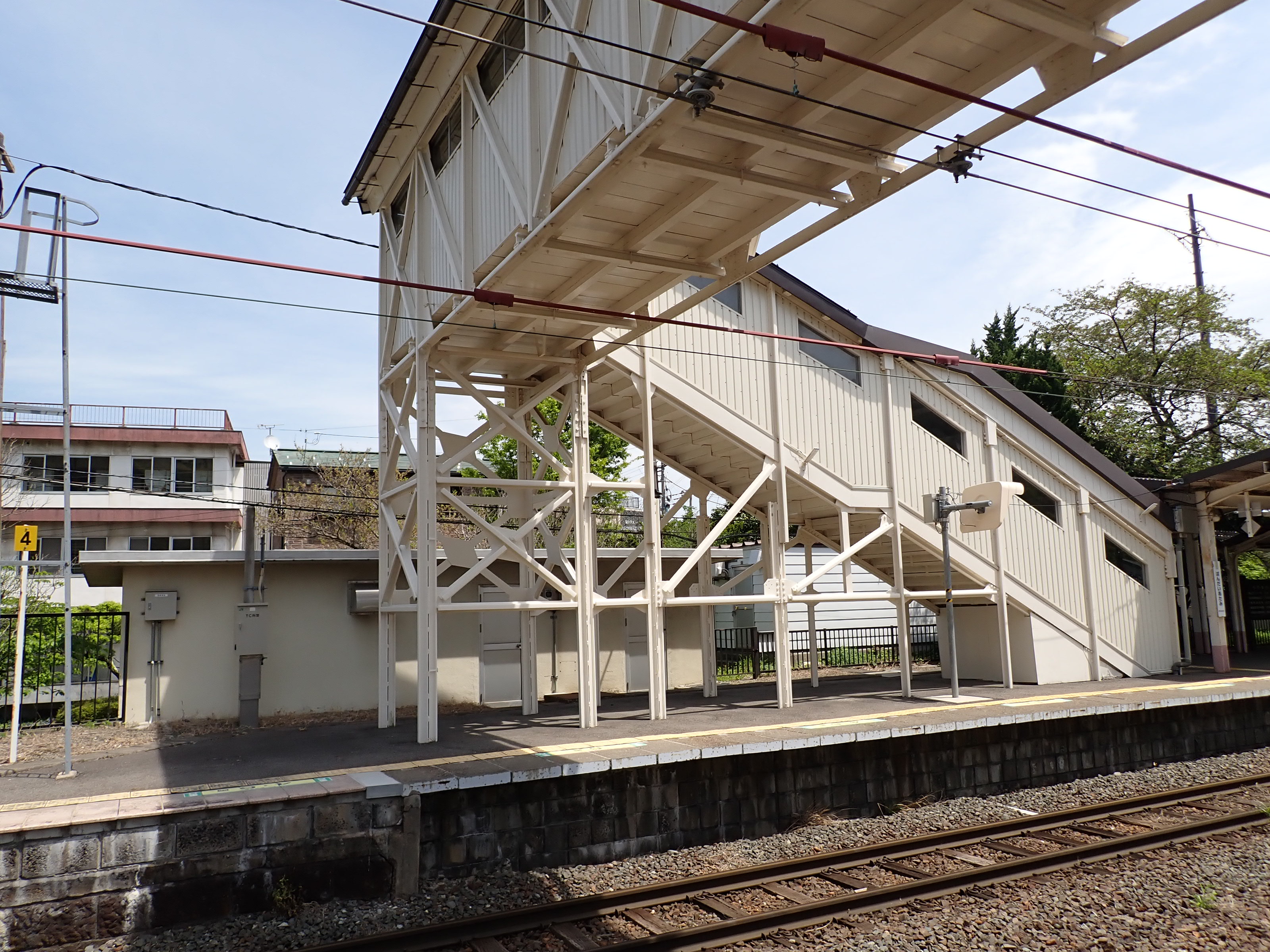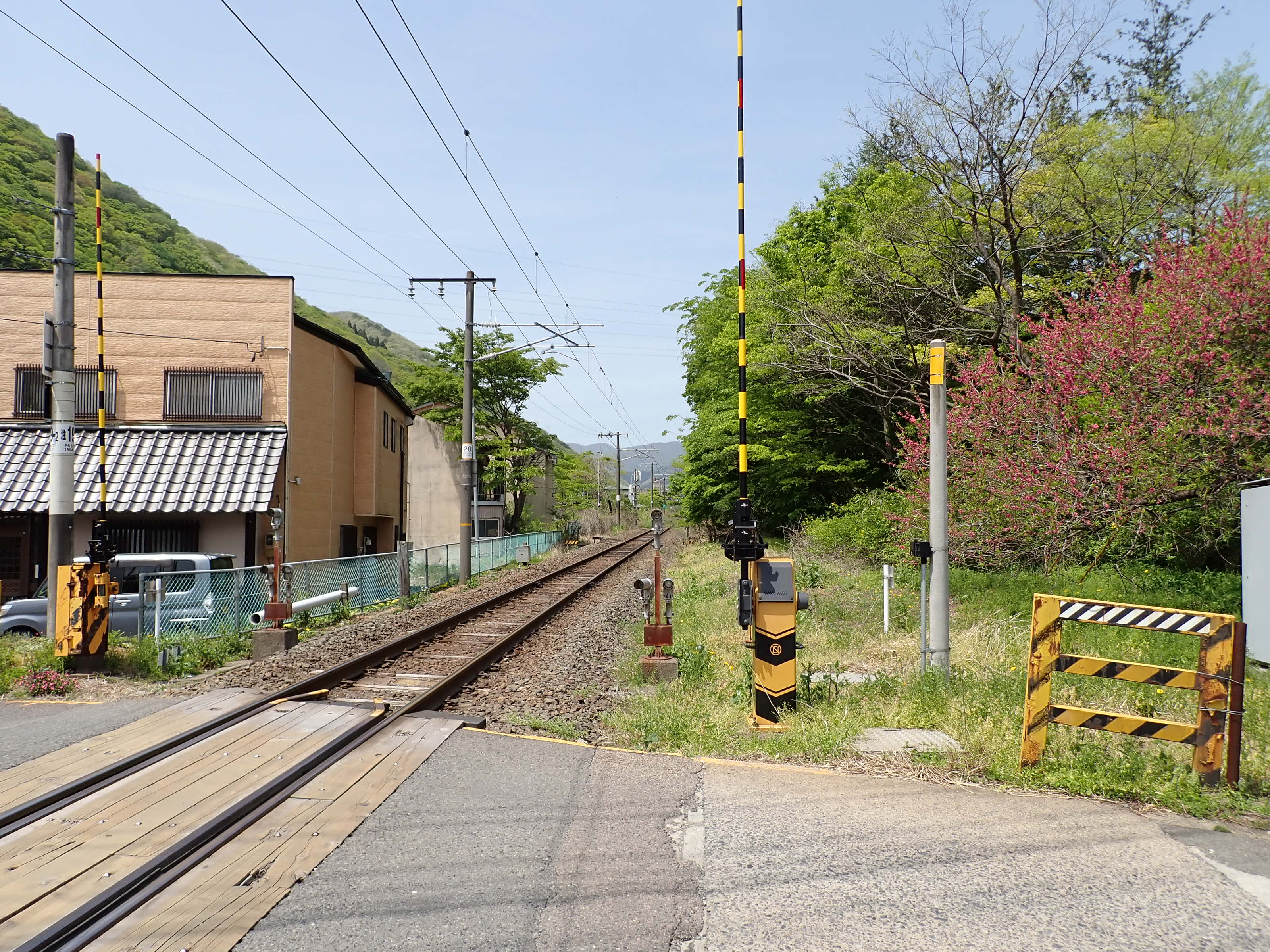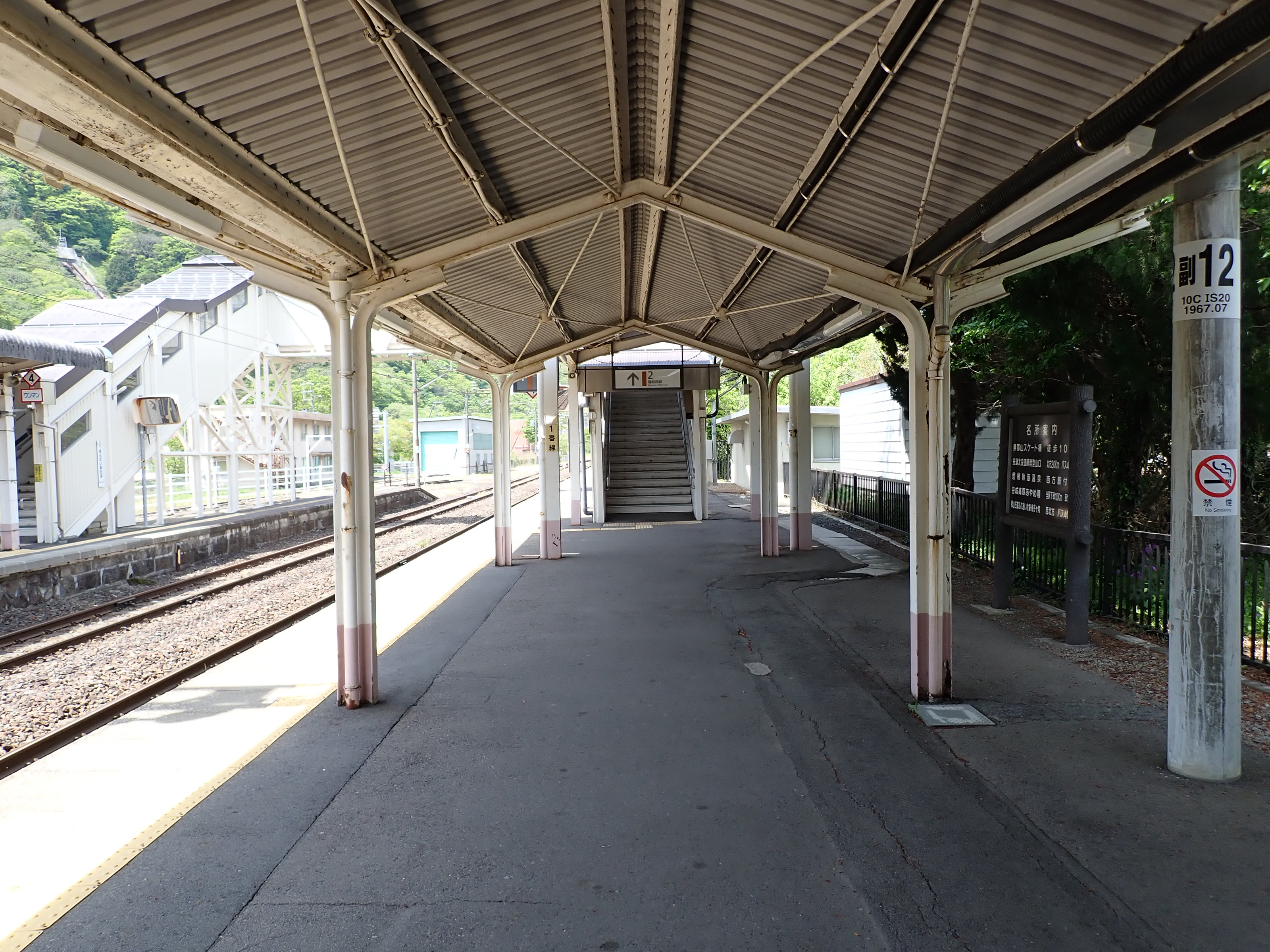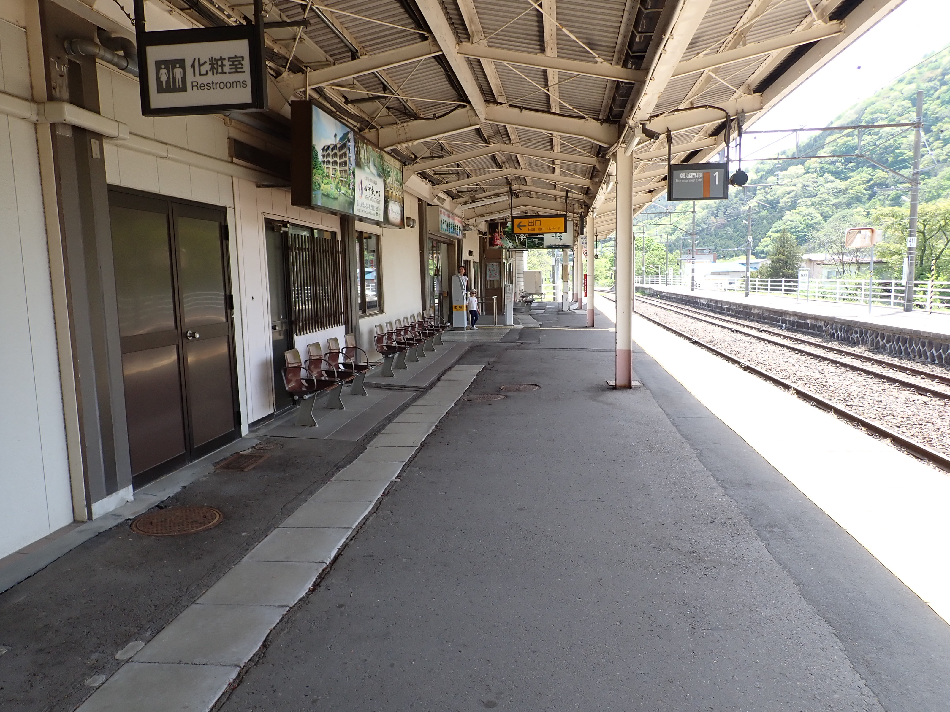 会津若松駅から来ると、この駅近くから開けてきて、この駅を過ぎると急激に広がってくる印象です。駅のそばに磐梯熱海温泉の温泉街が少しありますが、さらに中山宿駅側に進んだ五百川沿いに温泉街が広がっています。跨線橋が印象的な駅です。