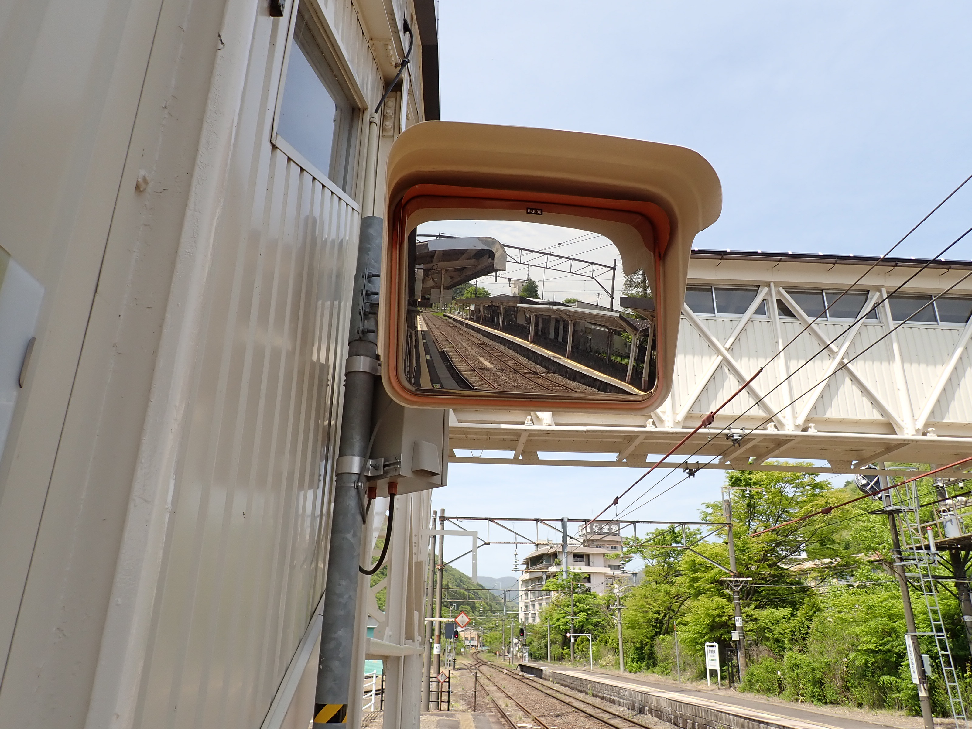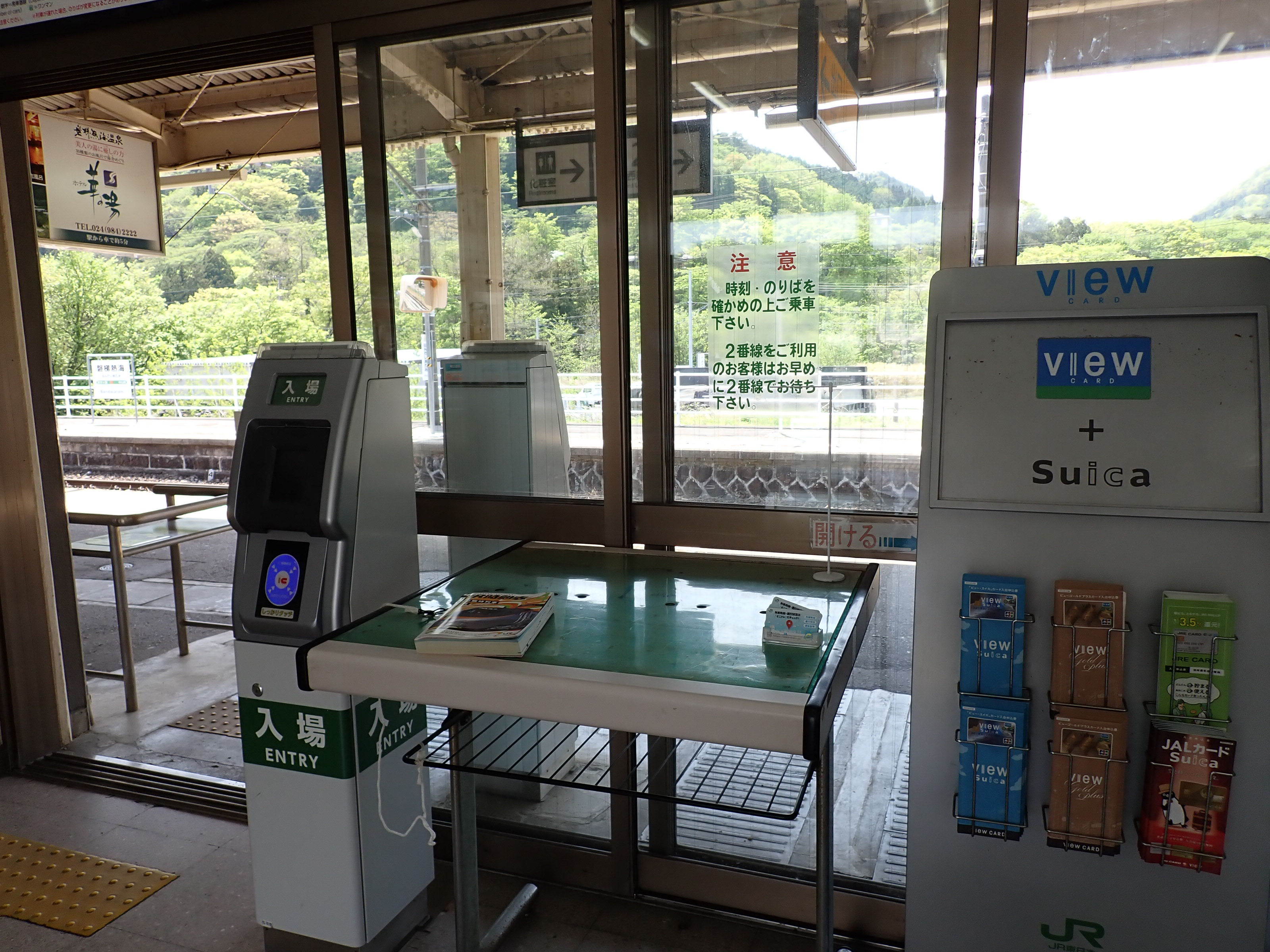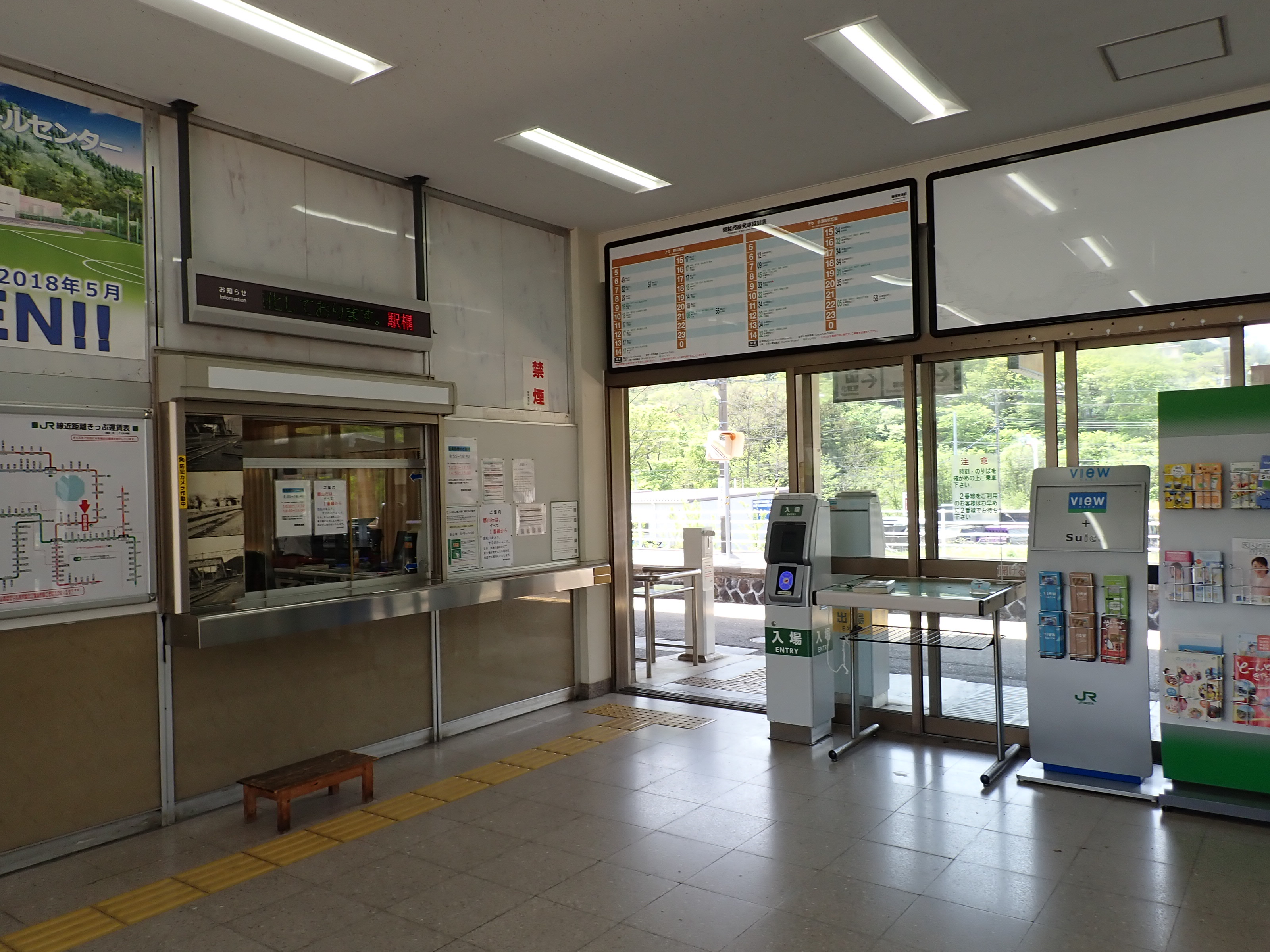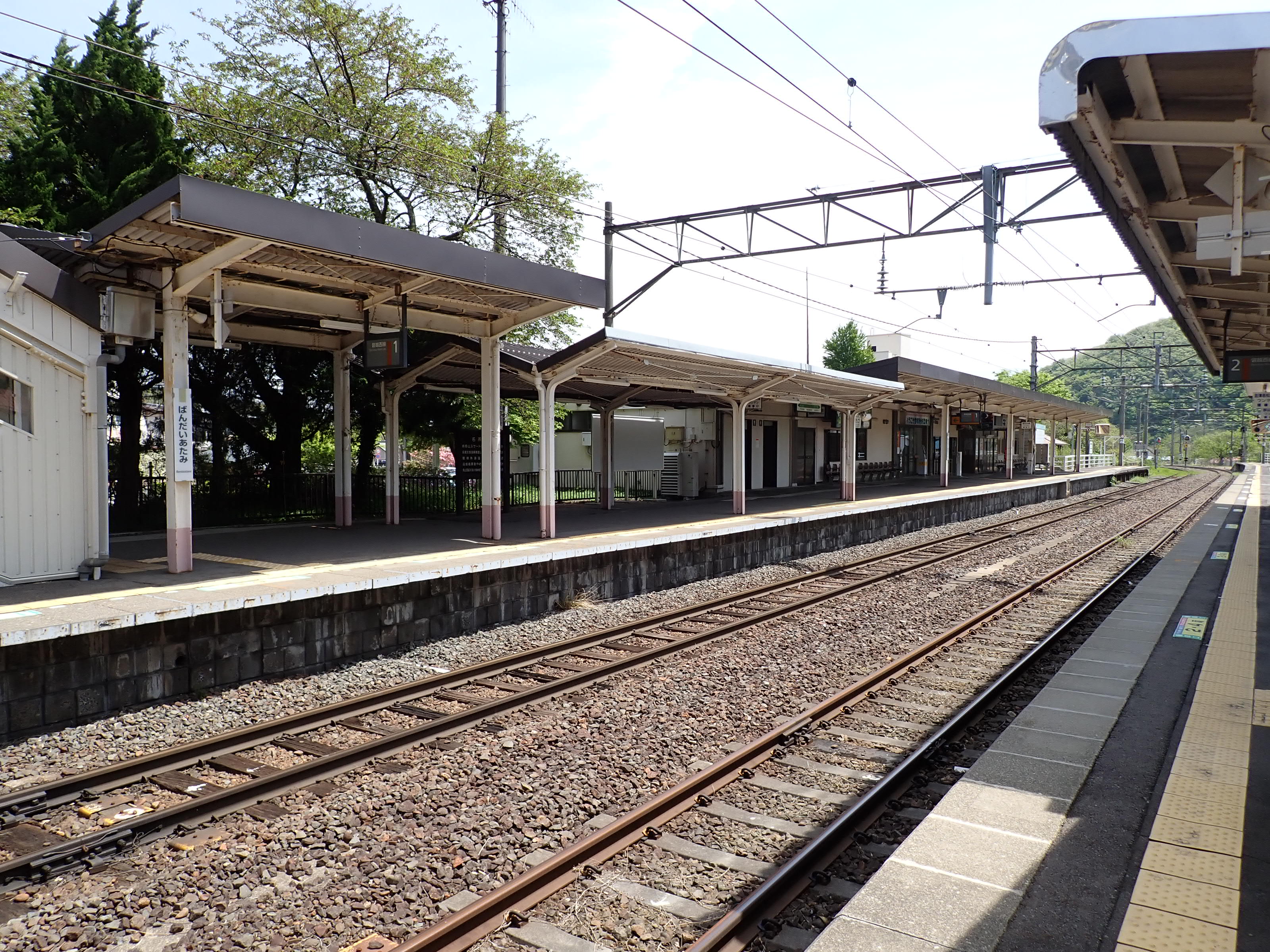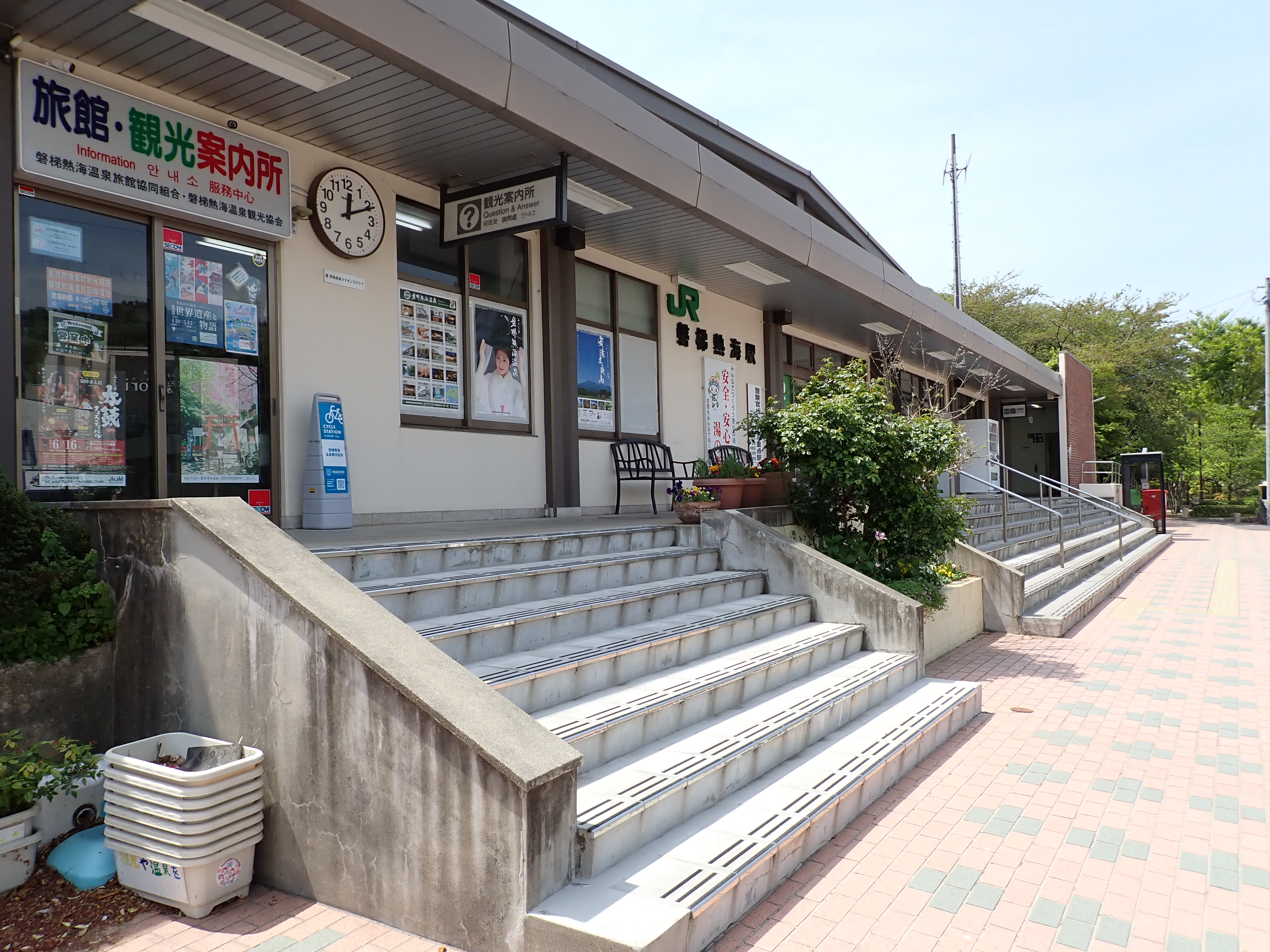 会津若松駅から来ると、この駅近くから開けてきて、この駅を過ぎると急激に広がってくる印象です。駅のそばに磐梯熱海温泉の温泉街が少しありますが、さらに中山宿駅側に進んだ五百川沿いに温泉街が広がっています。跨線橋が印象的な駅です。