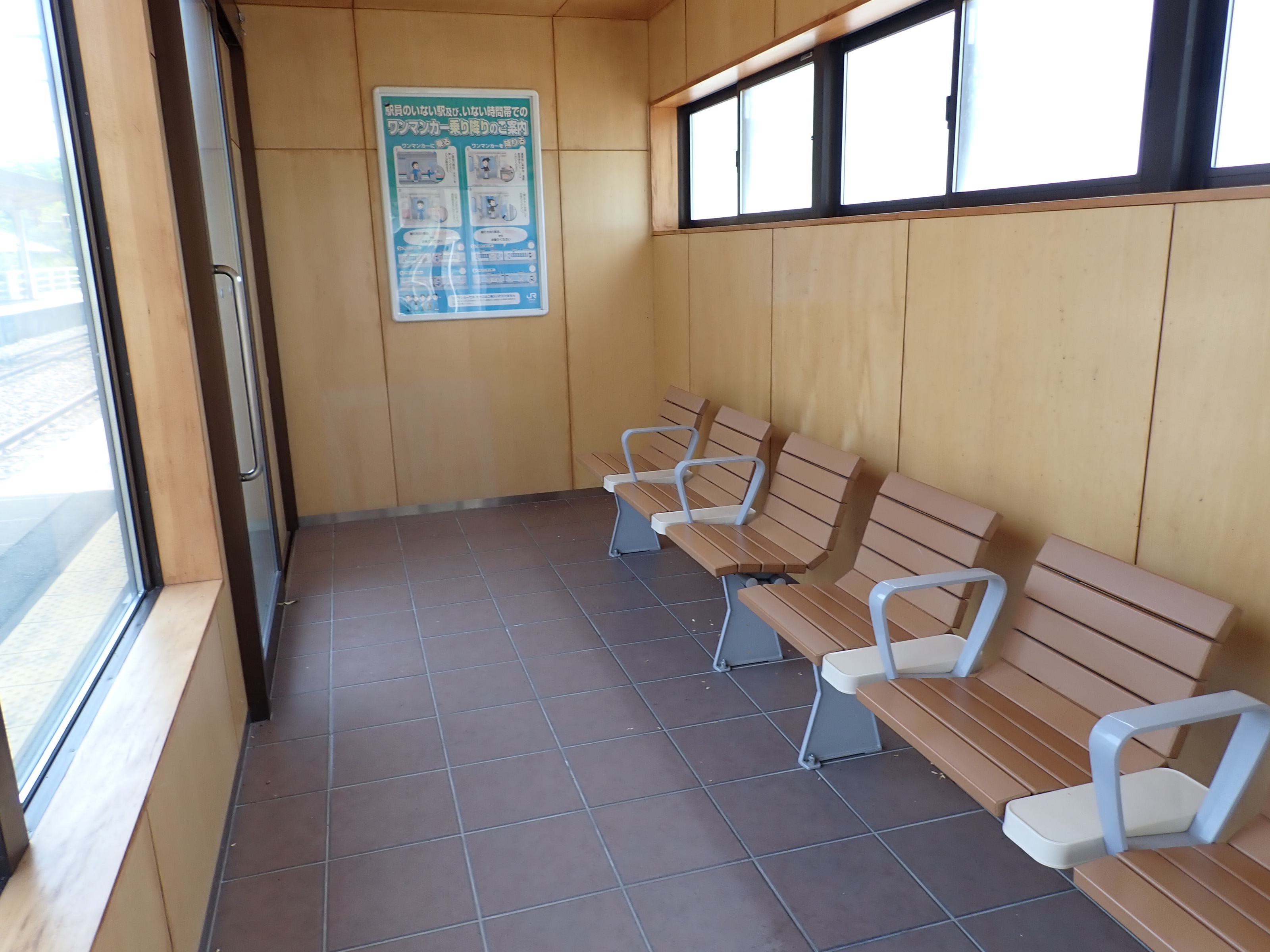2番線の待合室とその付近の乗車位置案内・柱の駅名標、待合室内の様子。