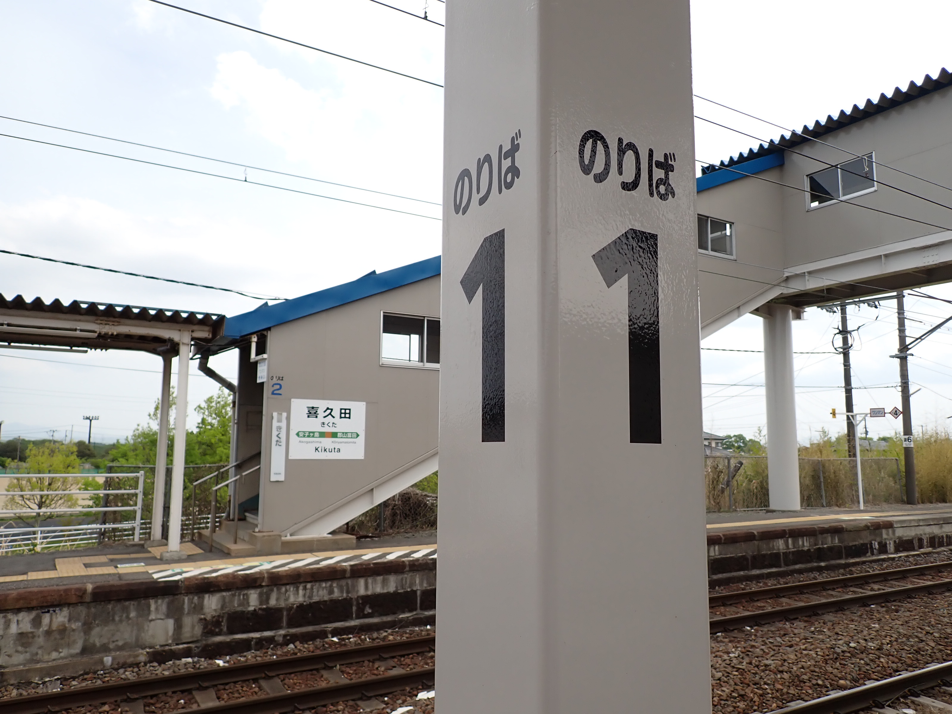 駅舎のホーム側、番線標と柱の駅名標。