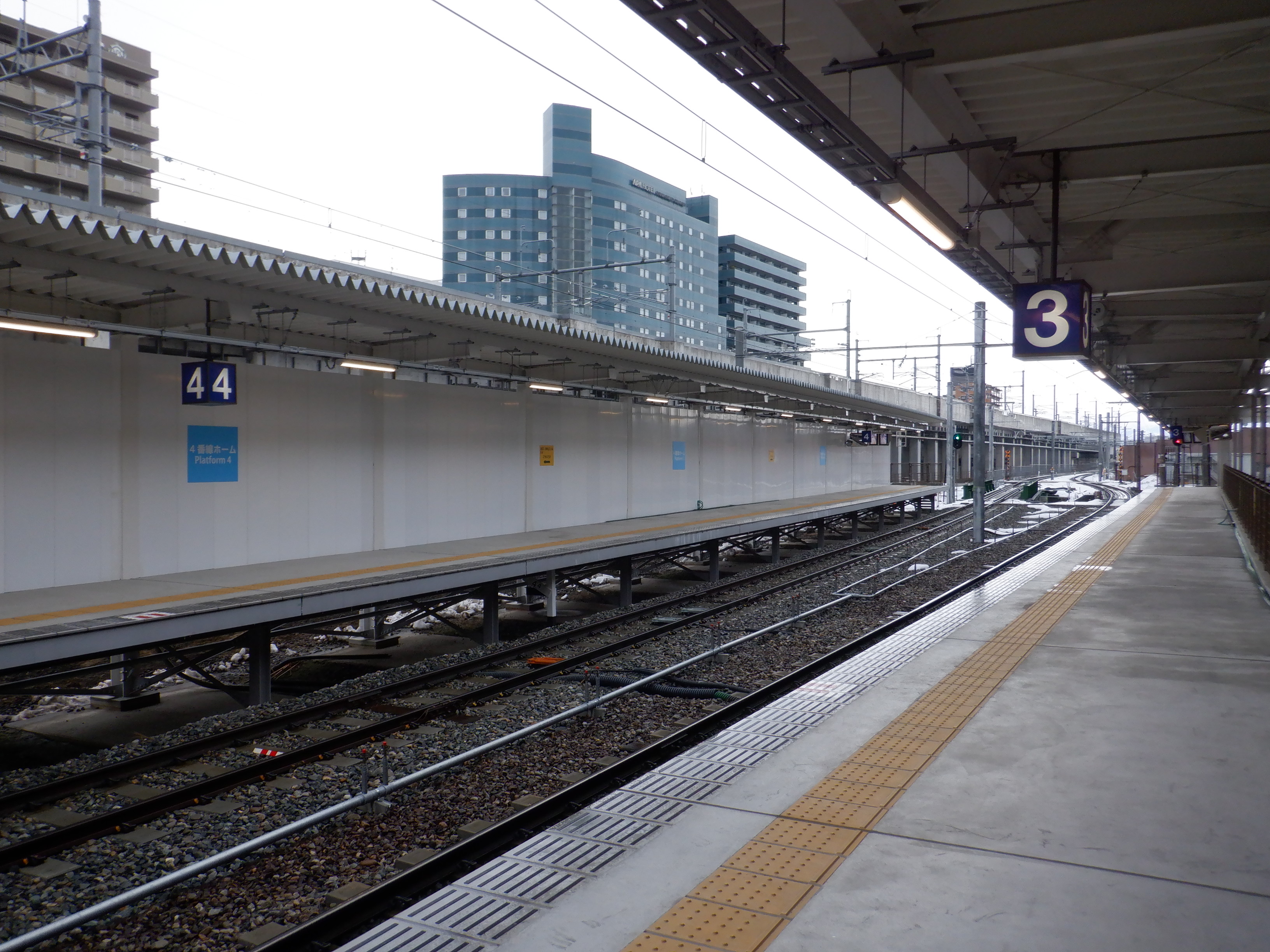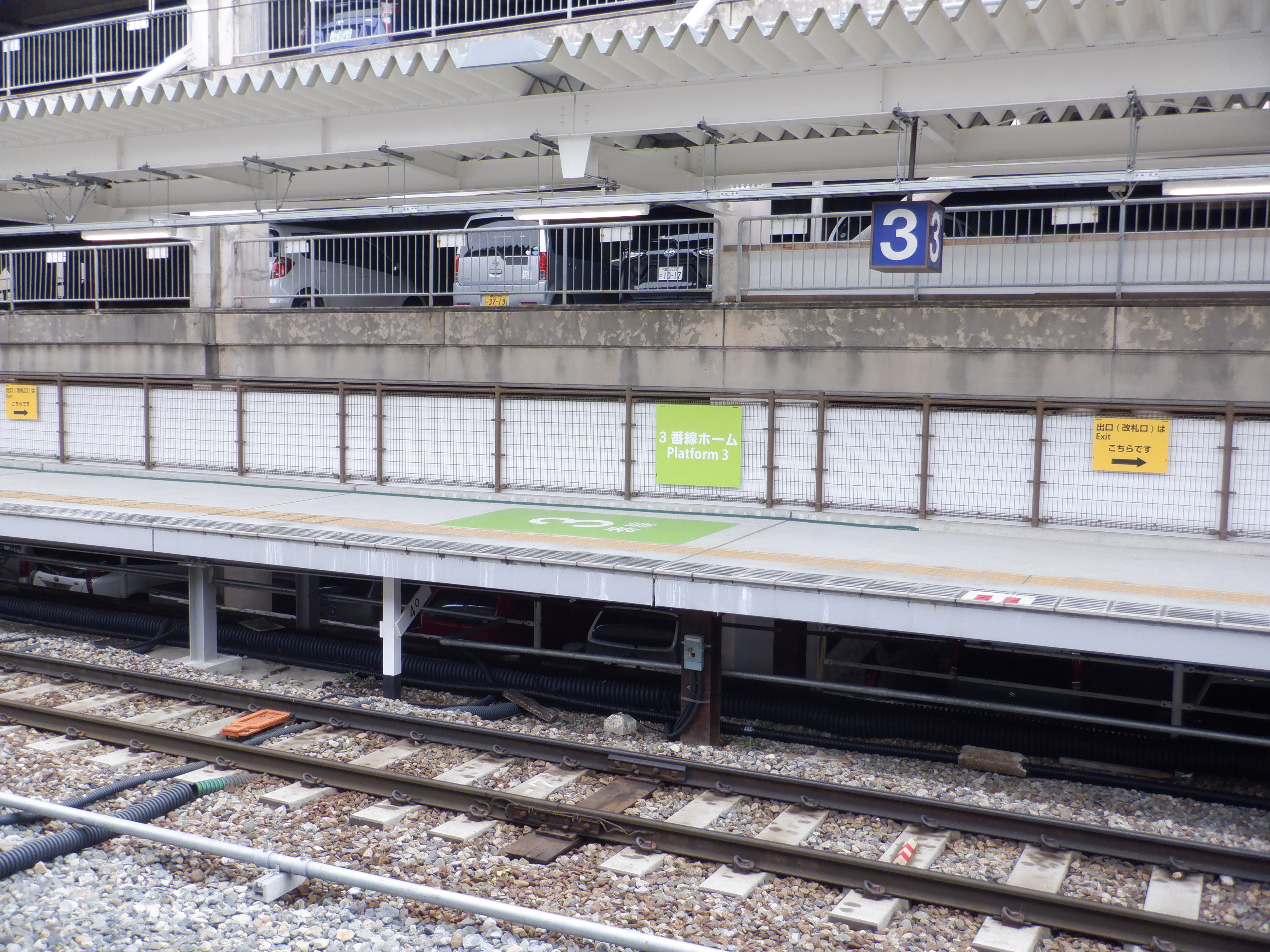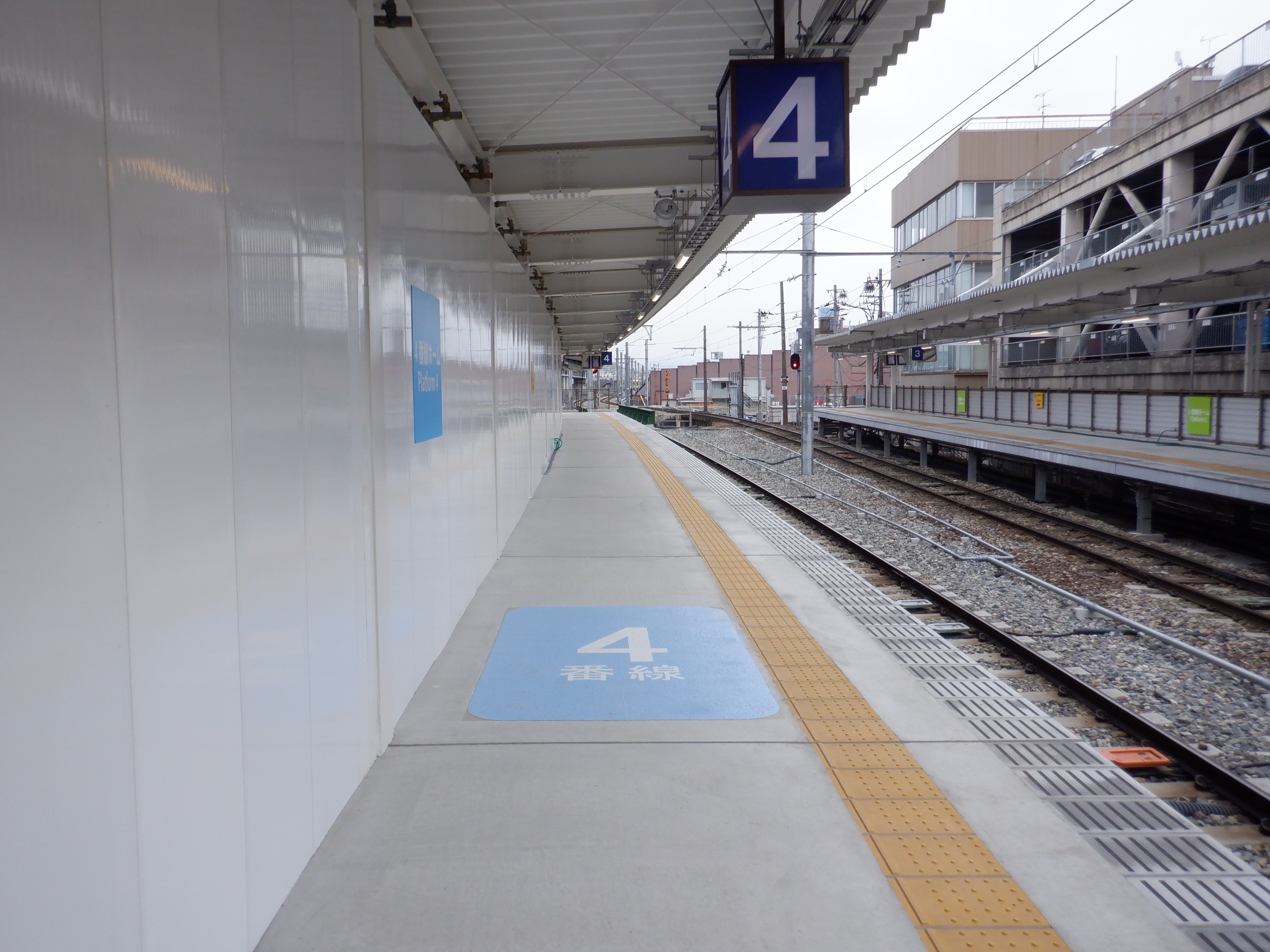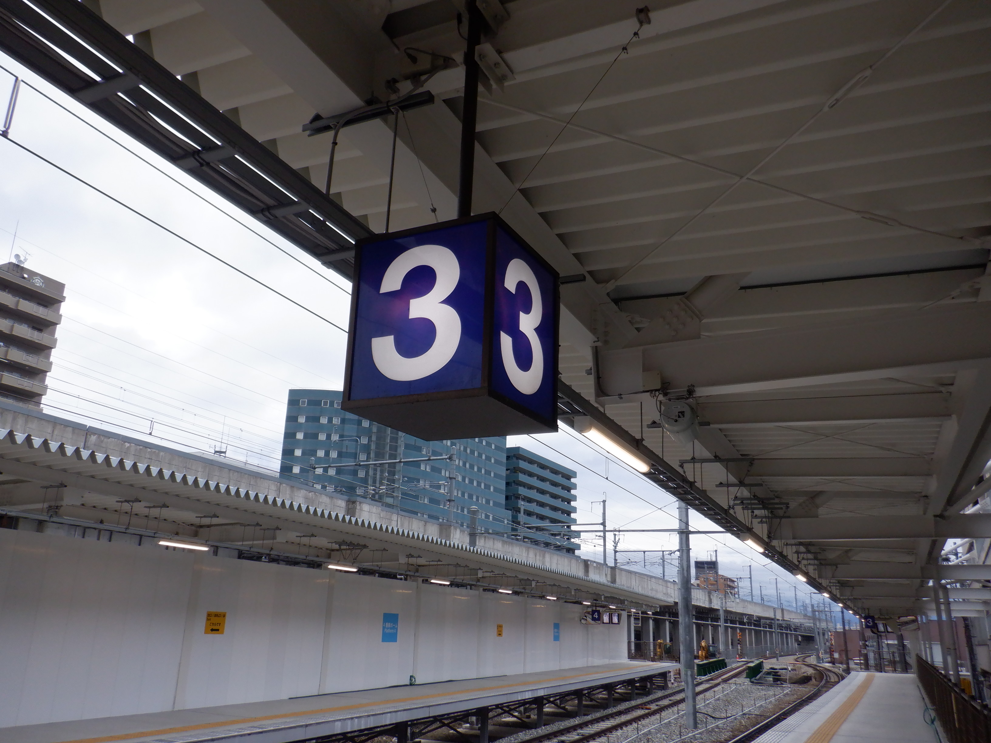 3番のりば、向こうに見える4番のりばは入口付近が立方体の番線標になりました。