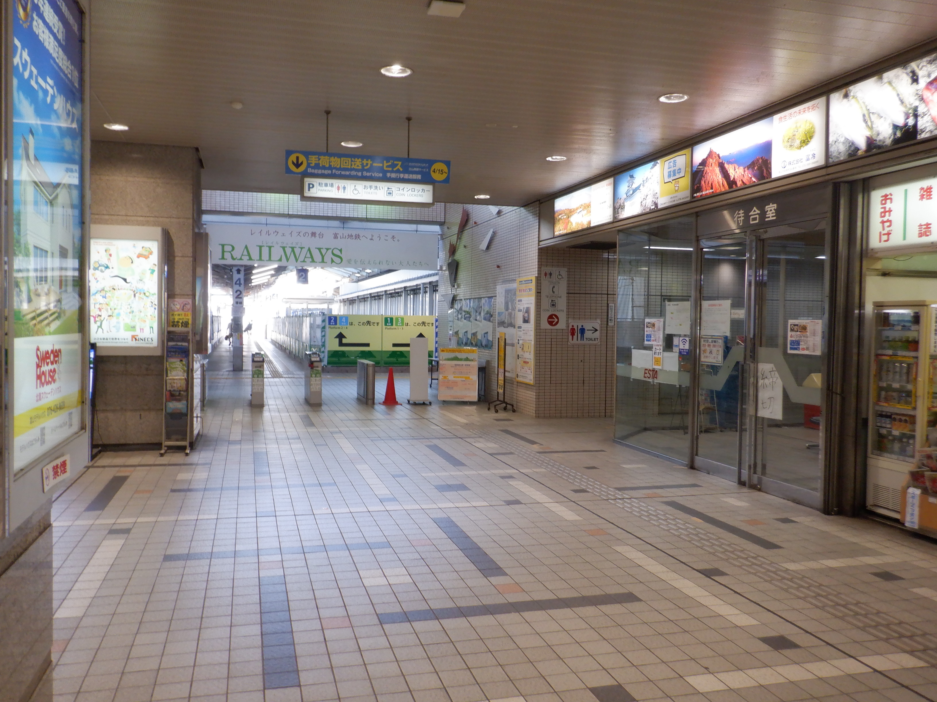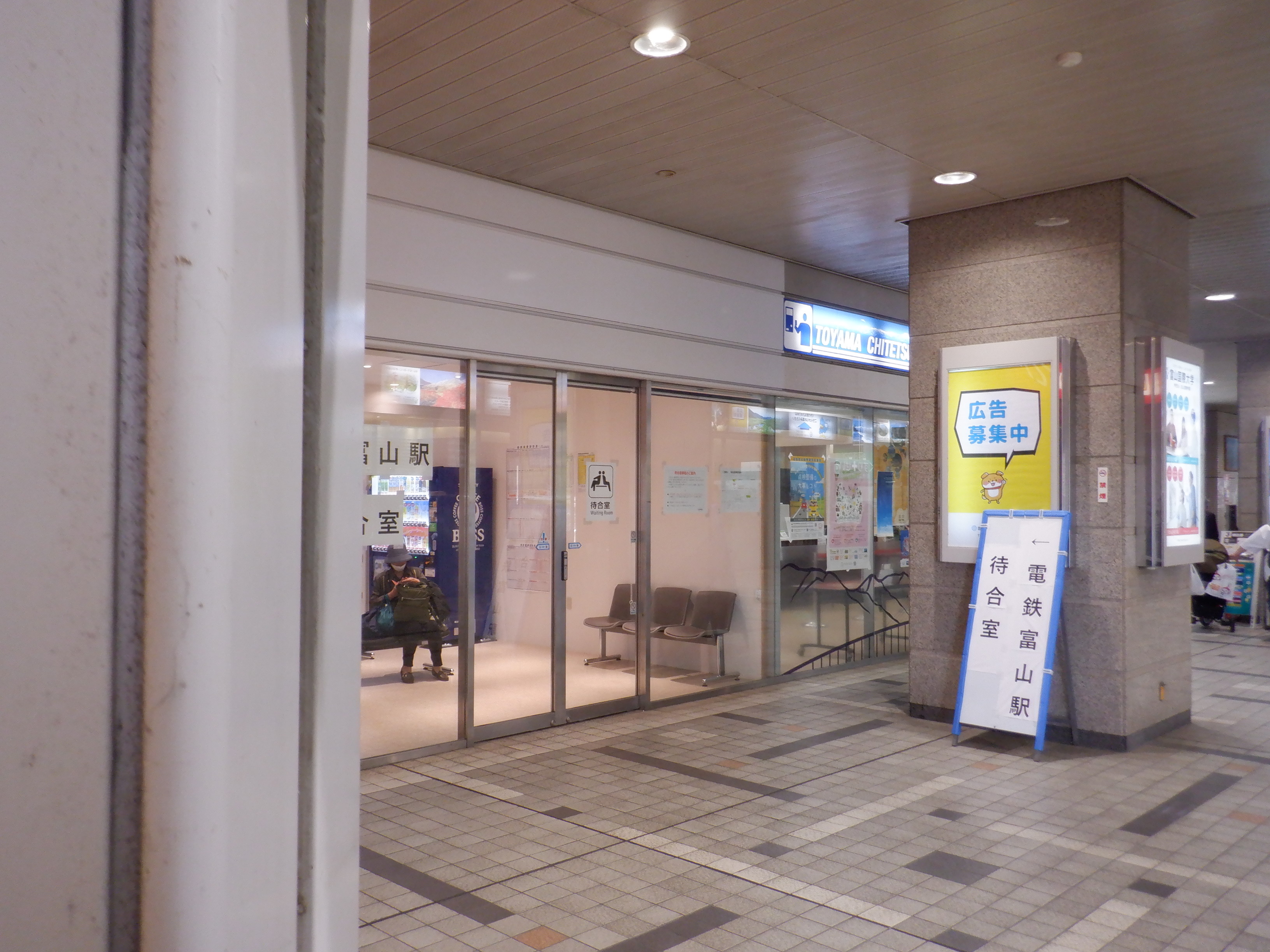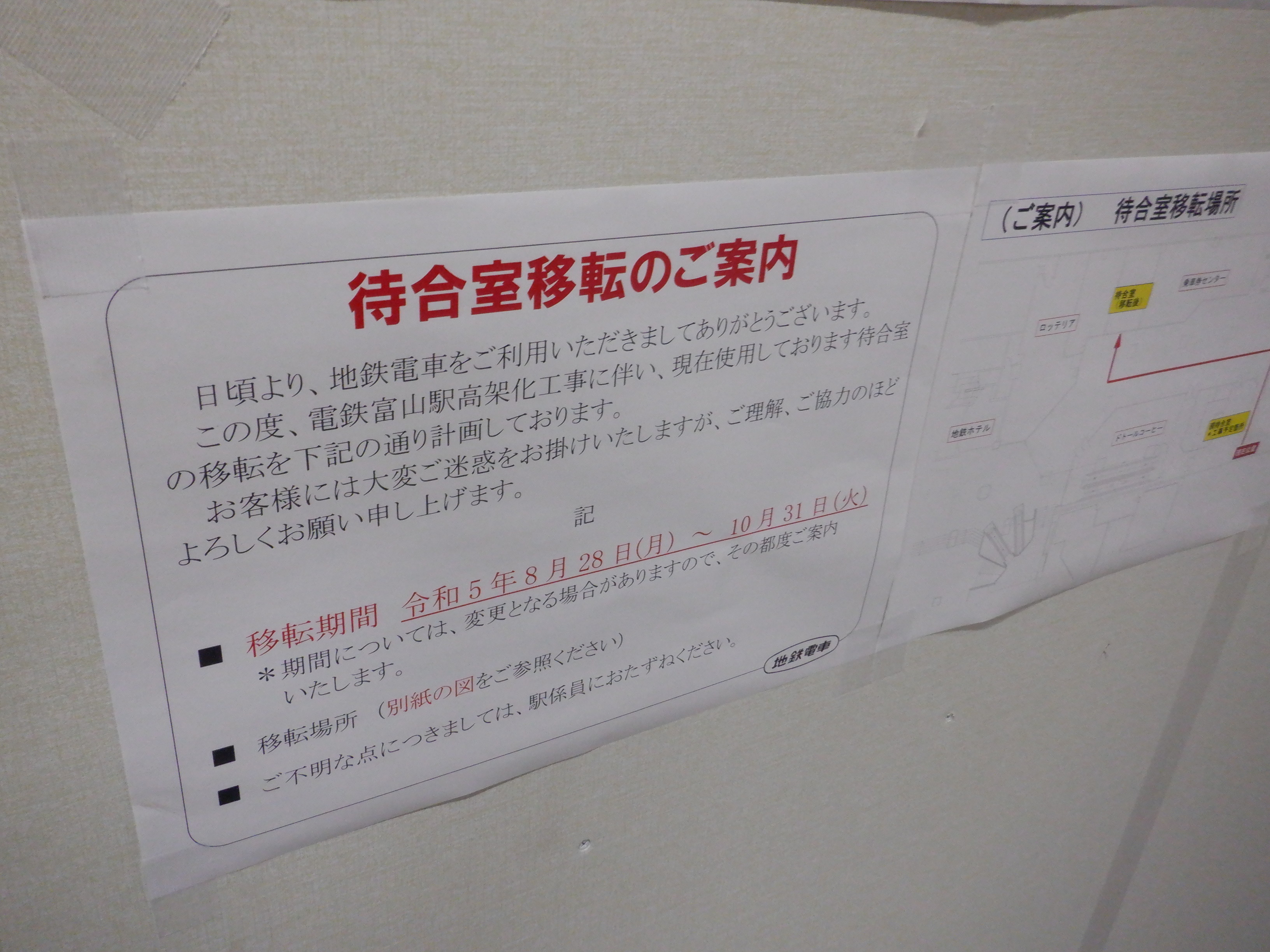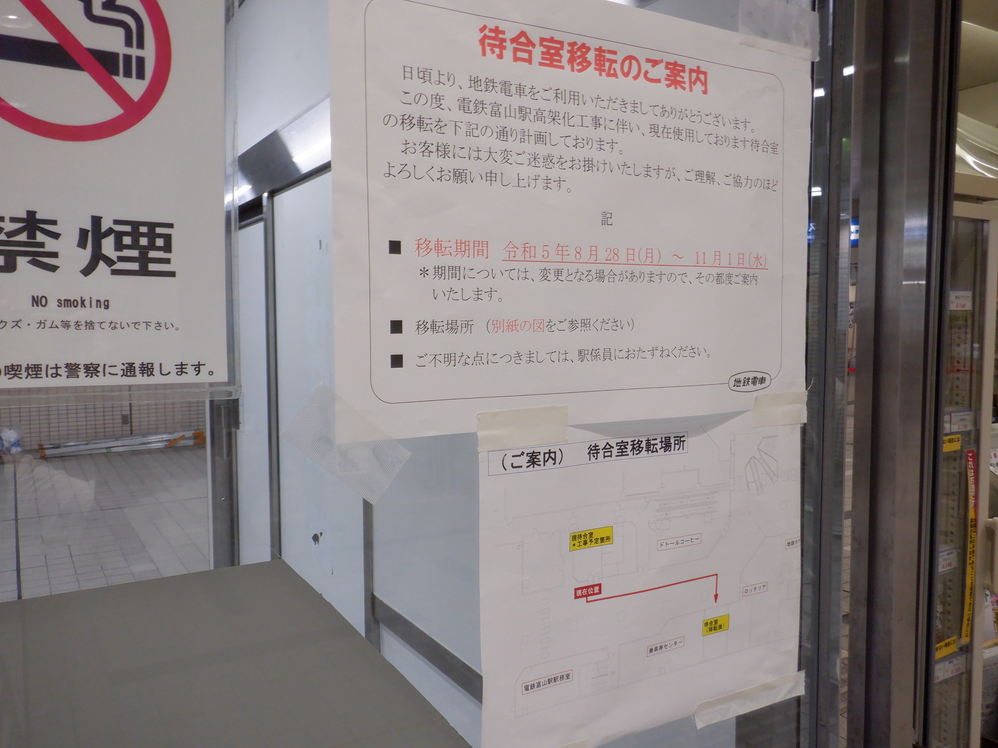 電鉄富山駅に入ってすぐのところの店舗跡が待合室になる旨の案内が貼られていました。