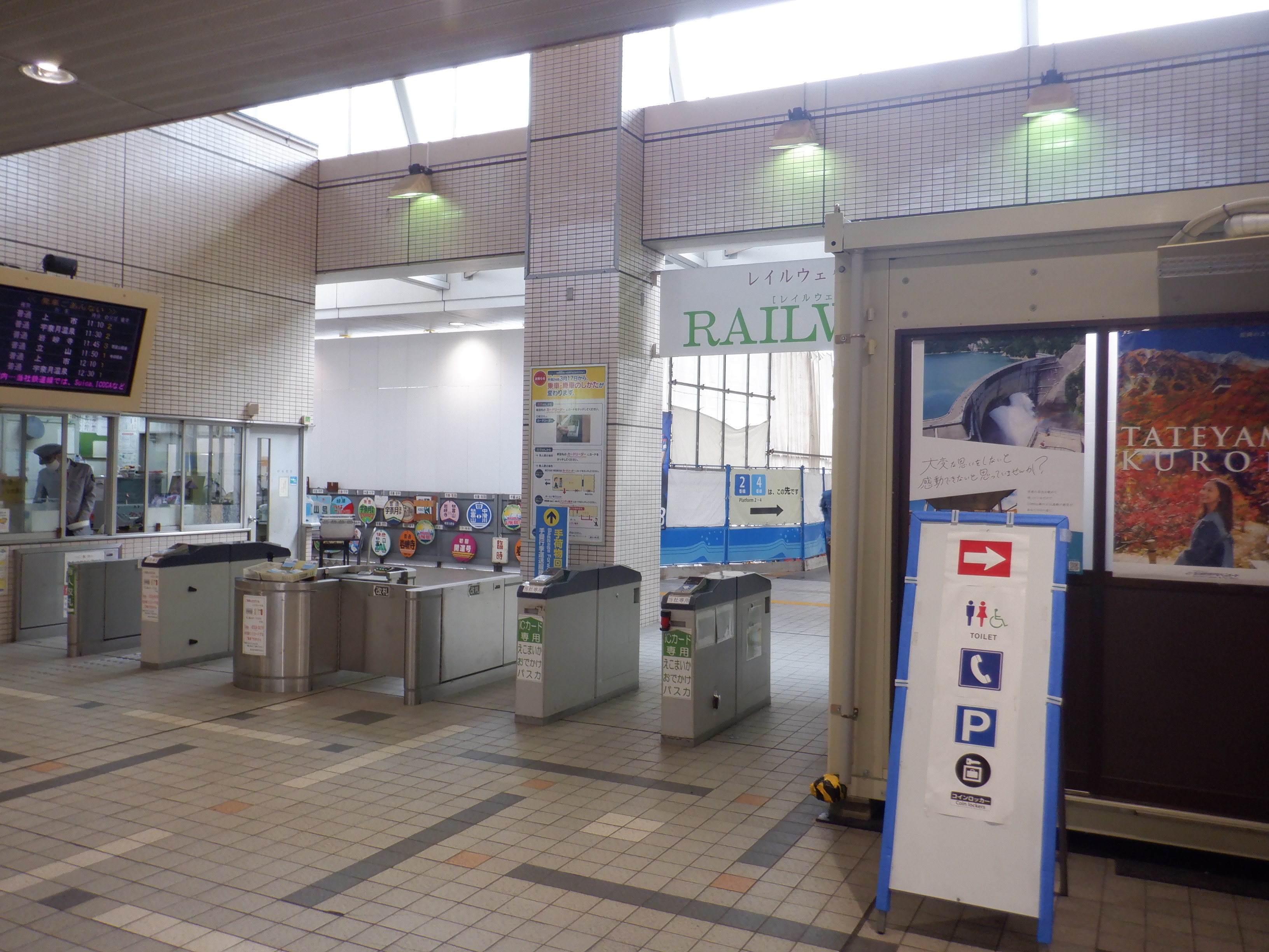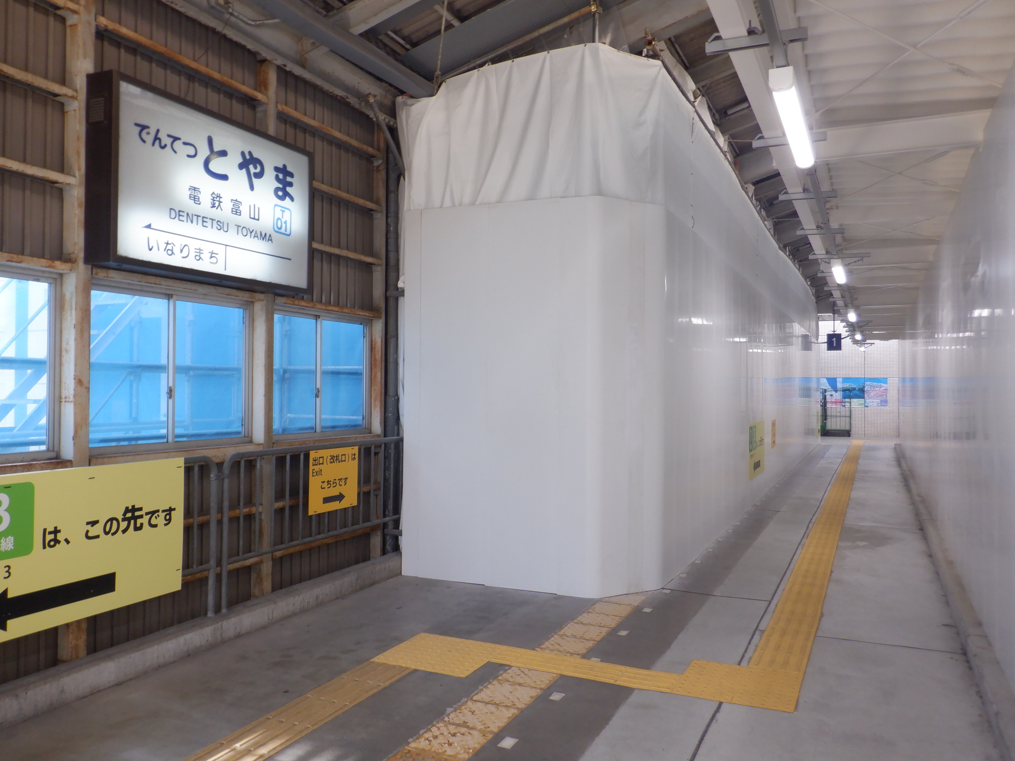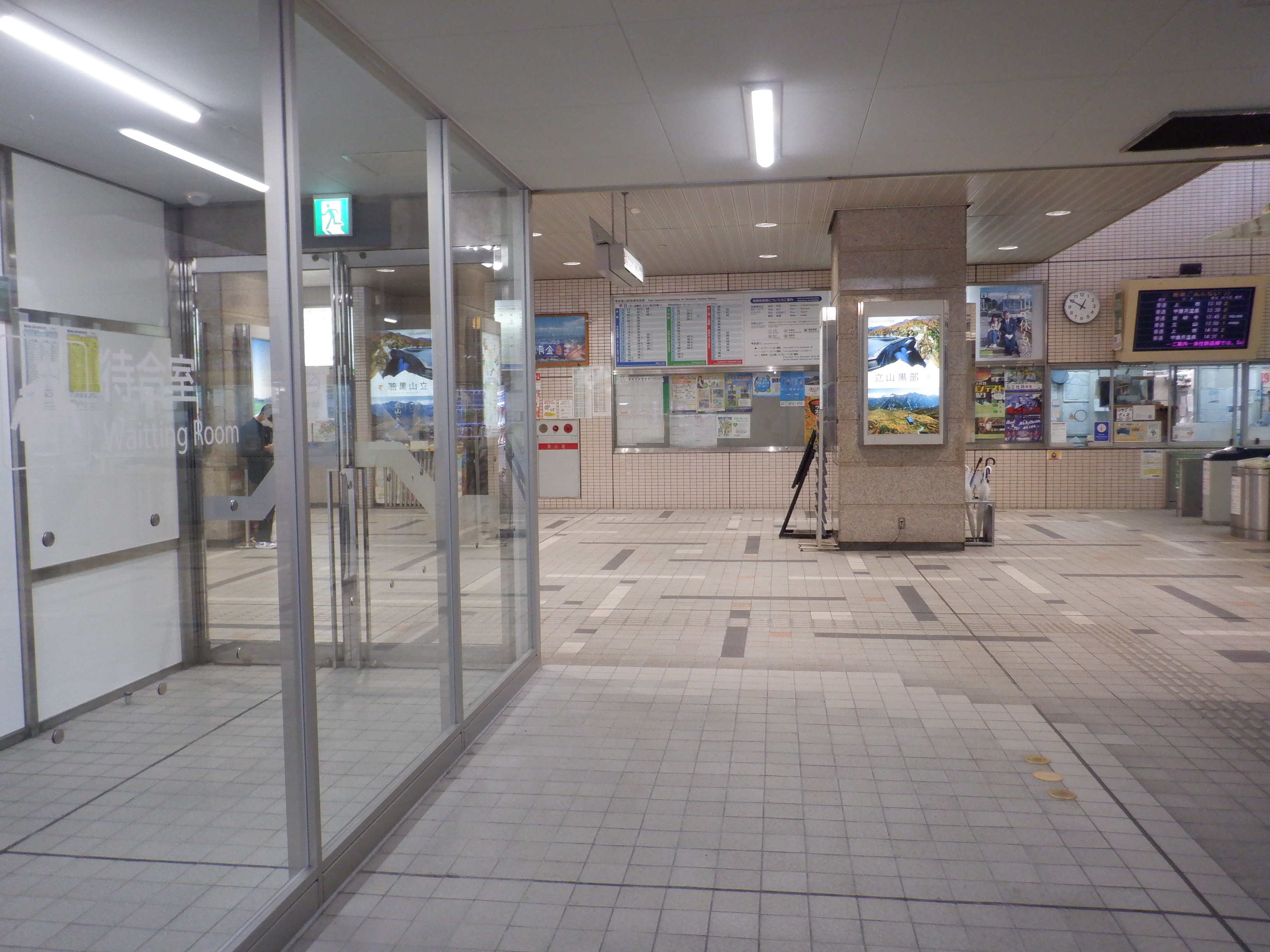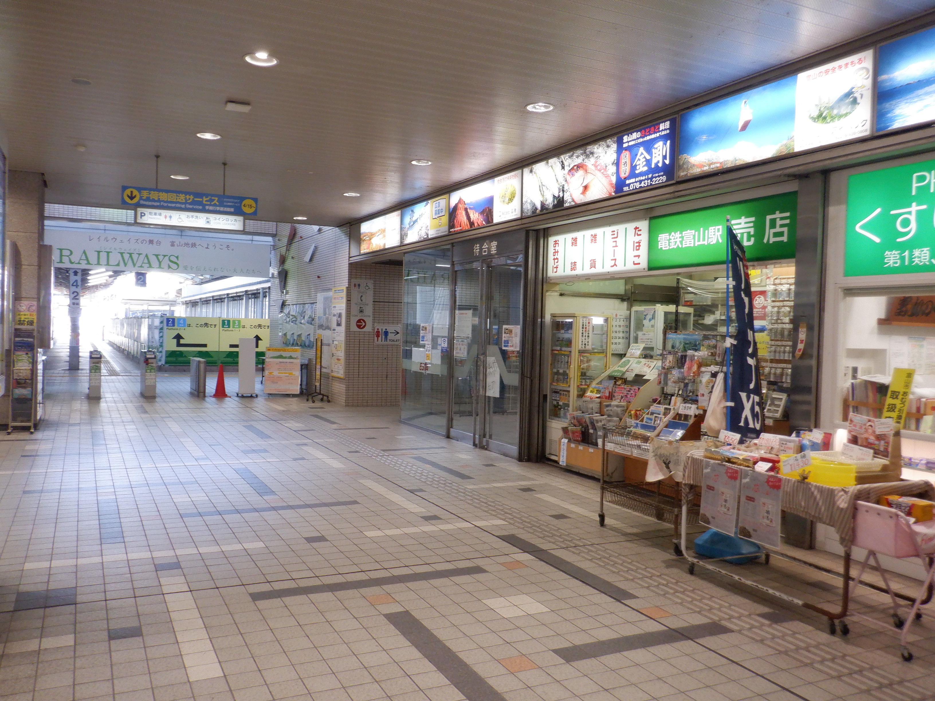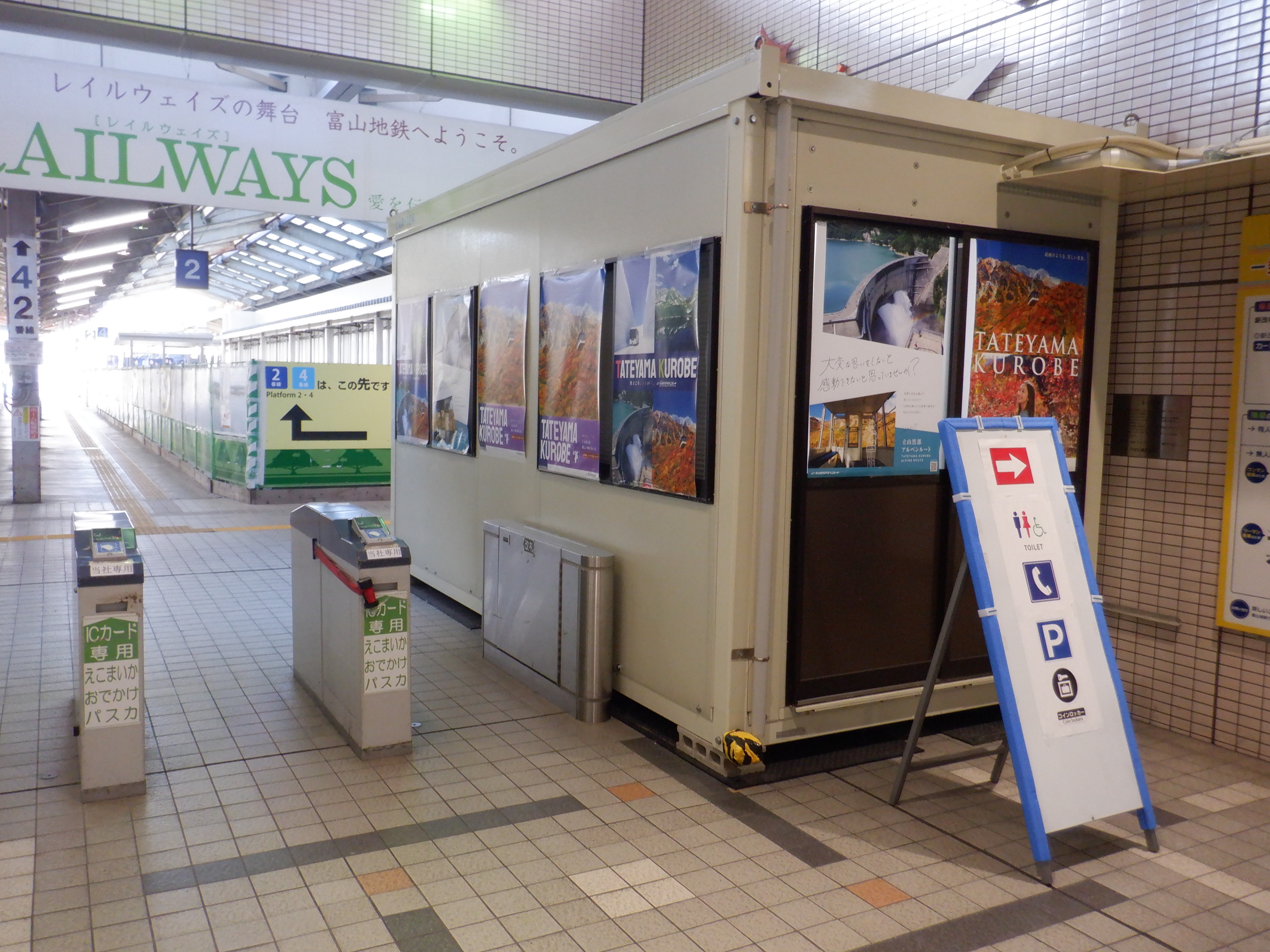 電鉄富山駅に入ってすぐのところの店舗跡が待合室になる旨の案内が貼られていました。