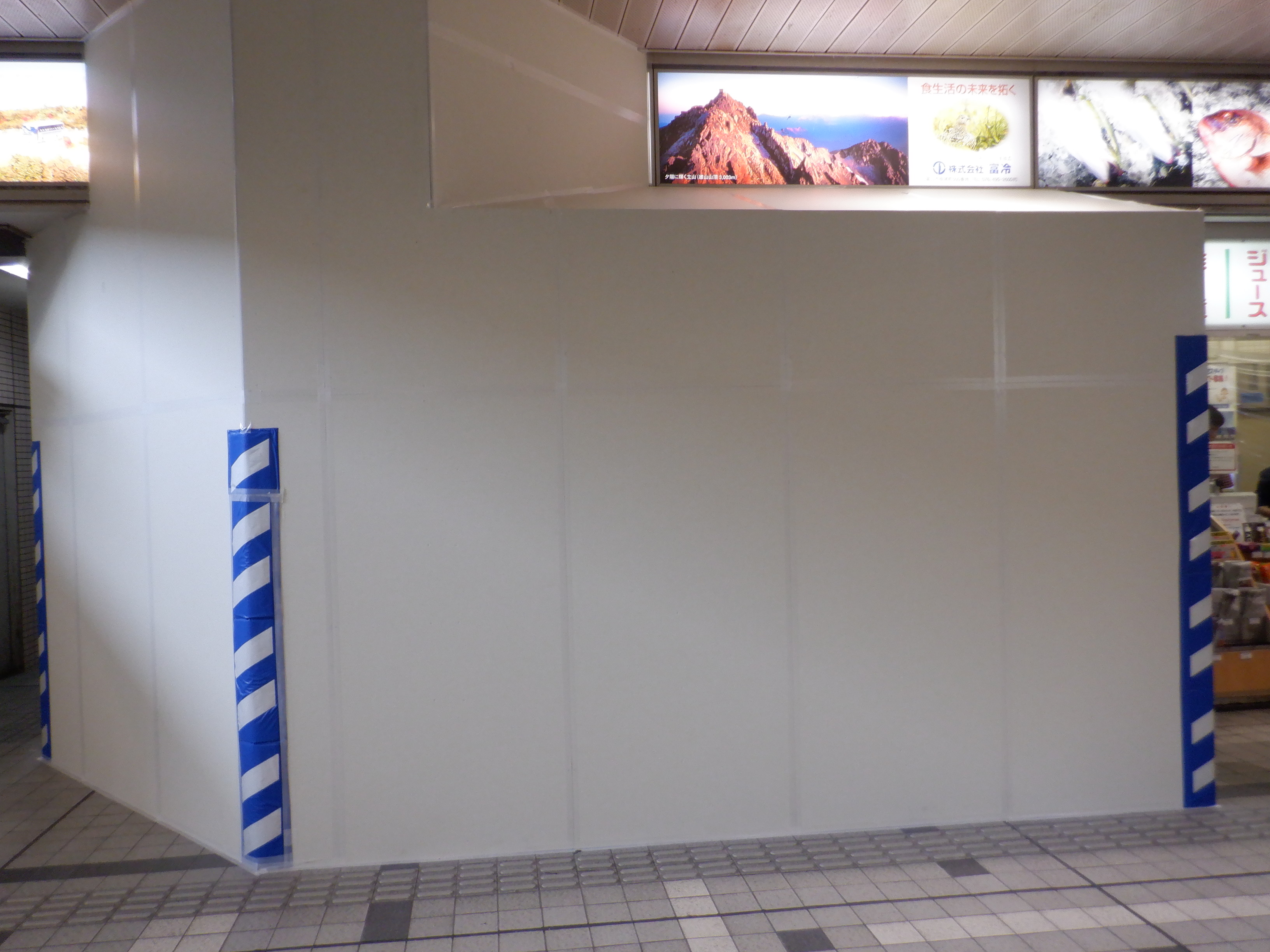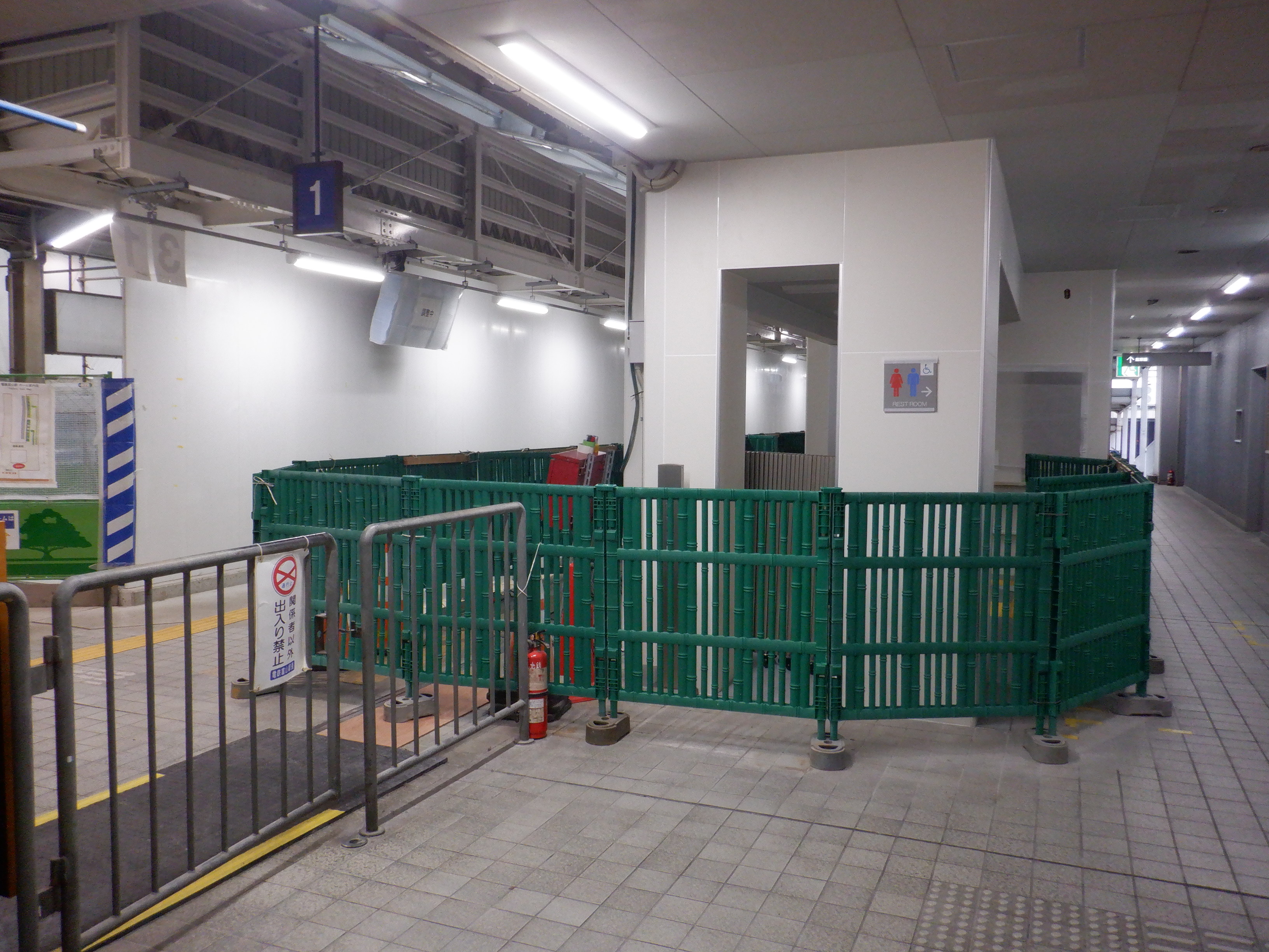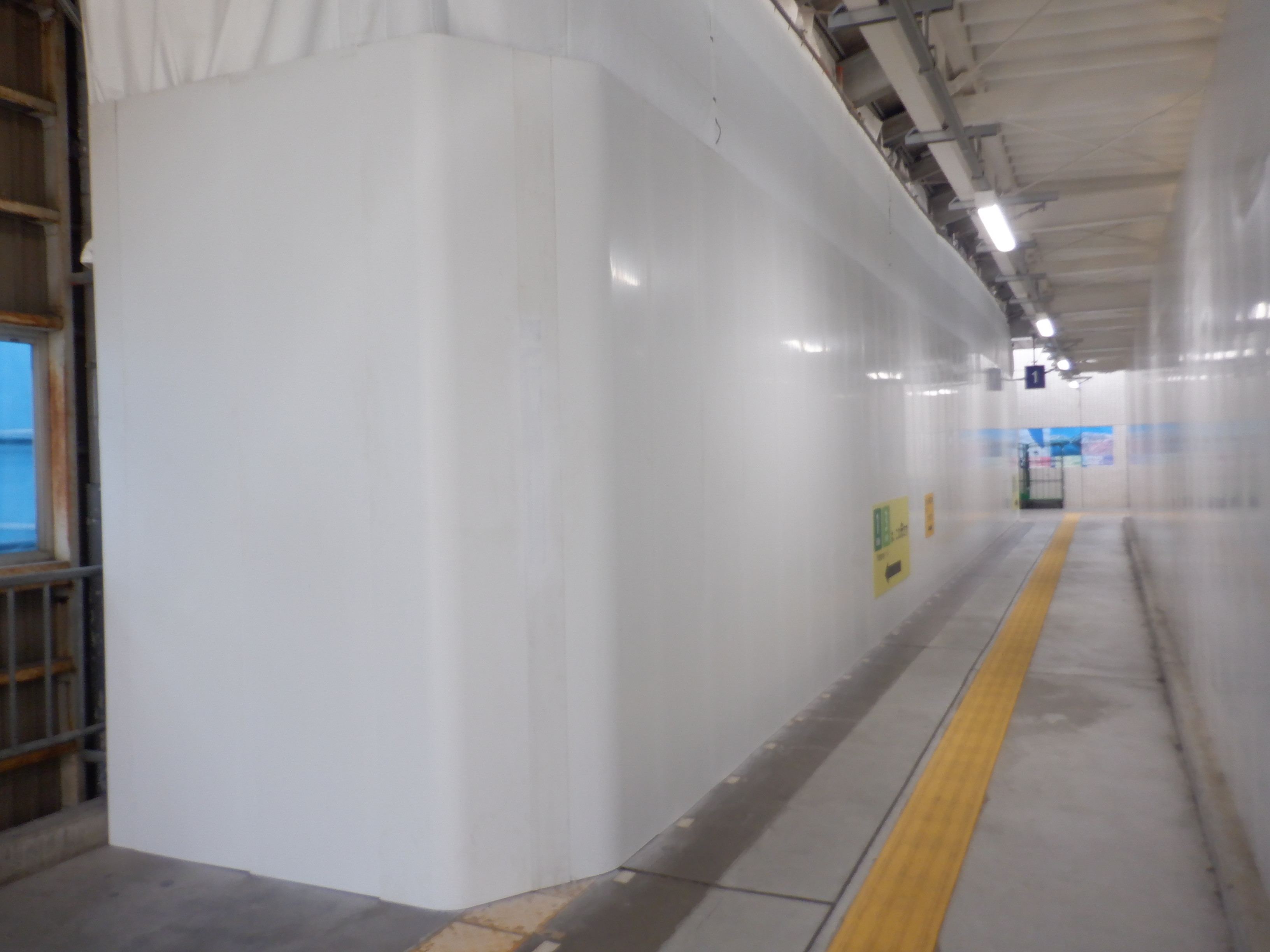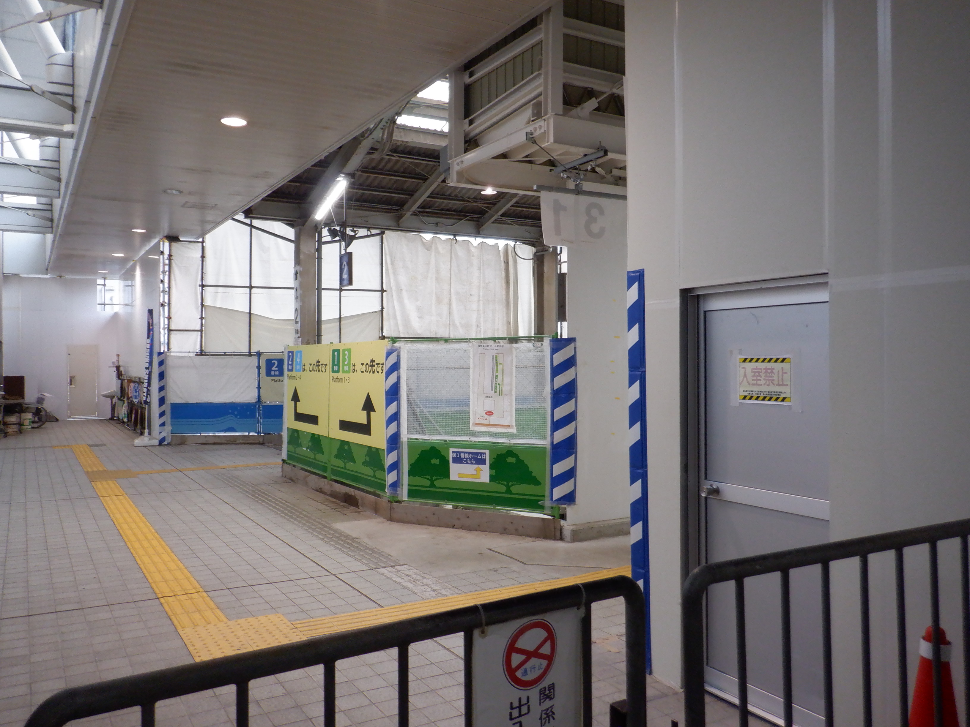 1番のりば側通路に、この後仮設改札口となるための囲いがされました。次の段階に向けて工事が進んでいます。