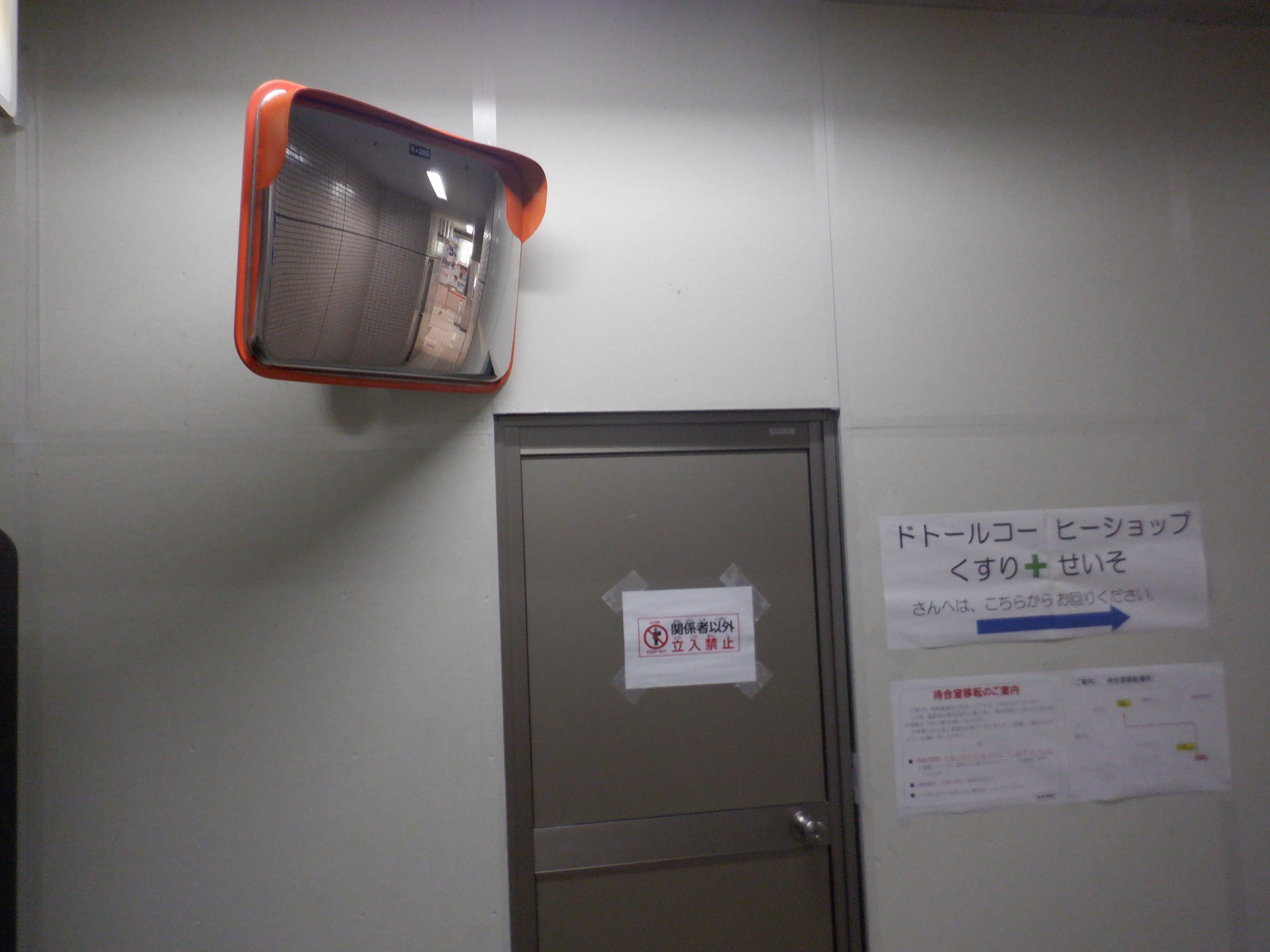 トイレへ向かう通路になり、狭くなったためミラーが付けられました。