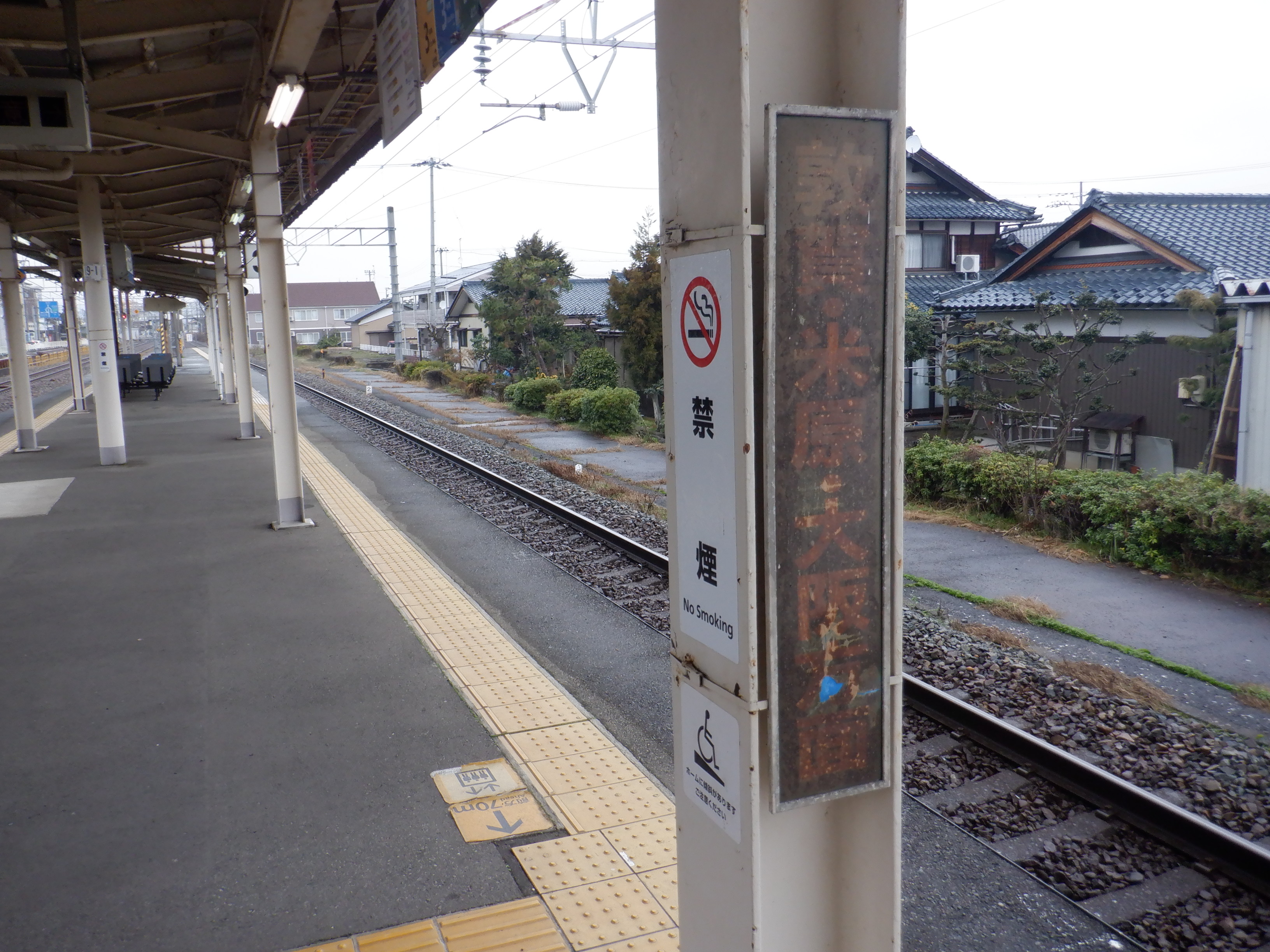 1番のりば武生駅側の駅名標と架線柱の表示。