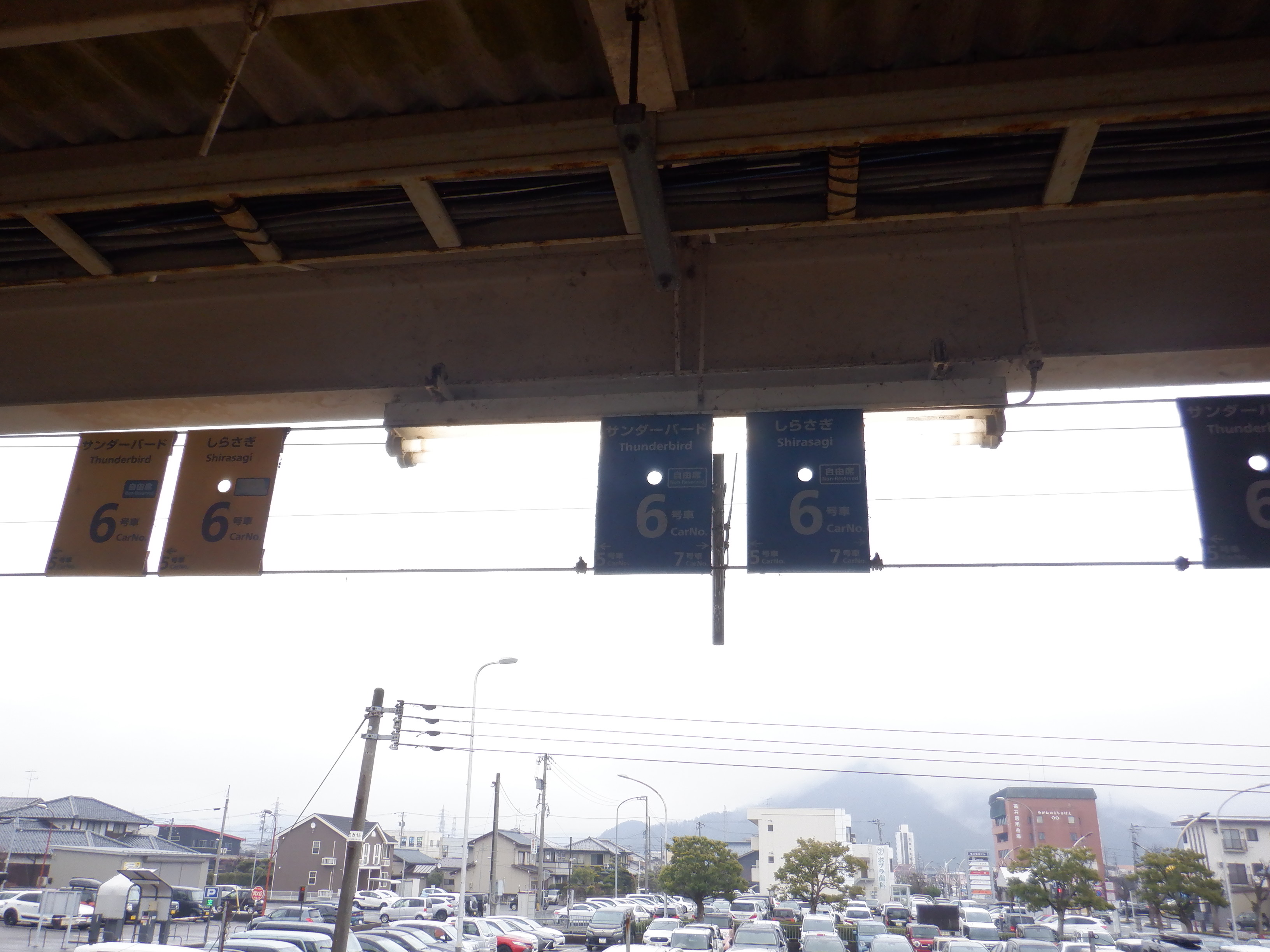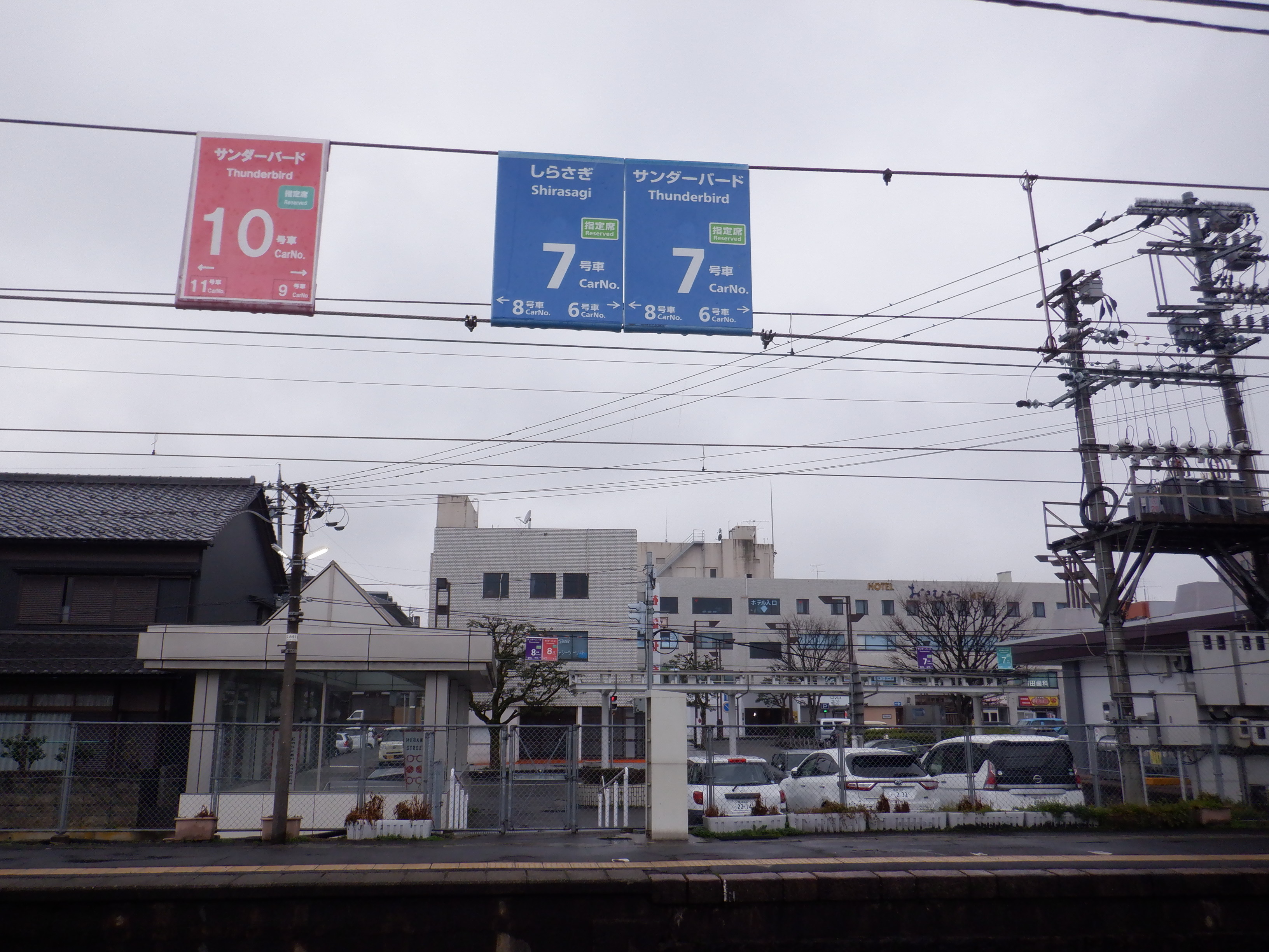 跨線橋の特急列車の乗車位置案内。