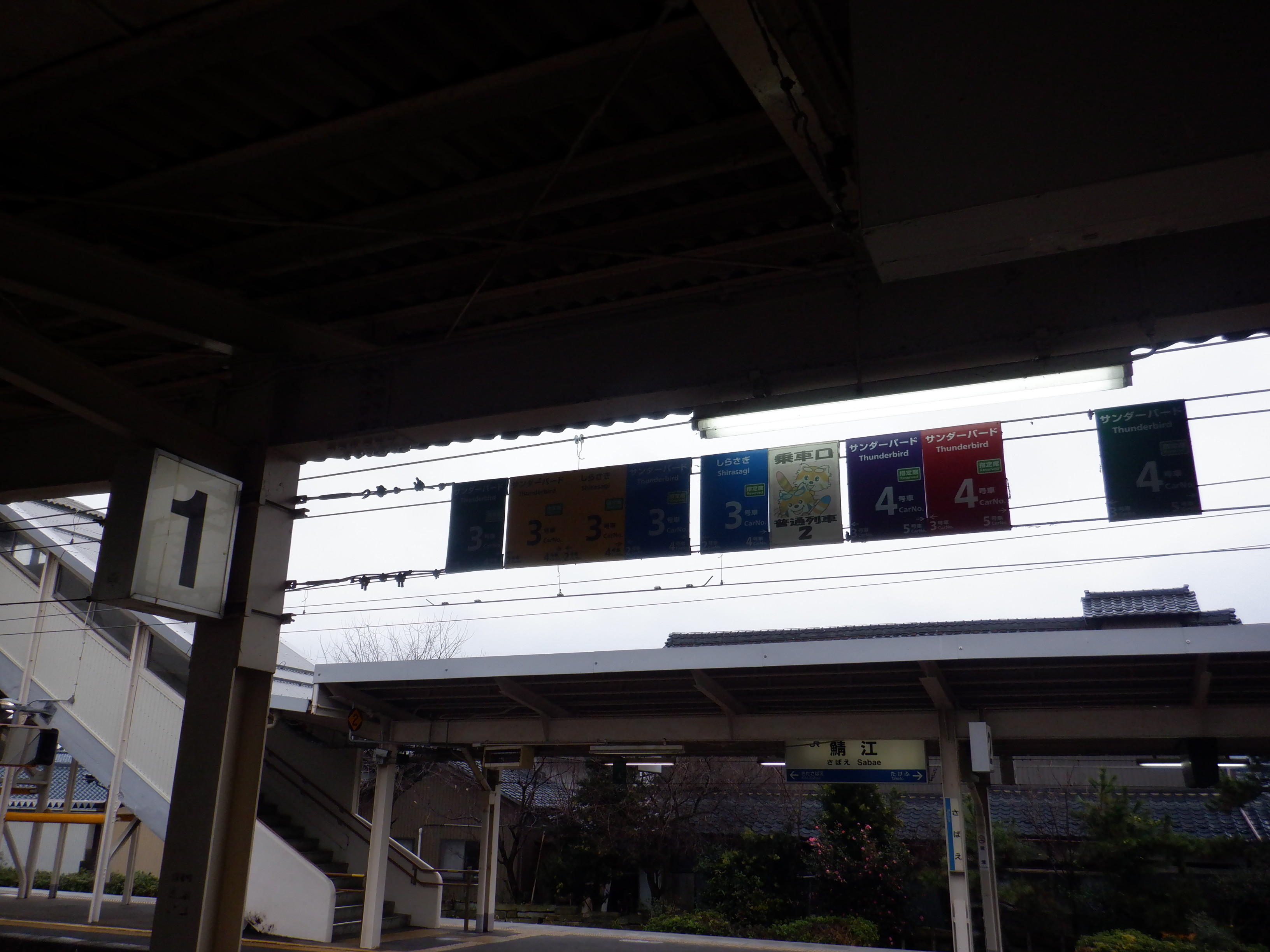 1番のりば北鯖江駅側の上屋と駅名標、特急列車の乗車位置案内。