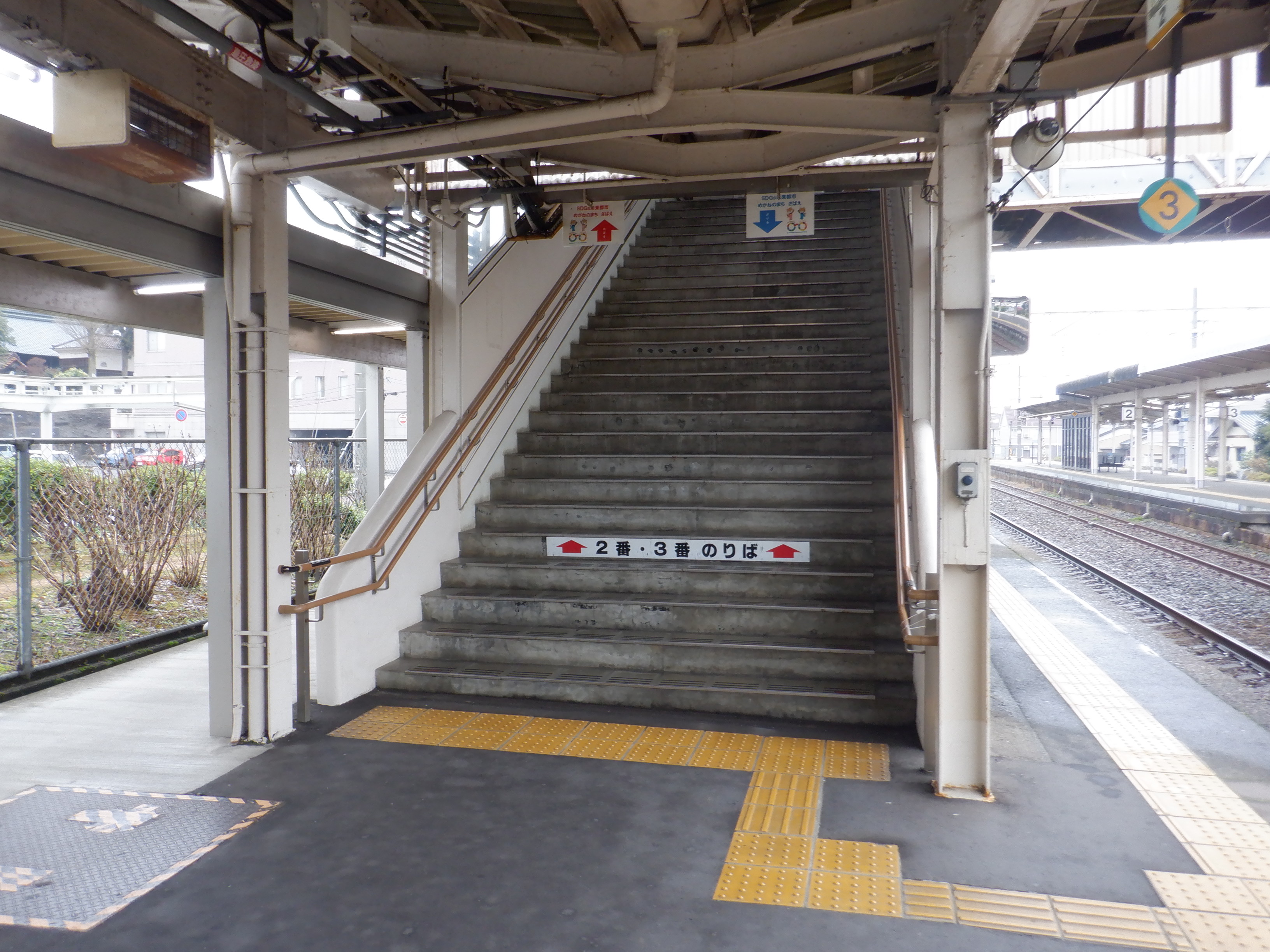 2・3番のりばの武生駅側階段とそこから見たホーム。