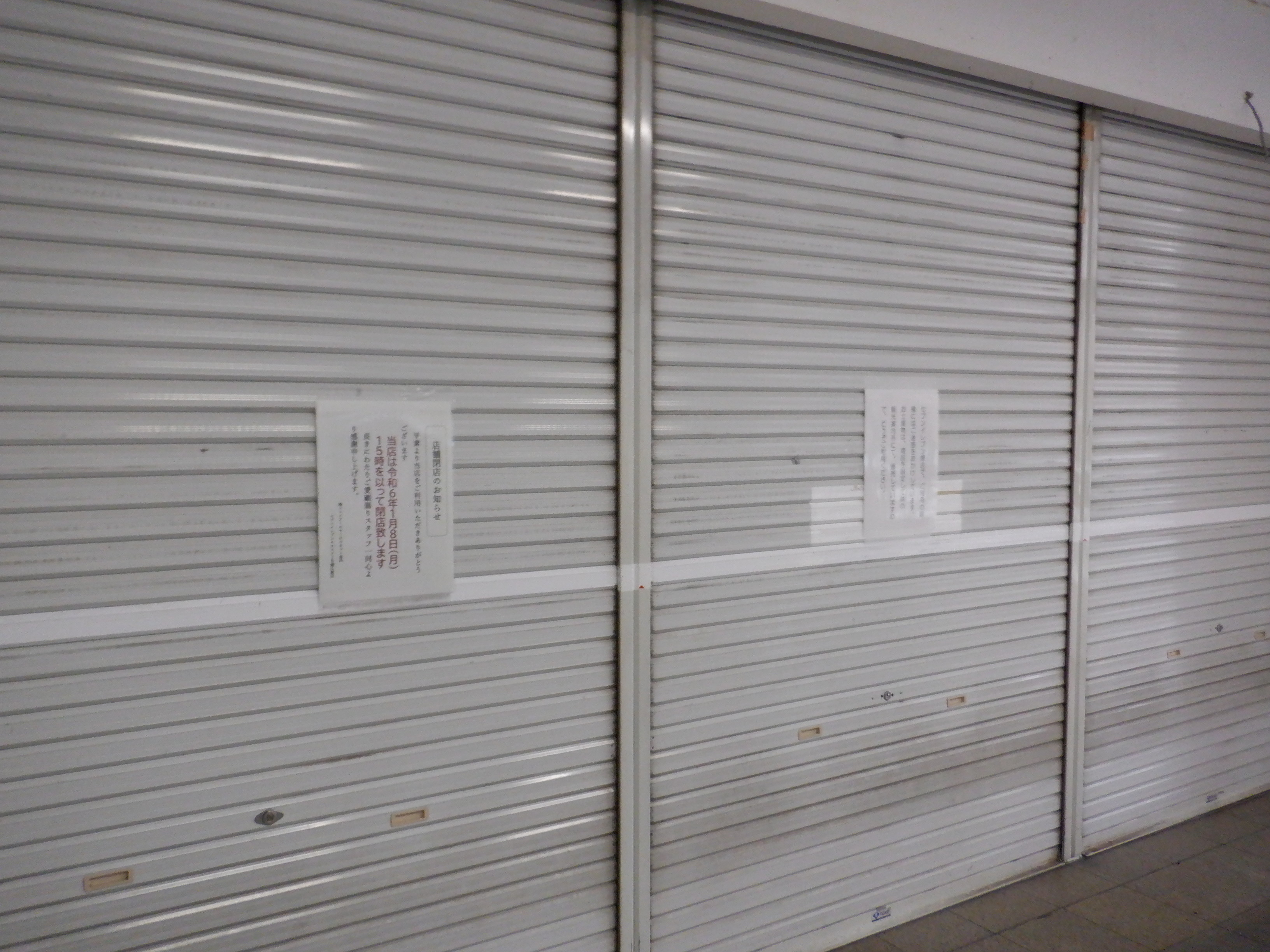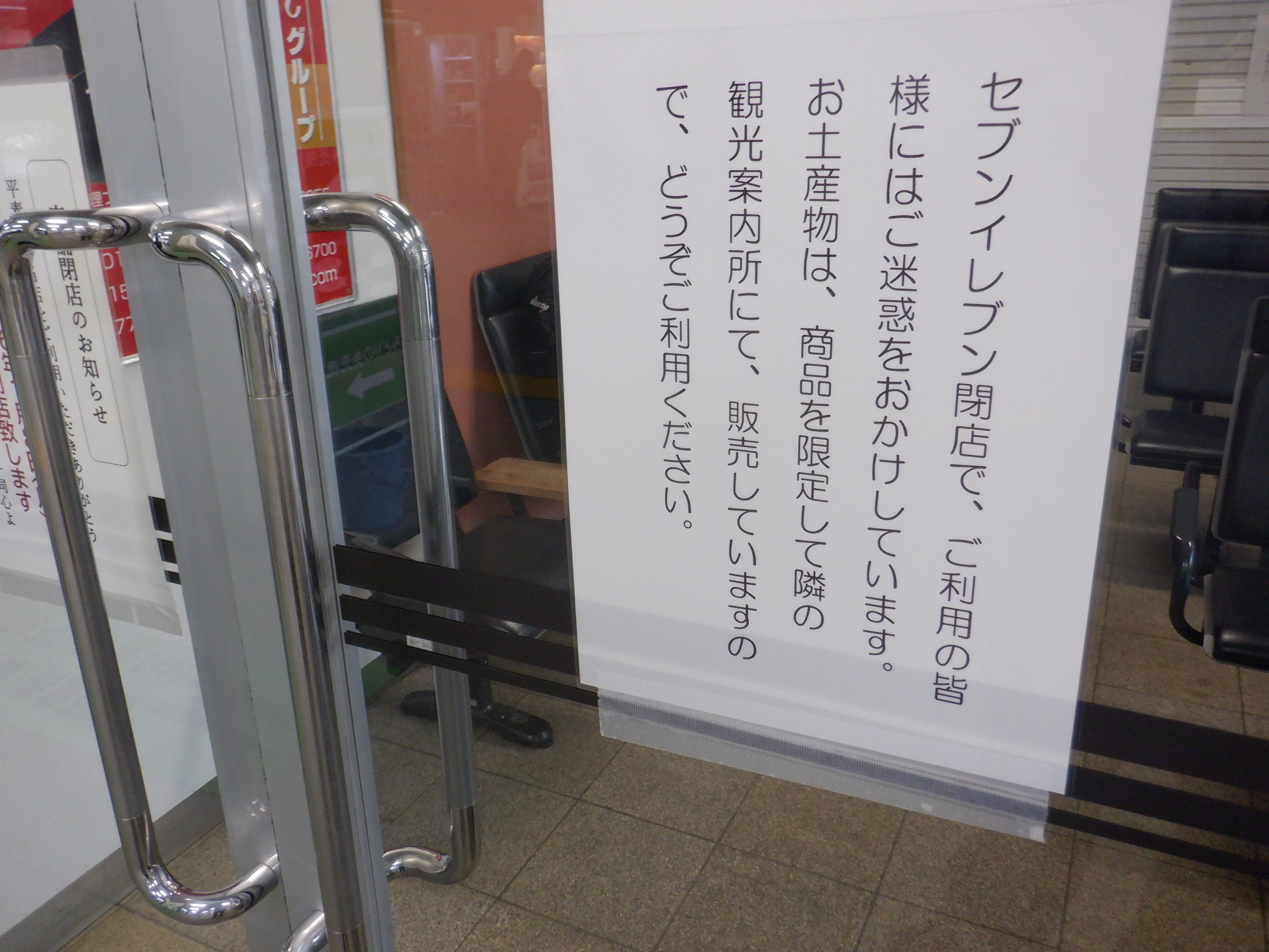 待合室内のセブンイレブン閉店のお知らせと代替で若干の土産物を観光案内所で販売する旨のお知らせ。