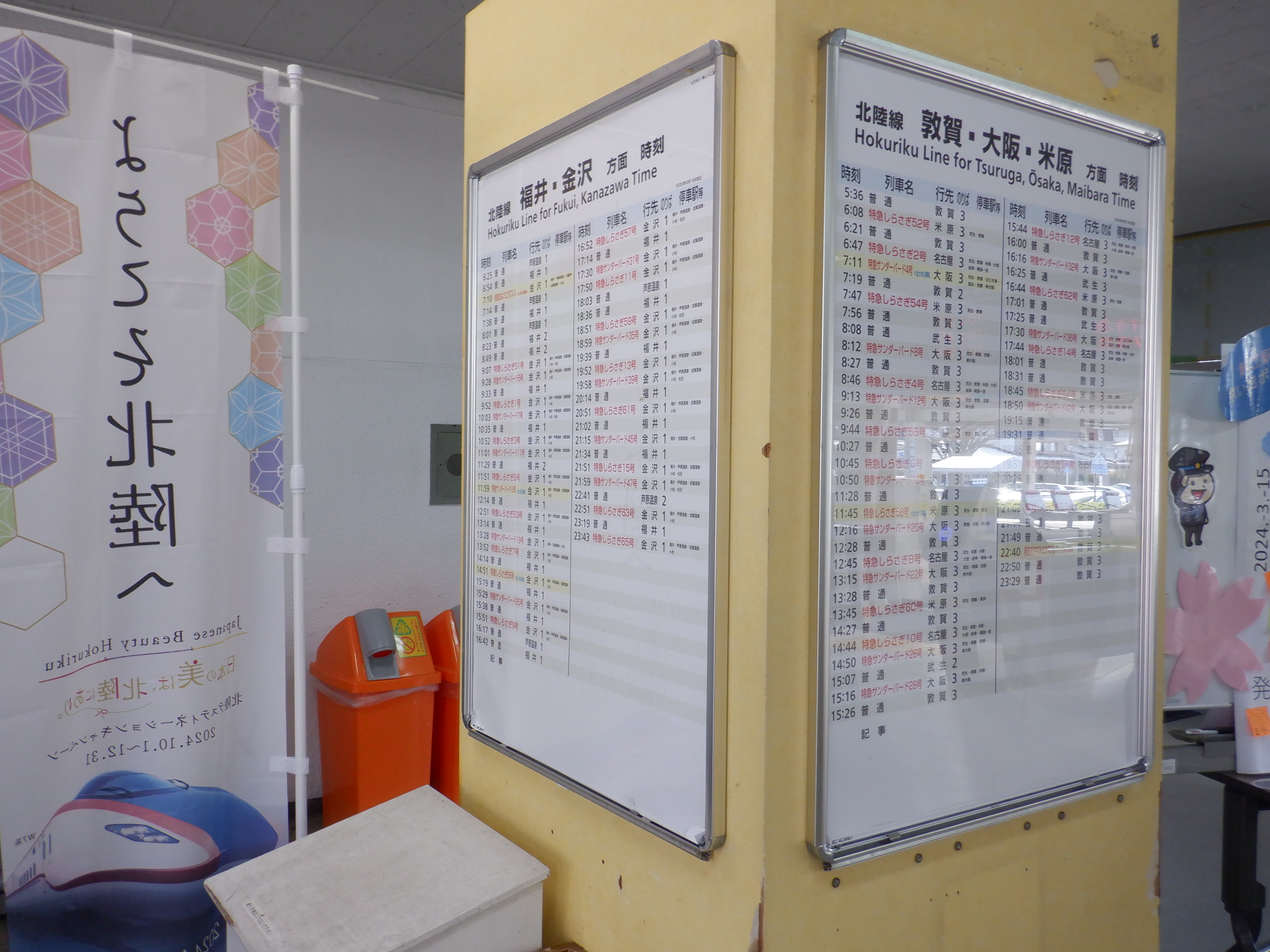 この時点で建植式の駅名標は特に変化がありませんでしたが、吊下式の駅名標はハピラインふくいの駅名標の上に仮のJR駅名標が貼られた状態になっていました。また、発車標も「北陸線」の部分が隠されていました。時間の関係で改札内のみとなりました。