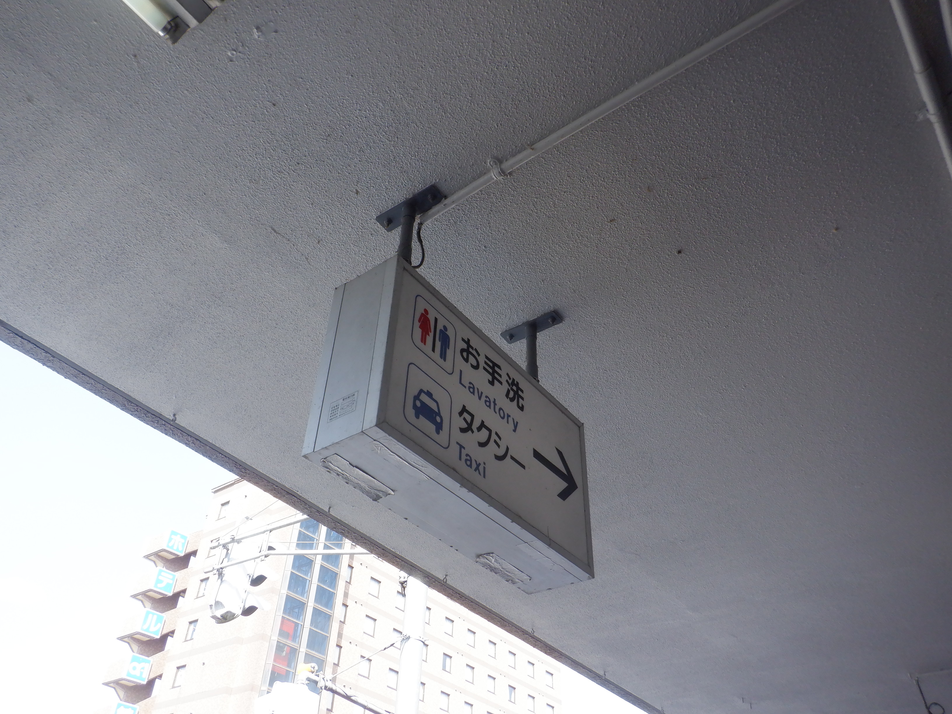 駅舎から出たところのトイレ等への案内看板。