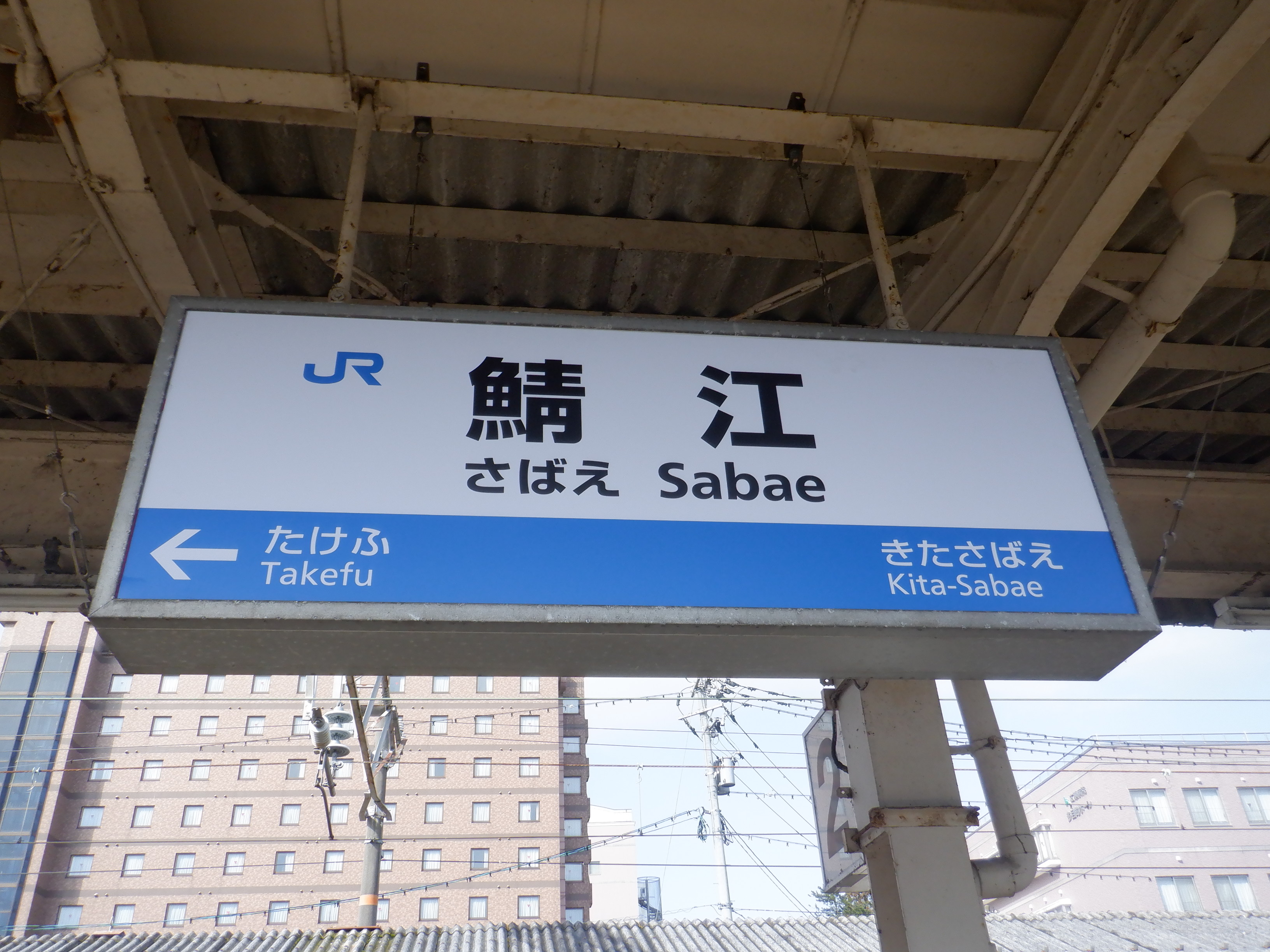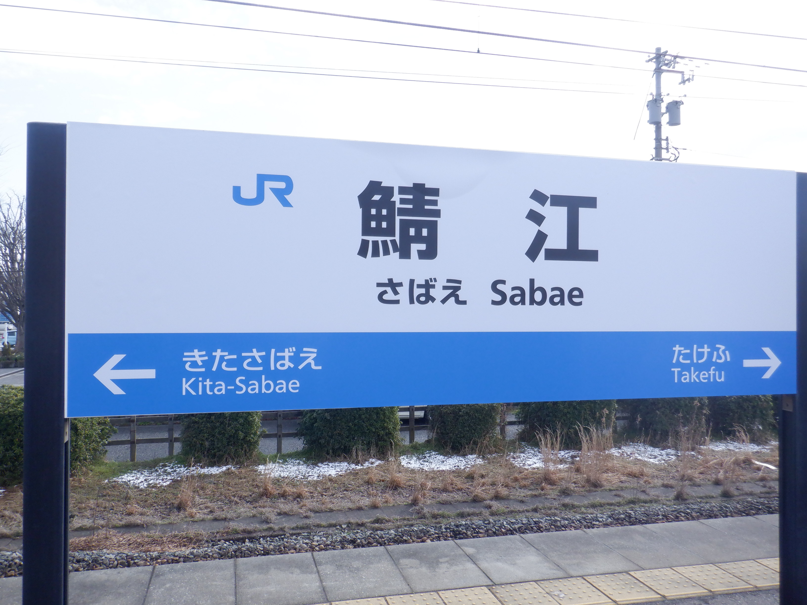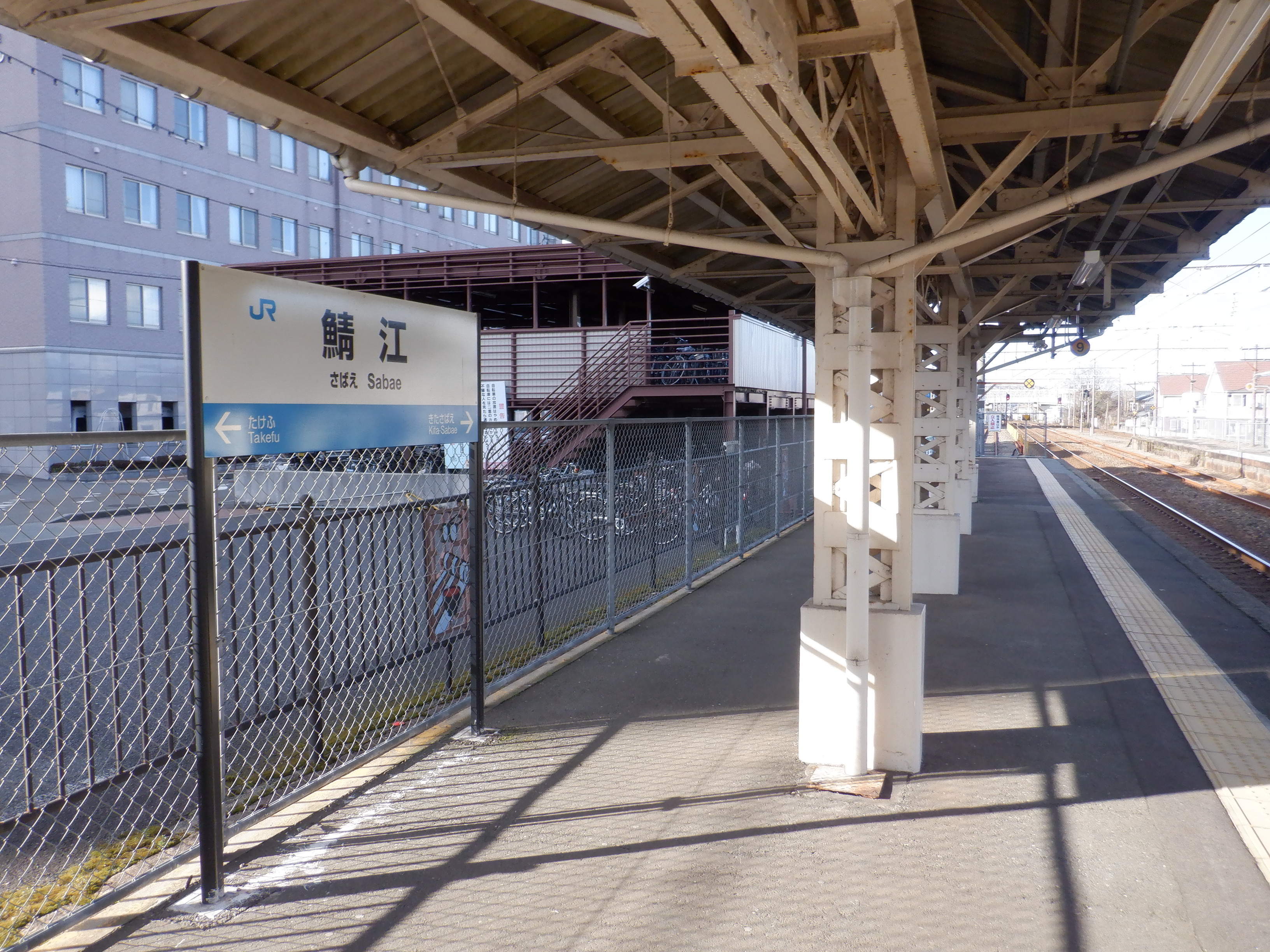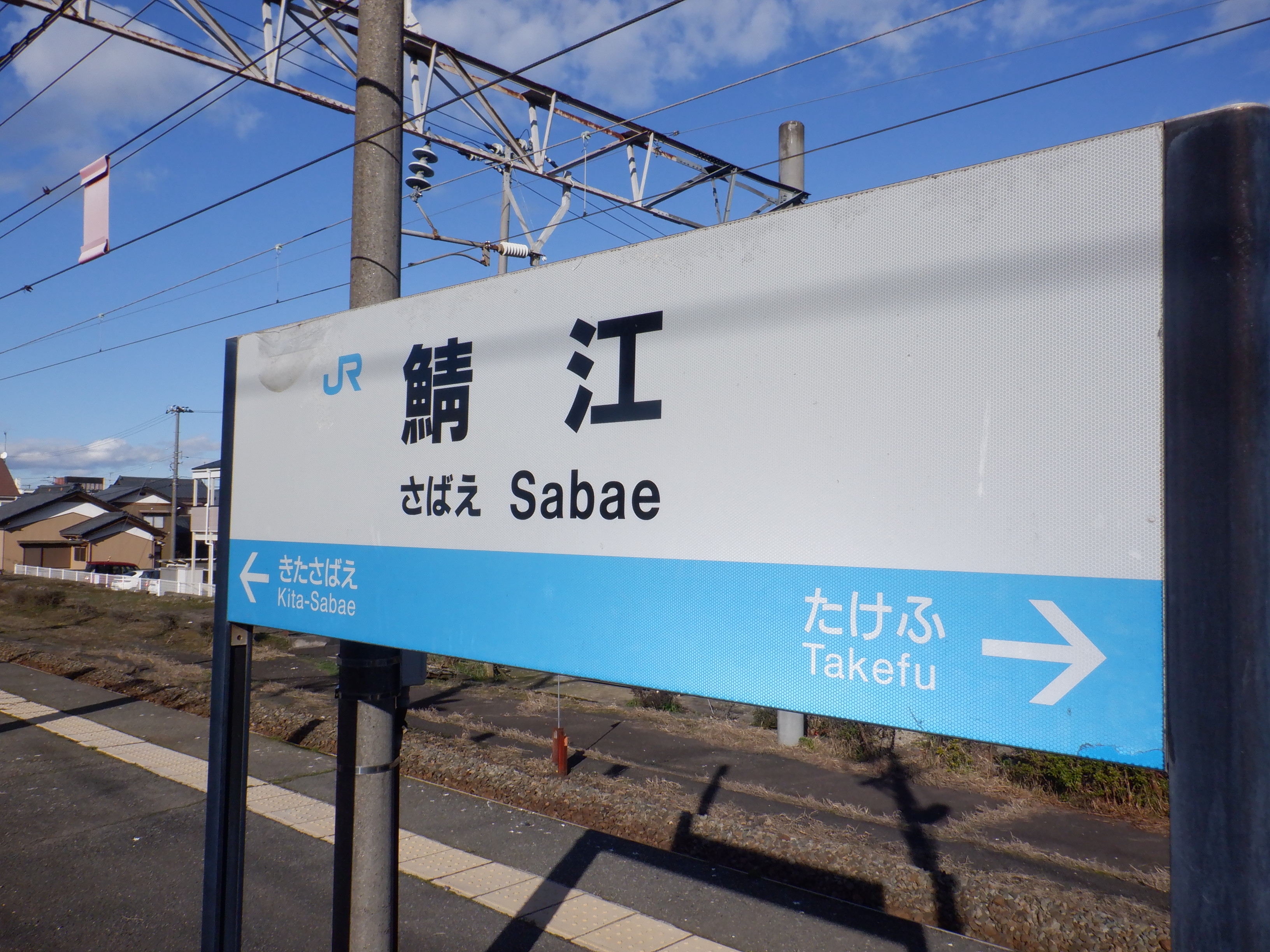 武生駅側の踏切近くから。JR鯖江駅の案内になっています。