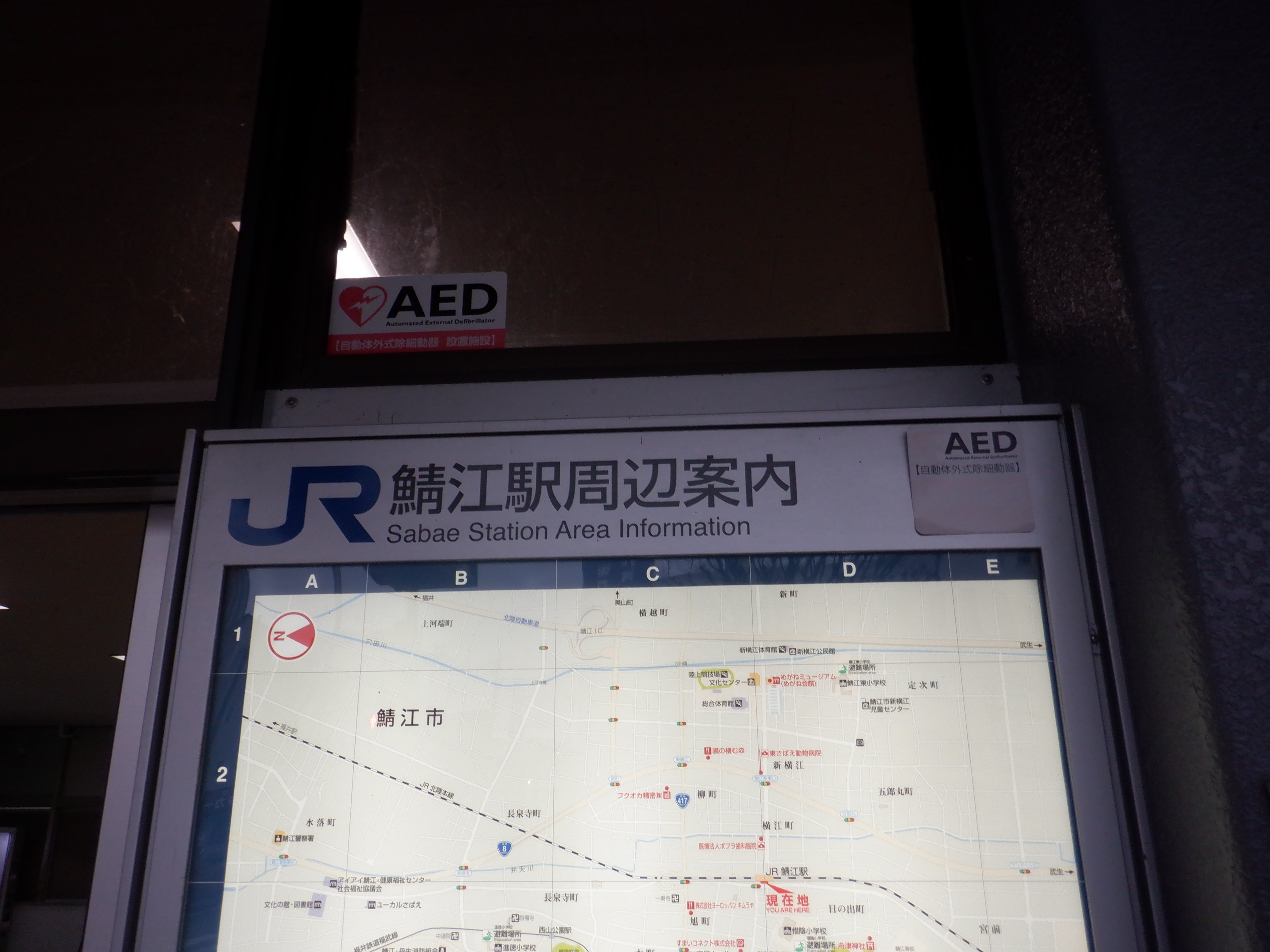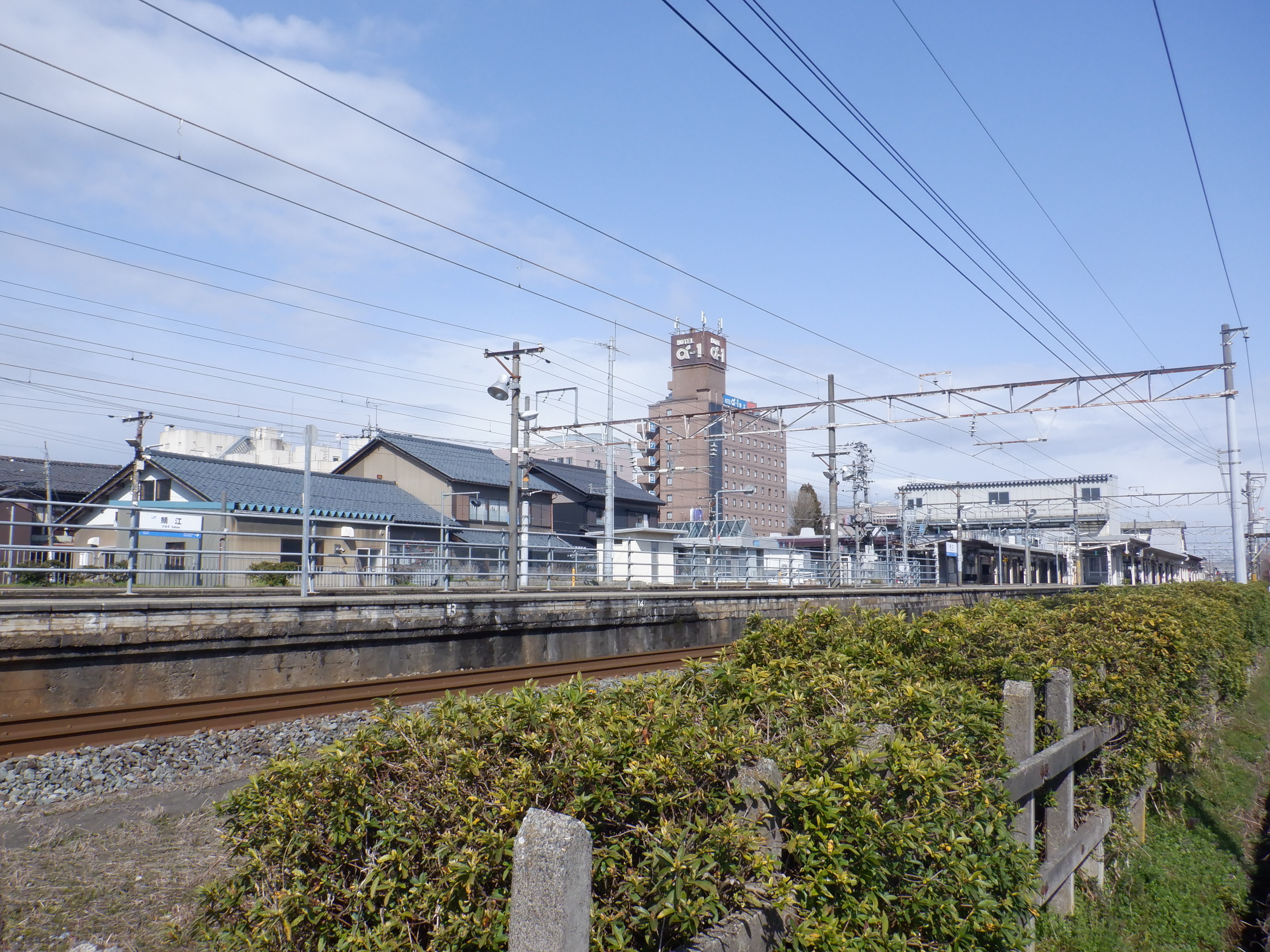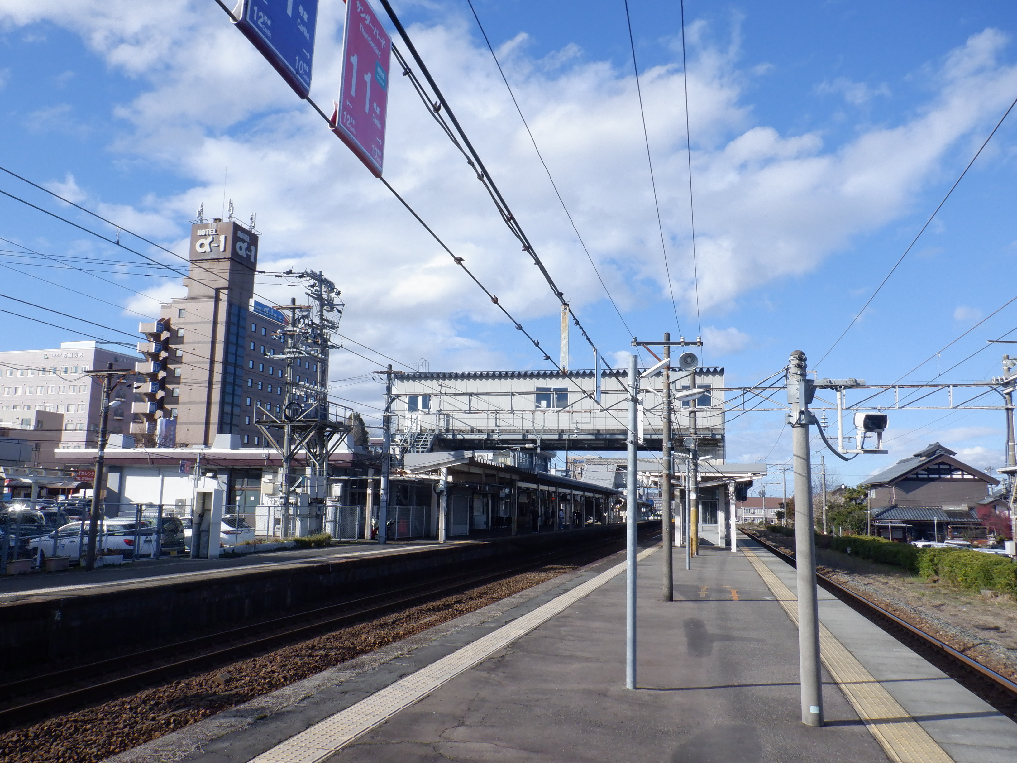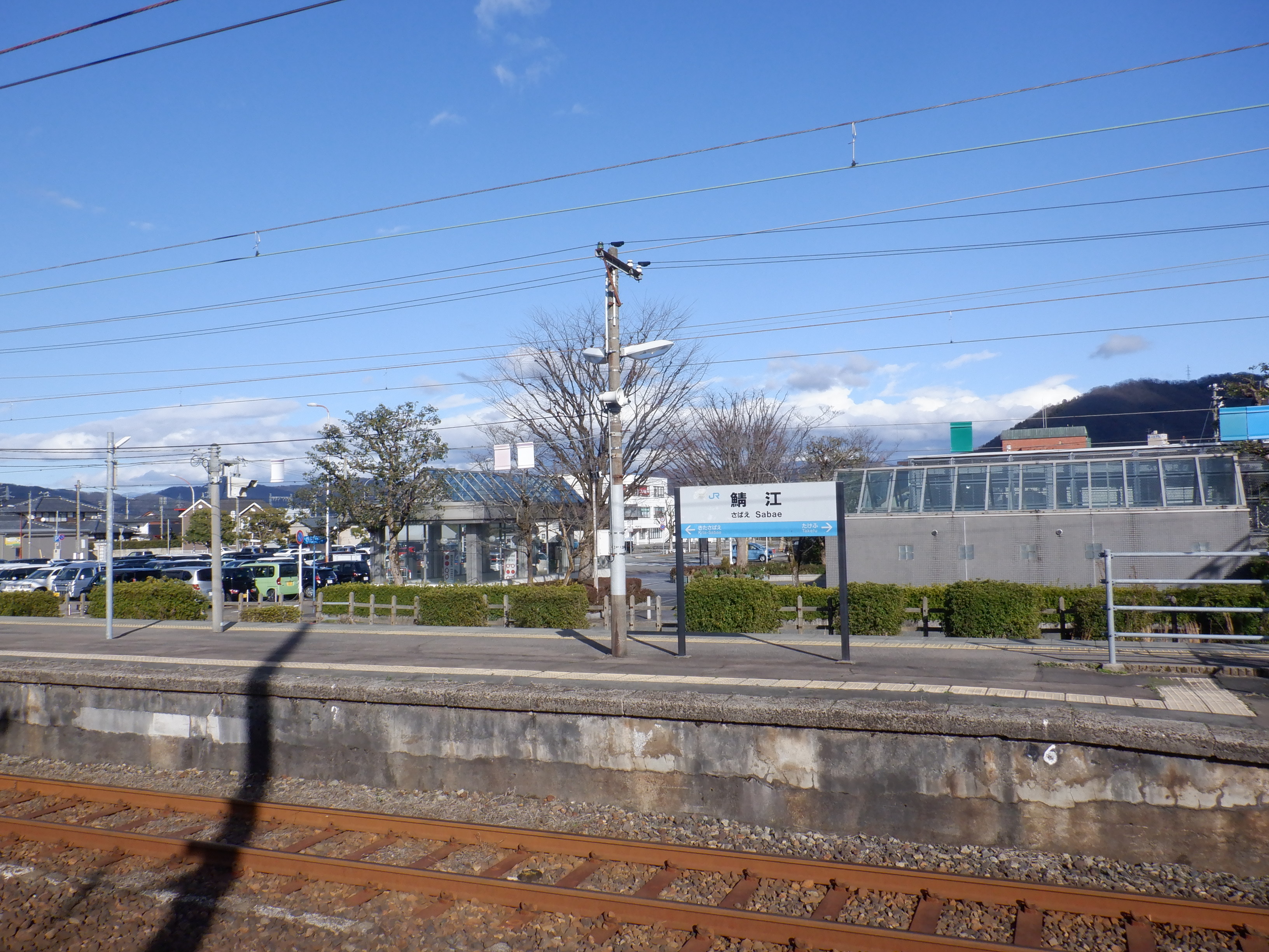 武生駅側の踏切近くから。JR鯖江駅の案内になっています。