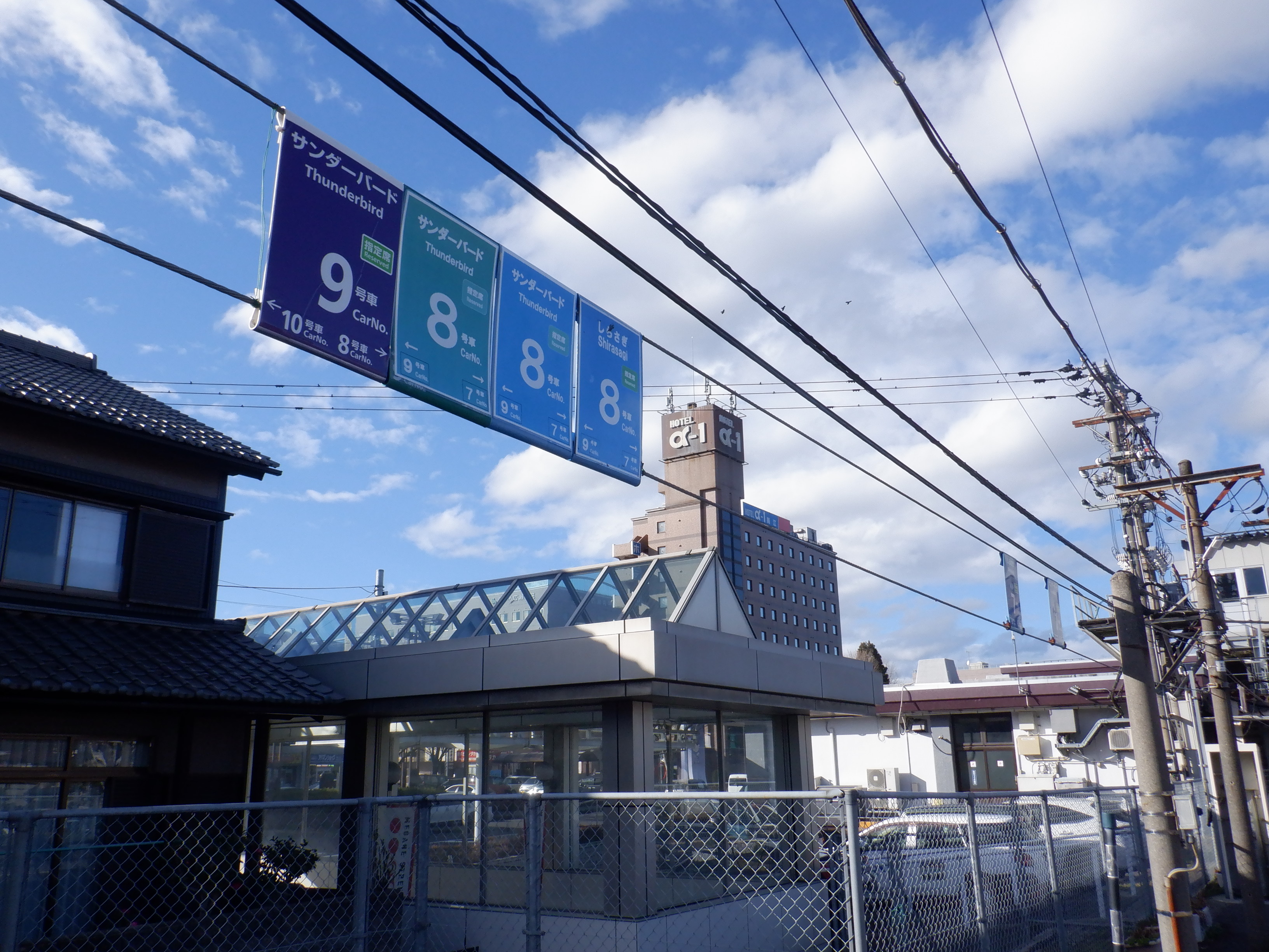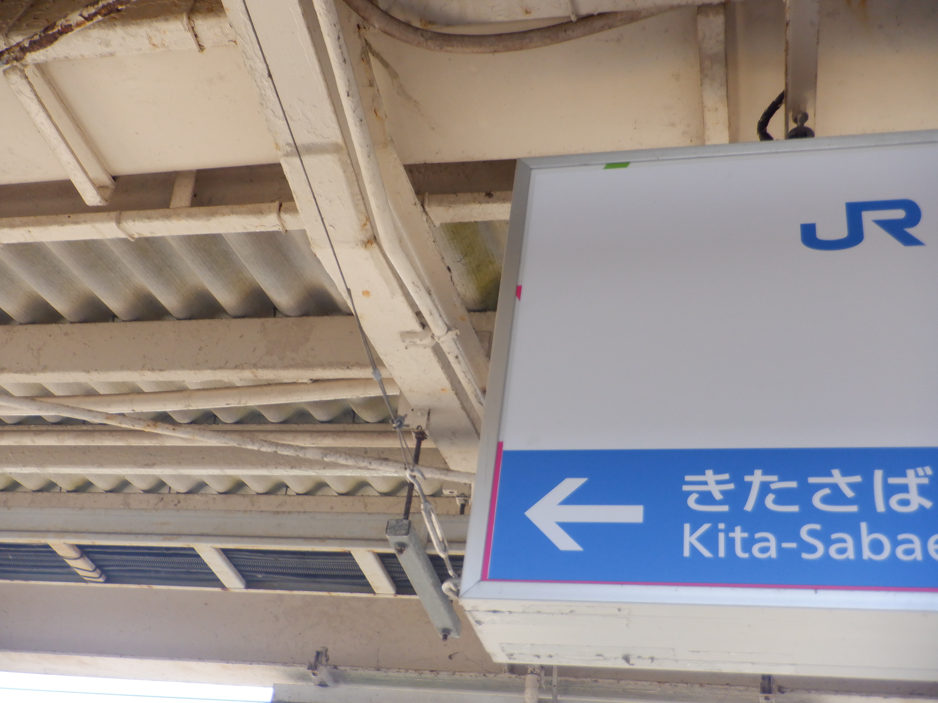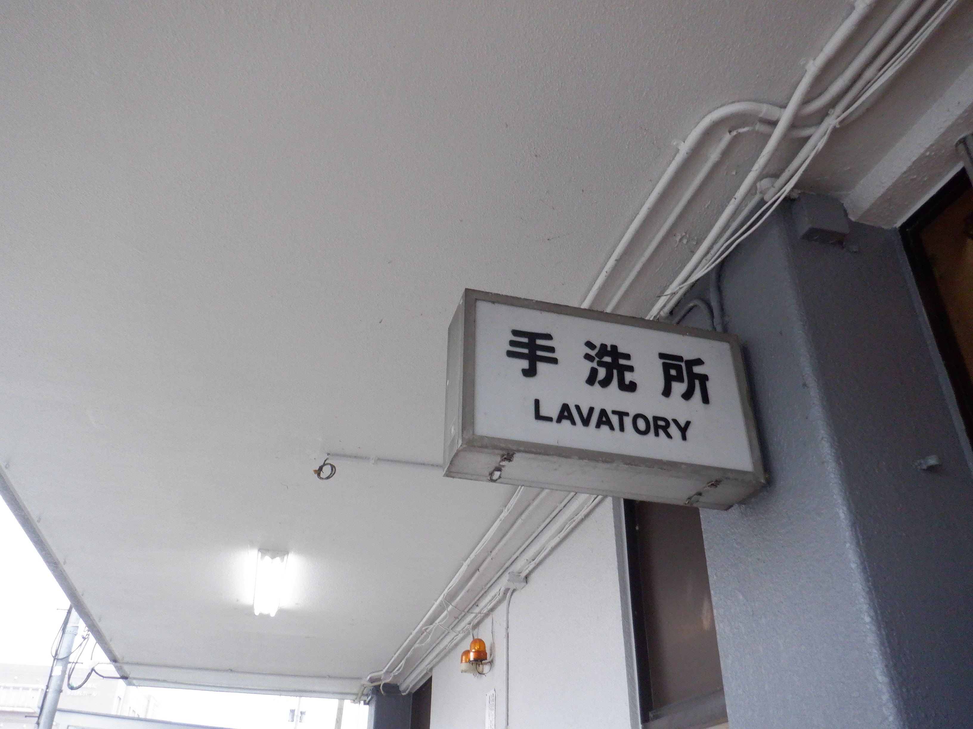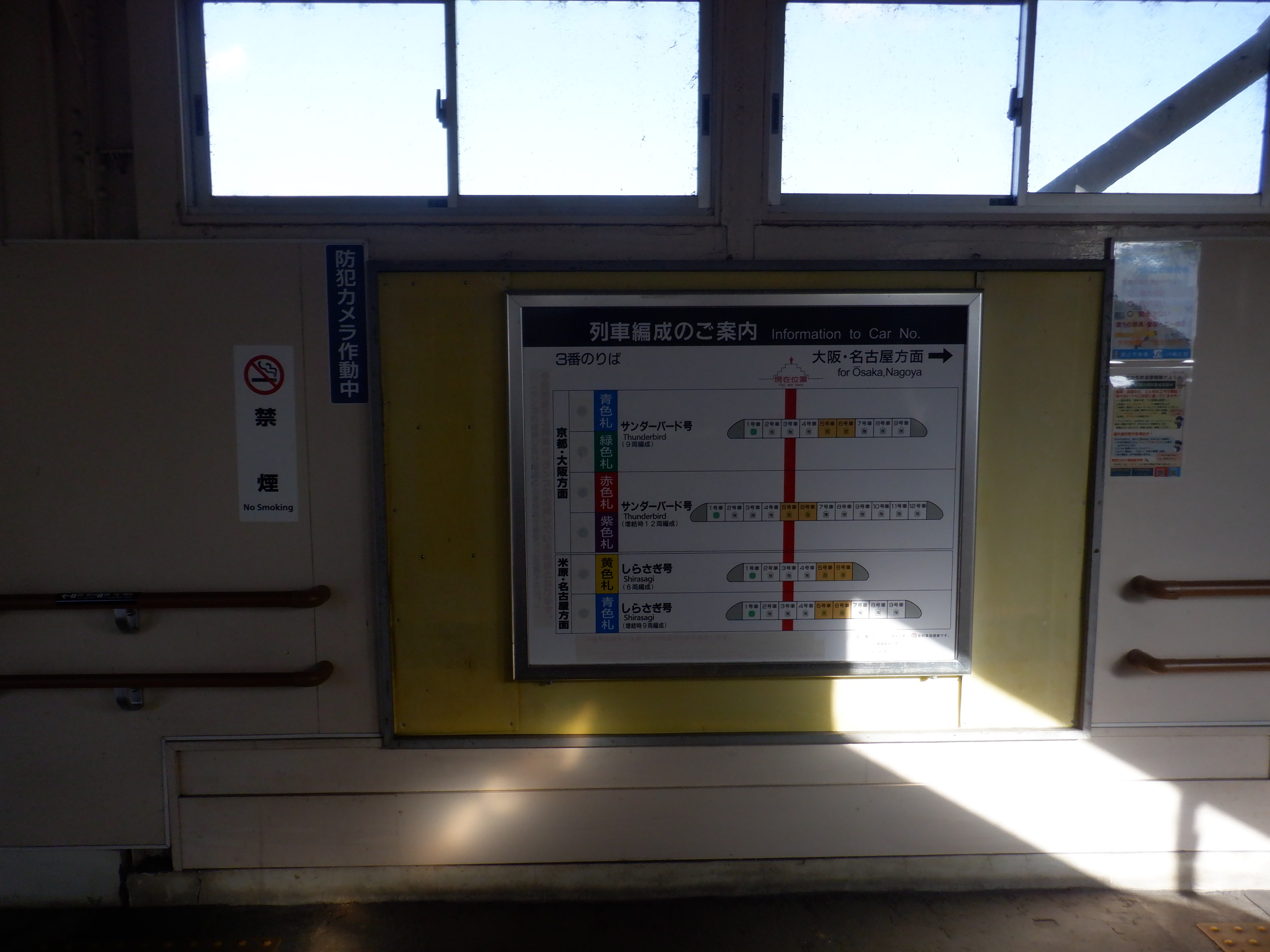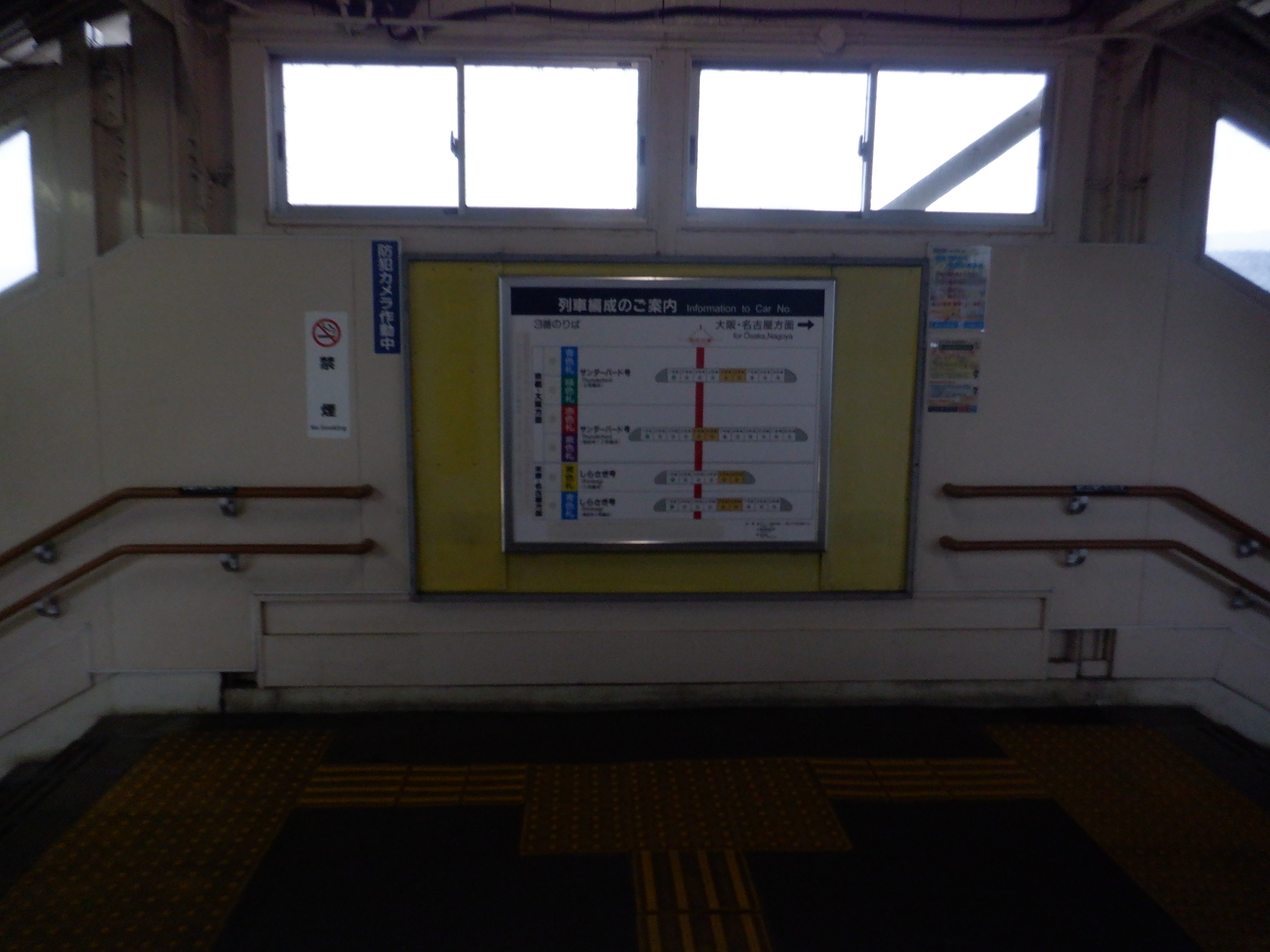 跨線橋の特急列車の乗車位置案内。この時点で電球が抜かれていました。