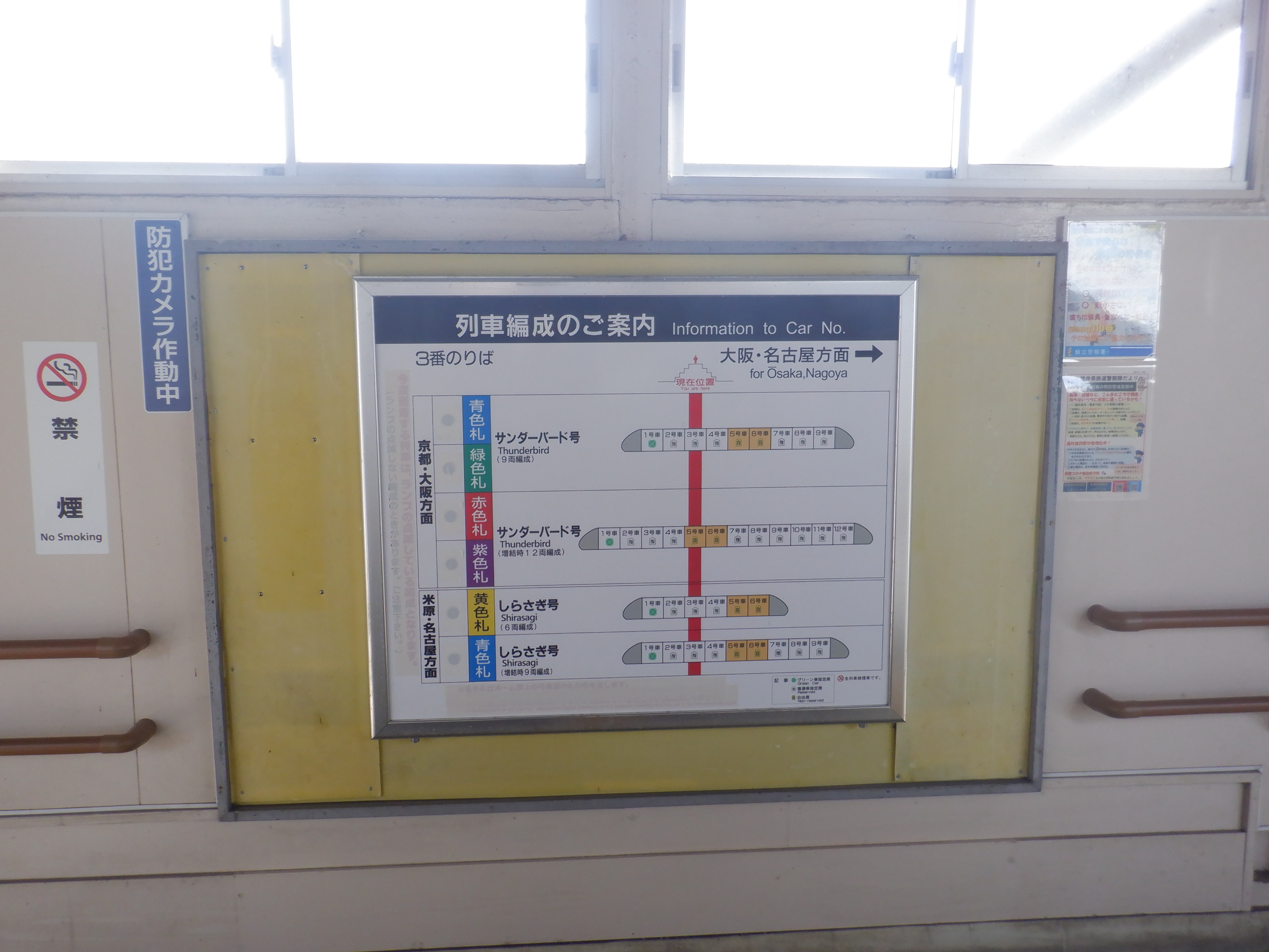 鯖江駅の2024年2月と3月の移管前の様子です。この時期になると駅名標や発車標に変化が出てきました。
